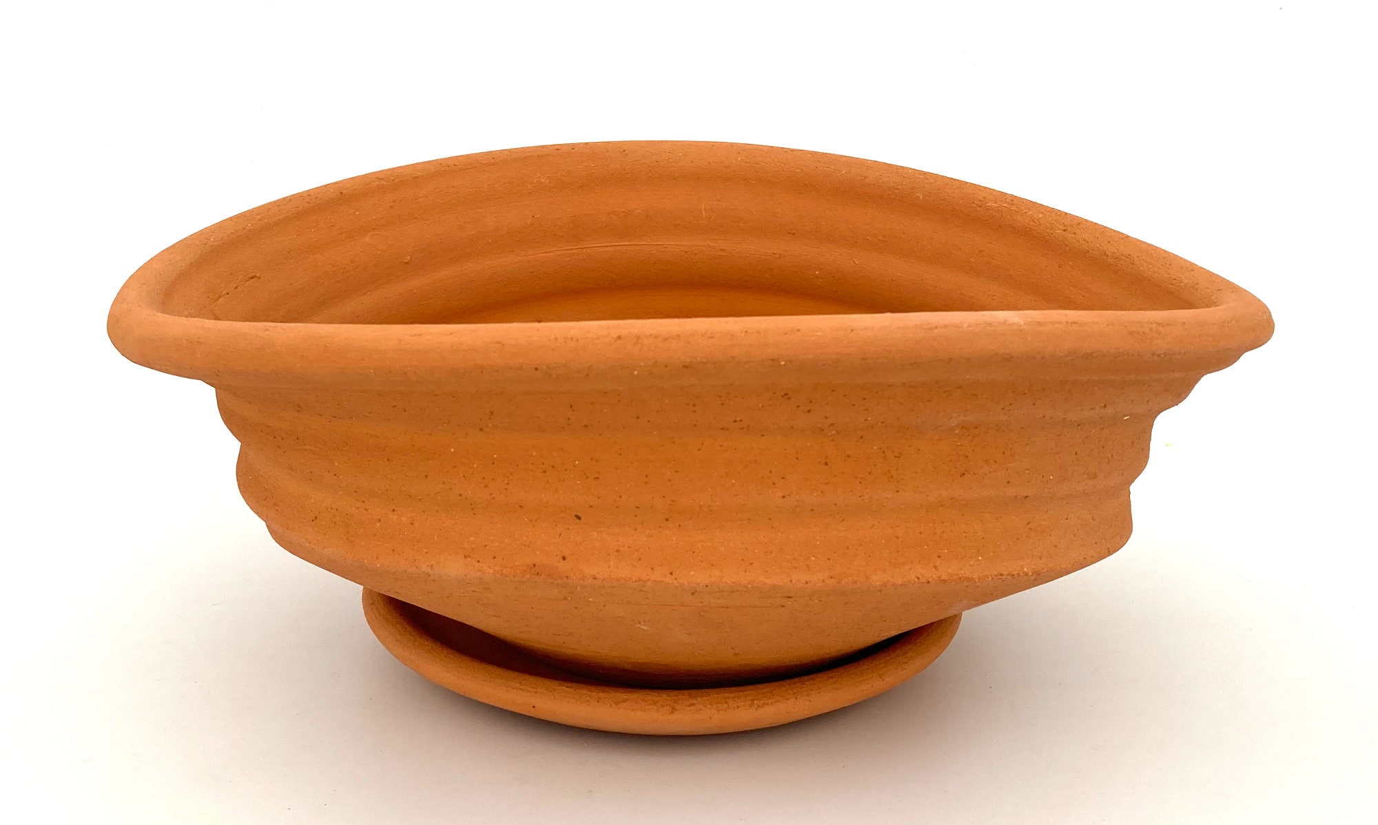This terracotta planter was made of wheel-thrown, locally dug clay that when fired to the right temperature comes out a nice terracotta color and is porous. This allows air and water to flow through the pot which prevents root rot and soil disease.