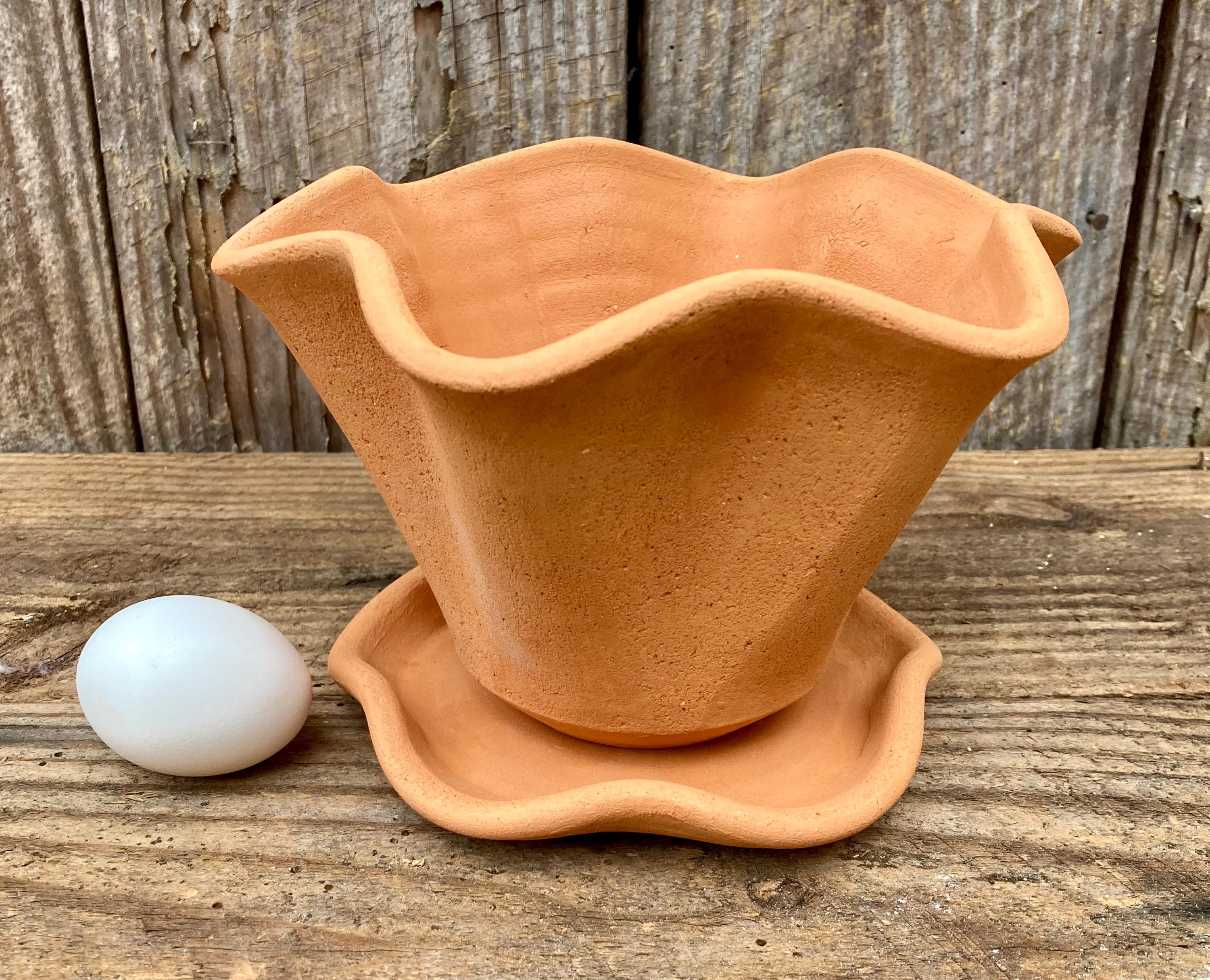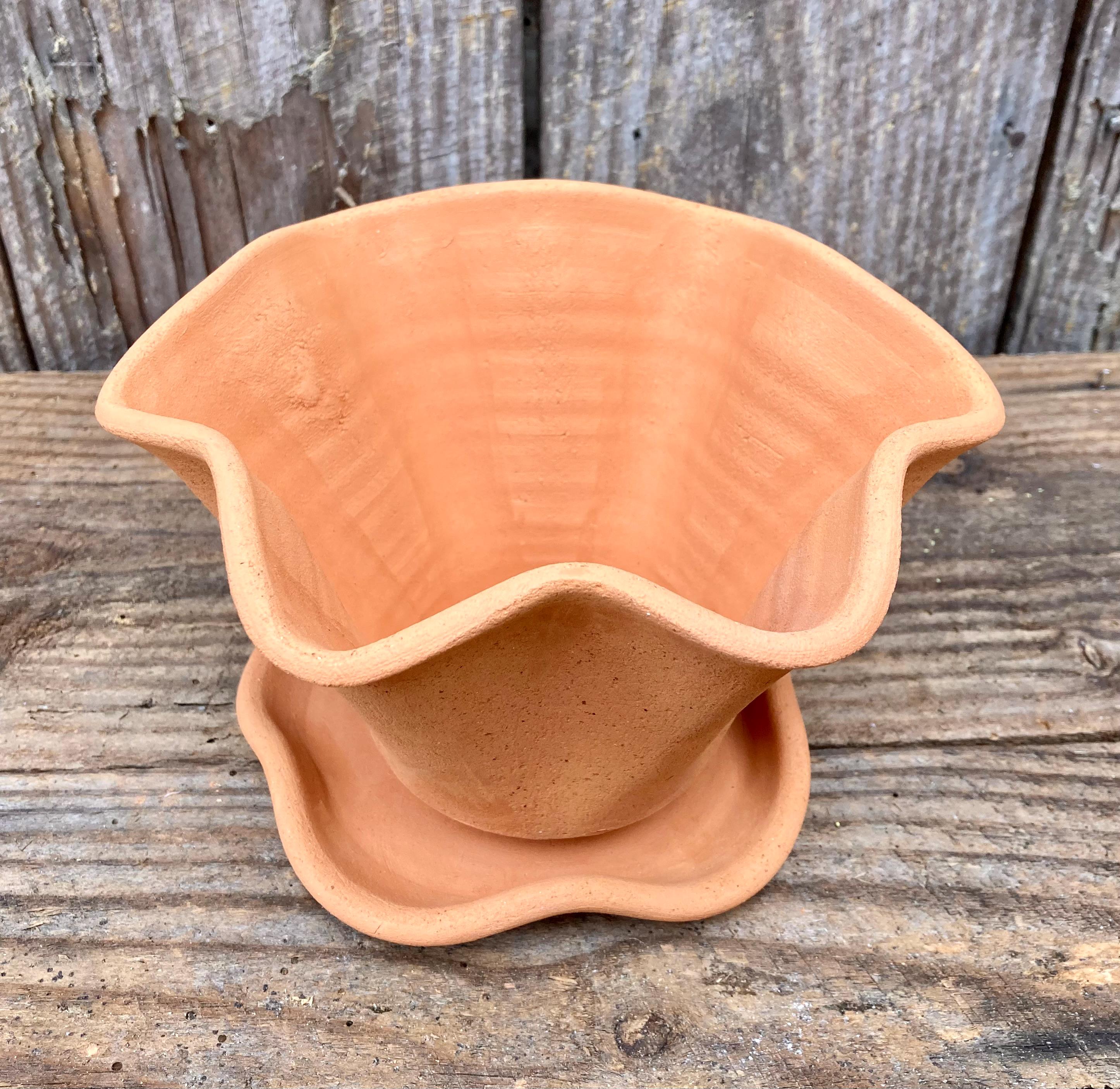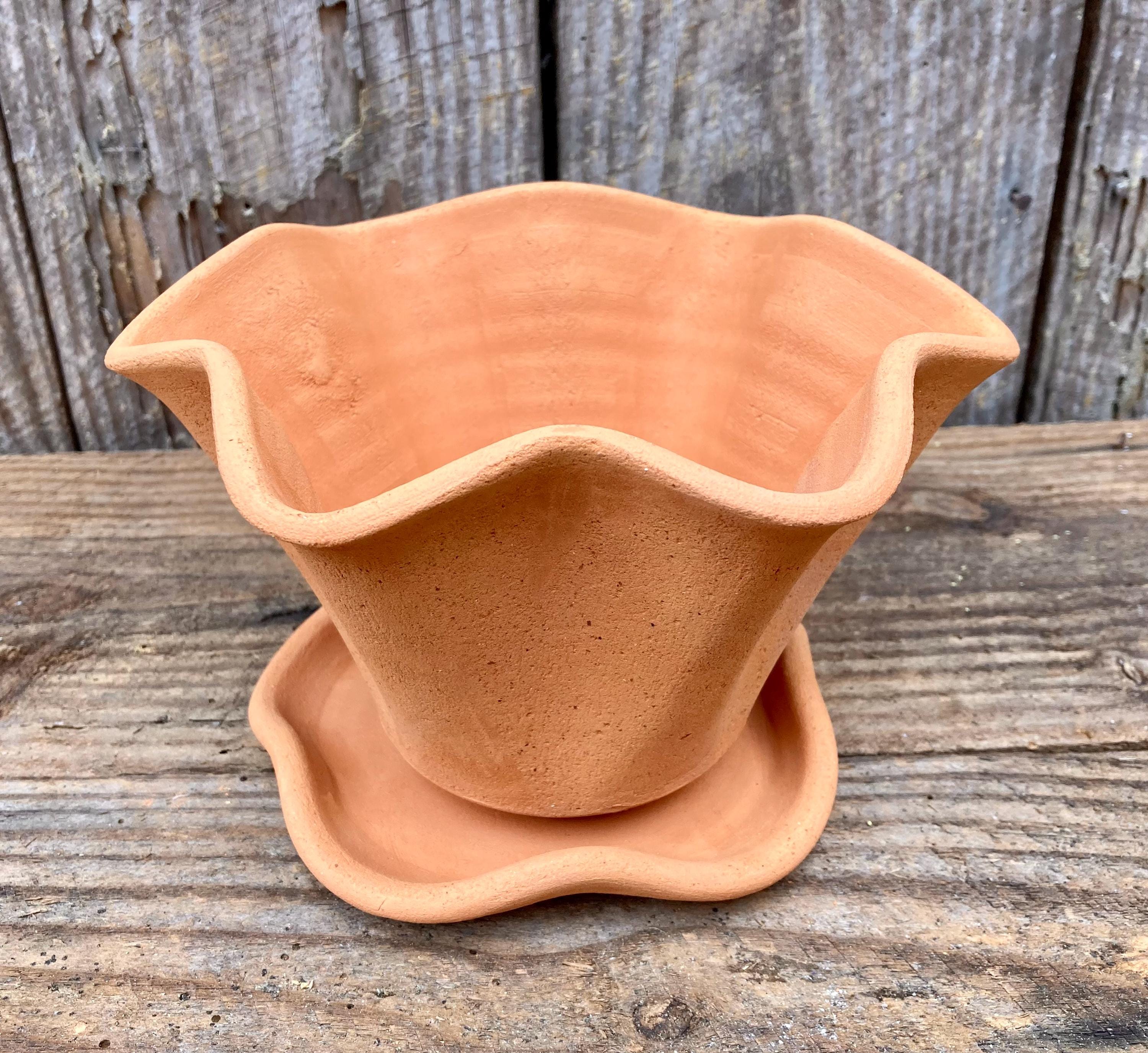 This fluted, terracotta planter with saucer was made of wheel-thrown, locally dug clay that when fired to the right temperature comes out a nice terracotta color and is porous. This allows air and water to flow through the pot which prevents root rot and soil disease.