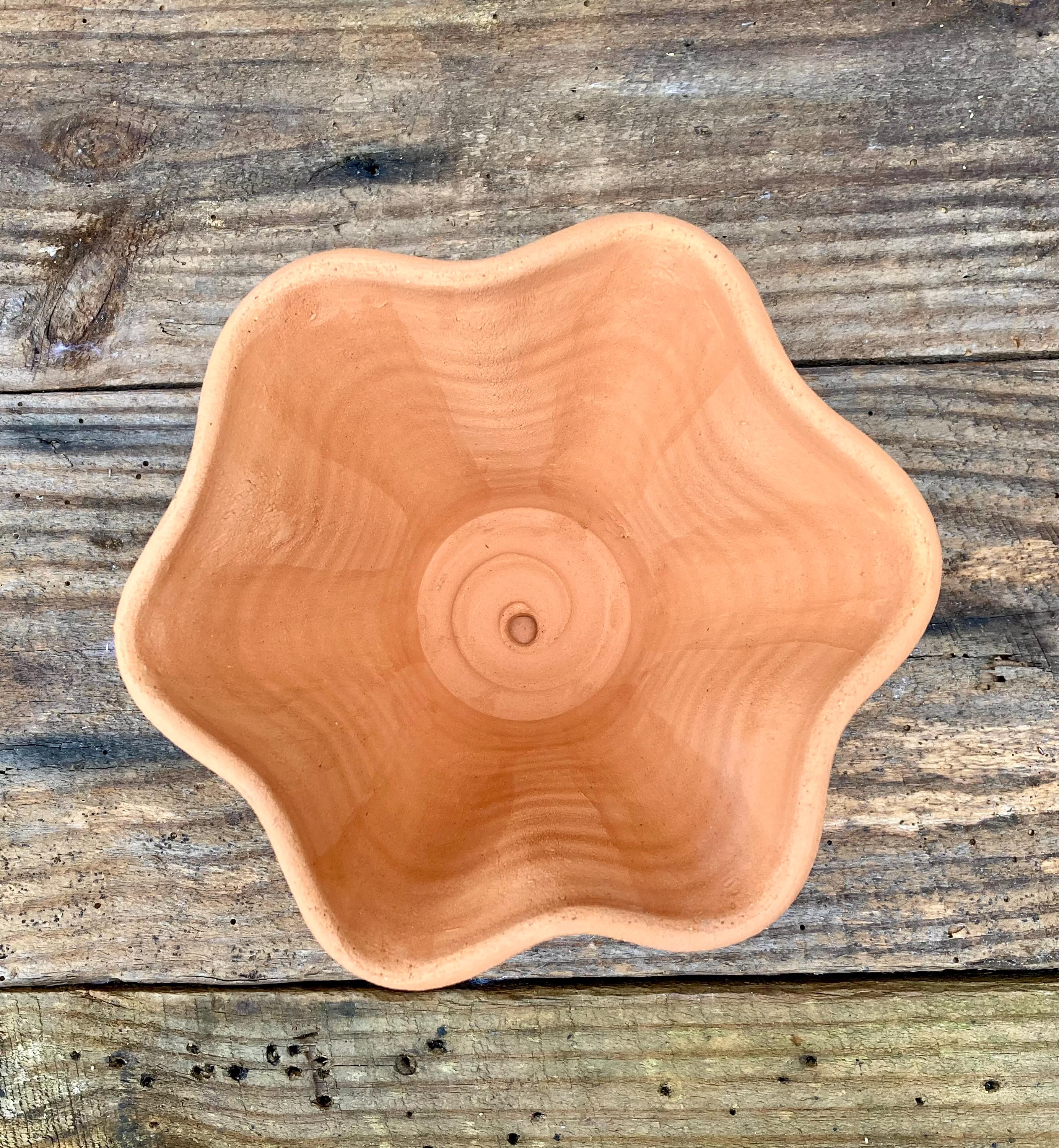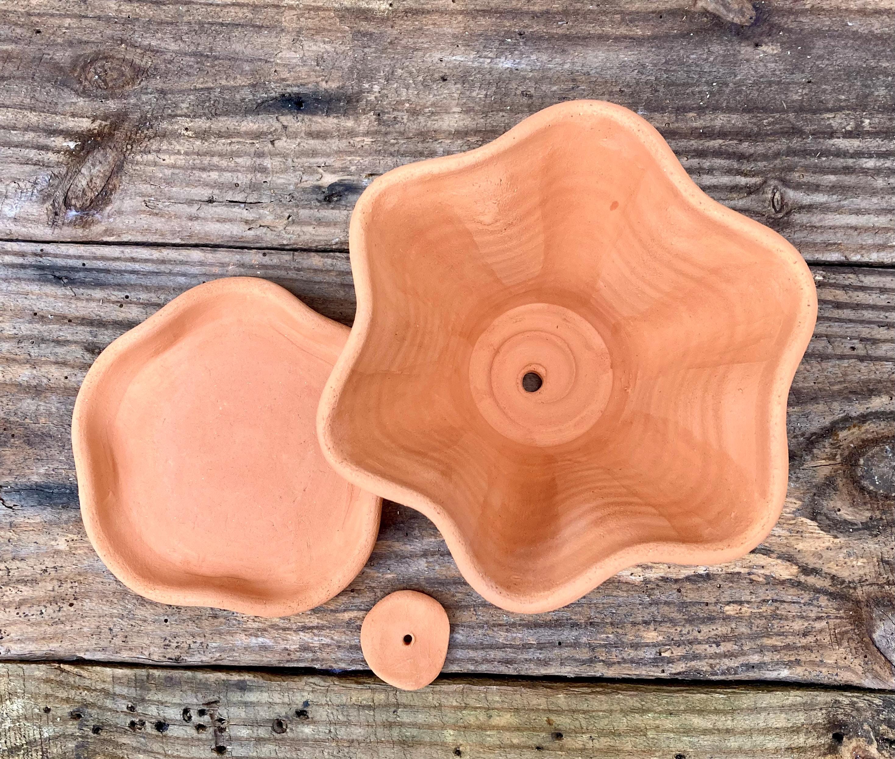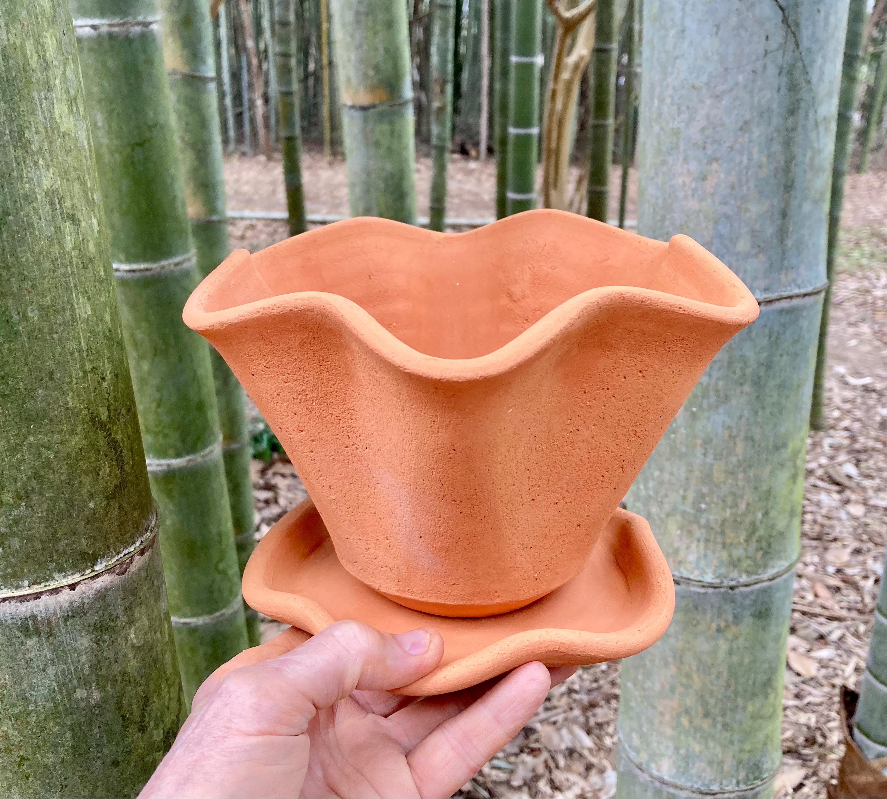 This fluted, terracotta planter with saucer was made of wheel-thrown, locally dug clay that when fired to the right temperature comes out a nice terracotta color and is porous. This allows air and water to flow through the pot which prevents root rot and soil disease.