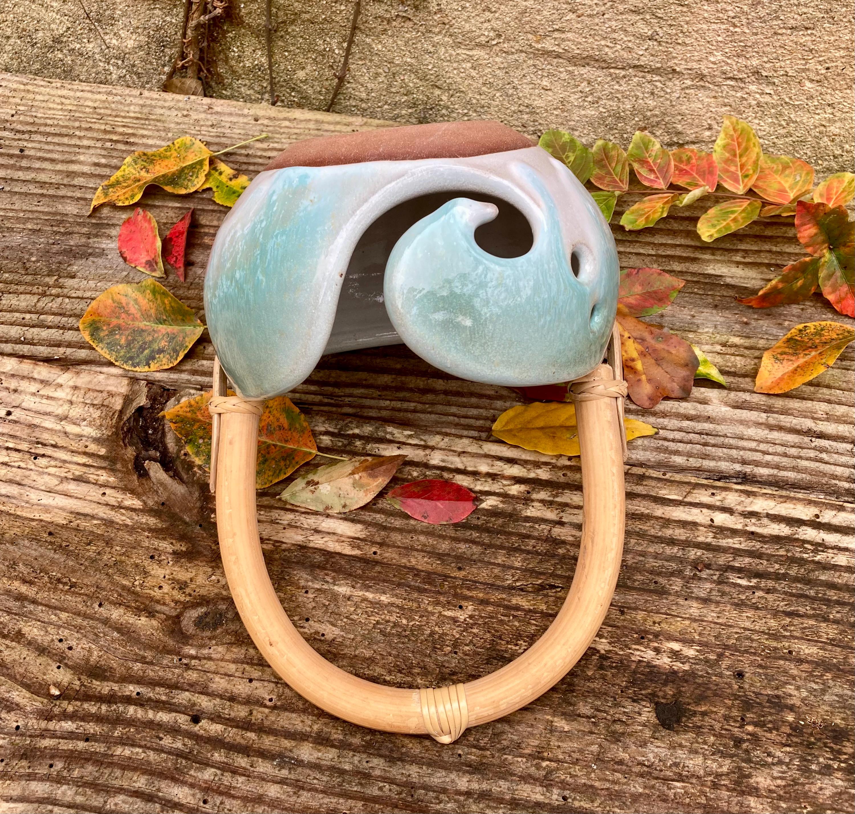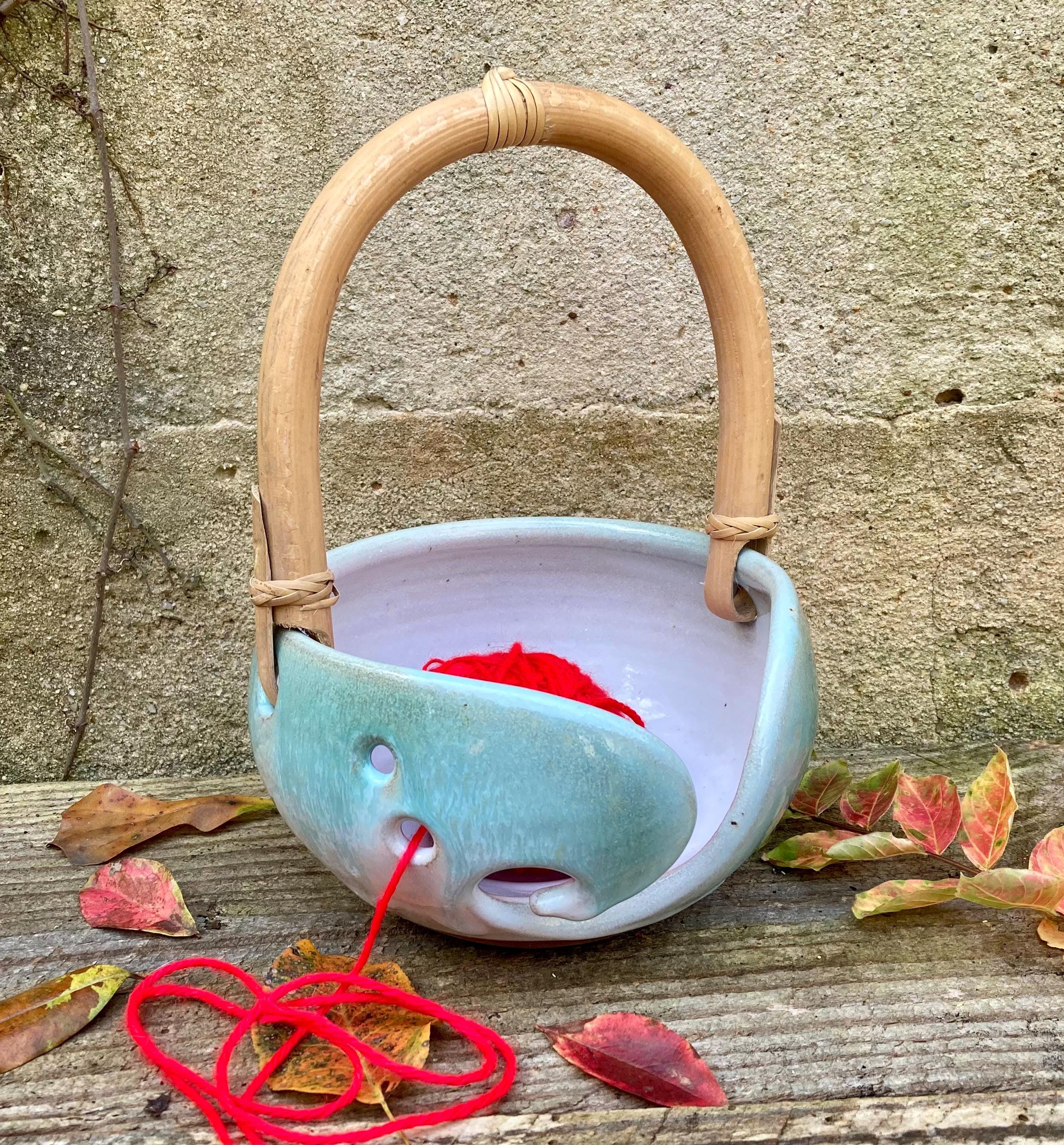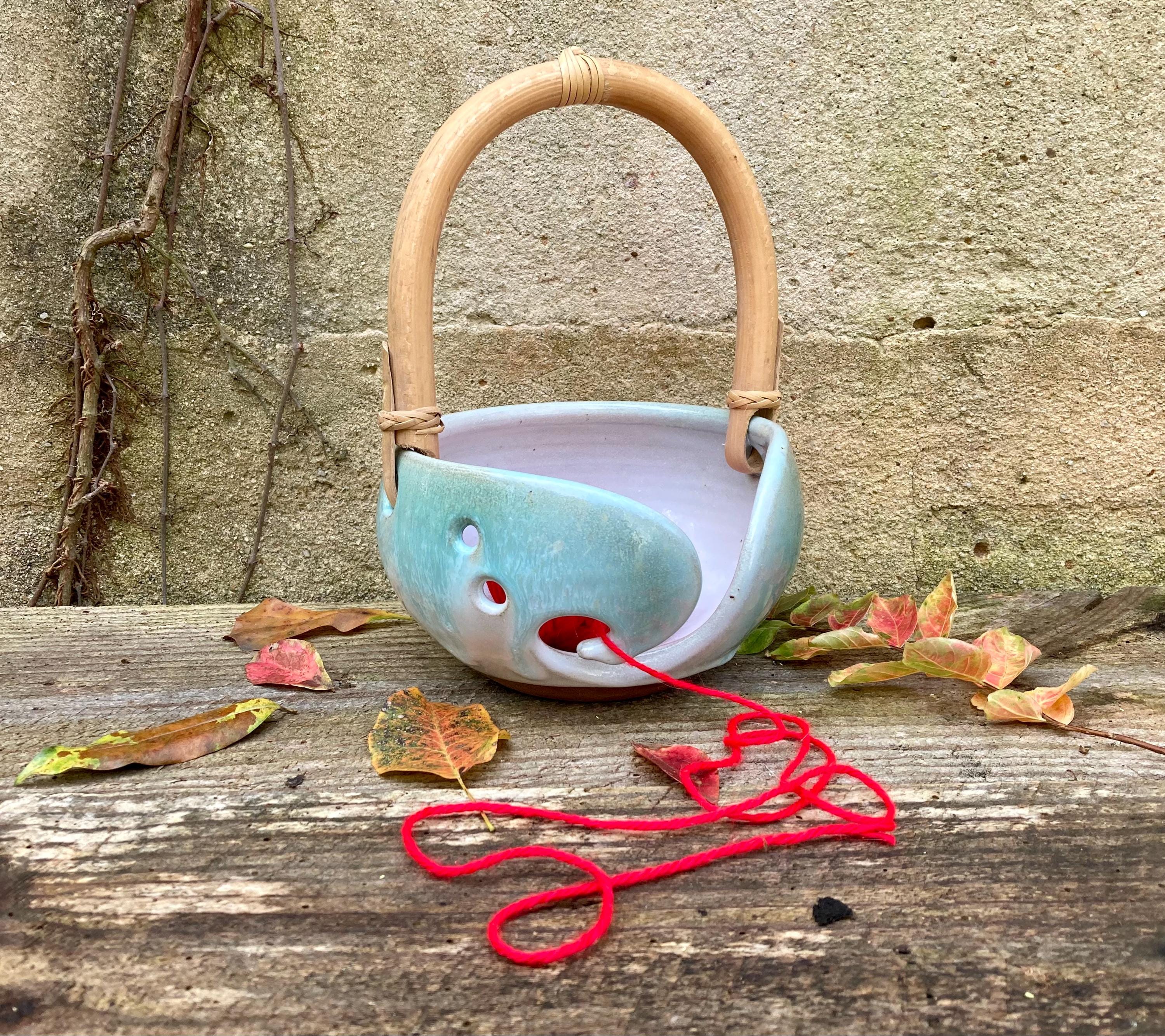 This stoneware knitting bowl with a cane handle was fired to vitrification for strength and durability. A long heat soak at 2300 degrees allowed the glazes time to mingle, run, and produce rich, interesting colors.