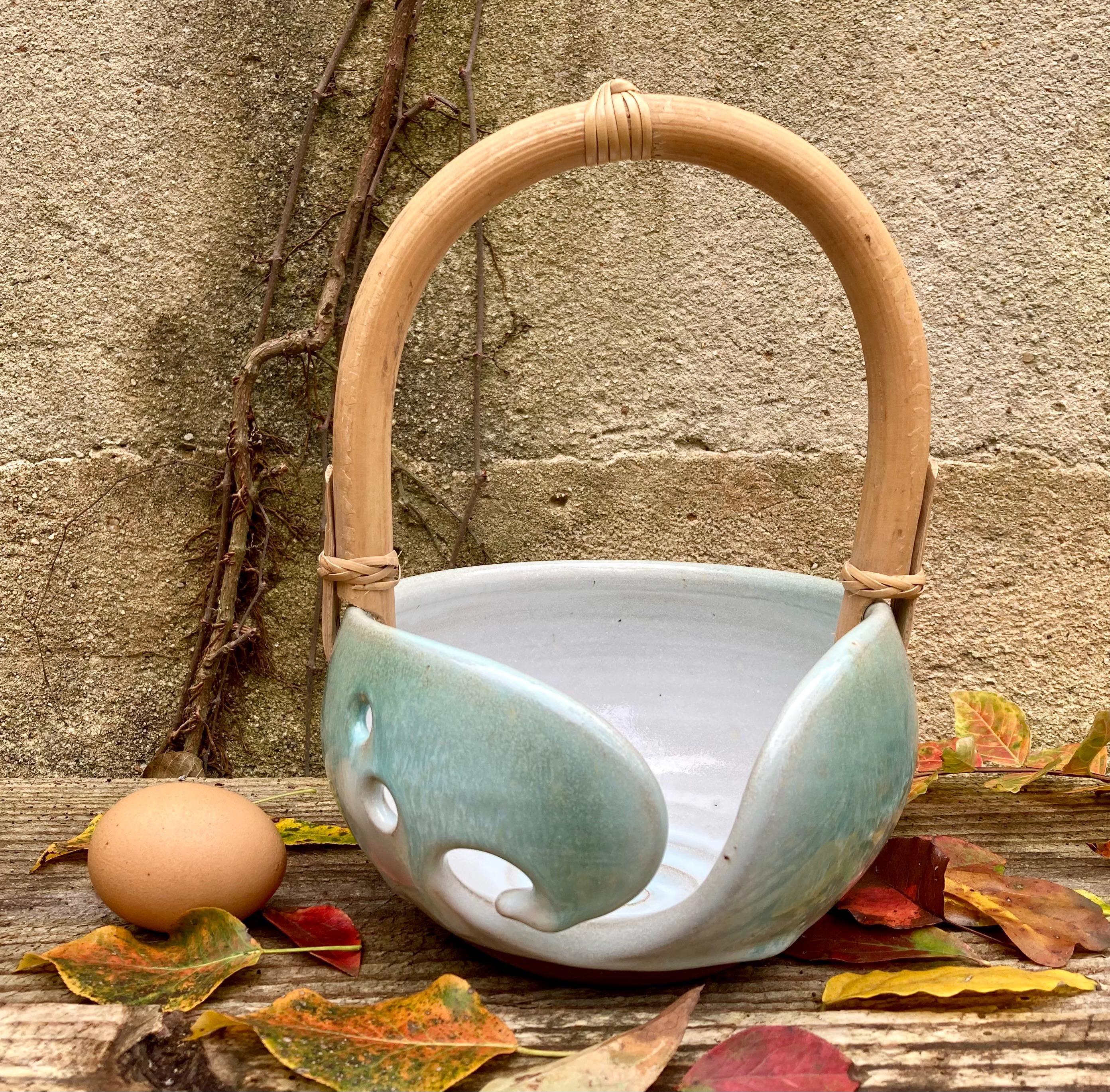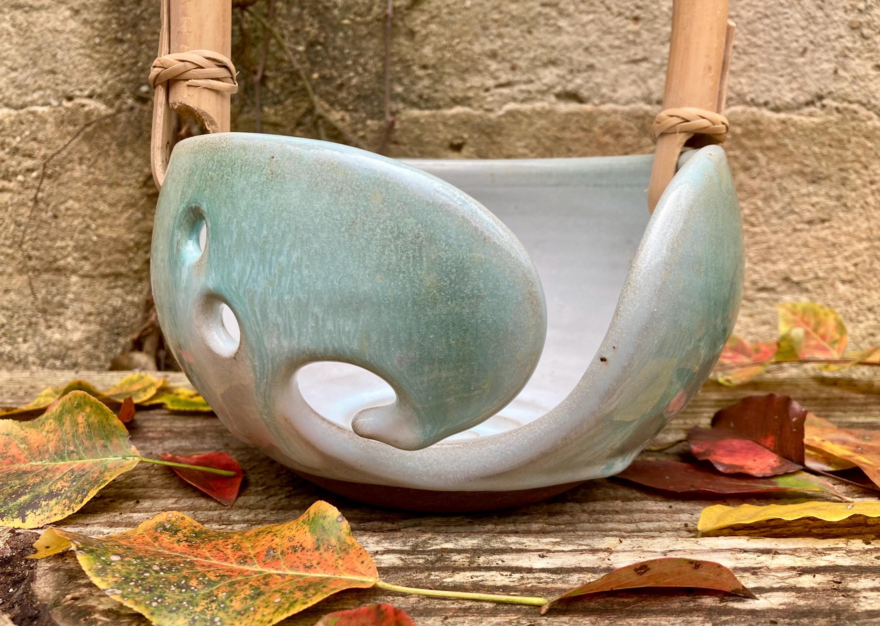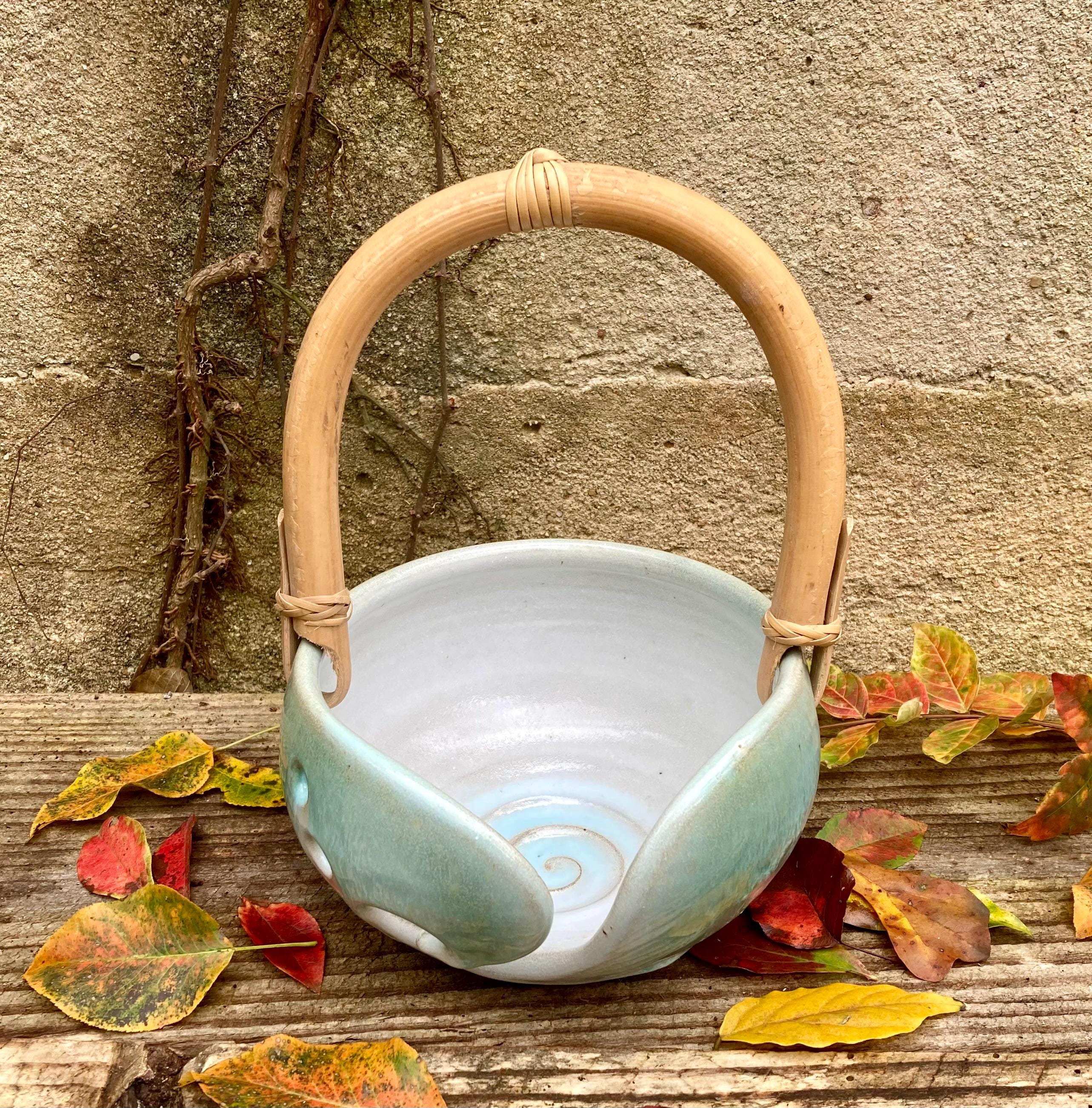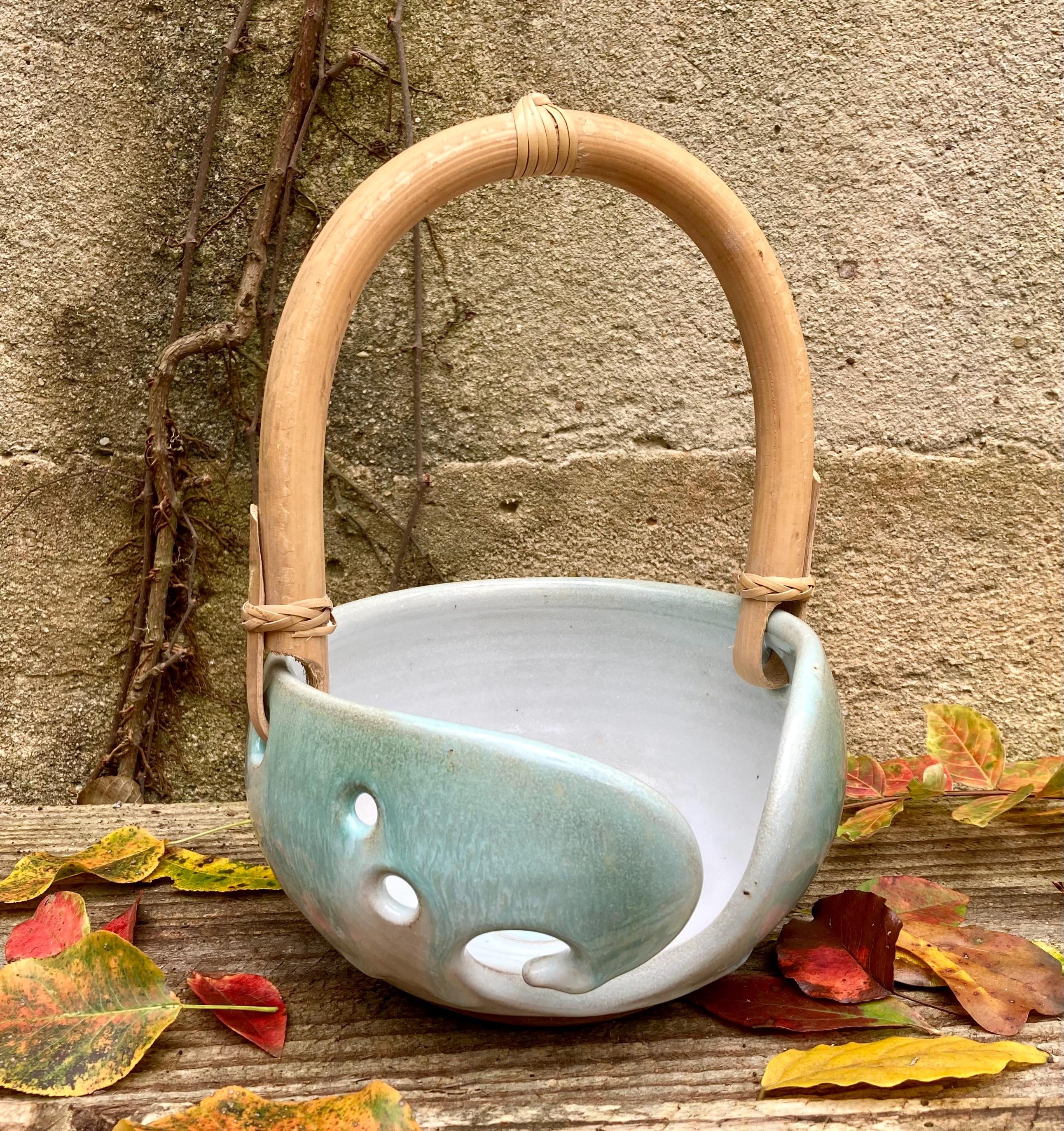 This stoneware knitting bowl with a cane handle was fired to vitrification for strength and durability. A long heat soak at 2300 degrees allowed the glazes time to mingle, run, and produce rich, interesting colors.
