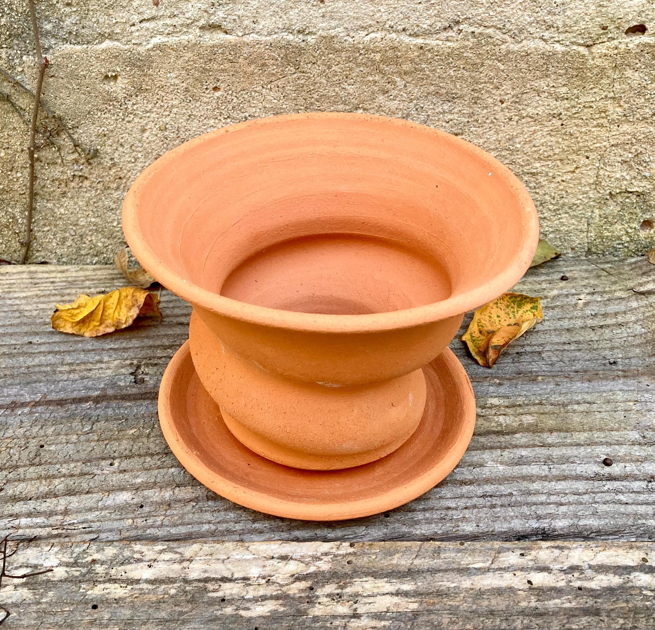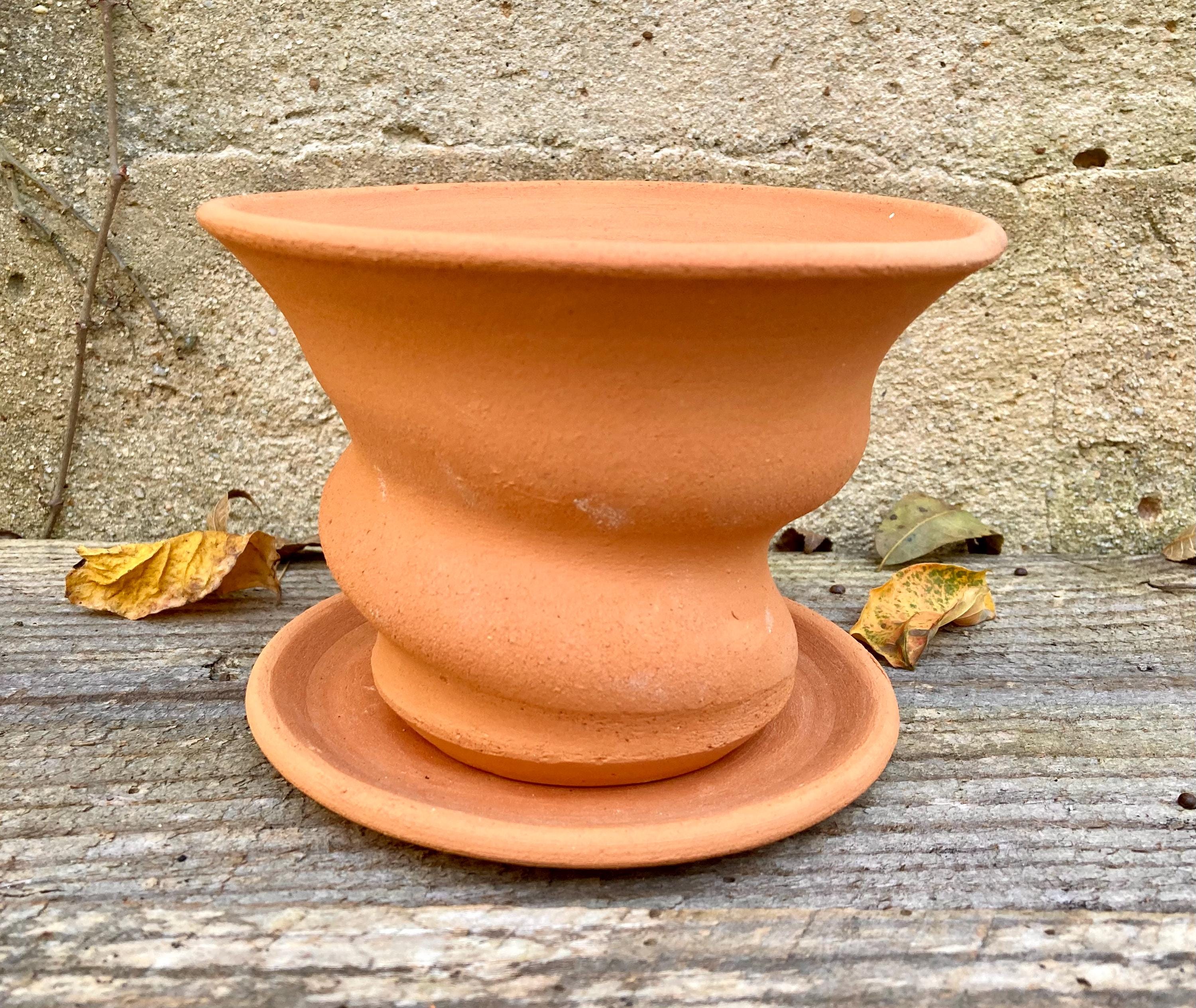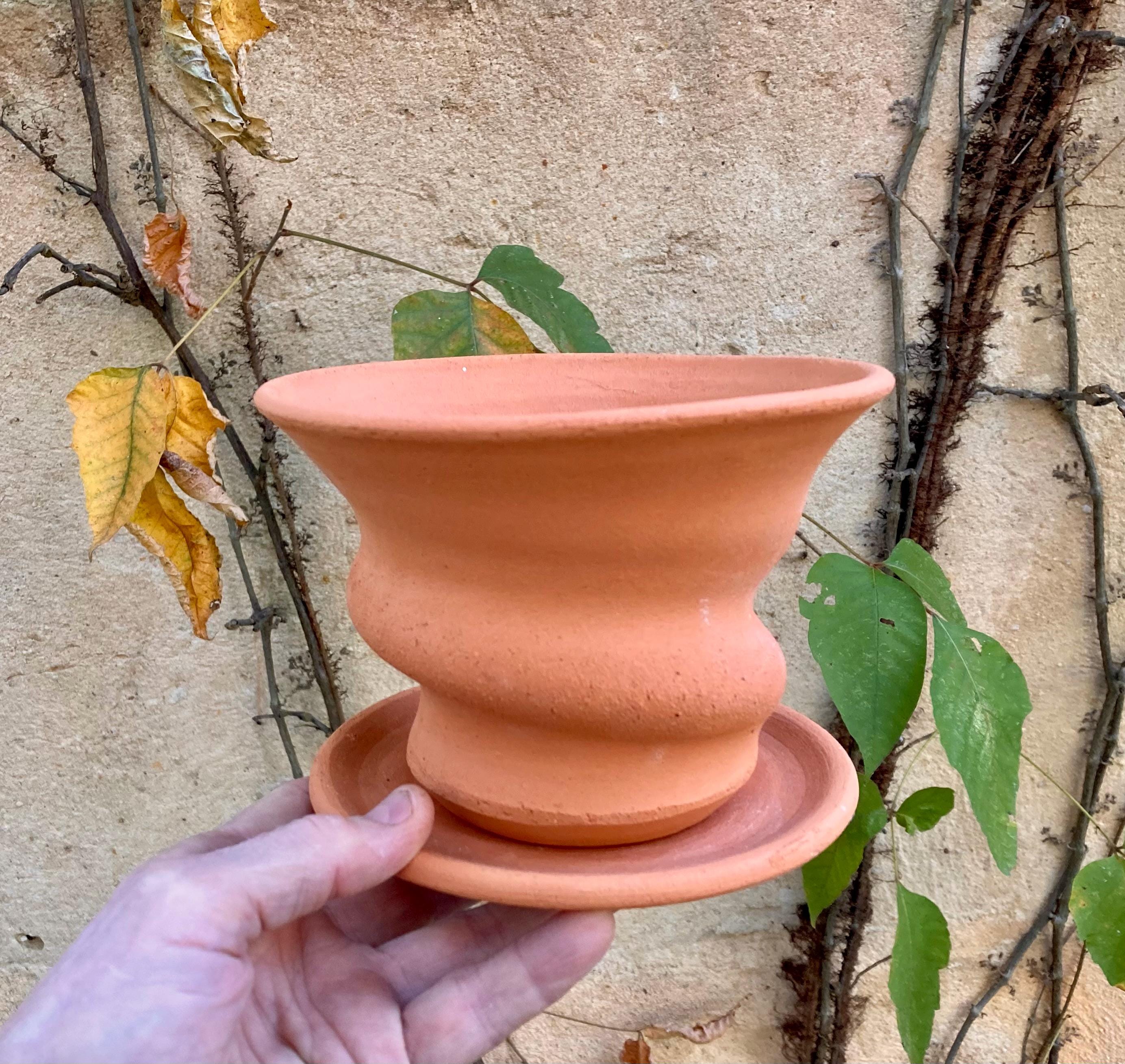 This small, terracotta planter with saucer was made of wheel-thrown, locally dug clay that when fired to the right temperature comes out a nice terracotta color and is porous. This allows air and water to flow through the pot which prevents root rot and soil disease.