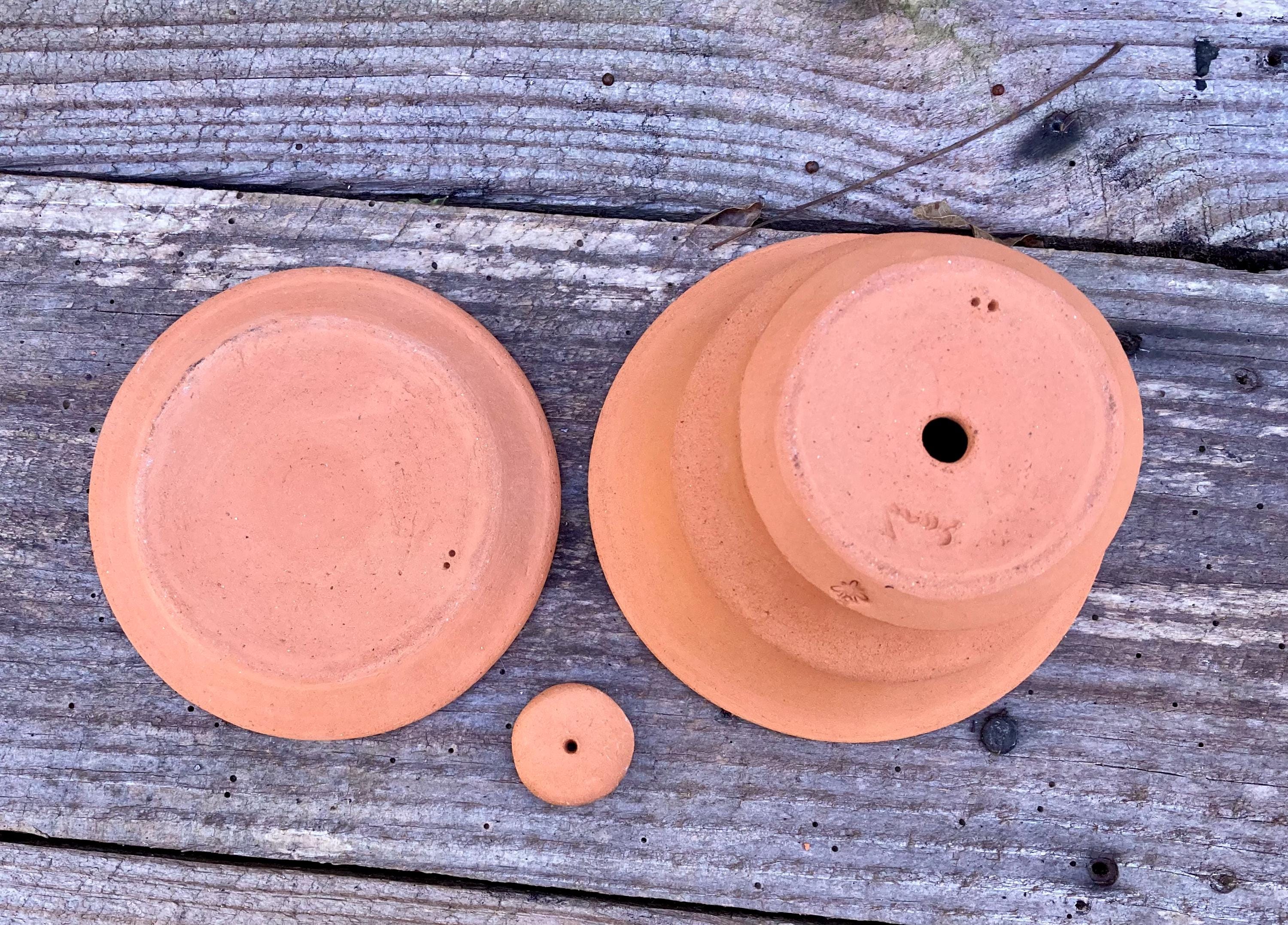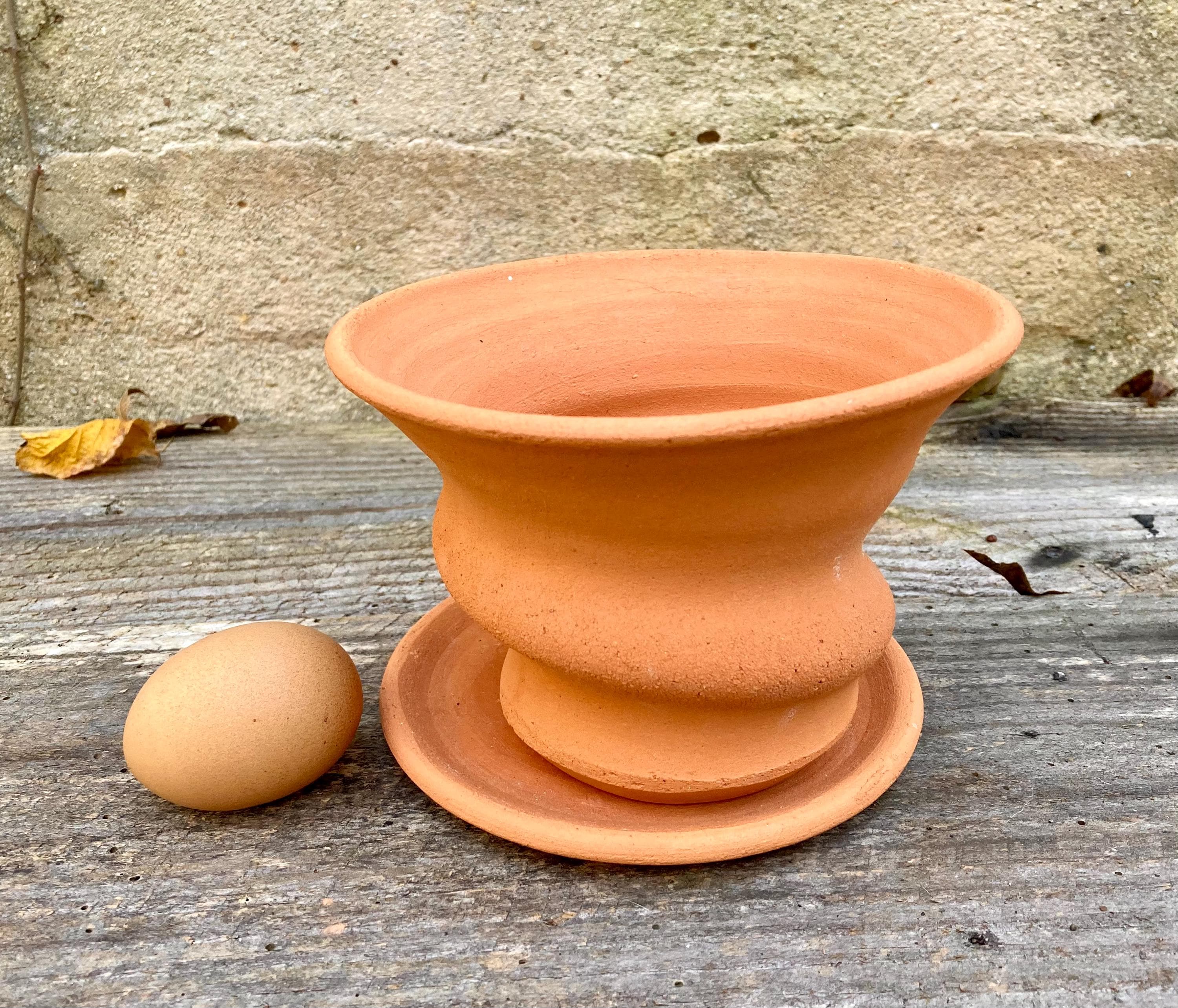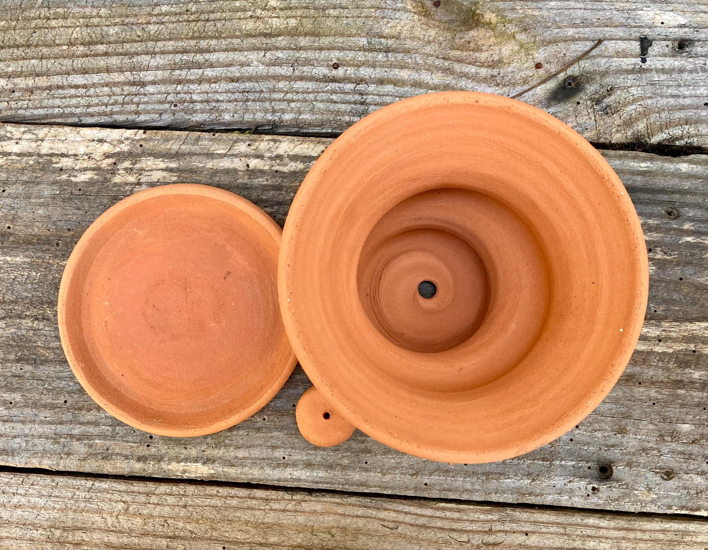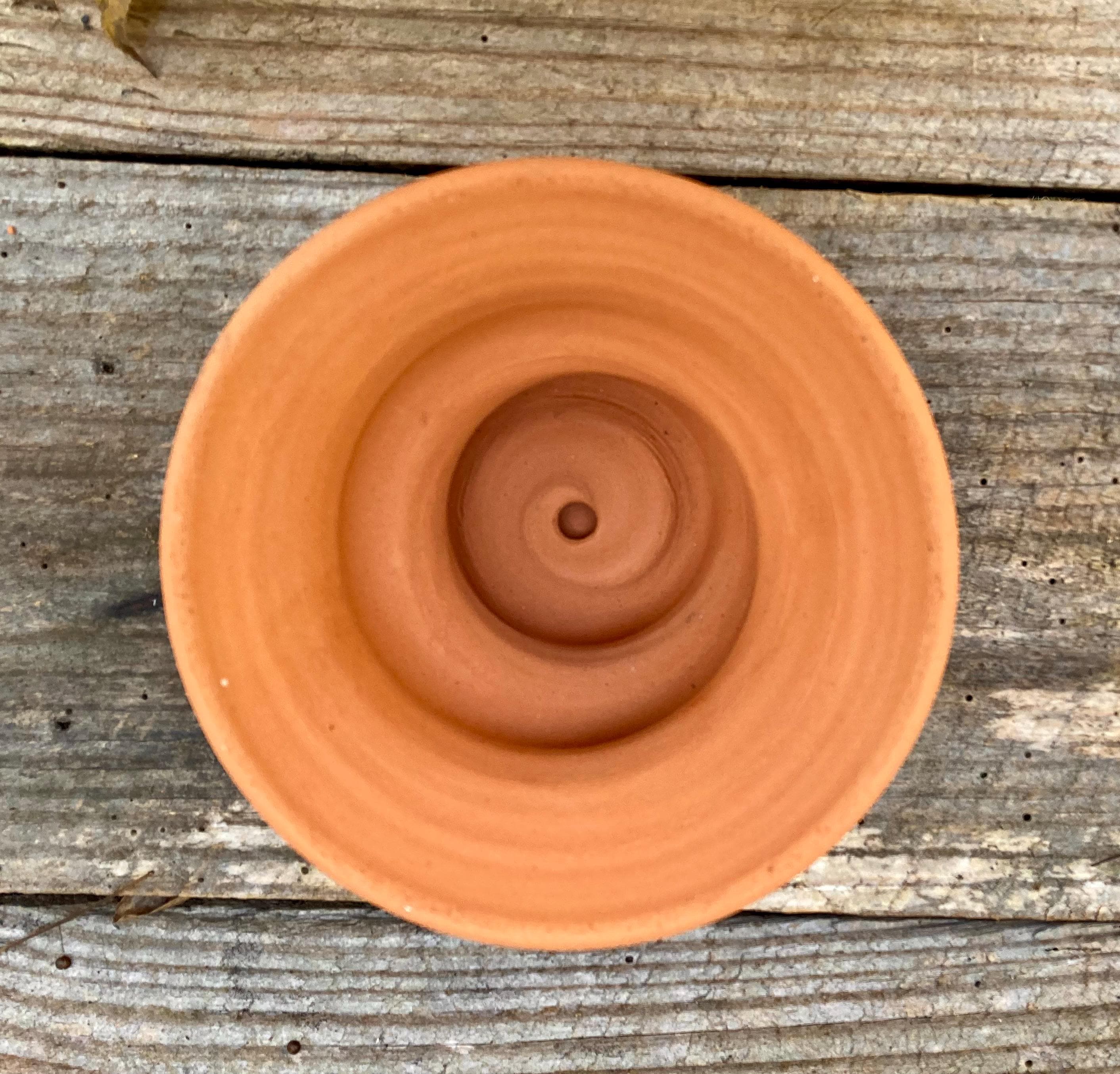 This small, terracotta planter with saucer was made of wheel-thrown, locally dug clay that when fired to the right temperature comes out a nice terracotta color and is porous. This allows air and water to flow through the pot which prevents root rot and soil disease.