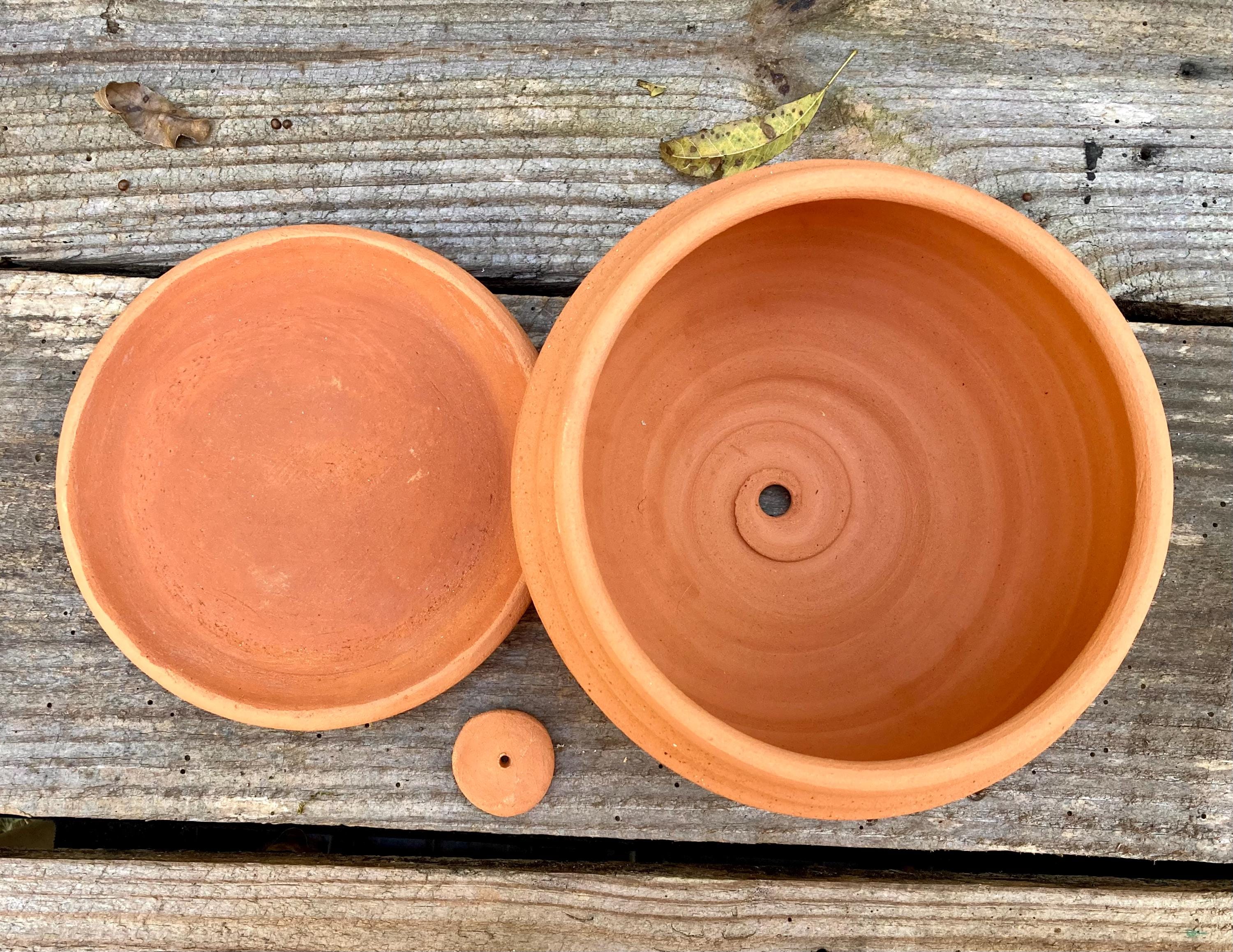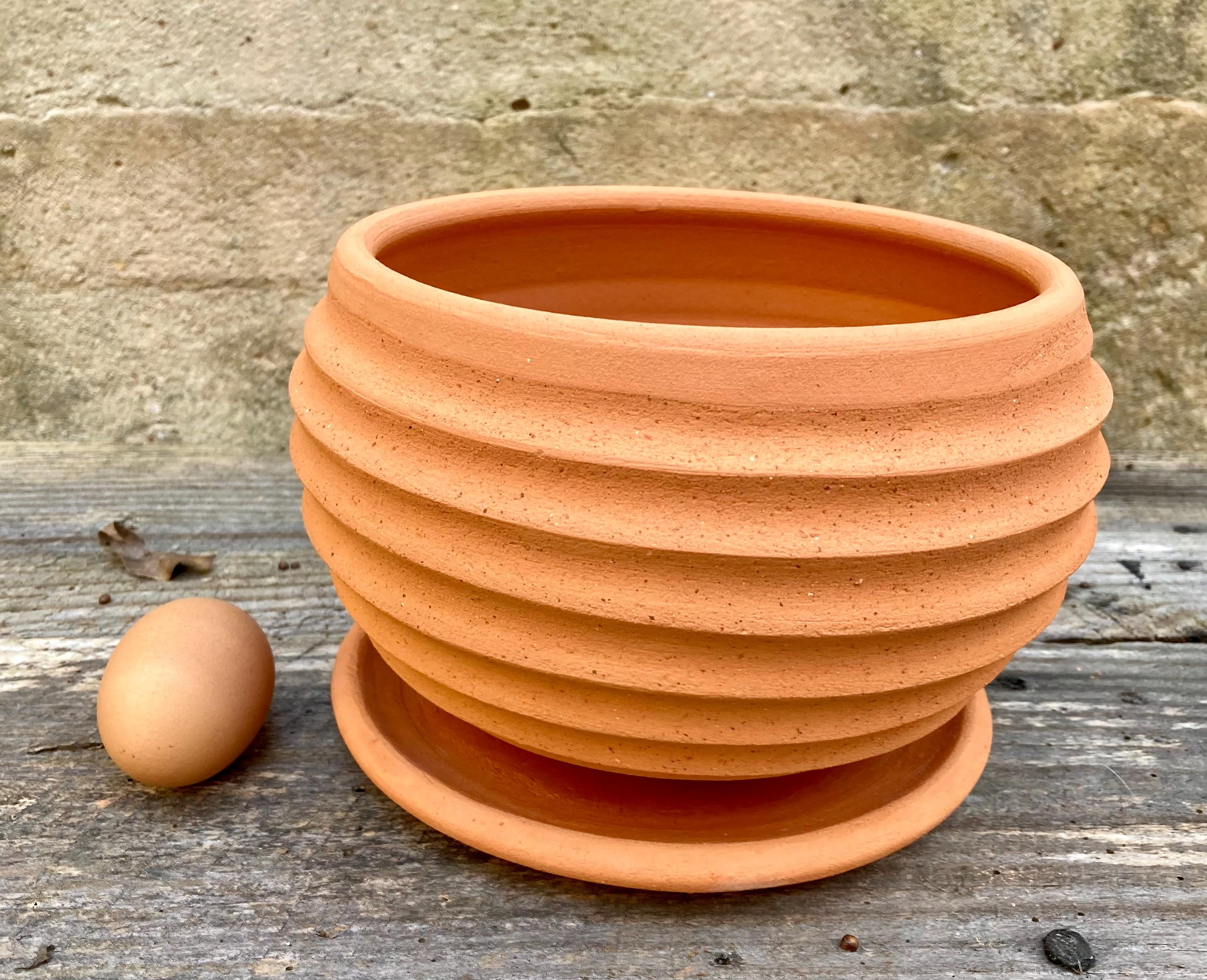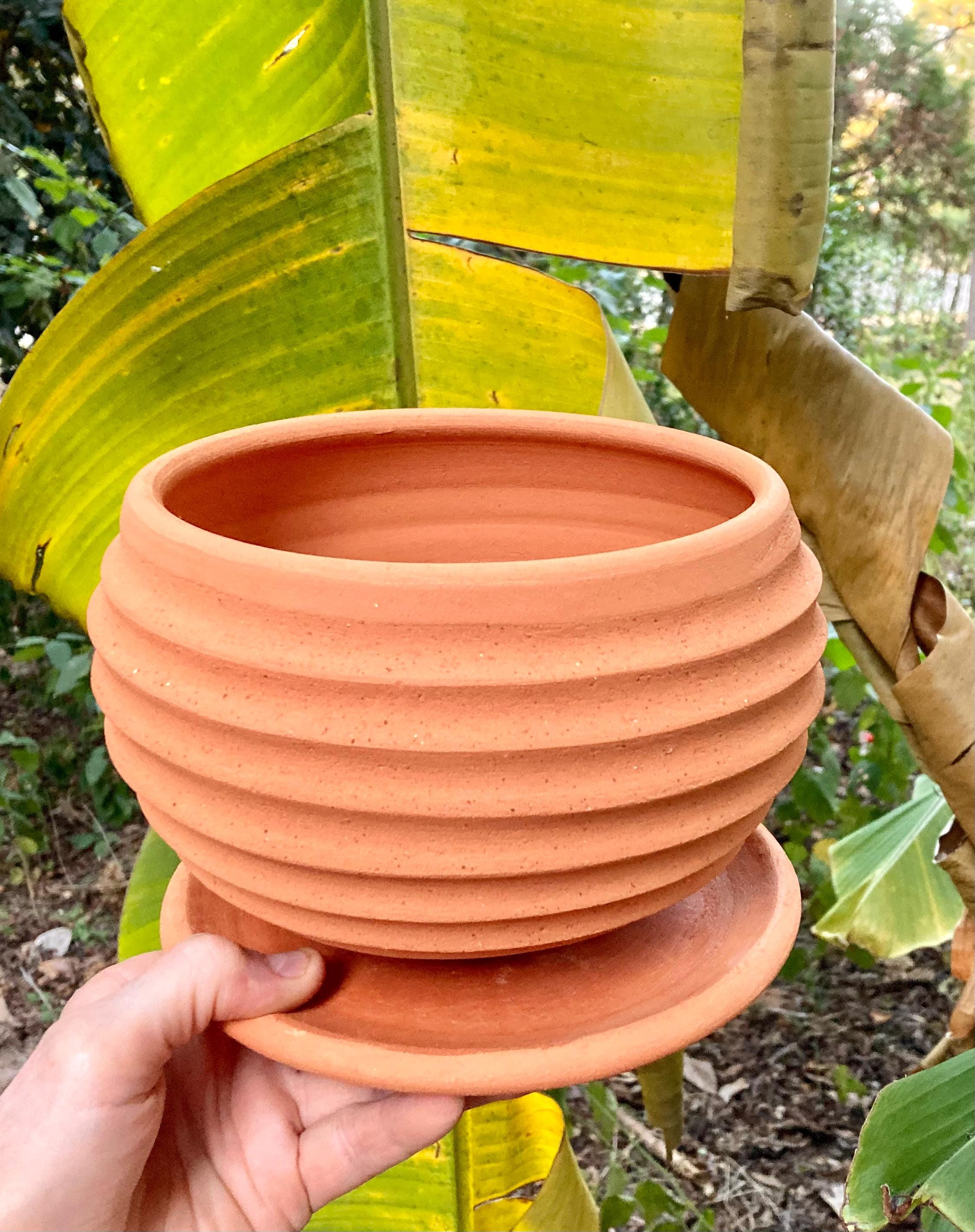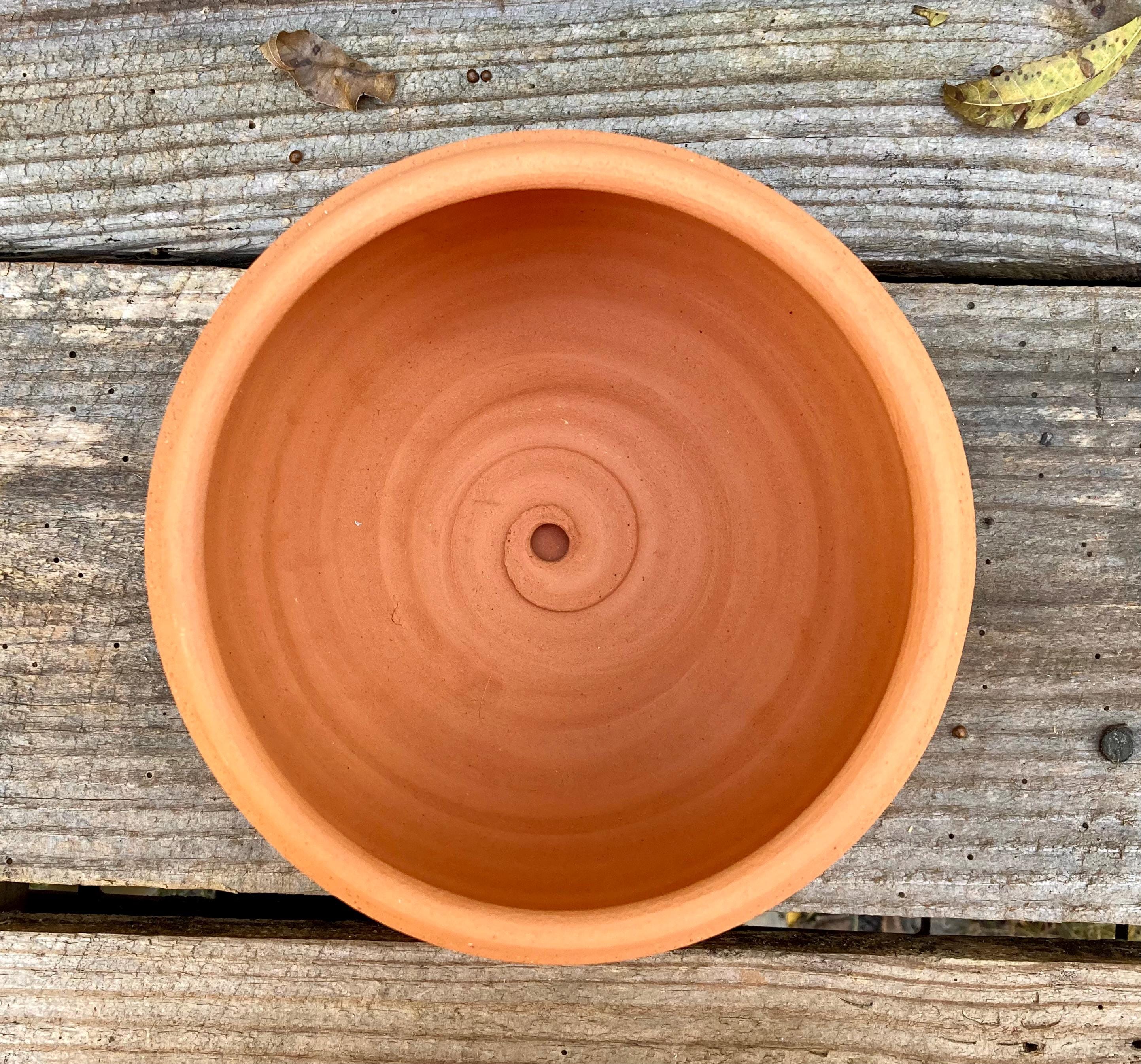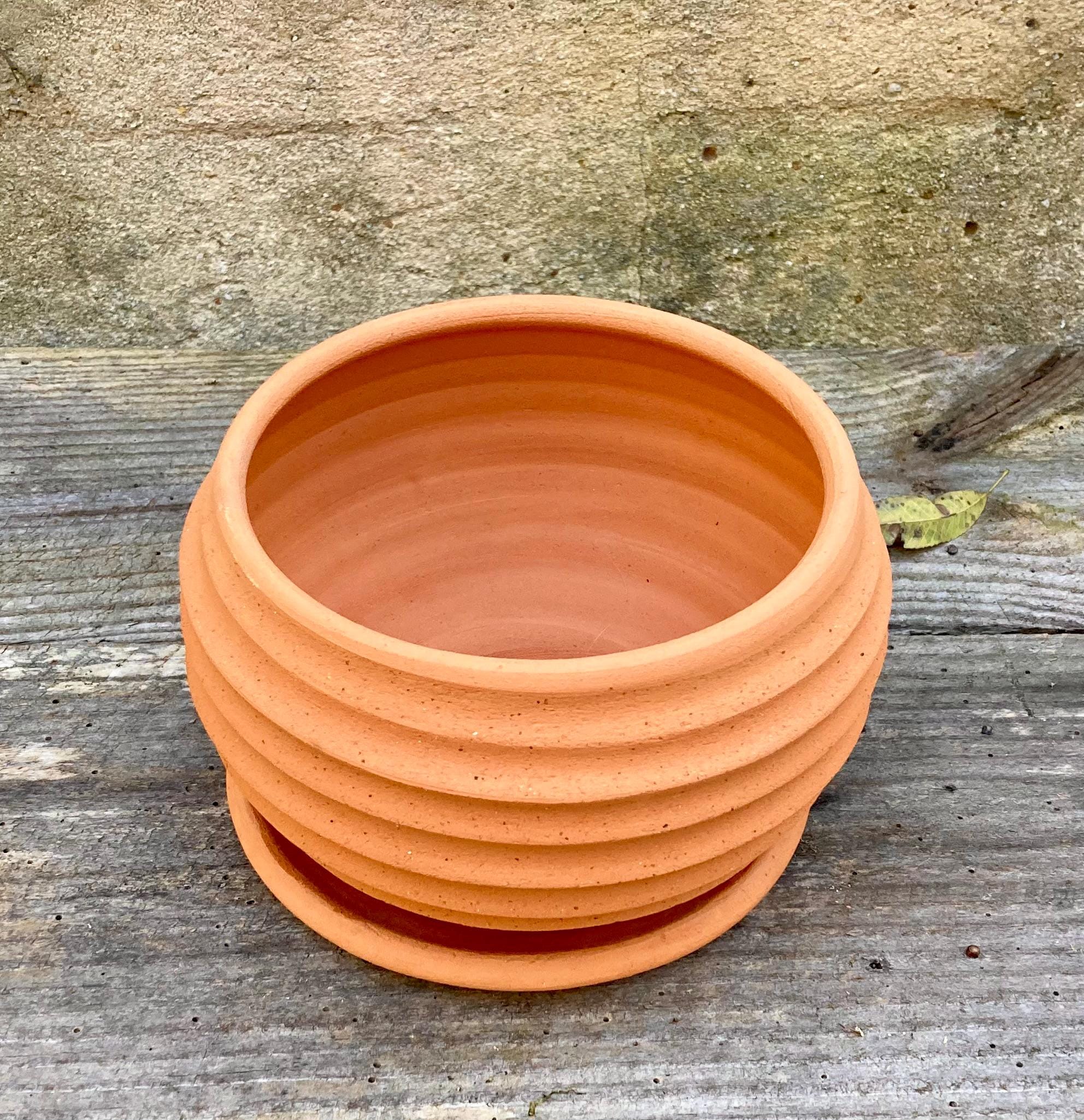 This terracotta planter was made of wheel-thrown, locally dug clay that when fired to the right temperature comes out a nice terracotta color and is porous. This allows air and water to flow through the pot which prevents root rot and soil disease.