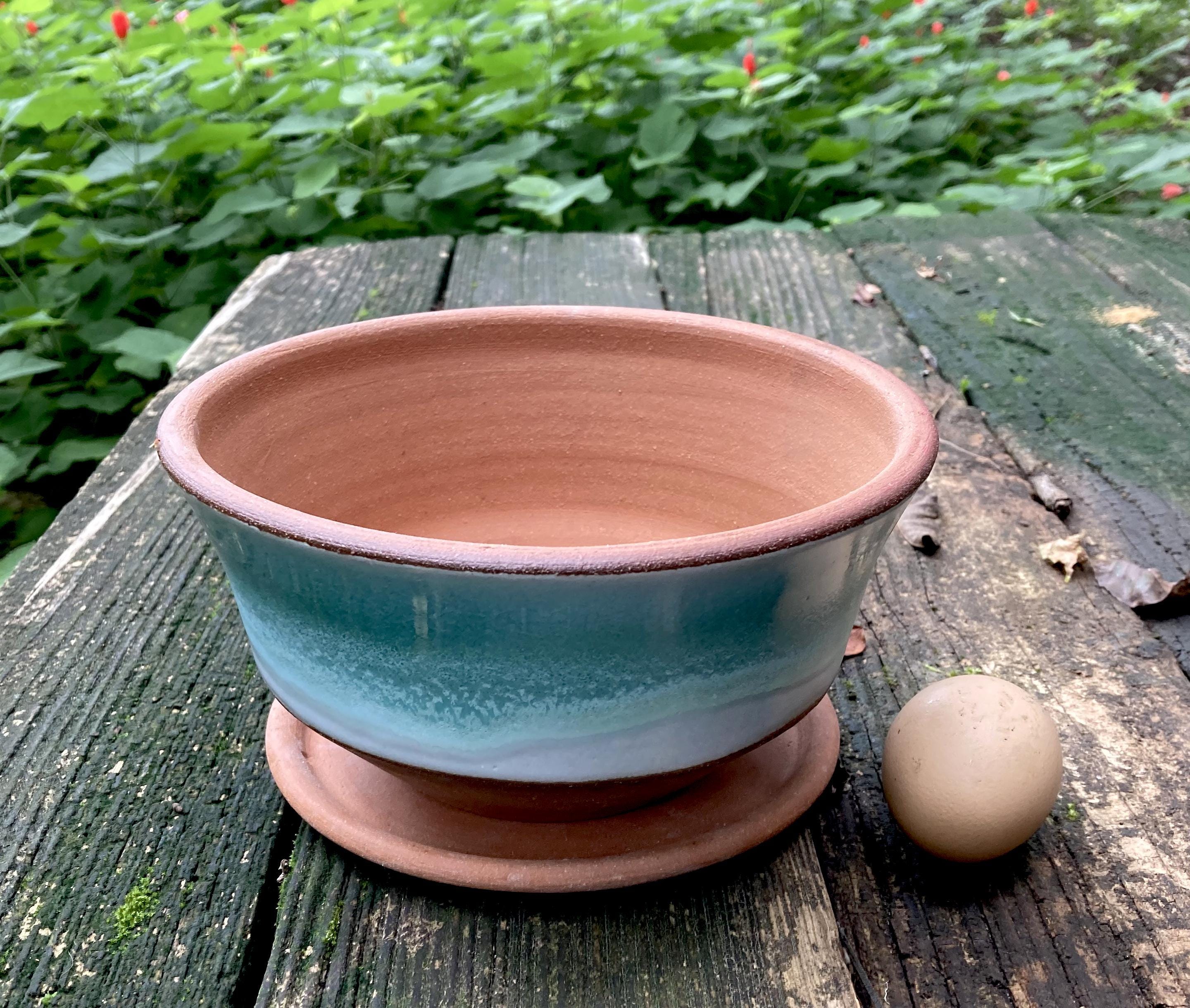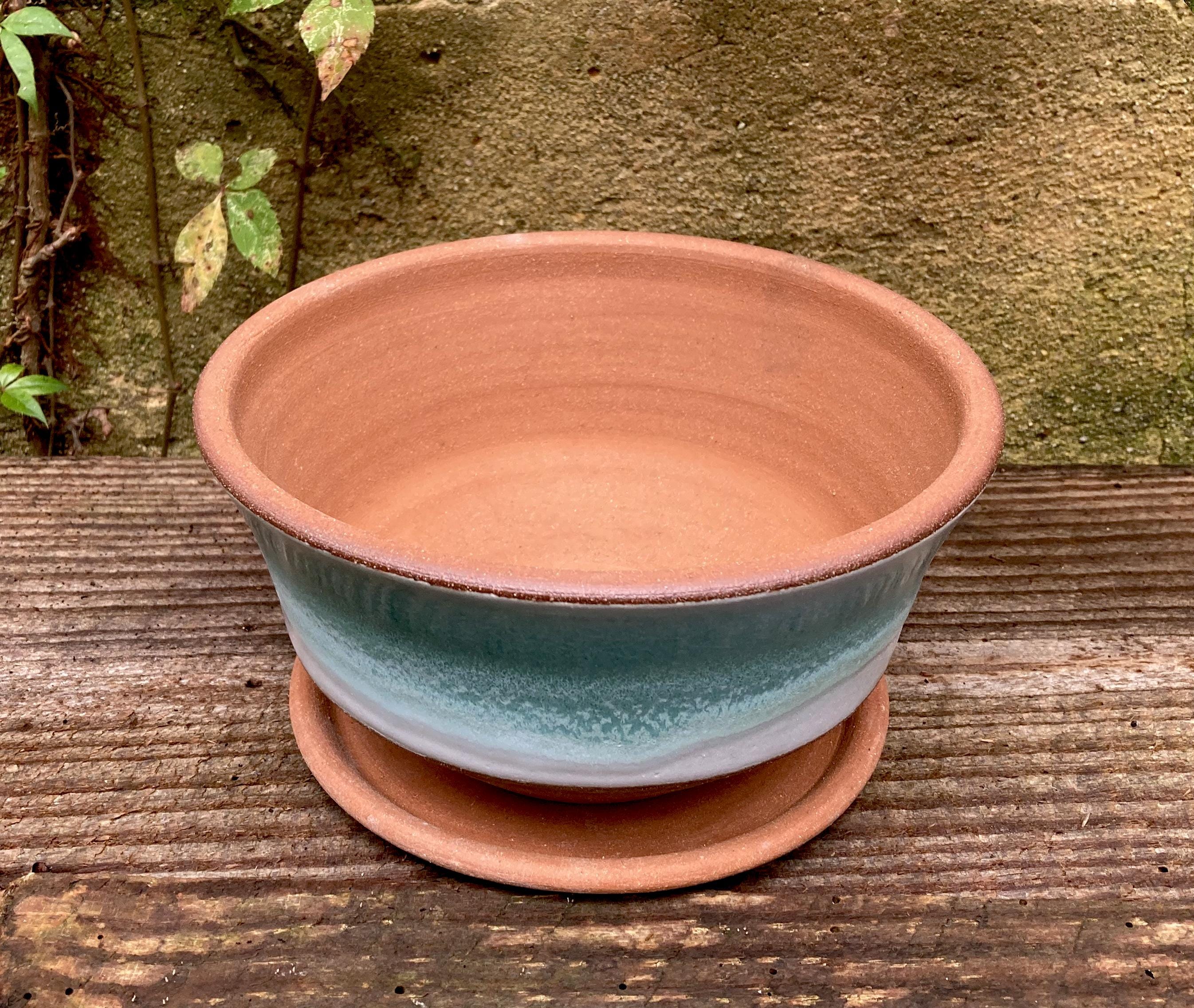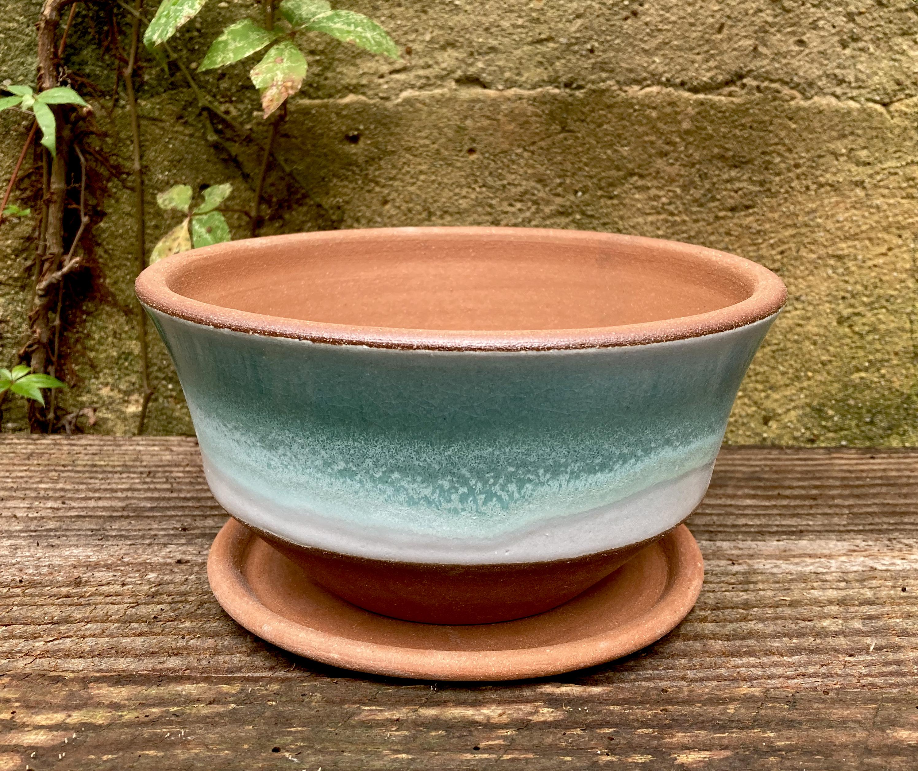 This stoneware planter with saucer was wheel-thrown and fired to 2300 degrees for strength and durability. It was slow cooled to give the glazes time to run together, pool and develop subtle variations.