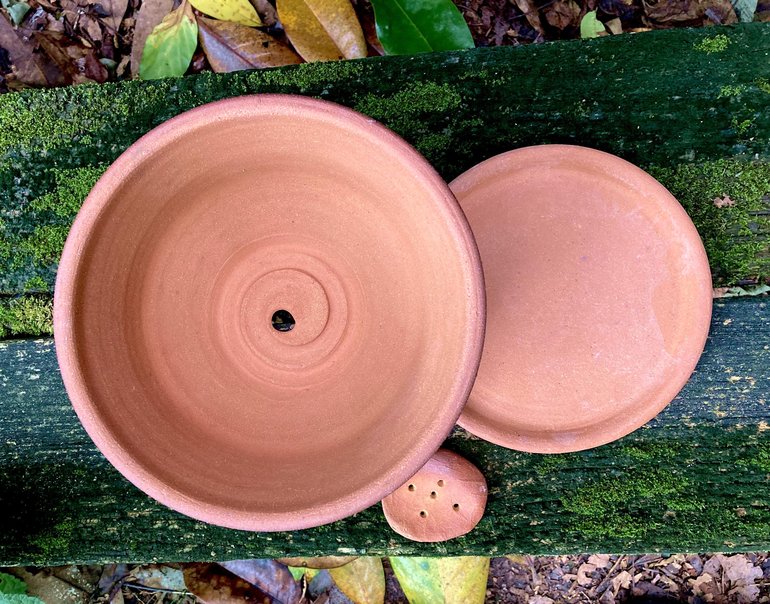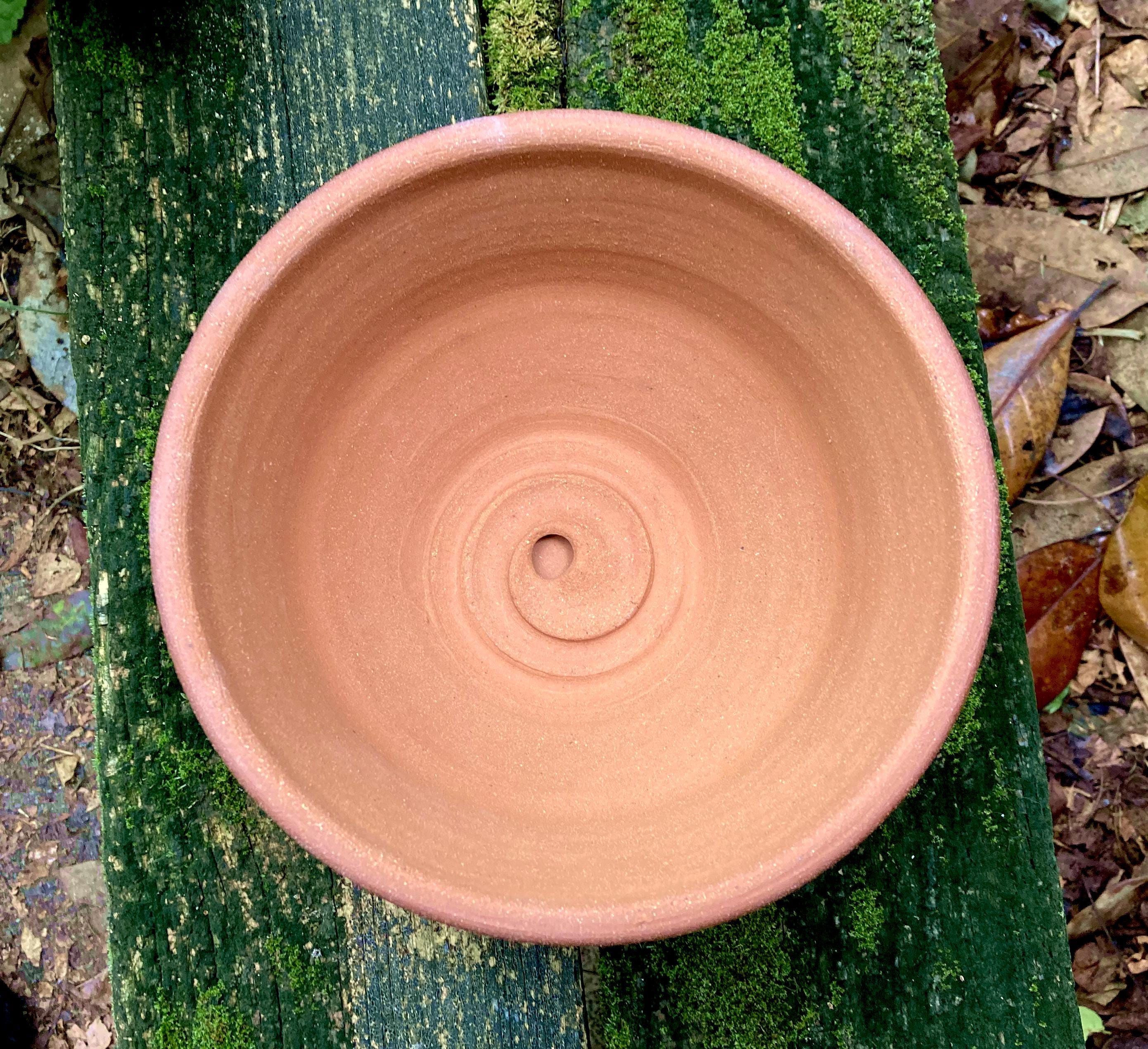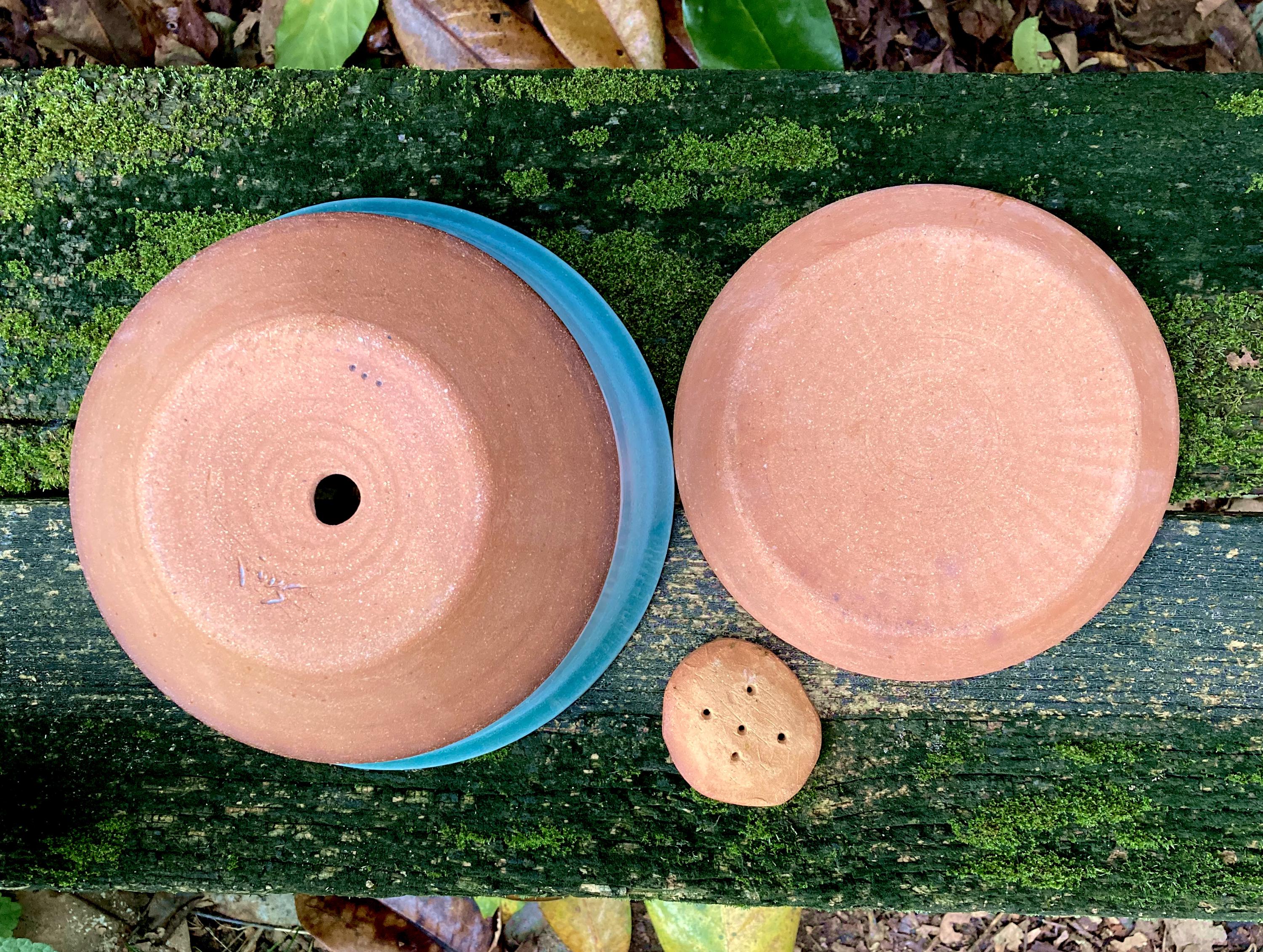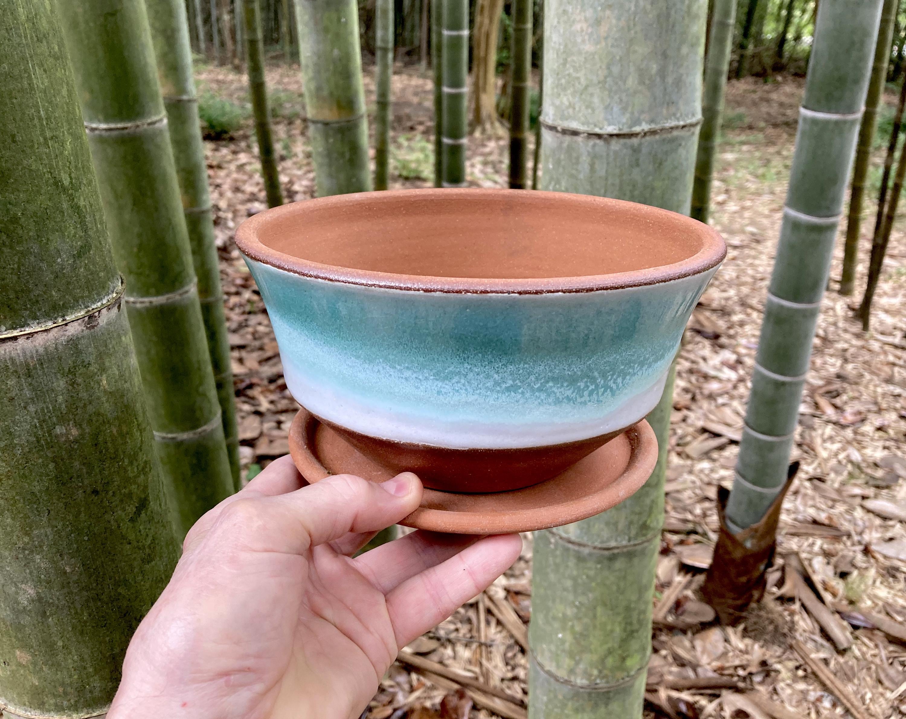 This stoneware planter with saucer was wheel-thrown and fired to 2300 degrees for strength and durability. It was slow cooled to give the glazes time to run together, pool and develop subtle variations.