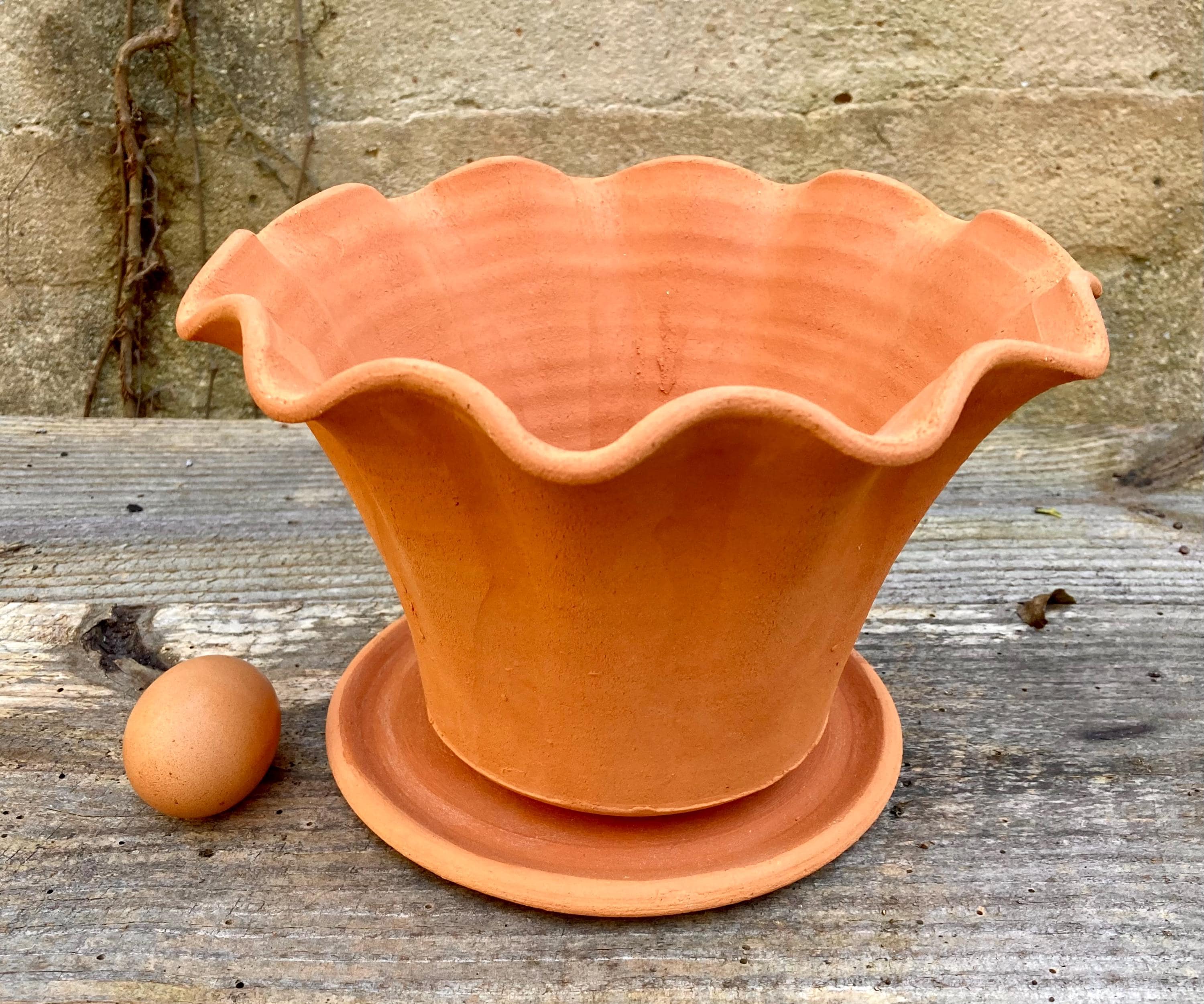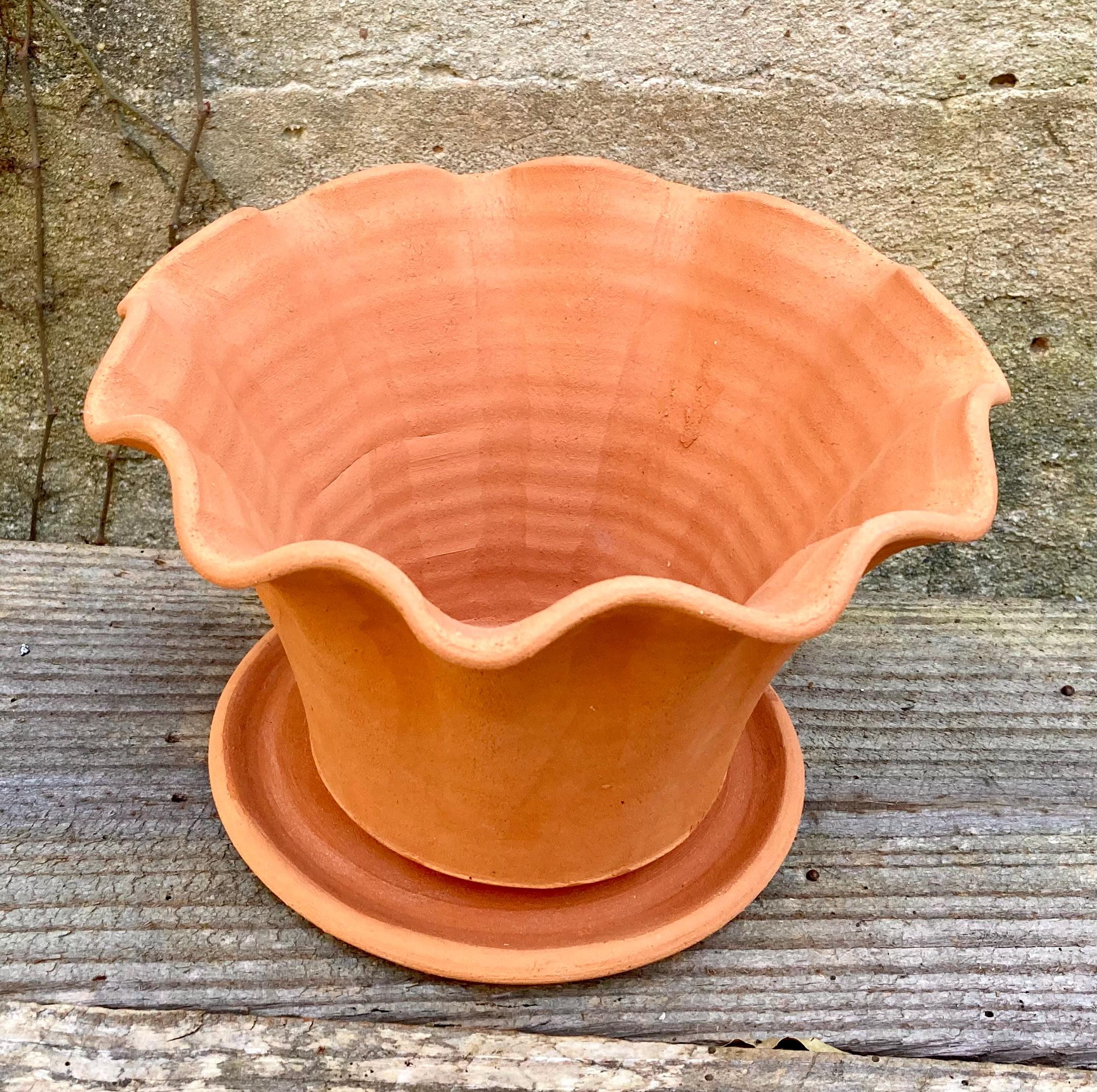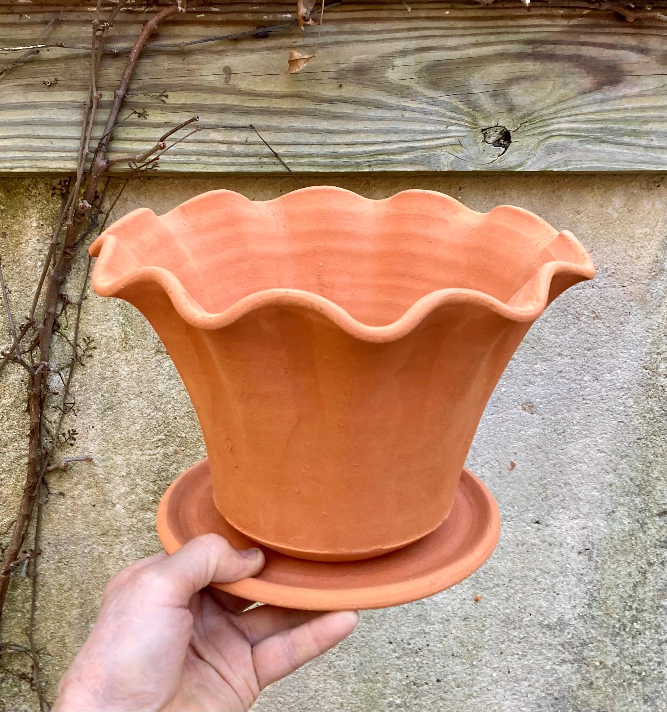This fluted, terra cotta planter with saucer was made of wheel-thrown, locally dug clay that when fired to the right temperature comes out a nice terracotta color and is porous. This allows air and water to flow through the pot which prevents root rot and soil disease.