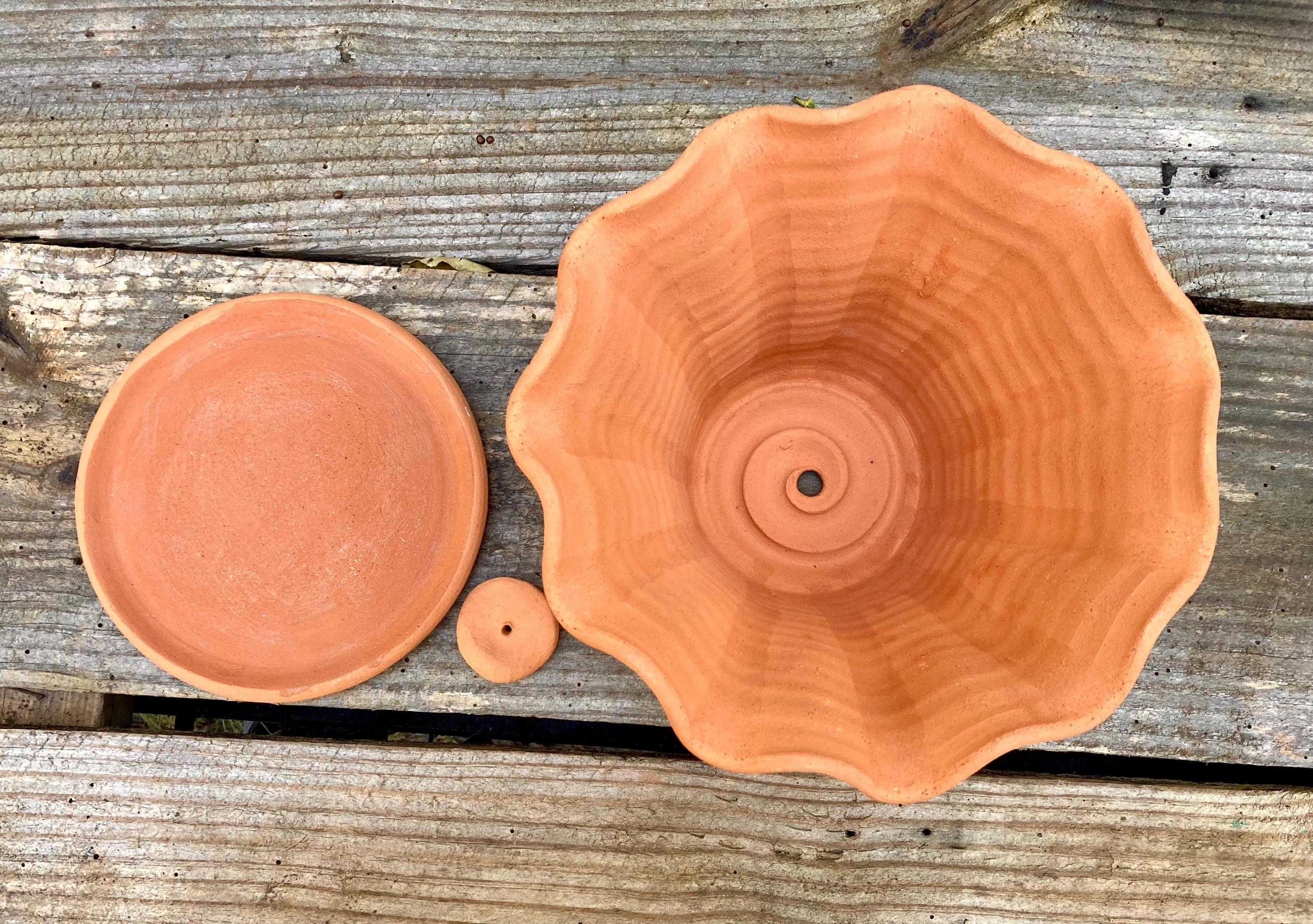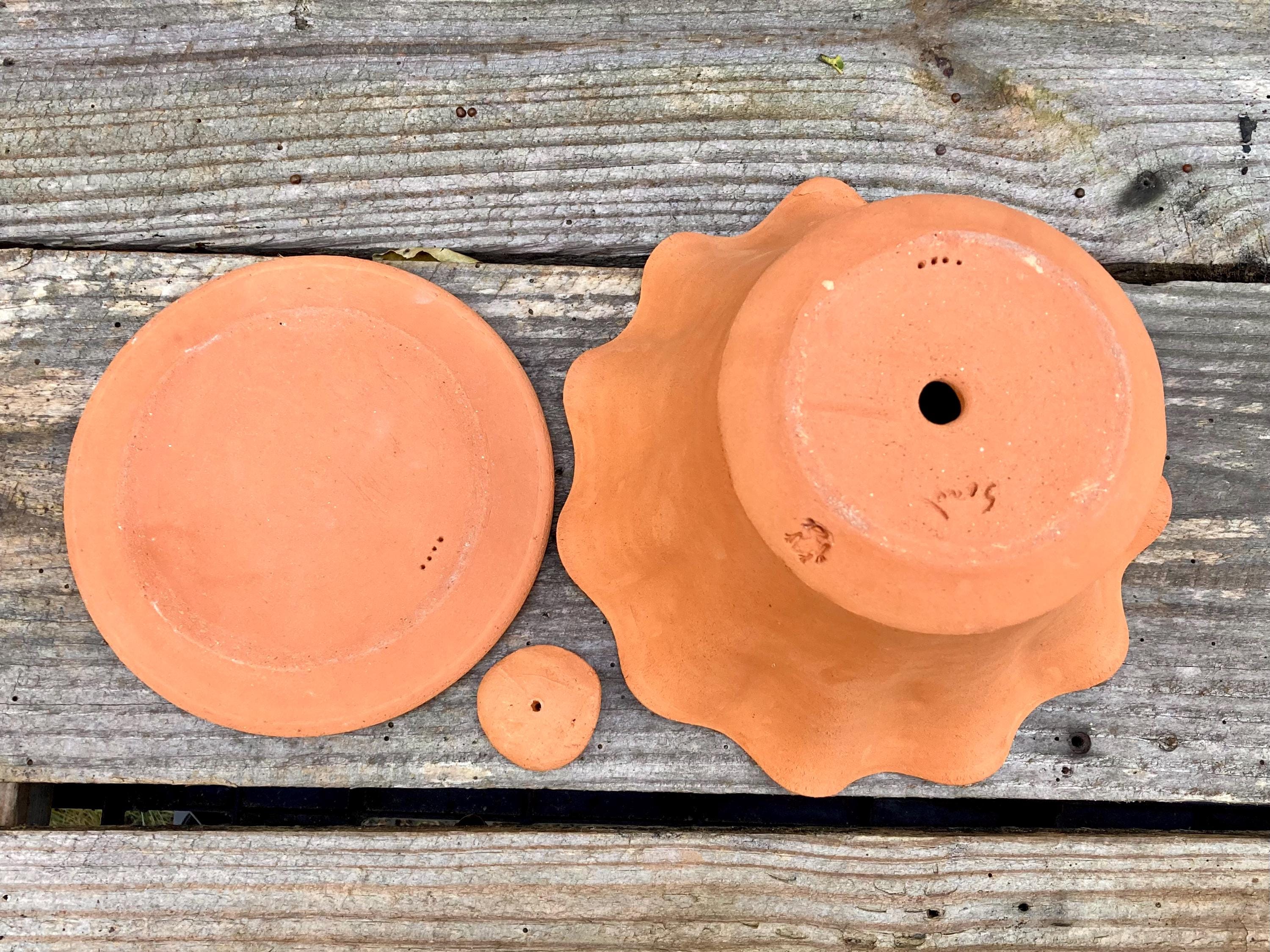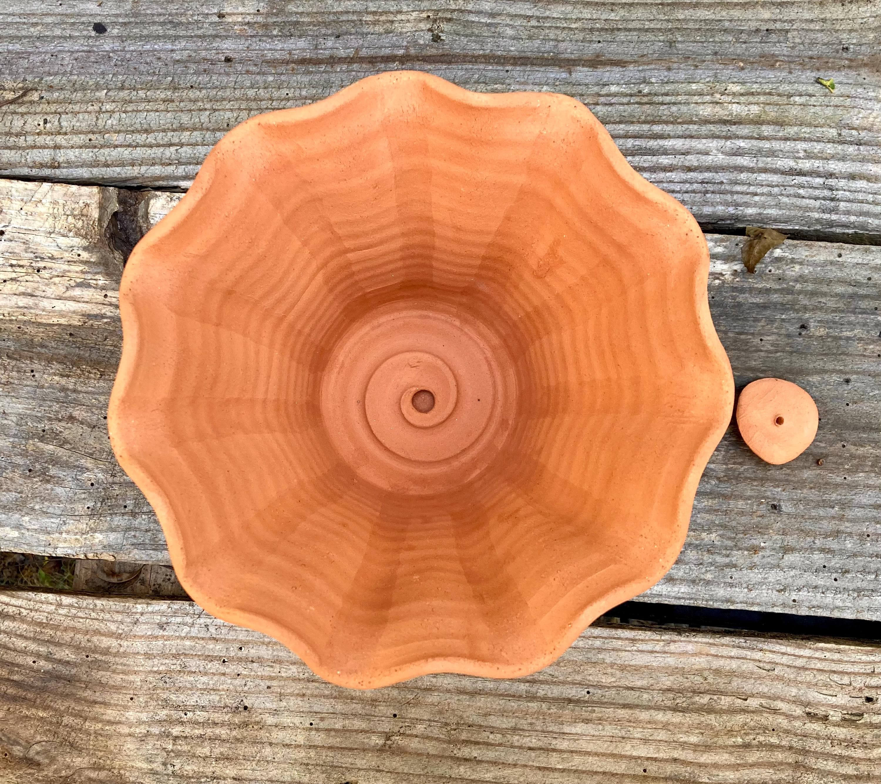 This fluted, terra cotta planter with saucer was made of wheel-thrown, locally dug clay that when fired to the right temperature comes out a nice terracotta color and is porous. This allows air and water to flow through the pot which prevents root rot and soil disease.