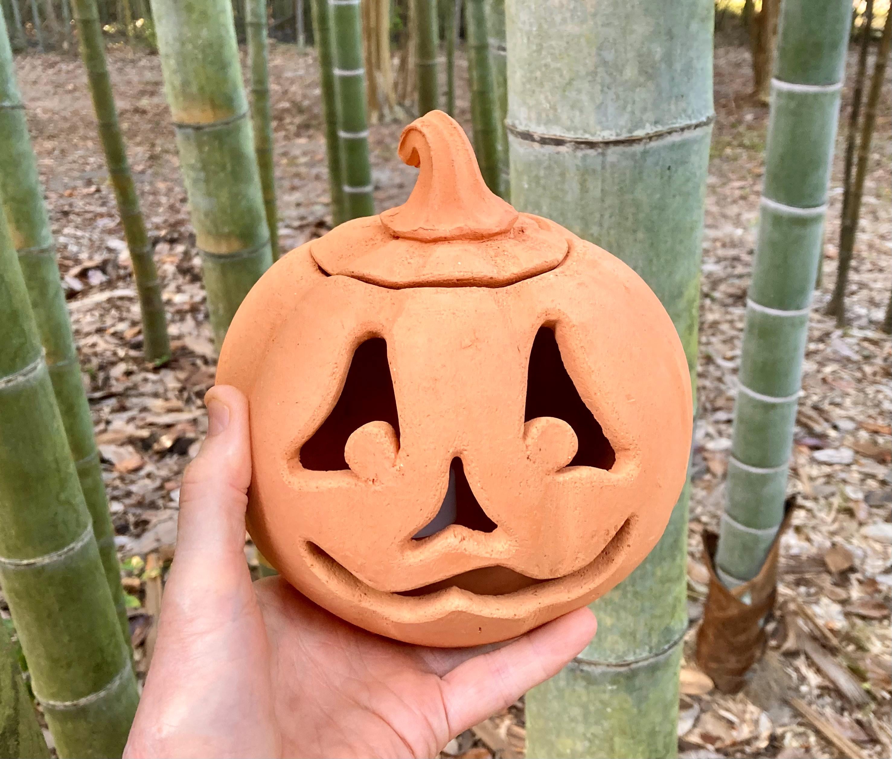 This terracotta jack o' lantern was wheel-thrown and hand-carved. It was made of locally dug Georgia red clay that when fired to the right temperature comes out a nice pumpkin color.