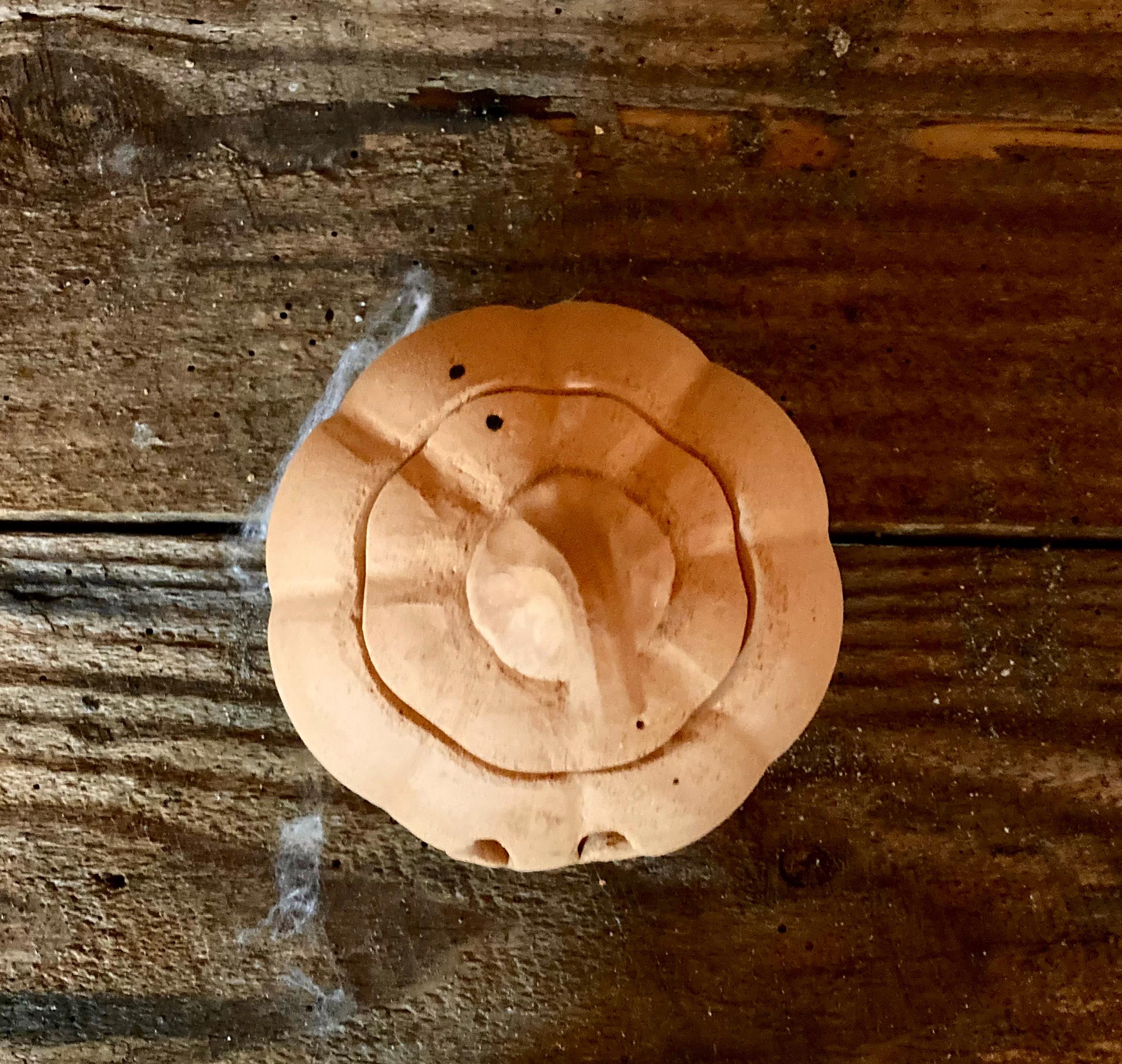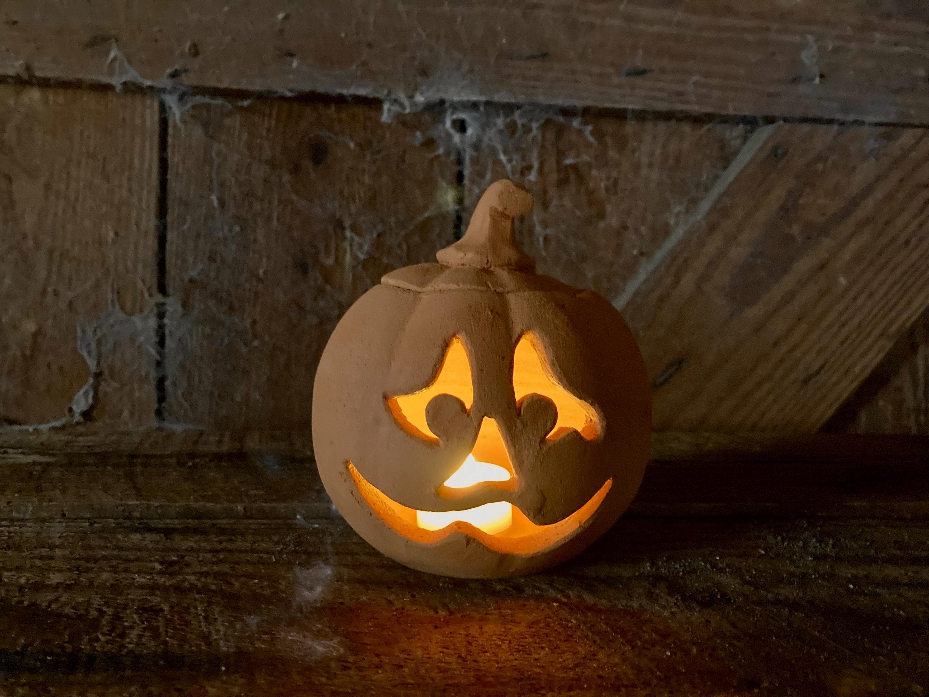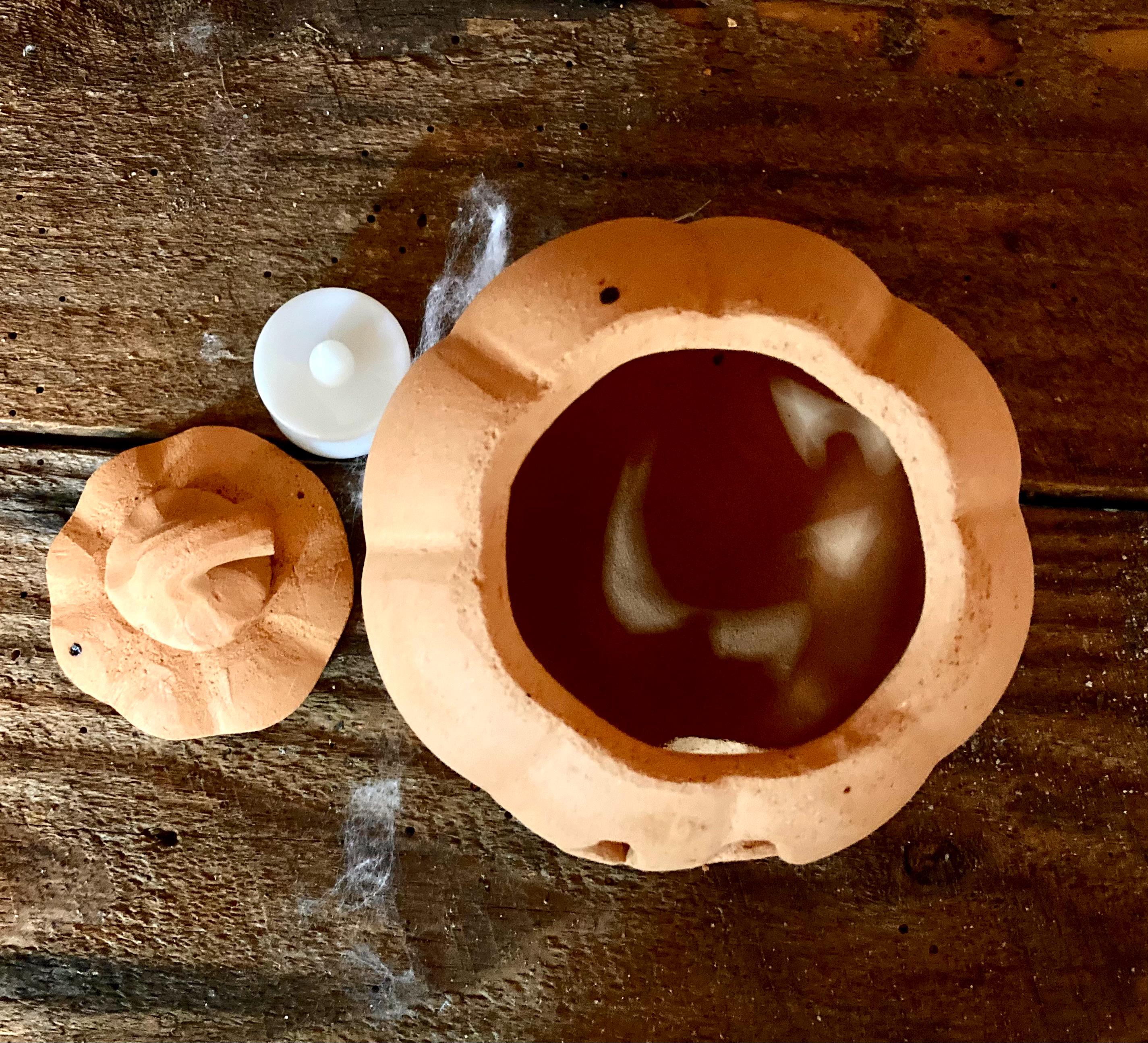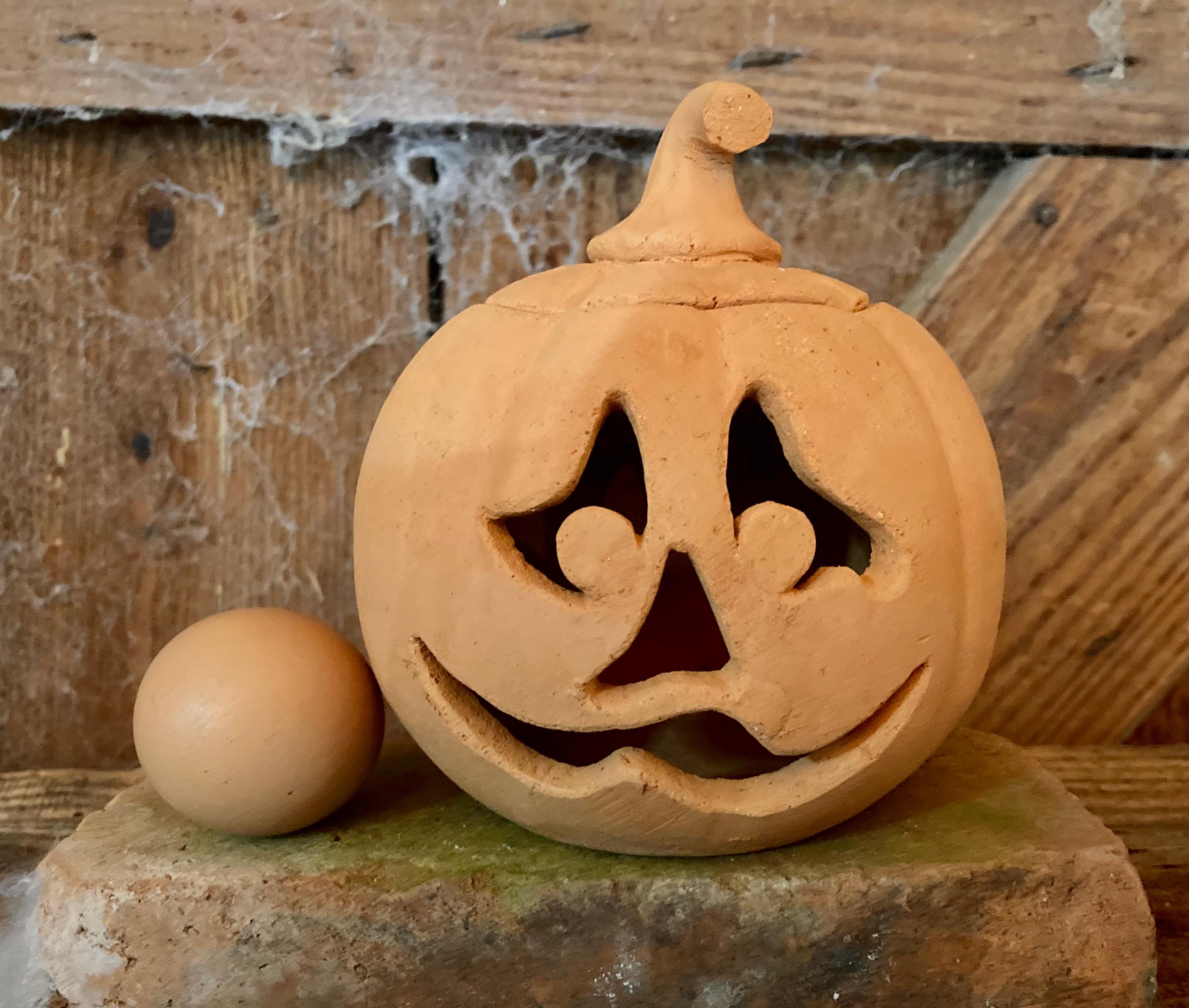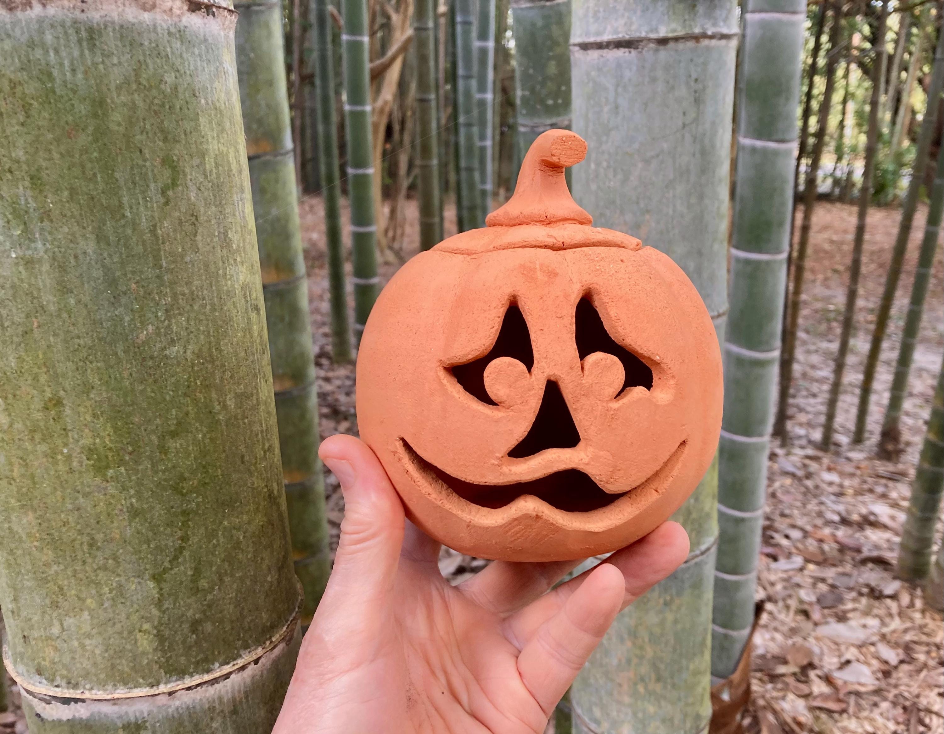 This small, terracotta jack o' lantern was wheel-thrown and hand-carved. It was made of locally dug Georgia red clay that when fired to the right temperature comes out a nice pumpkin color.