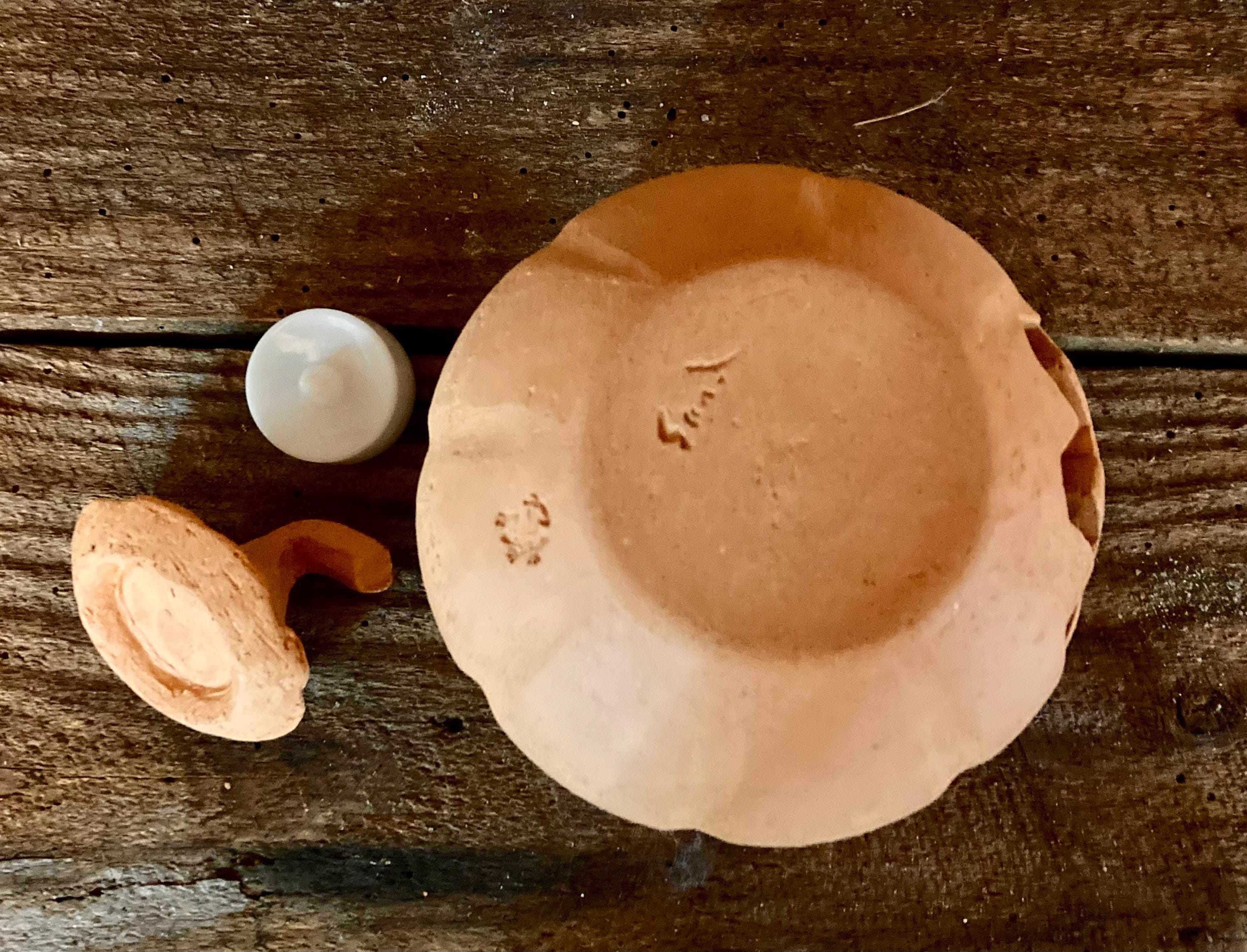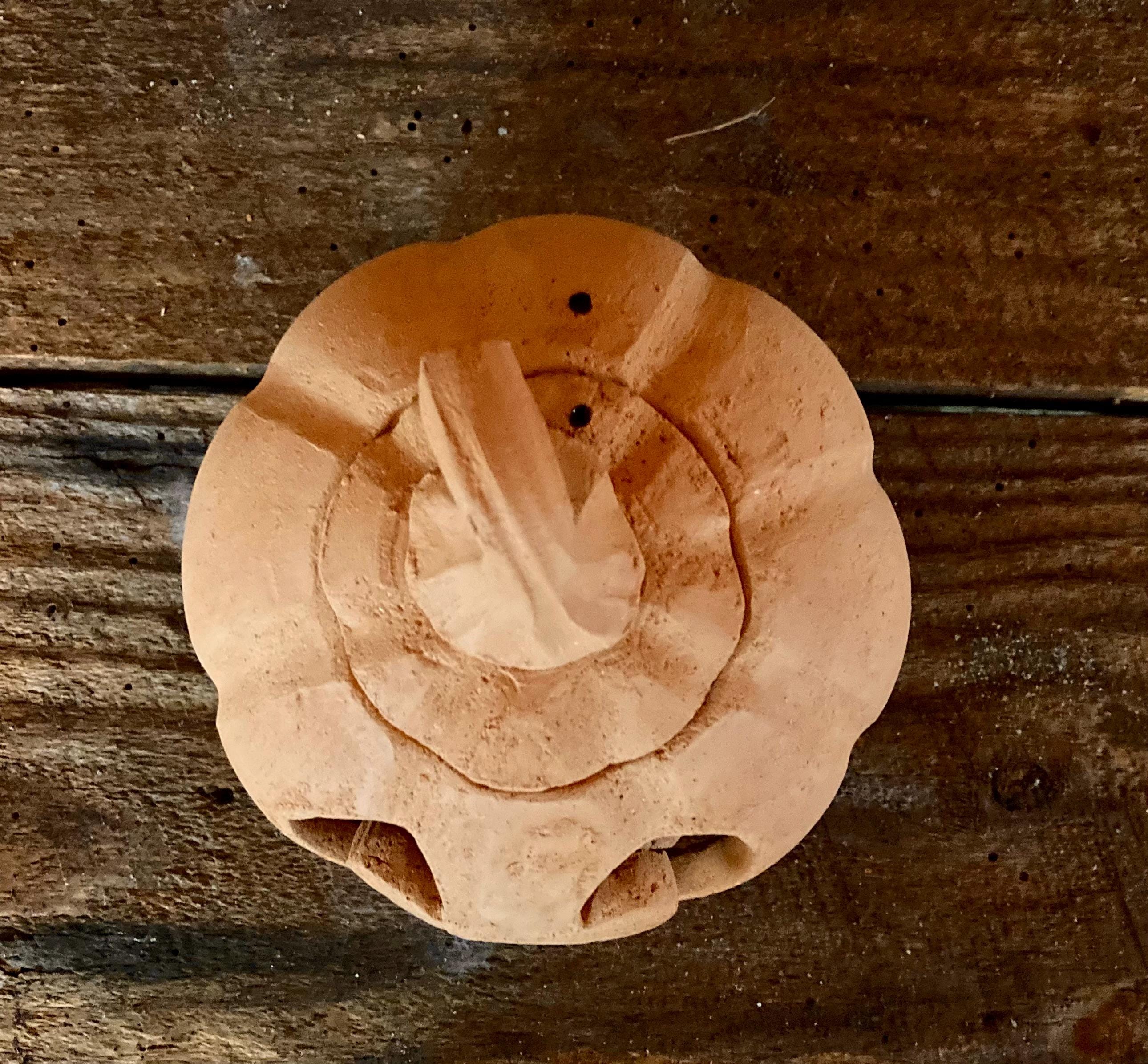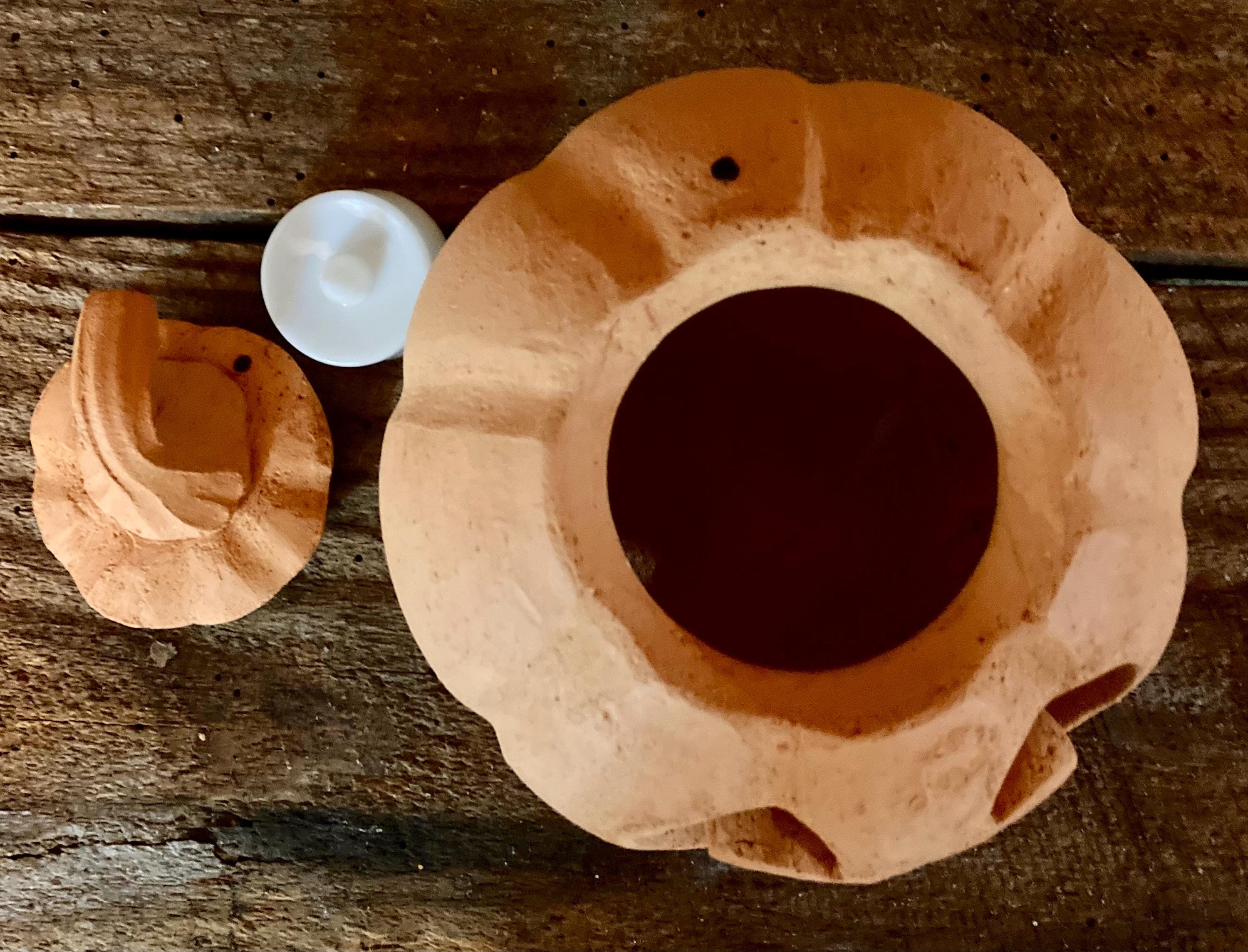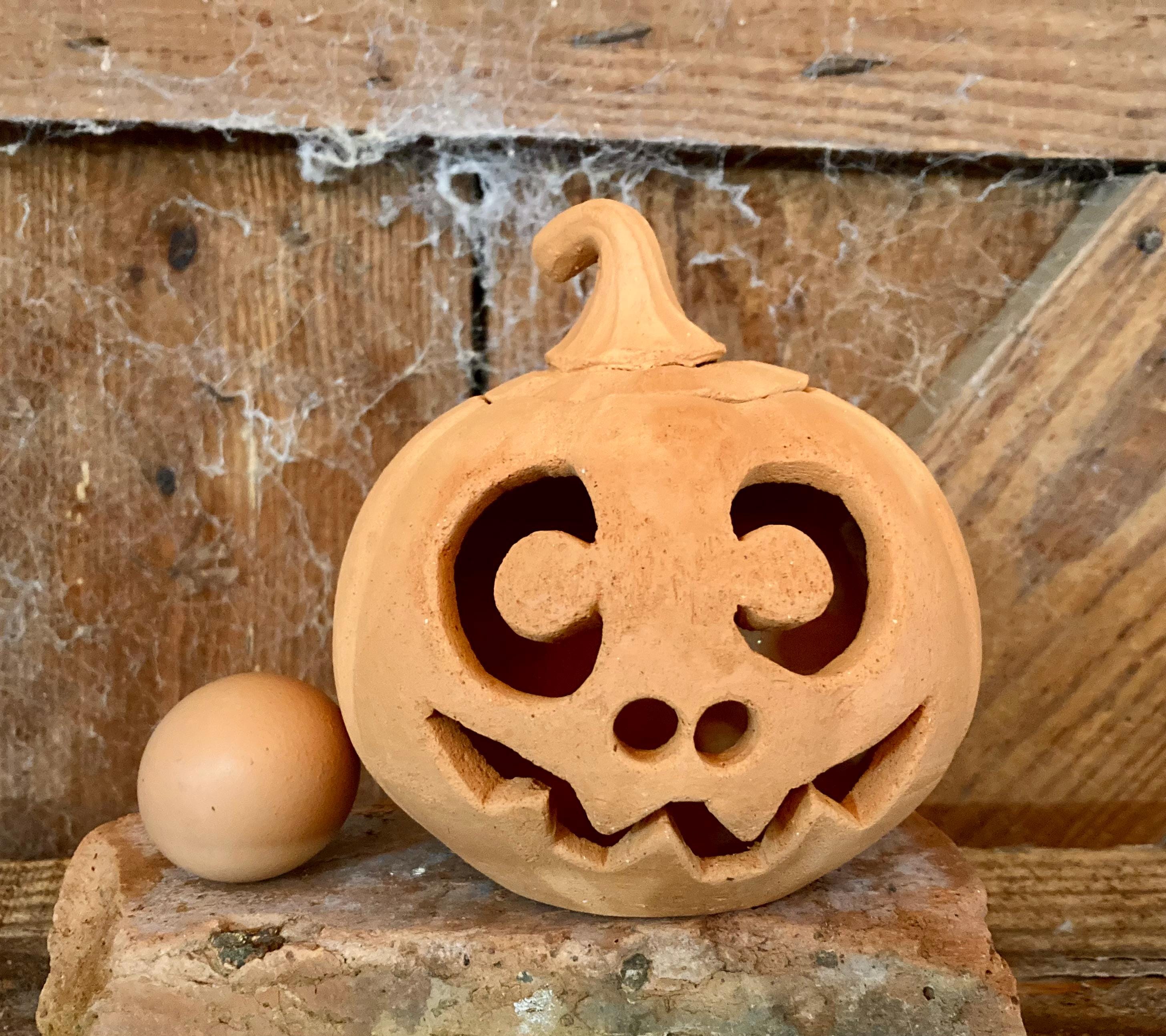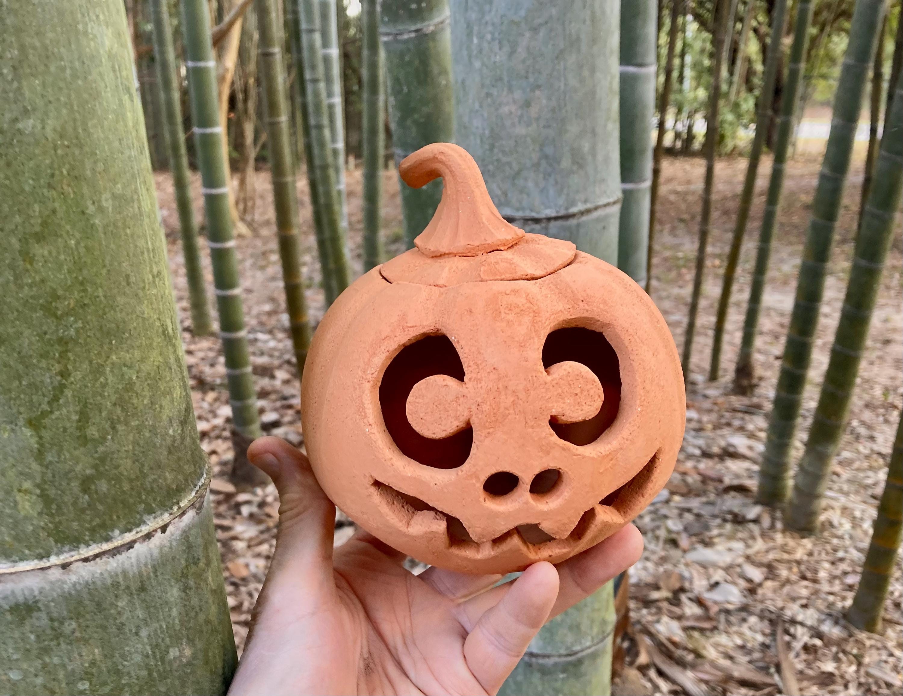 This small, terracotta jack o' lantern was wheel-thrown and hand-carved. It was made of locally dug Georgia red clay that when fired to the right temperature comes out a nice pumpkin color.