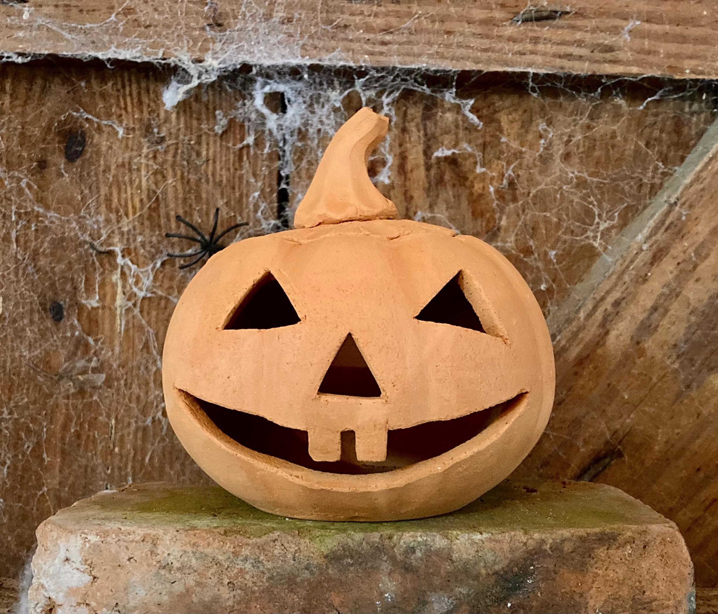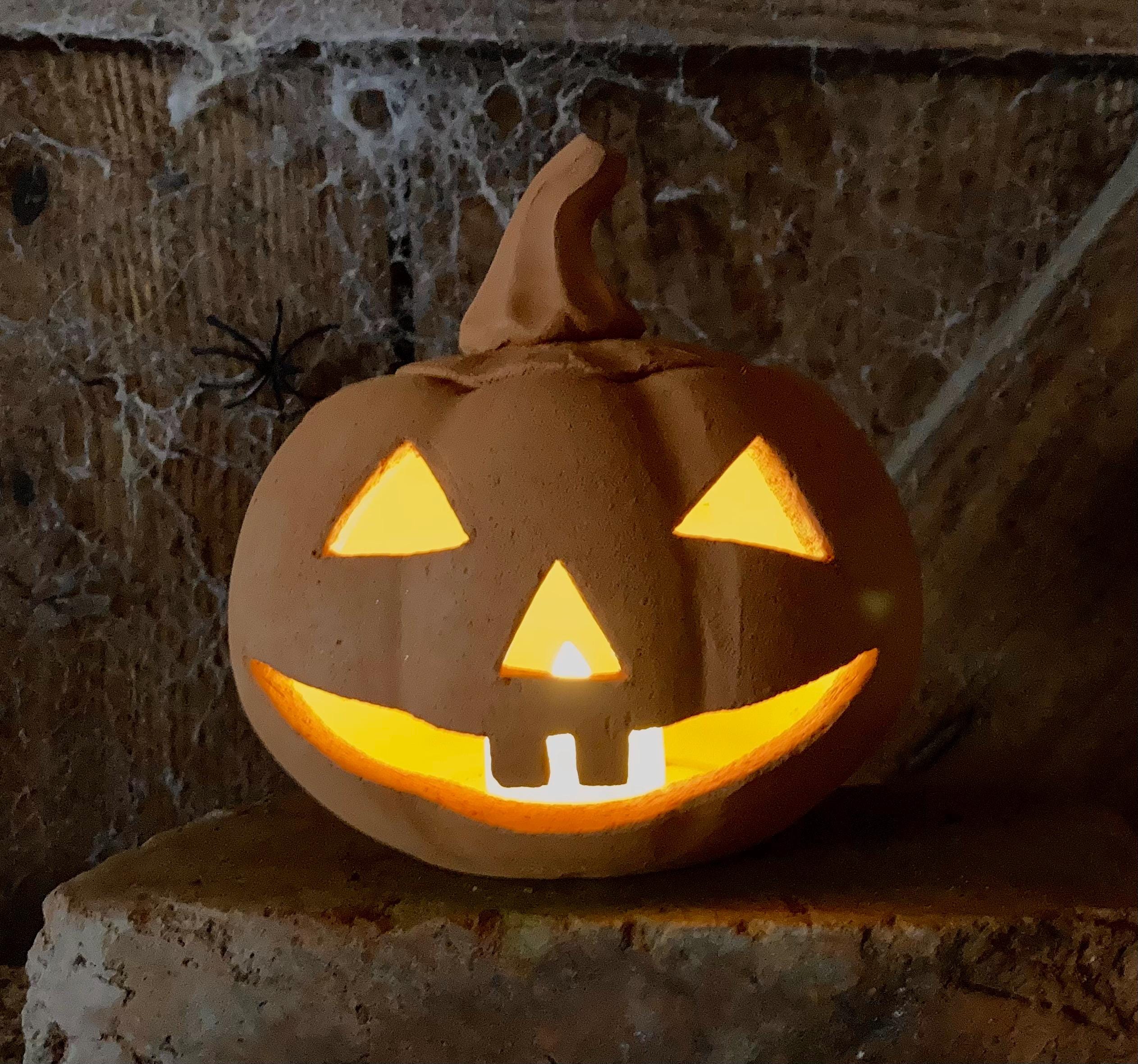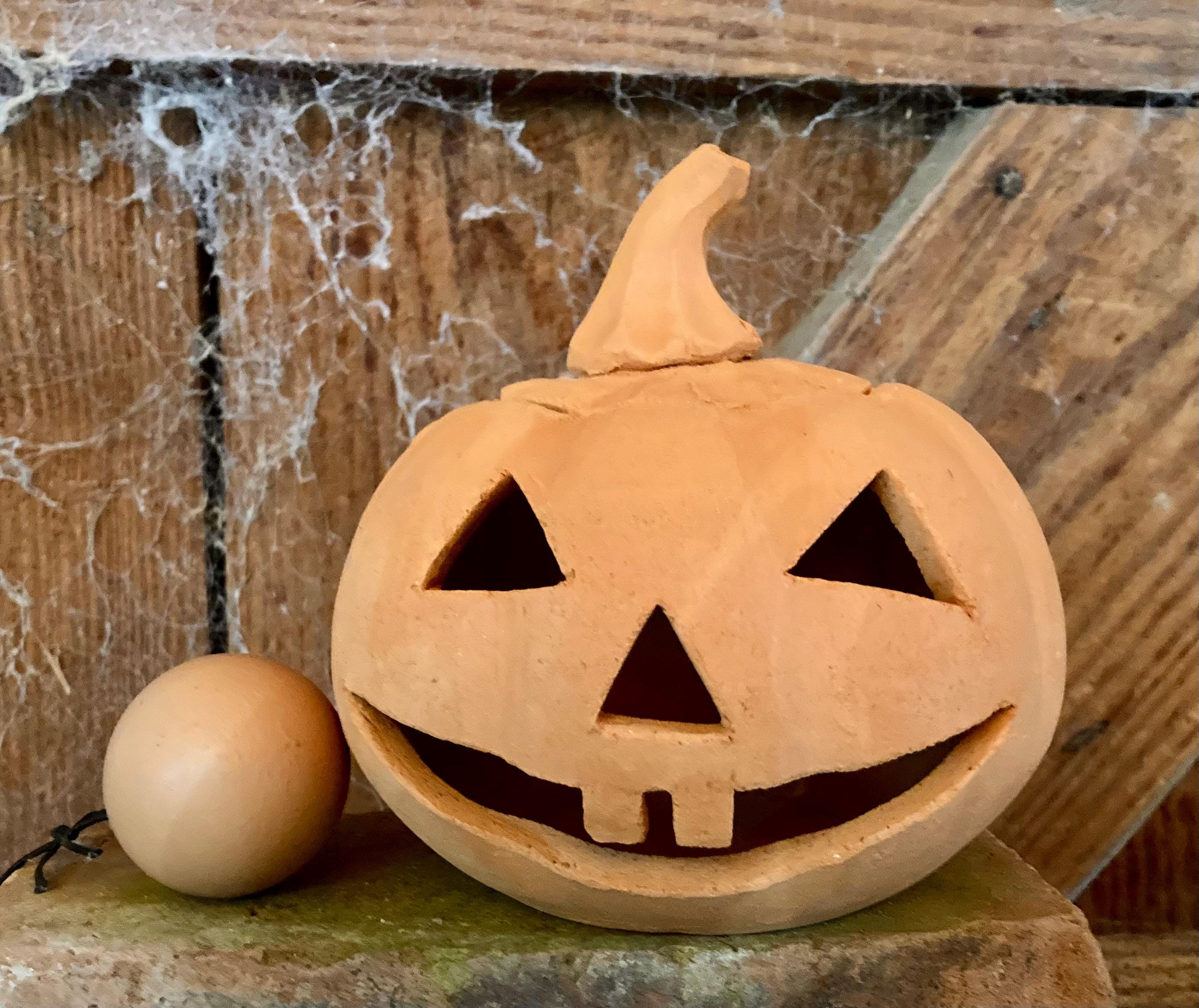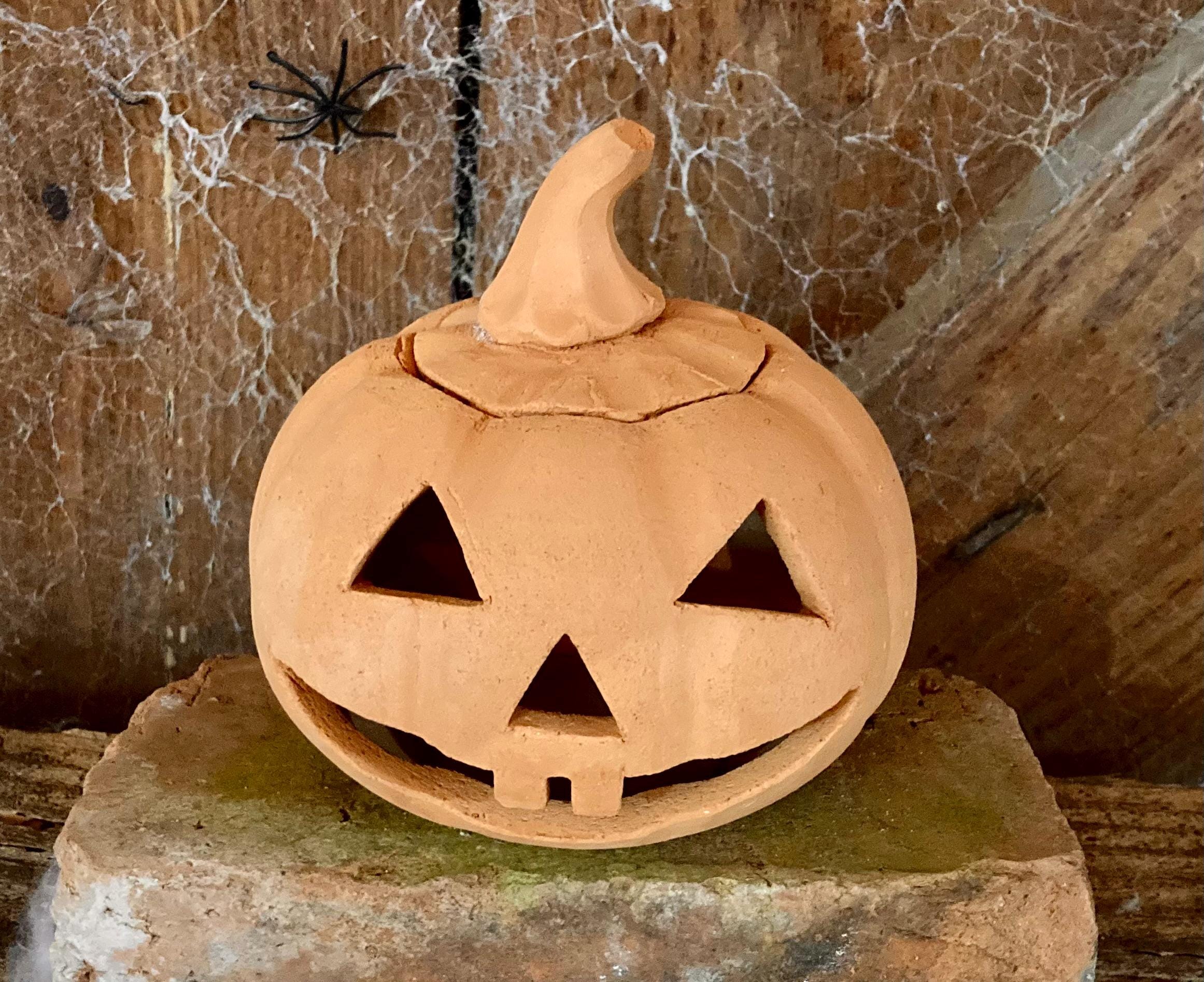 This small, terracotta jack o' lantern was wheel-thrown and hand-carved. It was made of locally dug Georgia red clay that when fired to the right temperature comes out a nice pumpkin color.