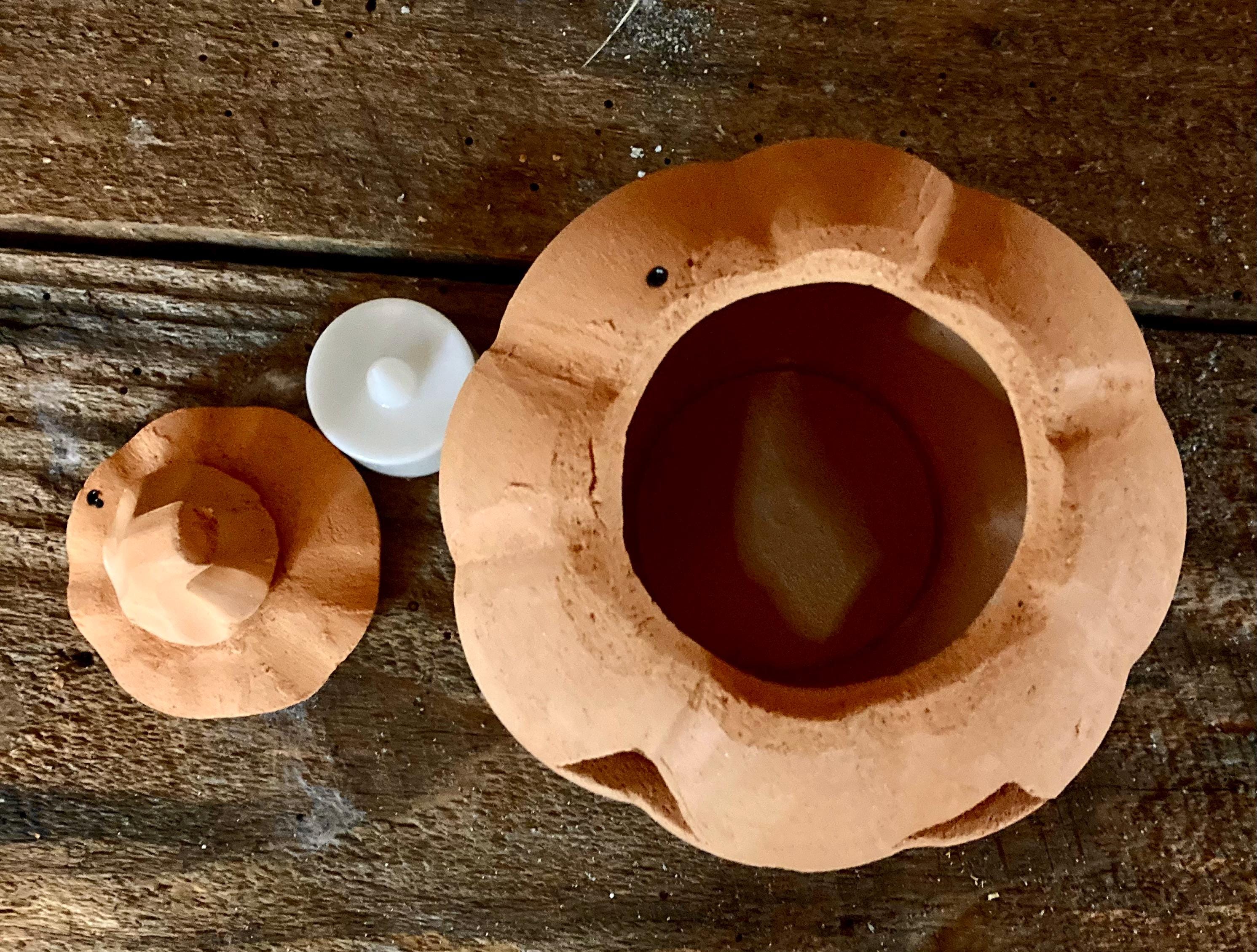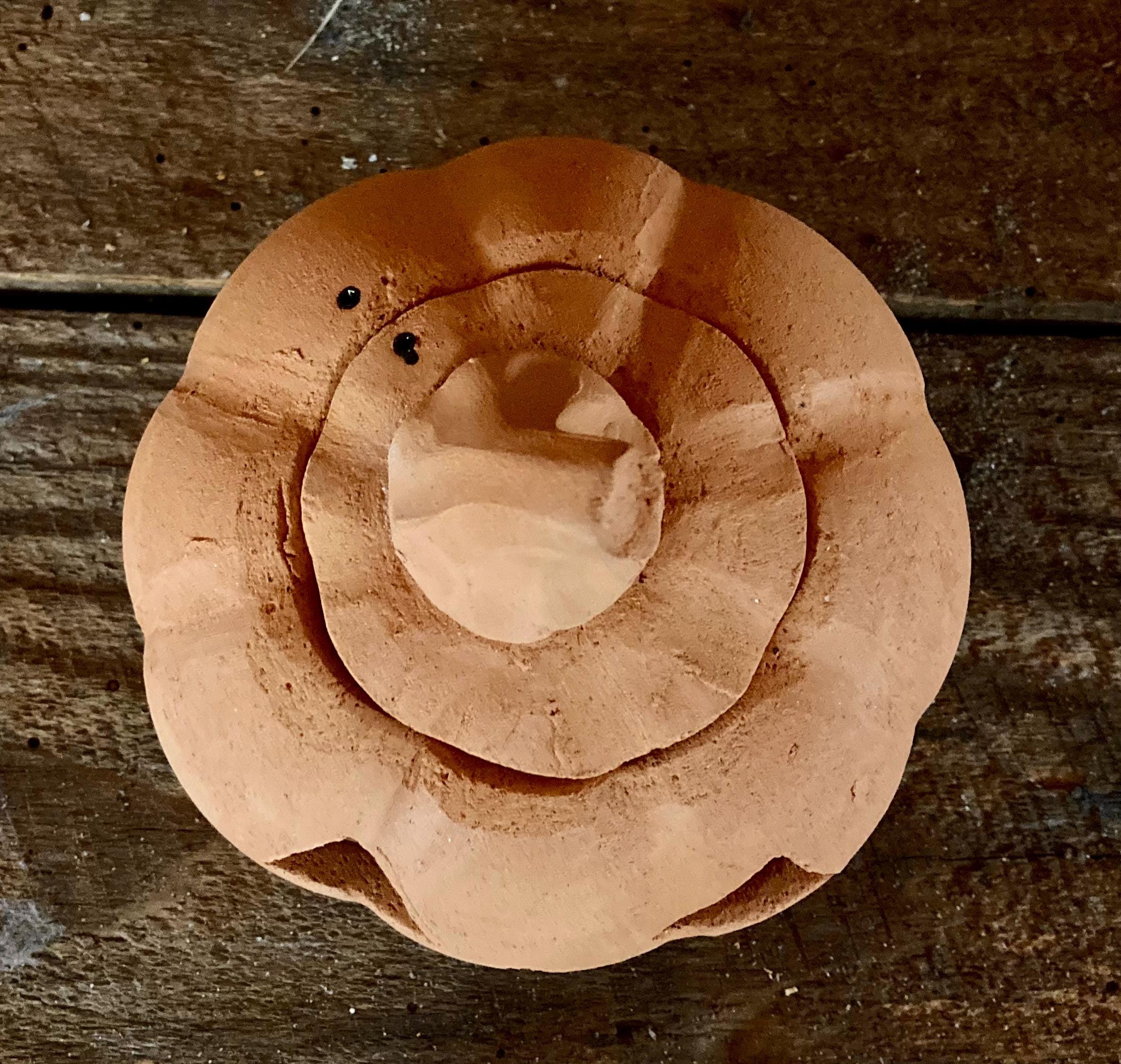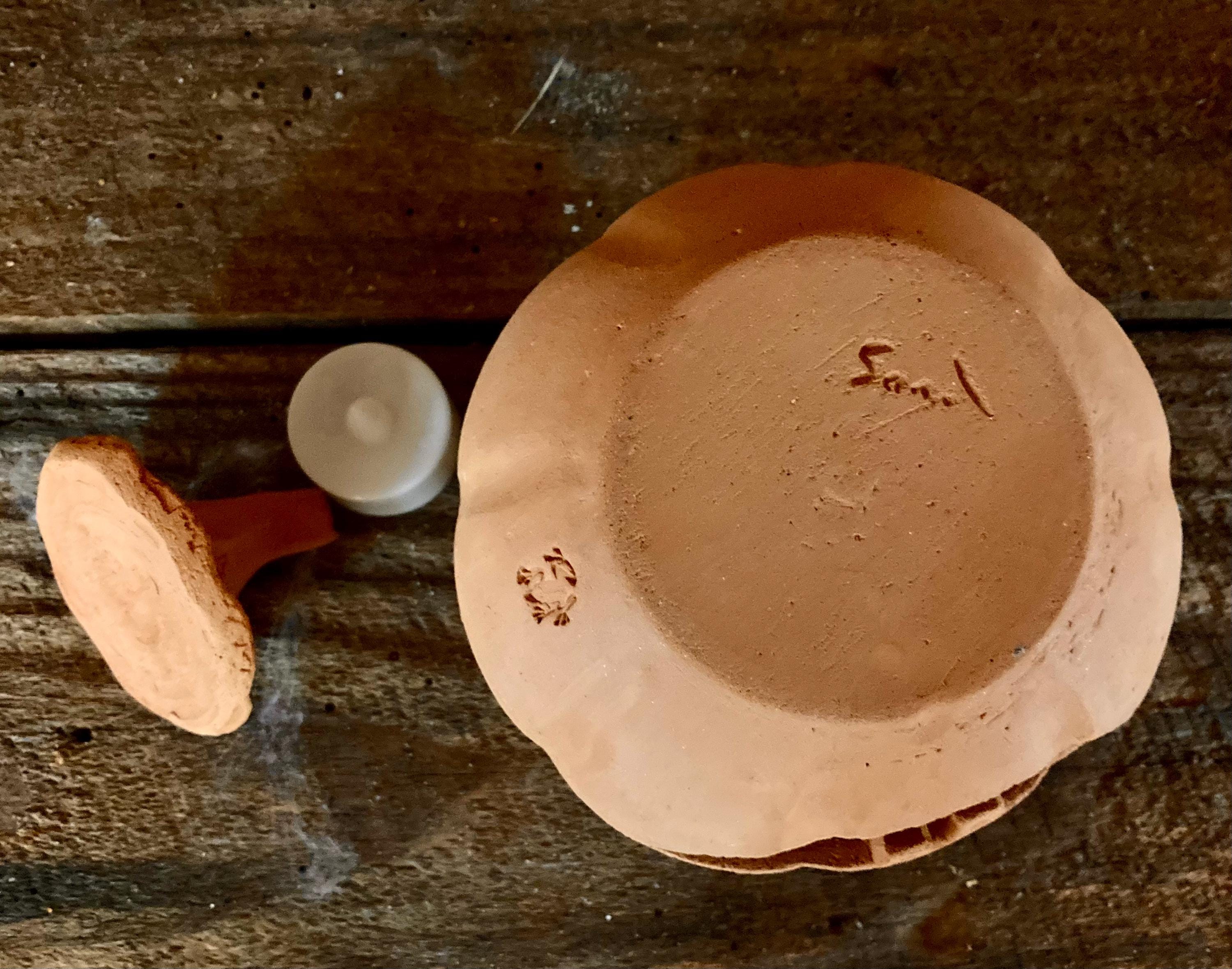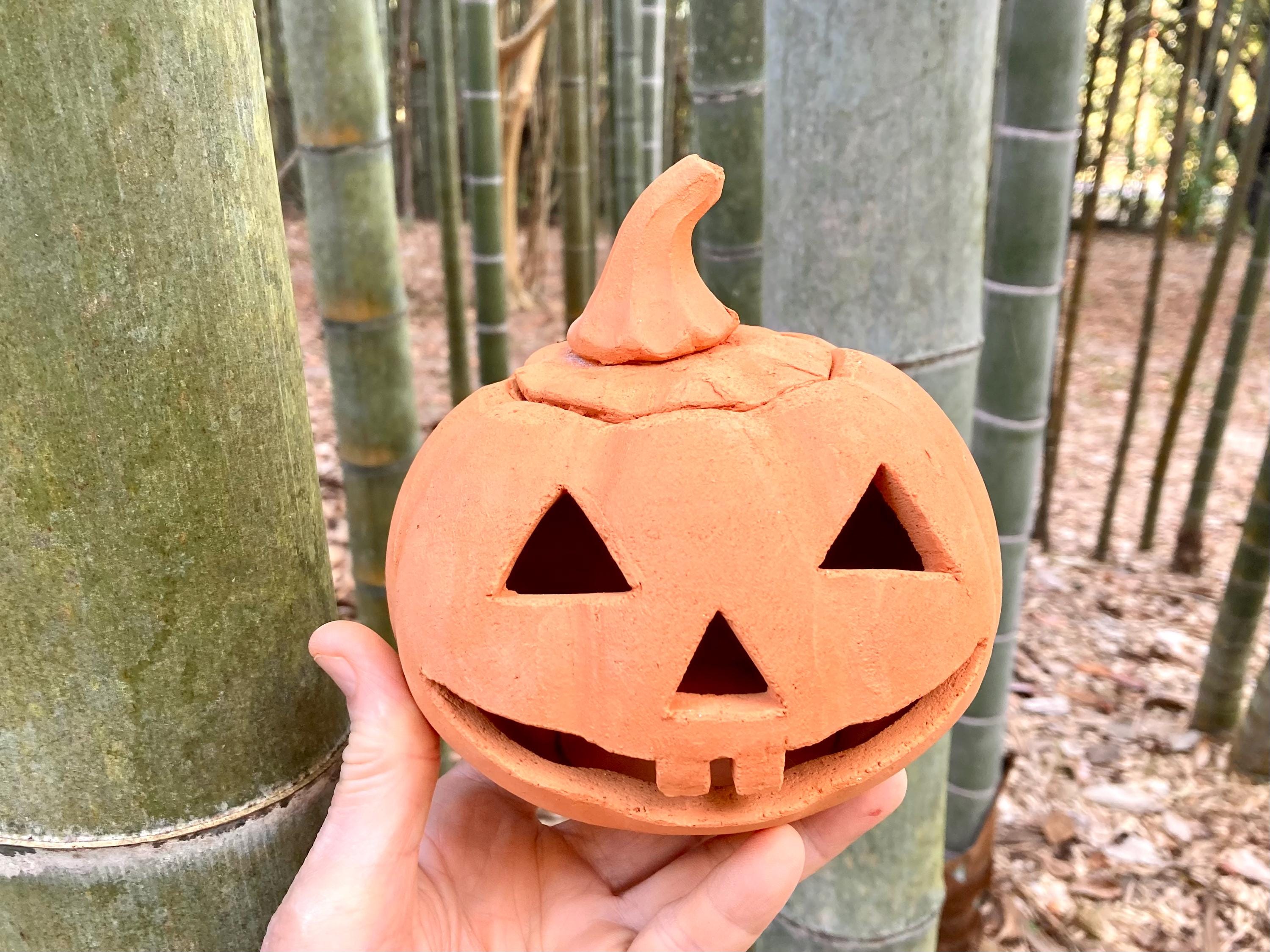 This small, terracotta jack o' lantern was wheel-thrown and hand-carved. It was made of locally dug Georgia red clay that when fired to the right temperature comes out a nice pumpkin color.