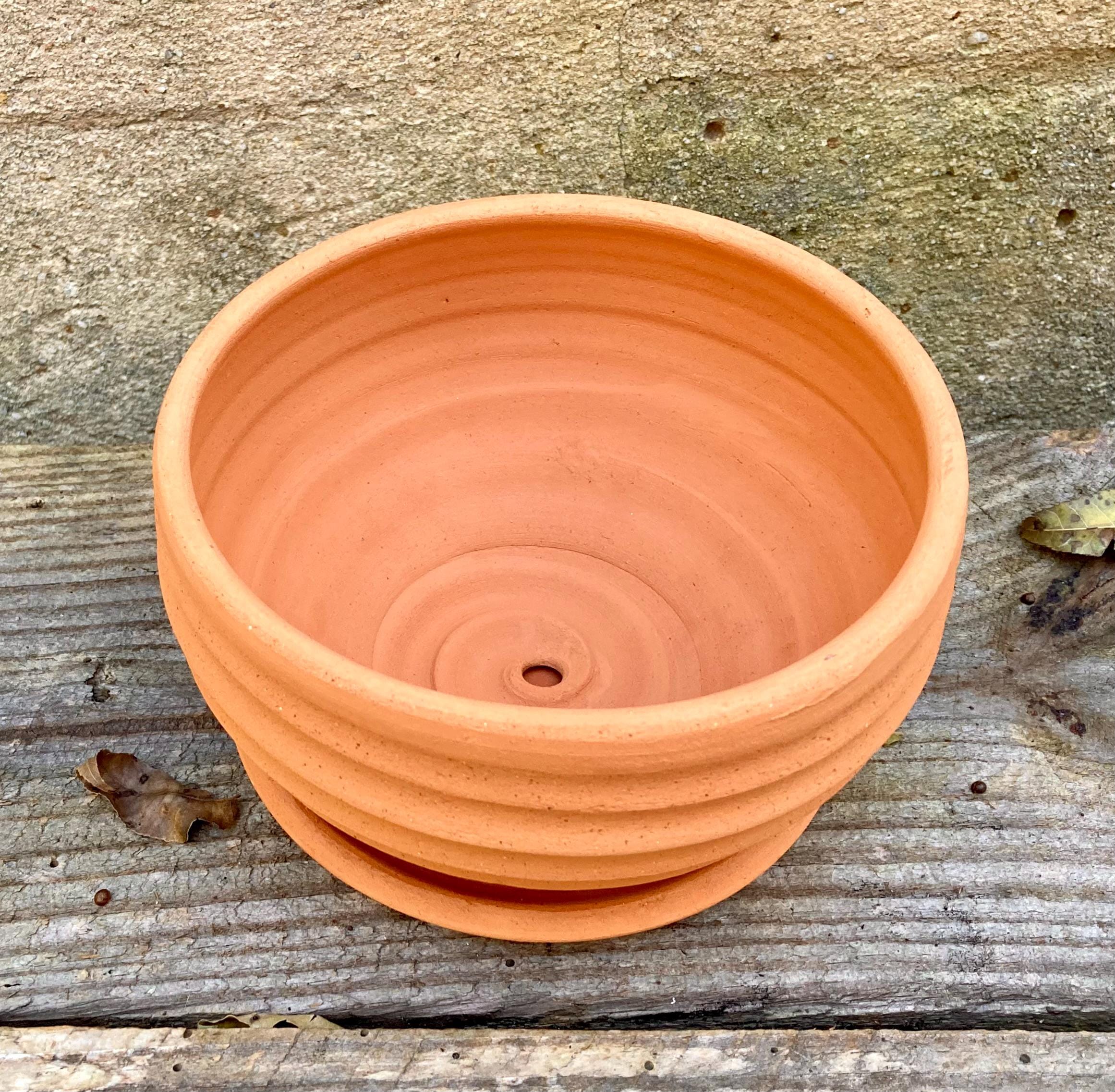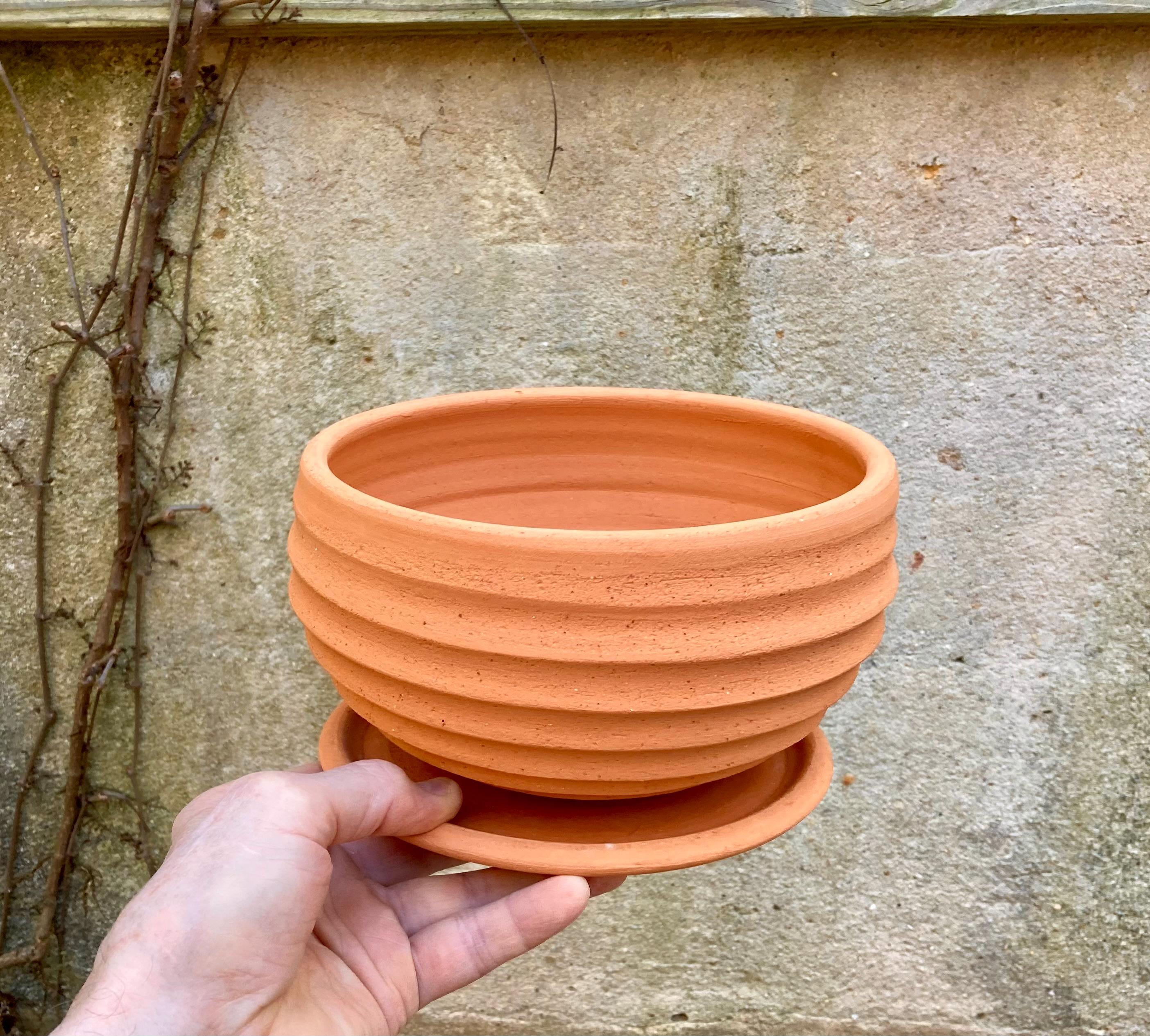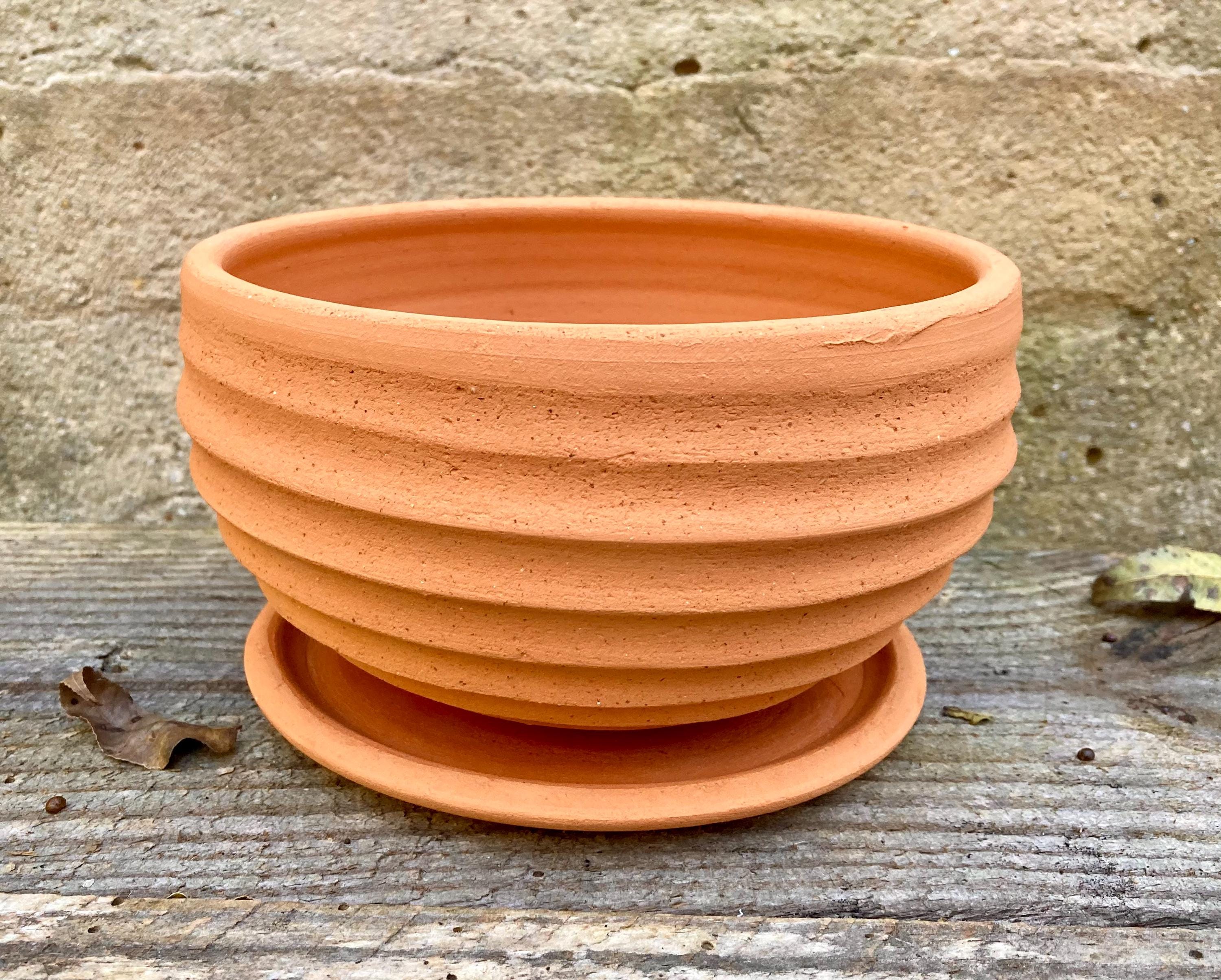 This terracotta planter was made of wheel-thrown, locally dug clay that when fired to the right temperature comes out a nice terracotta color and is porous. This allows air and water to flow through the pot which prevents root rot and soil disease.