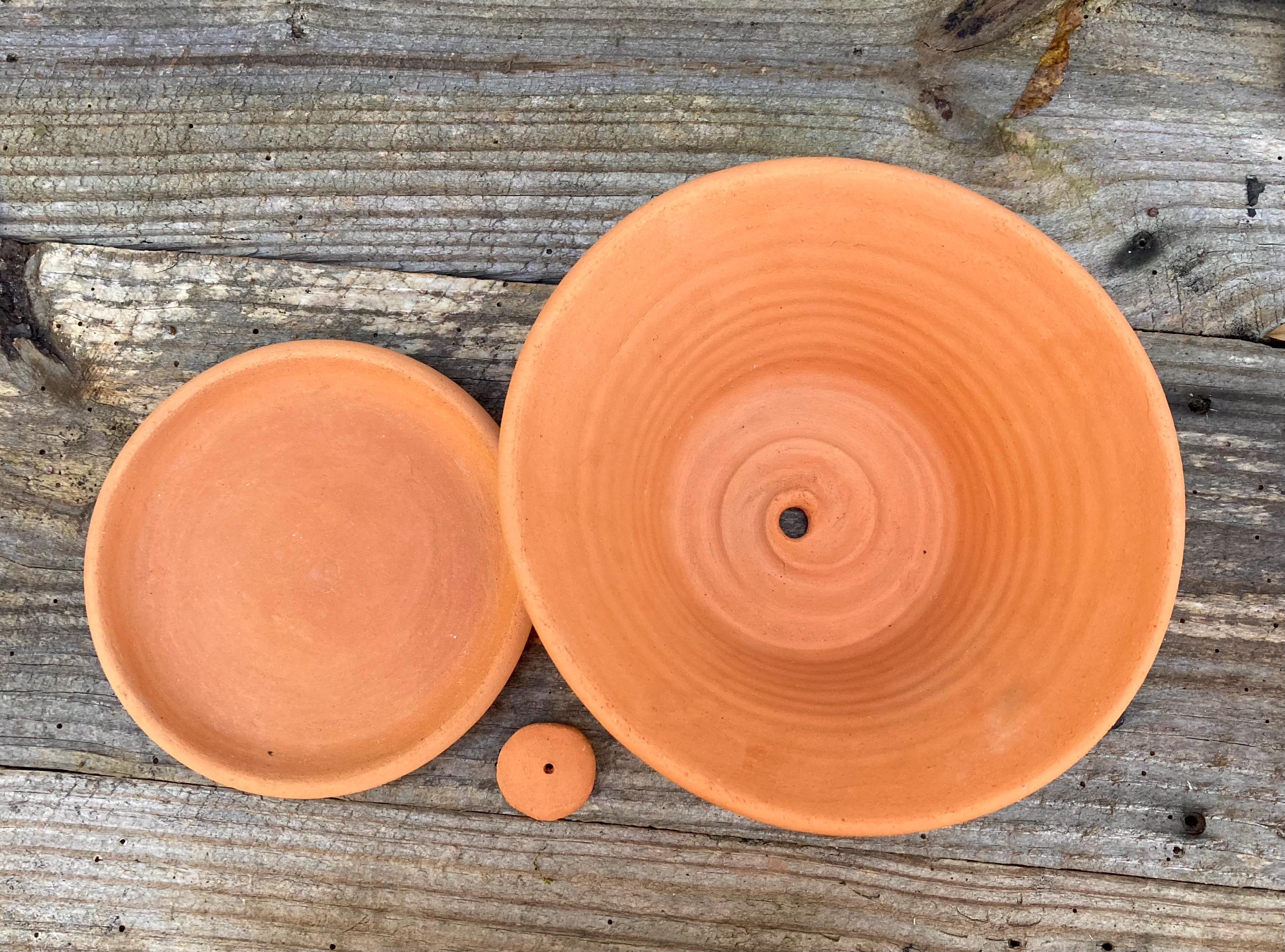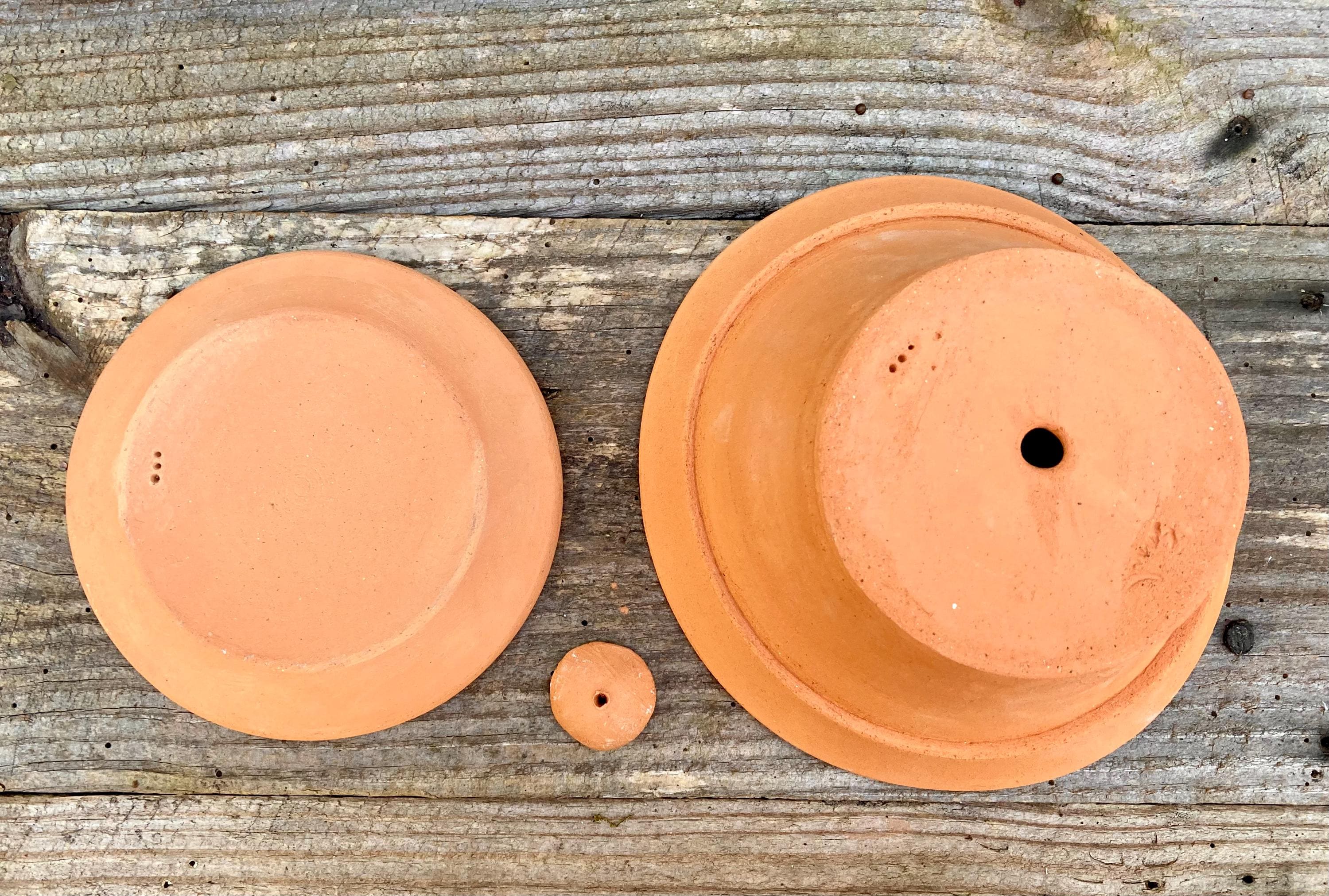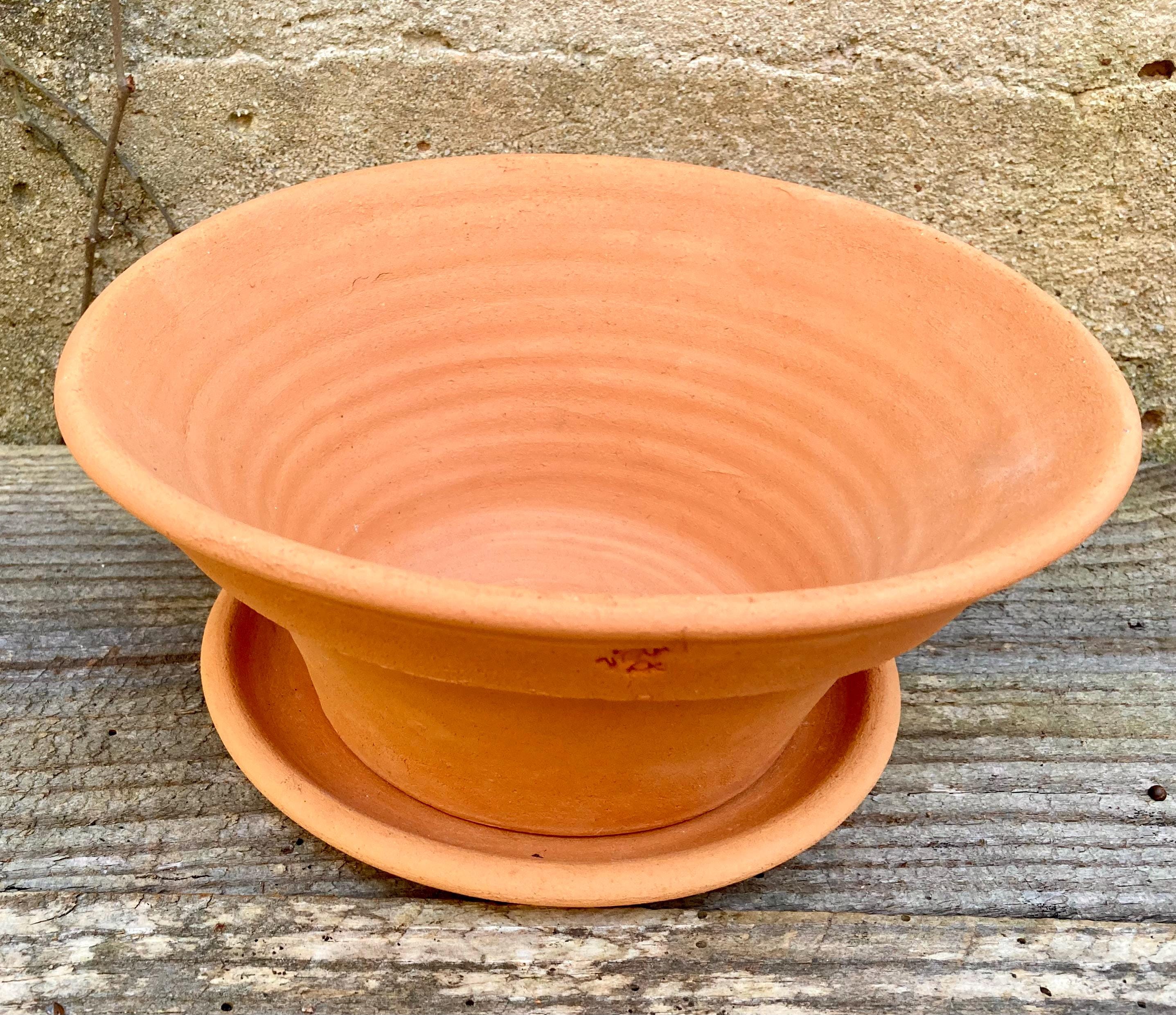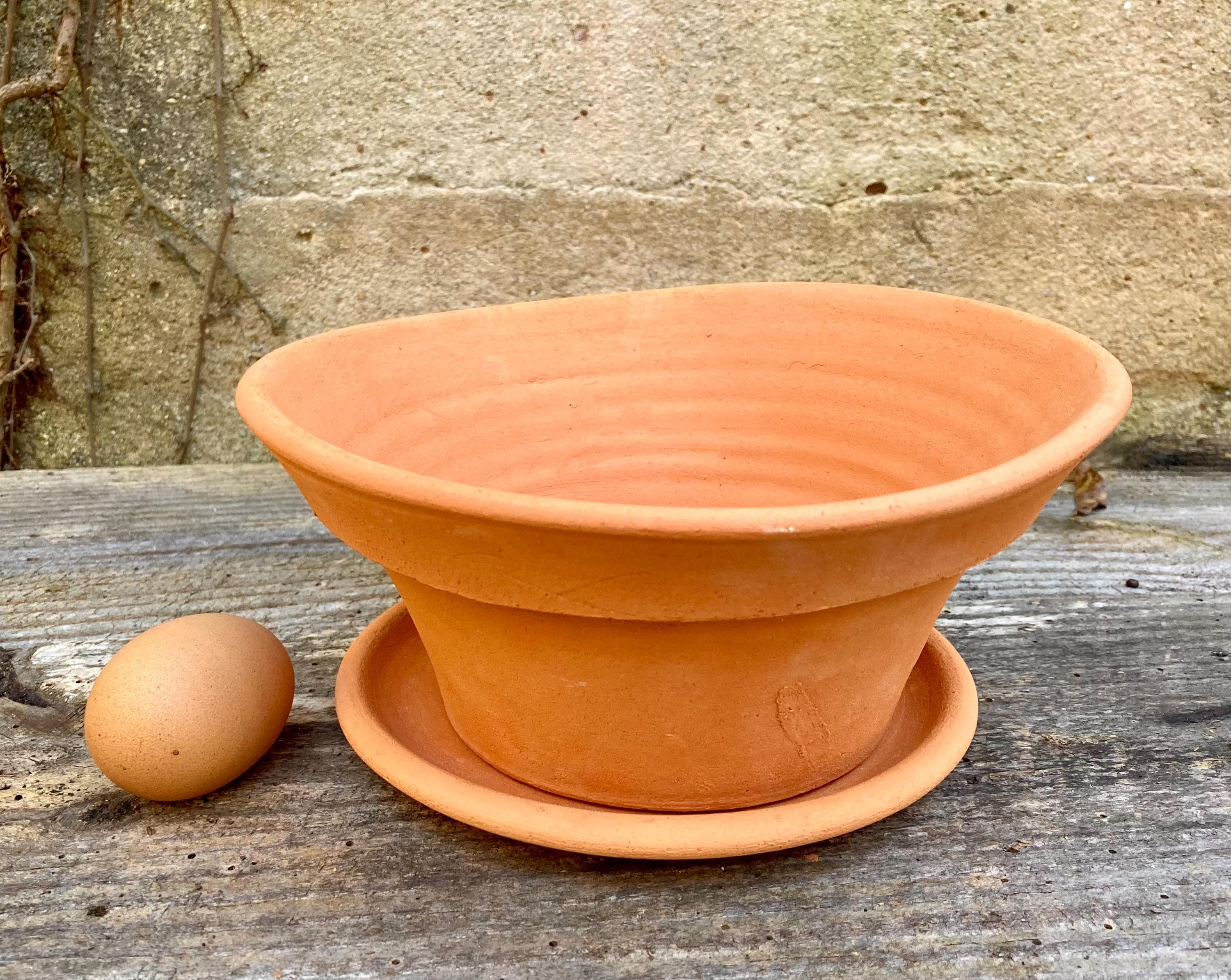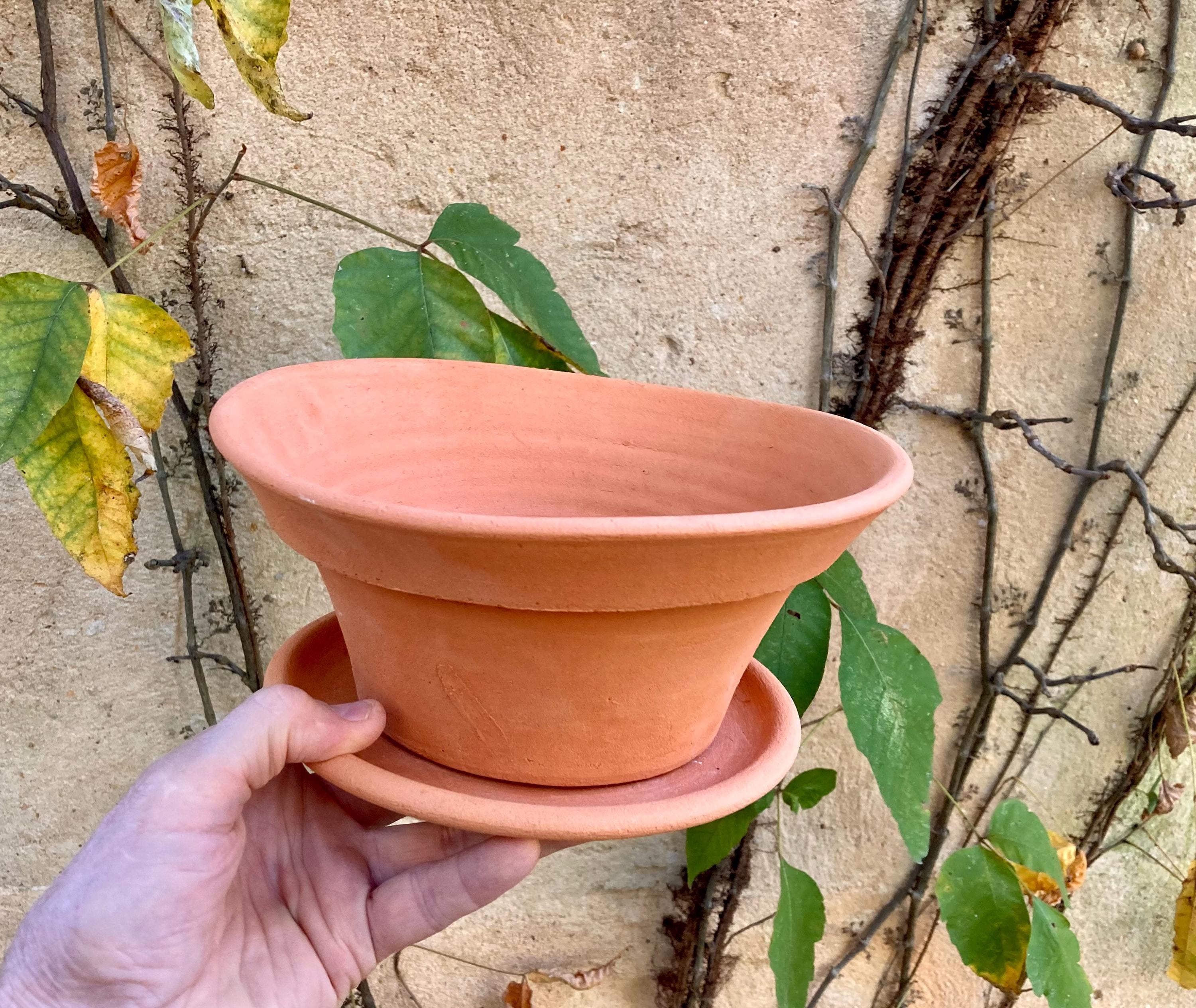 It is fired high enough to be much stronger and more durable than most terracotta pots. (Many of which aren't real terracotta.) It has a small hole for drainage and a saucer that has been treated with a sealant to prevent leakage. It also comes with a small shard to keep the soil from falling out or the hole becoming clogged.