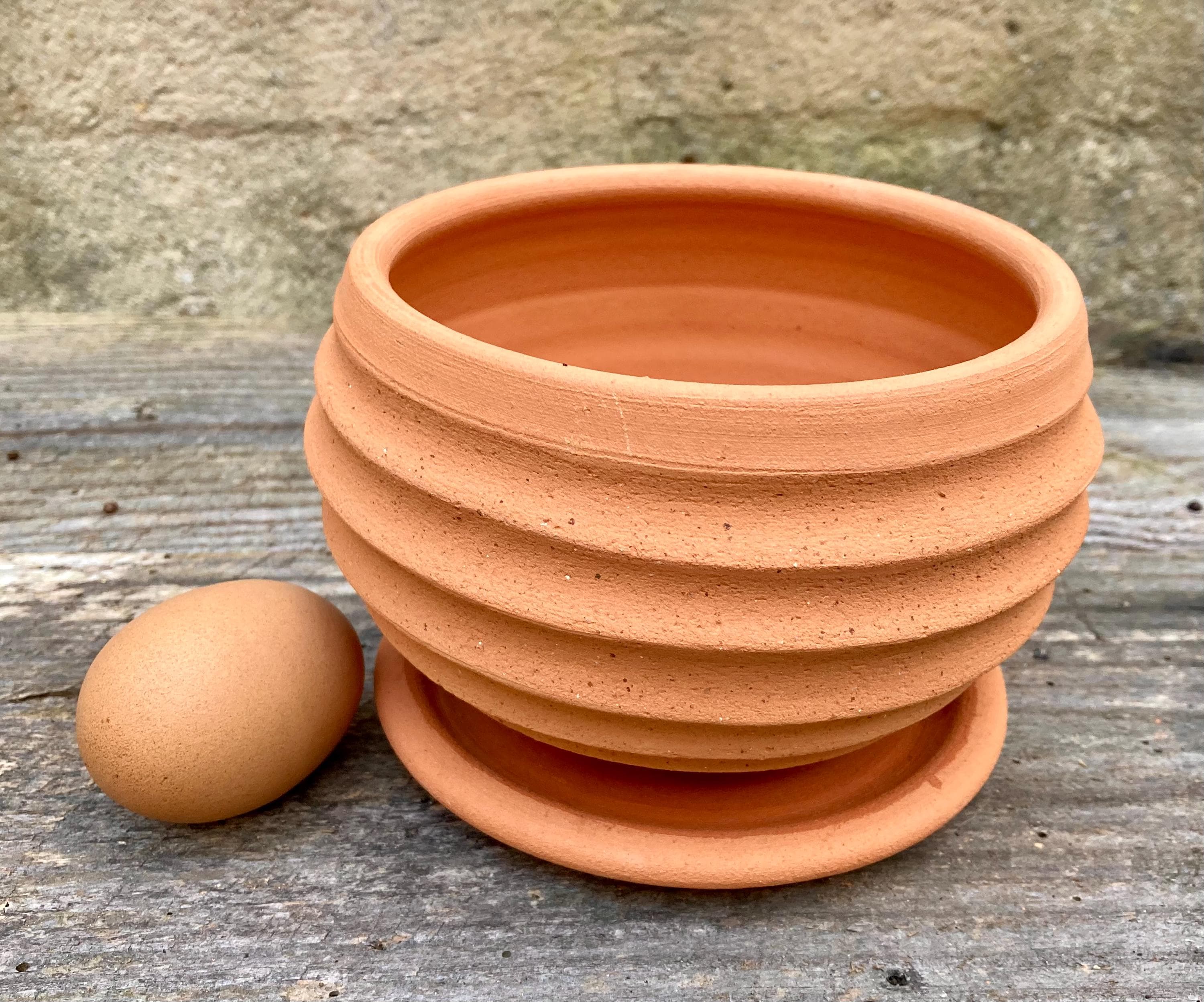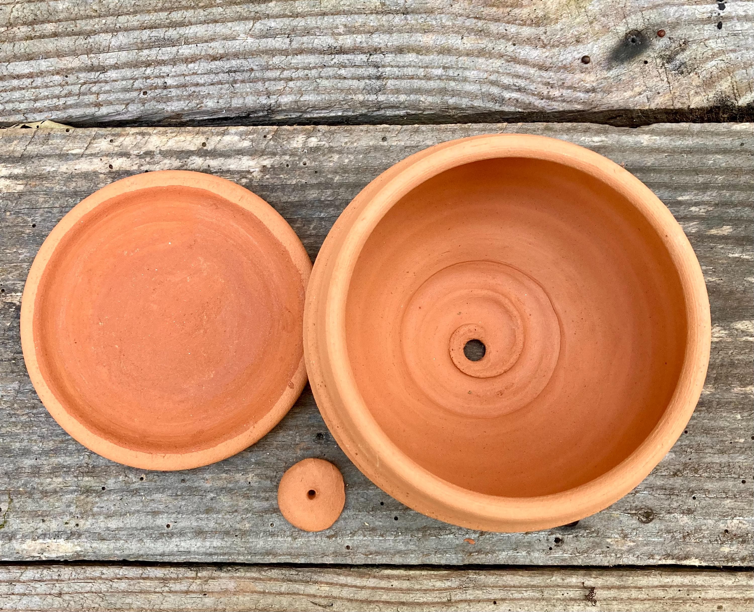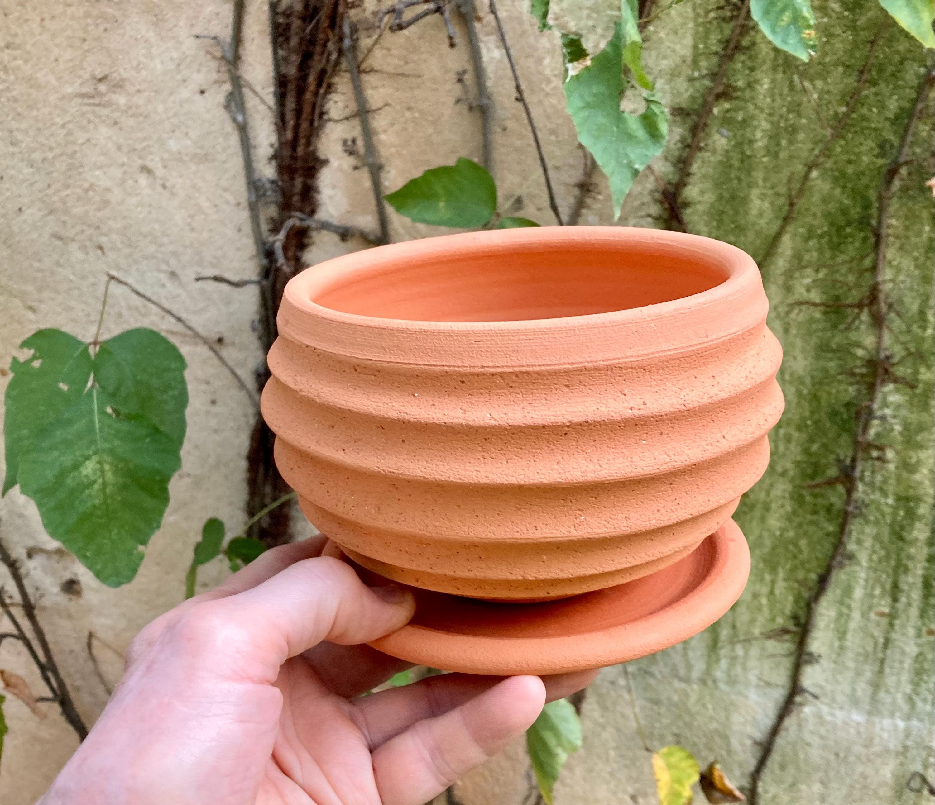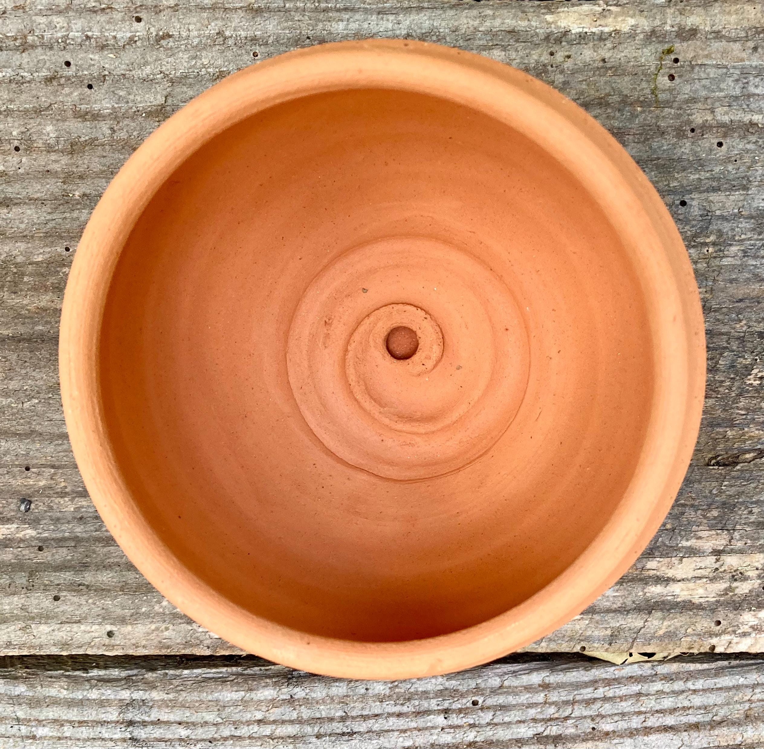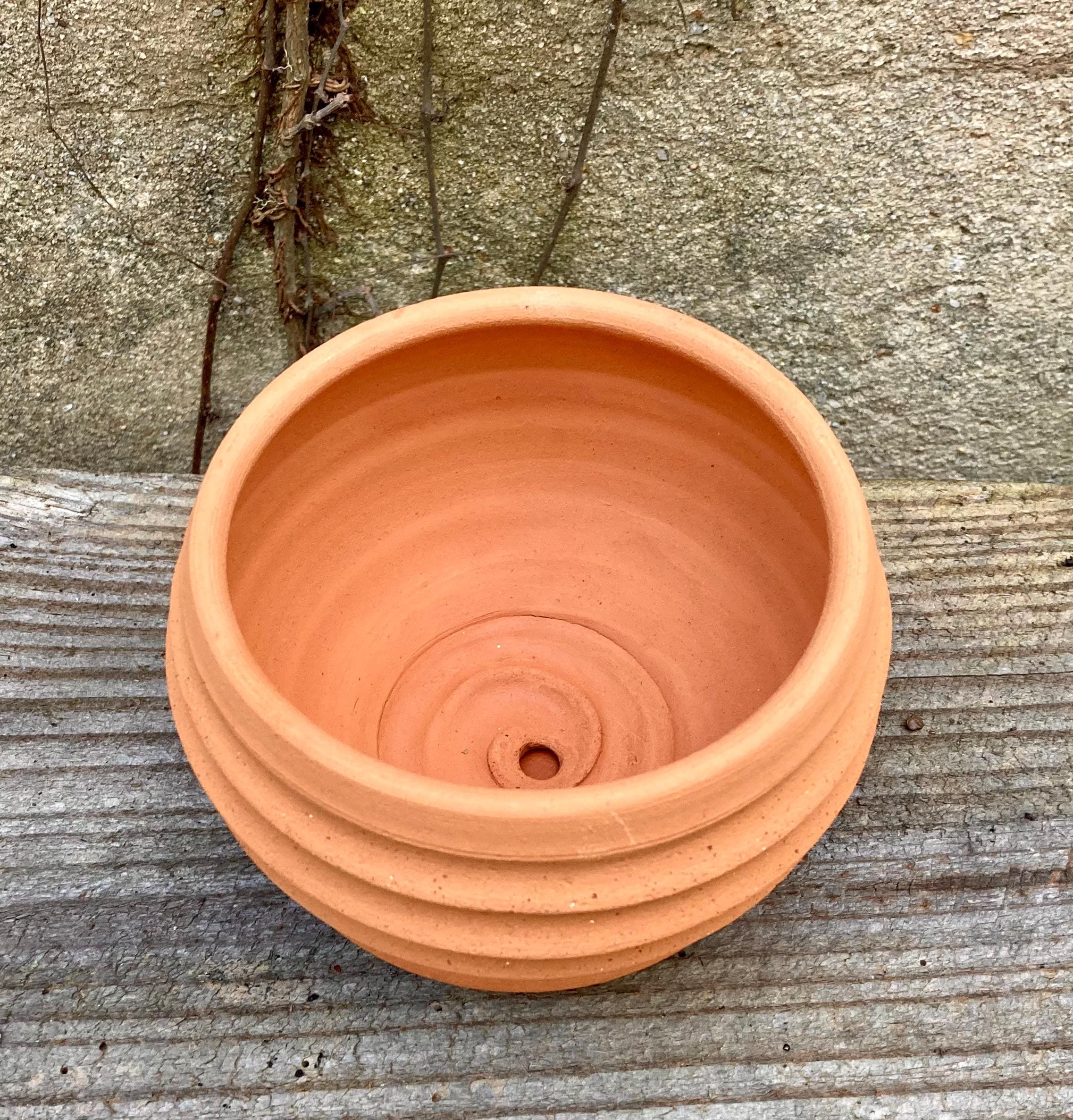 This terracotta planter was made of wheel-thrown, locally dug clay that when fired to the right temperature comes out a nice terracotta color and is porous. This allows air and water to flow through the pot which prevents root rot and soil disease.