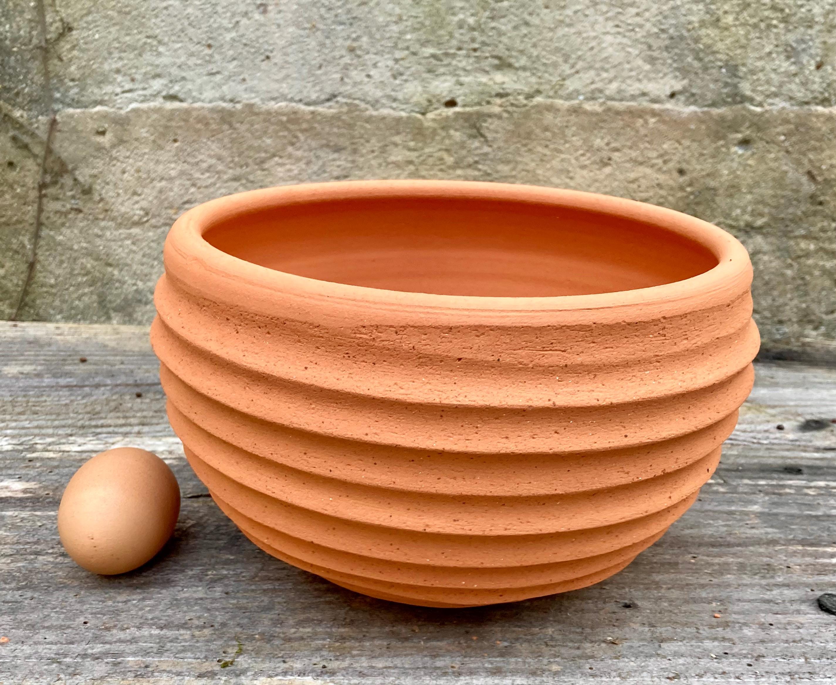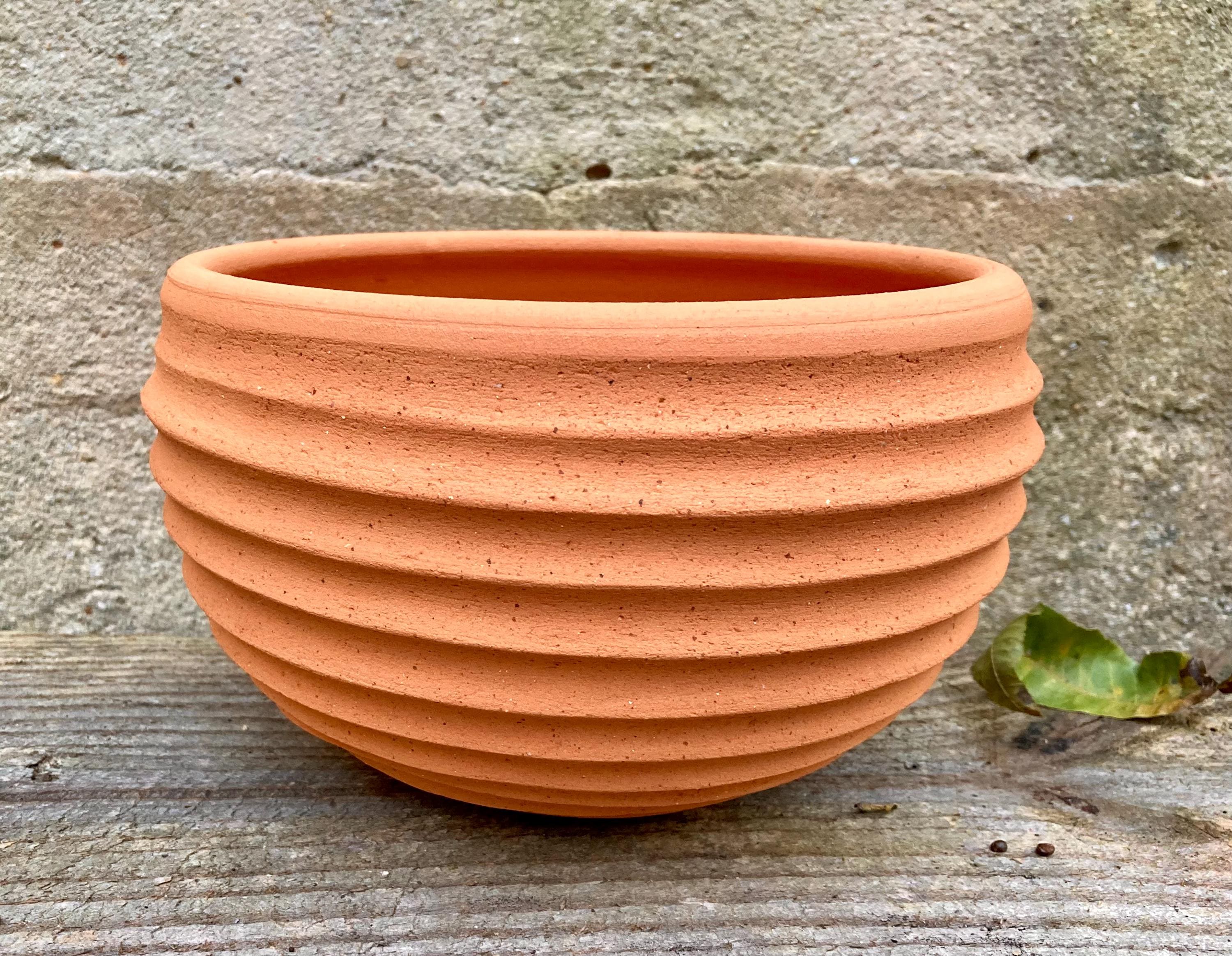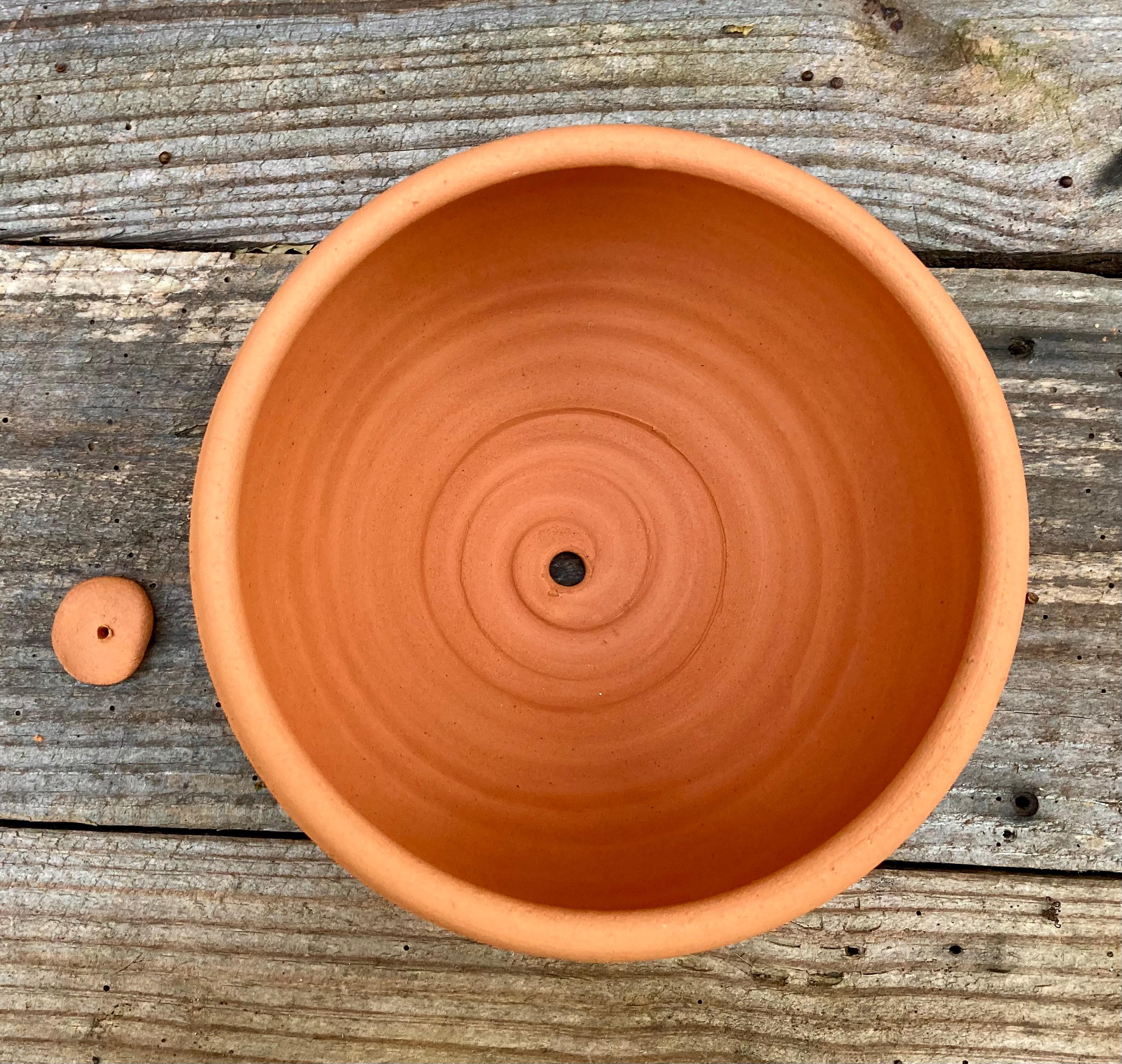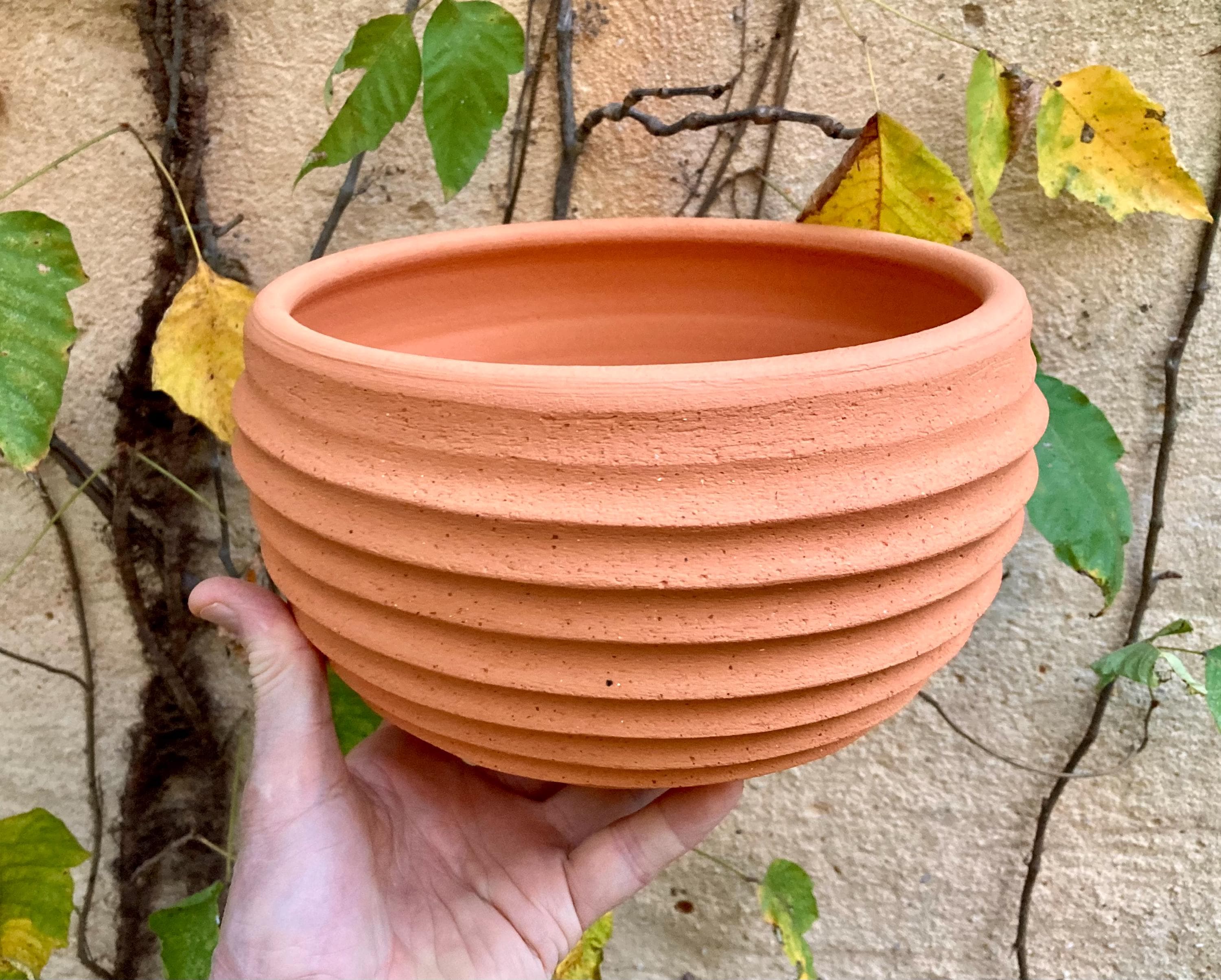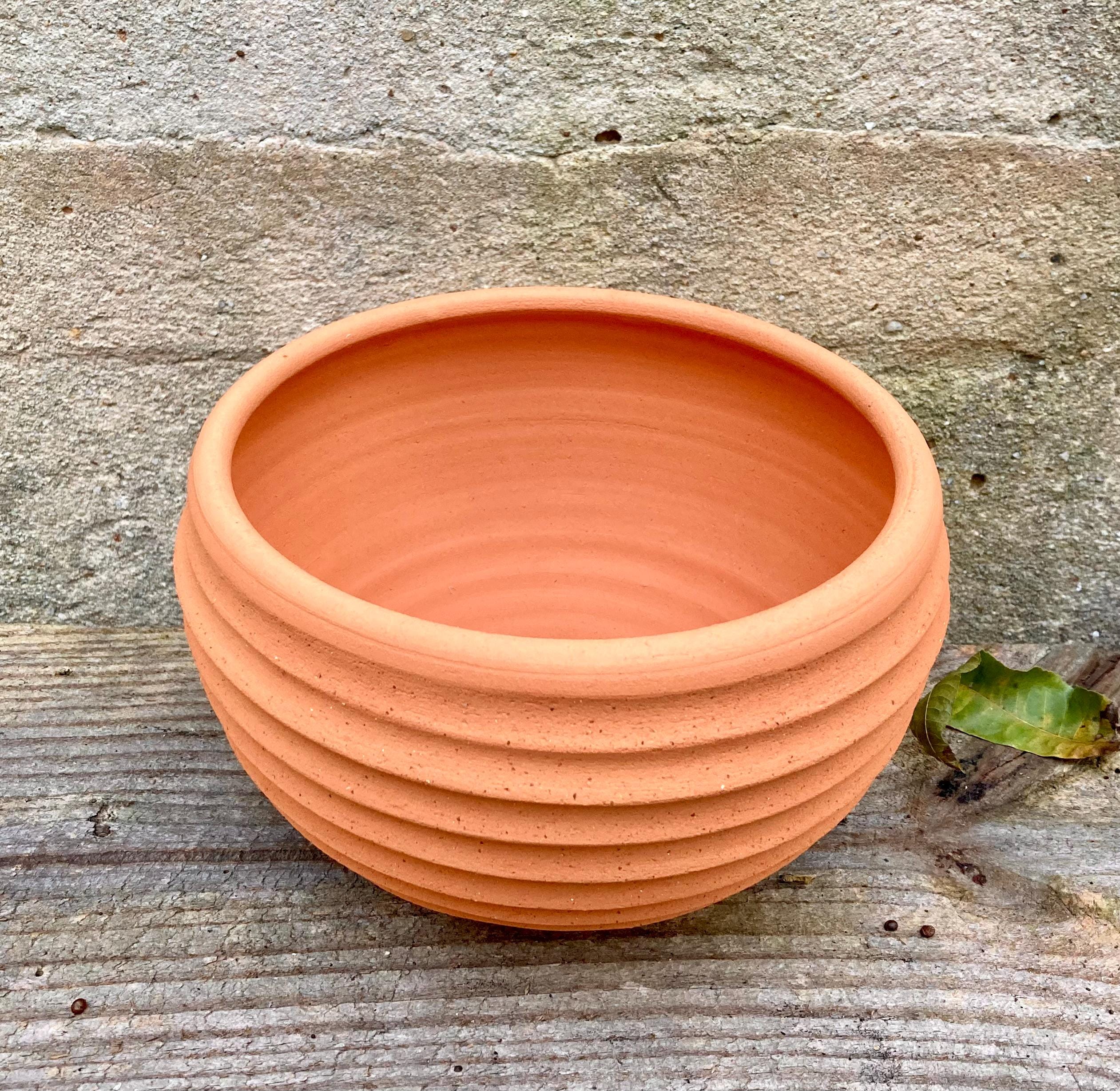 This terracotta planter was made of wheel-thrown, locally dug clay that when fired to the right temperature comes out a nice terracotta color and is porous. This allows air and water to flow through the pot which prevents root rot and soil disease.