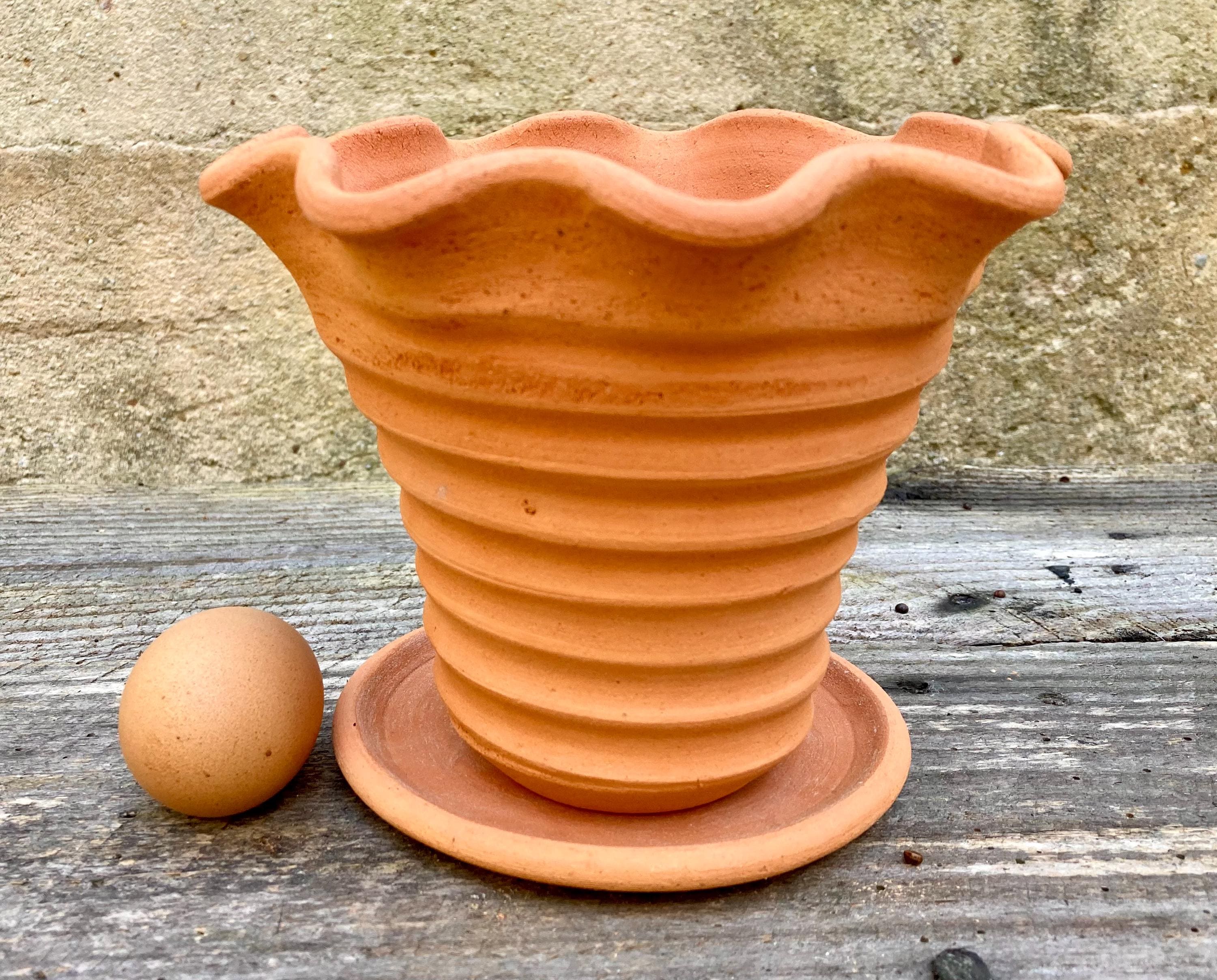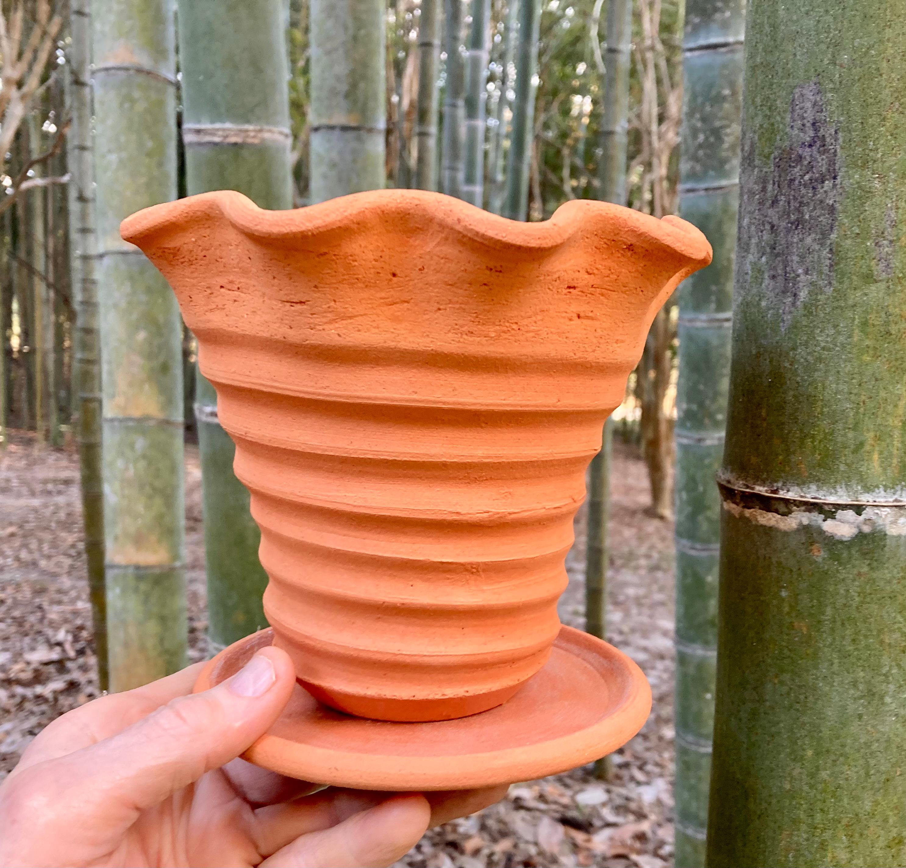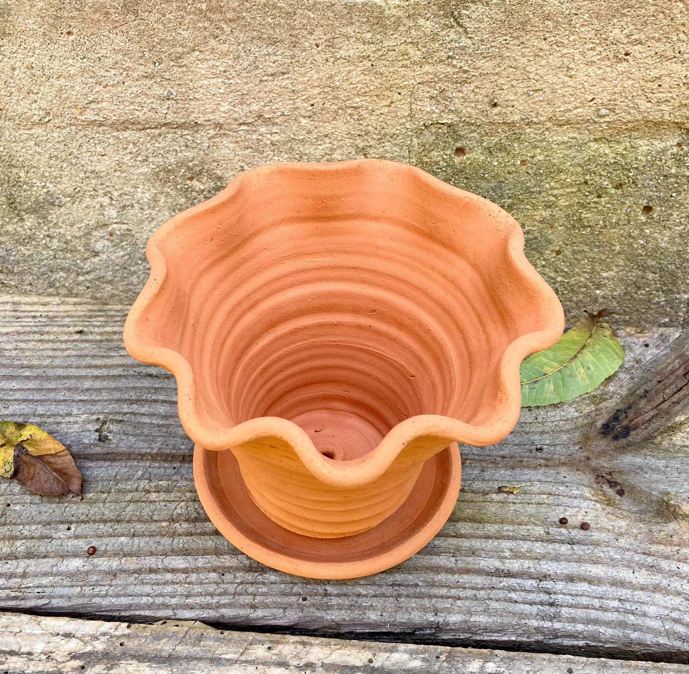 This fluted, terracotta planter with saucer was made of wheel-thrown, locally dug clay that when fired to the right temperature comes out a nice terracotta color and is porous. This allows air and water to flow through the pot which prevents root rot and soil disease.