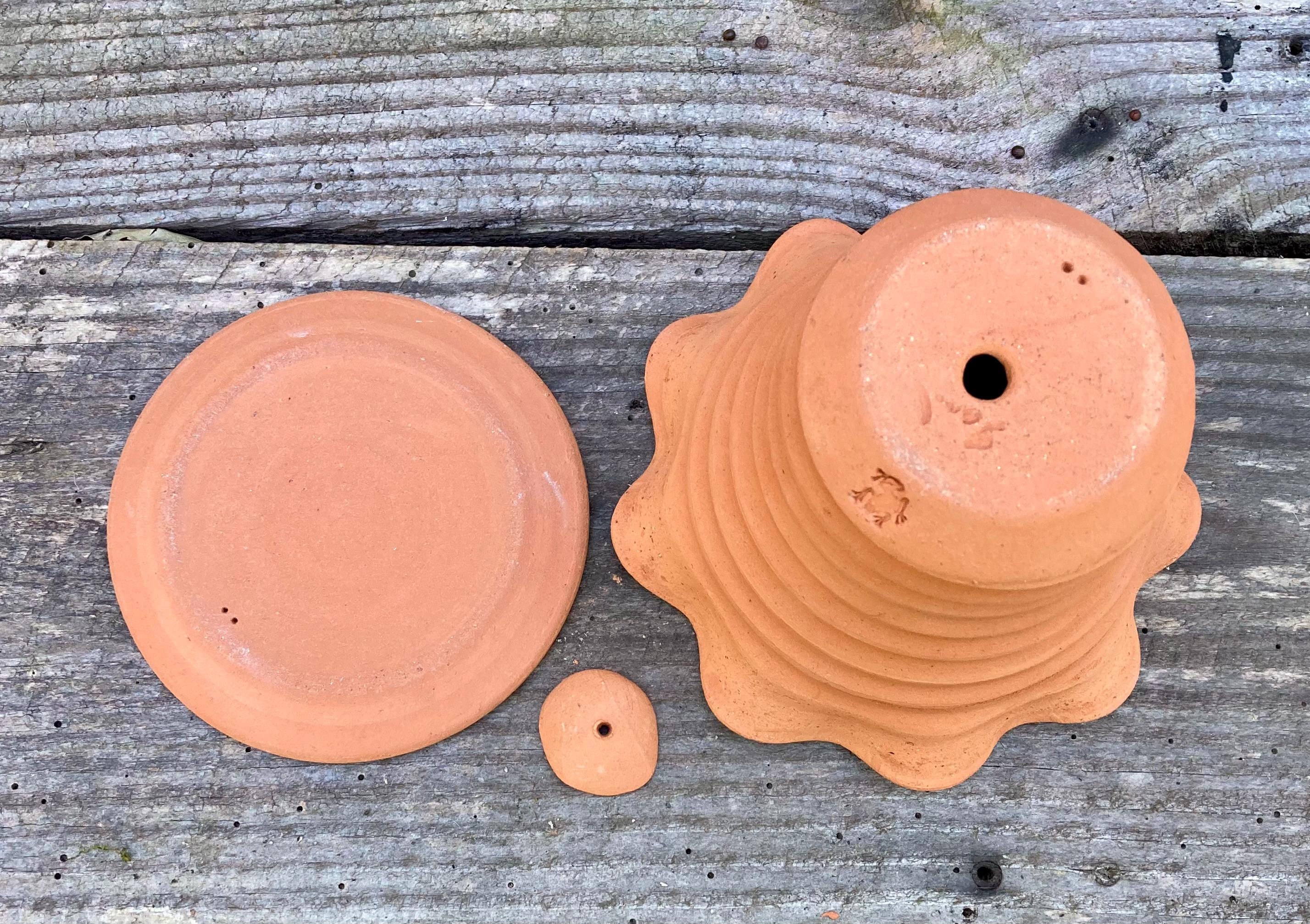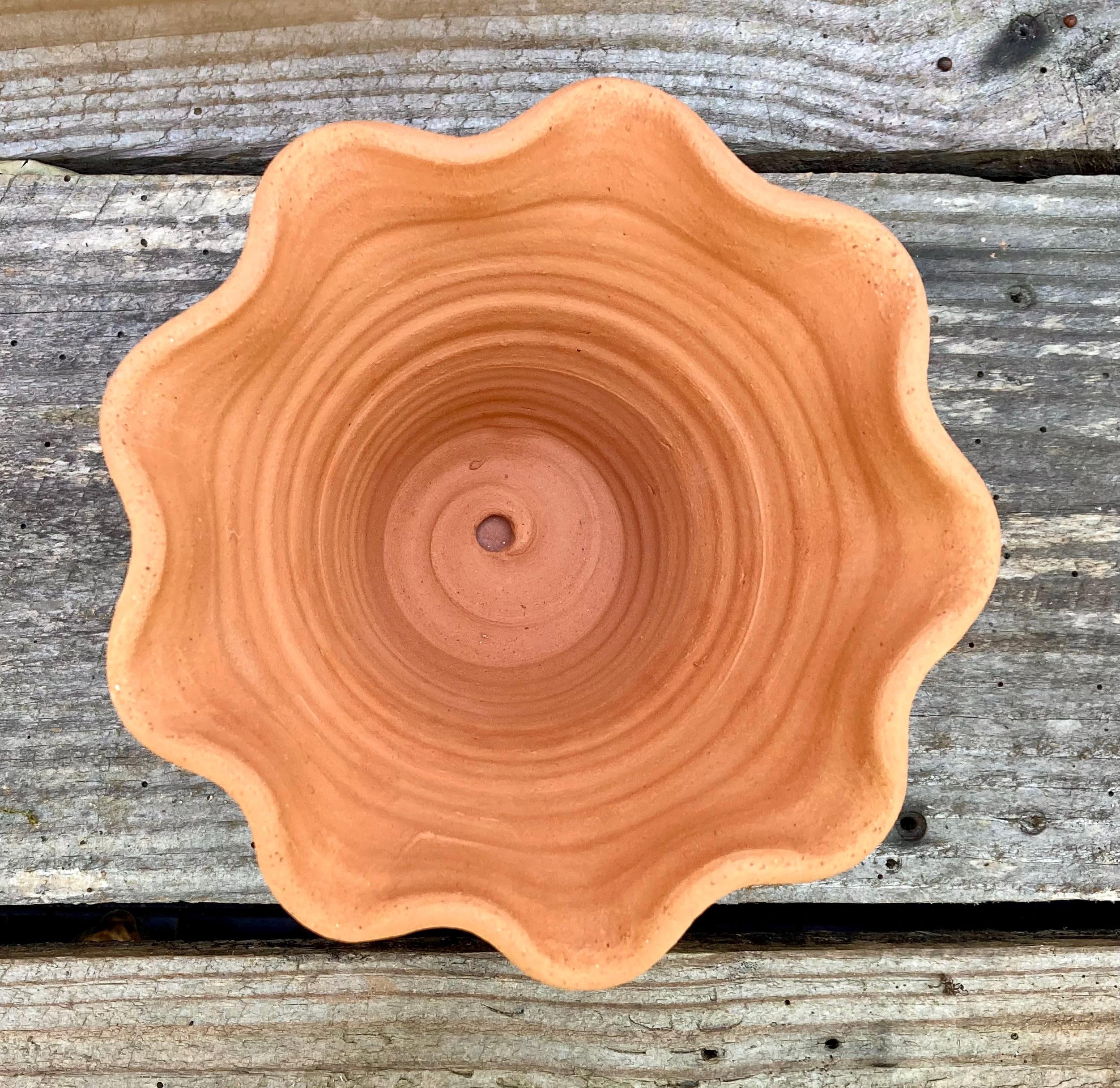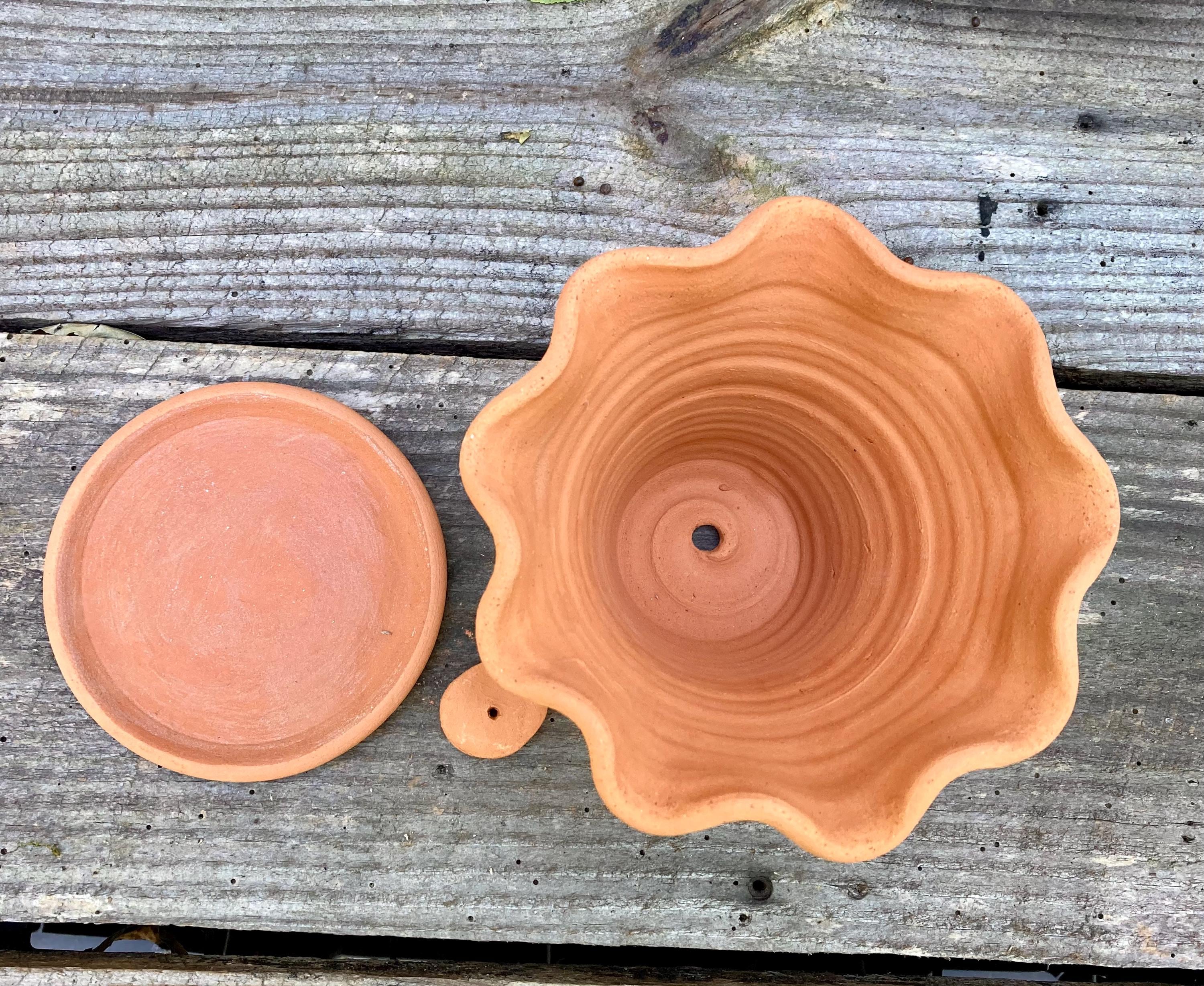 This fluted, terracotta planter with saucer was made of wheel-thrown, locally dug clay that when fired to the right temperature comes out a nice terracotta color and is porous. This allows air and water to flow through the pot which prevents root rot and soil disease.