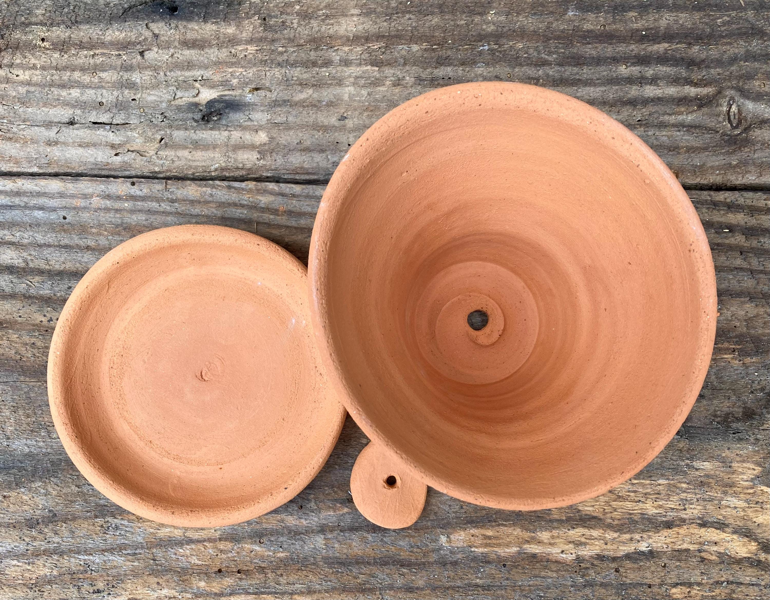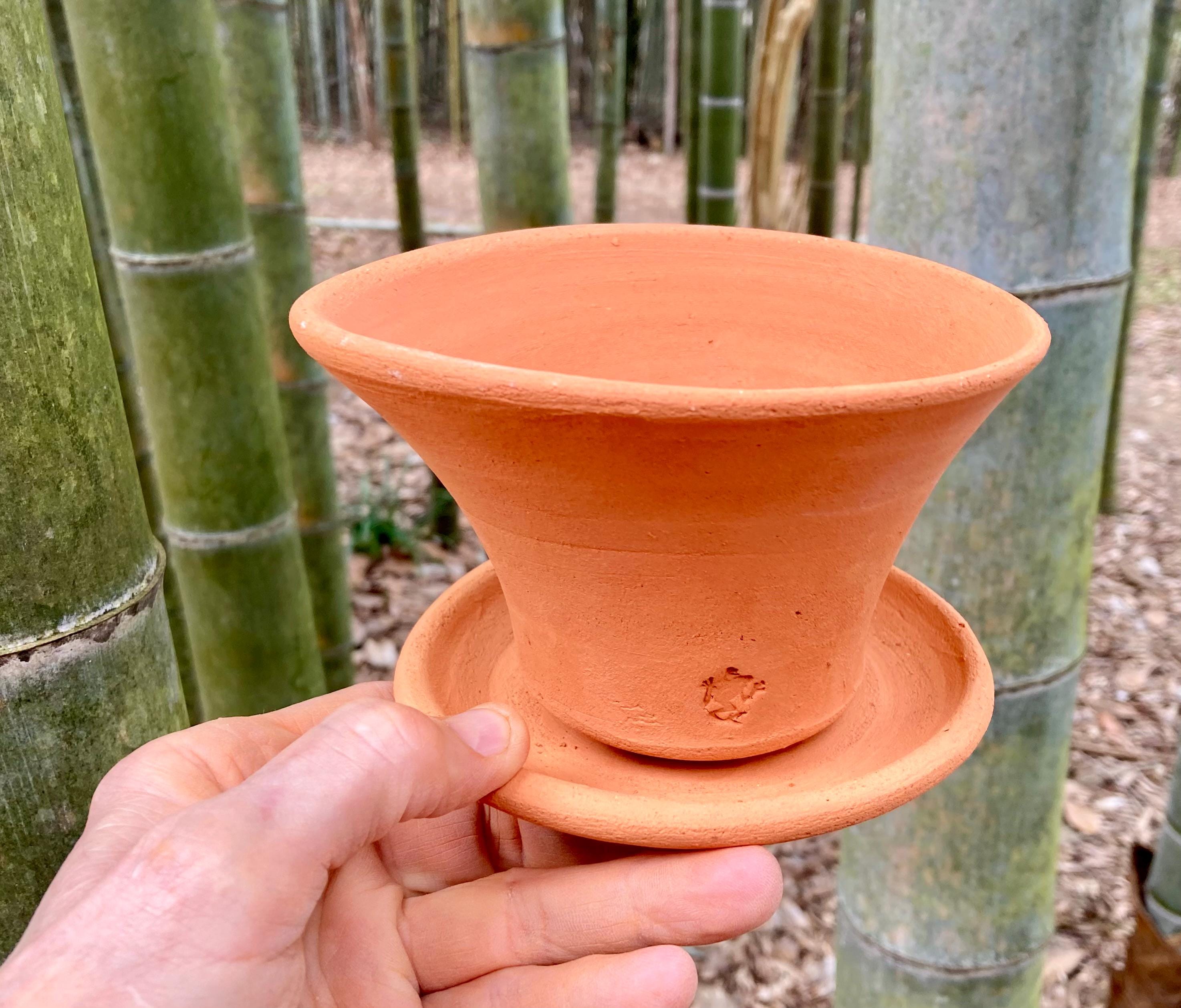It is made of locally dug clay that when fired to the right temperature comes out a nice terracotta color and is porous. This allows air and water to flow through the pot which prevents root rot and soil disease.
