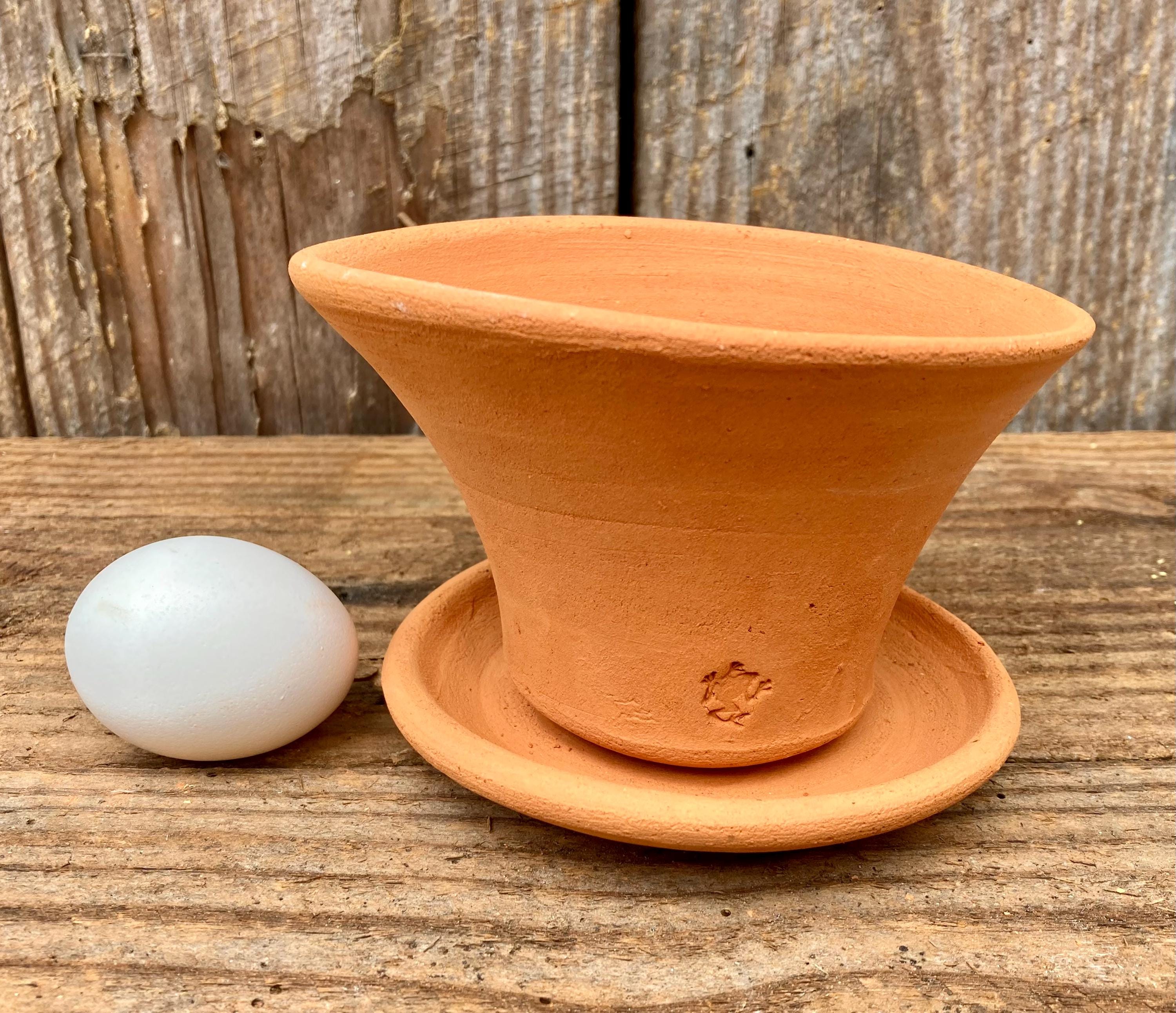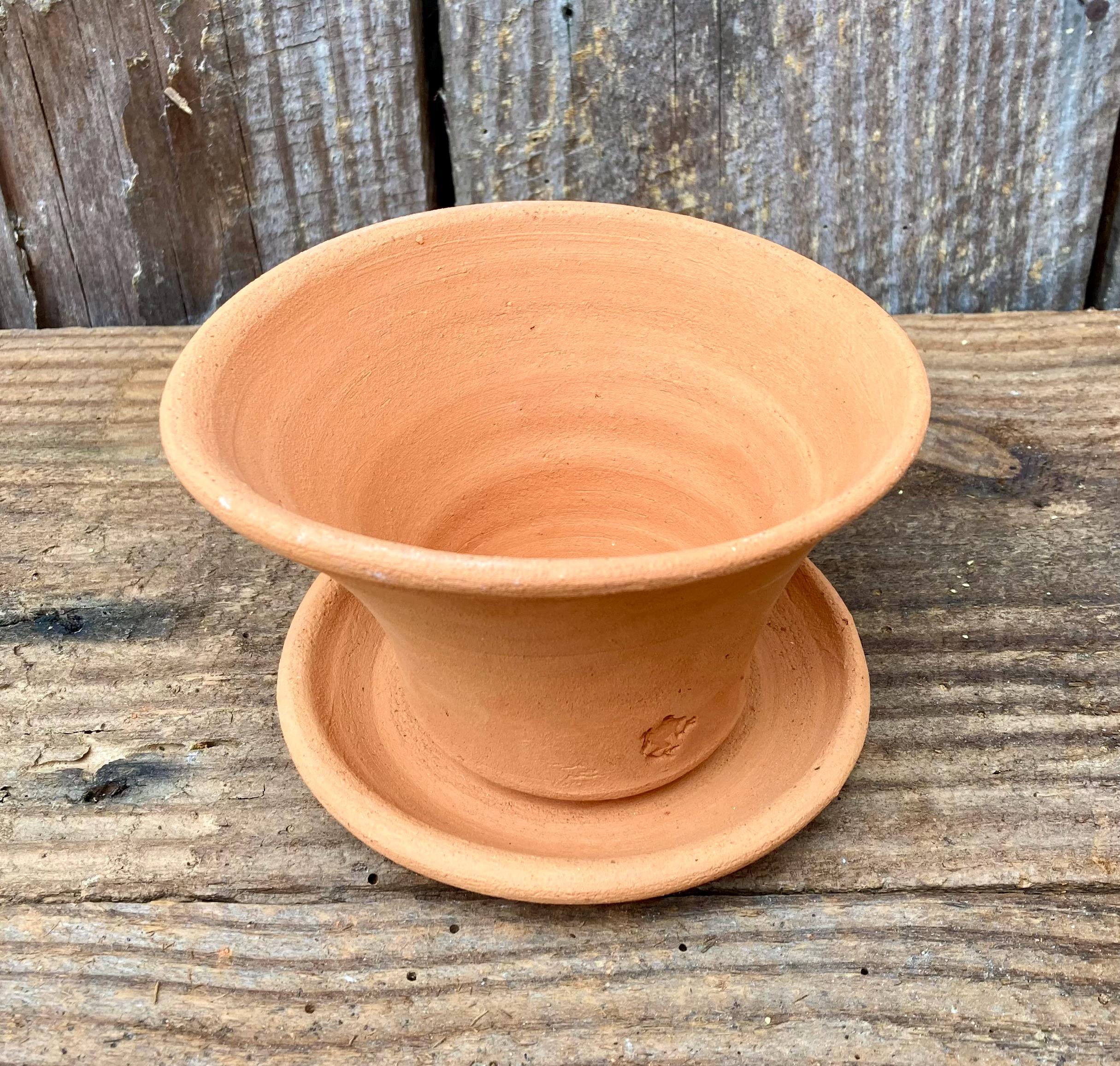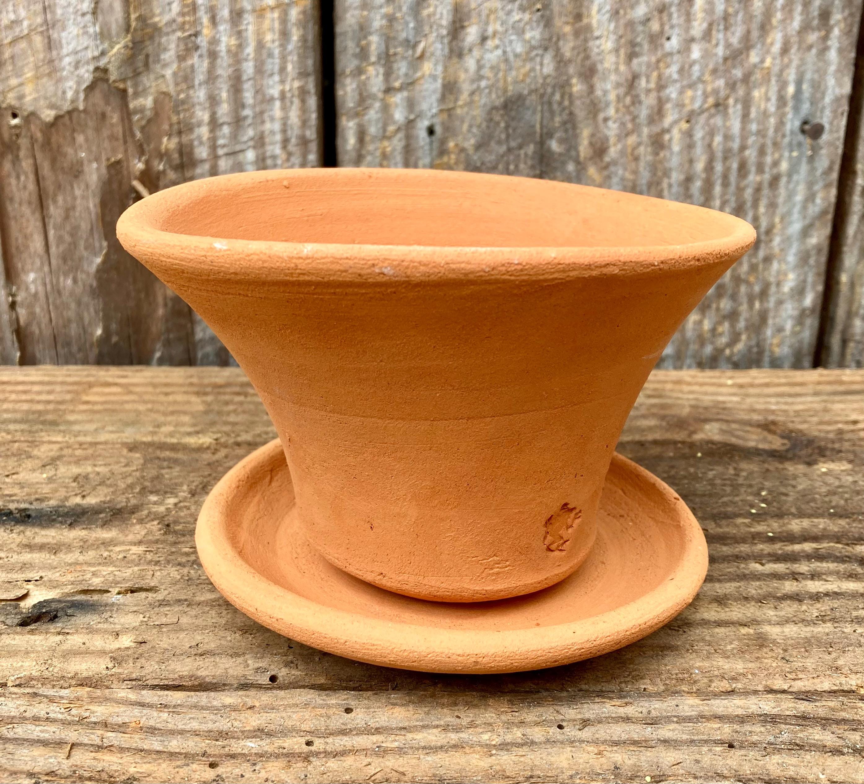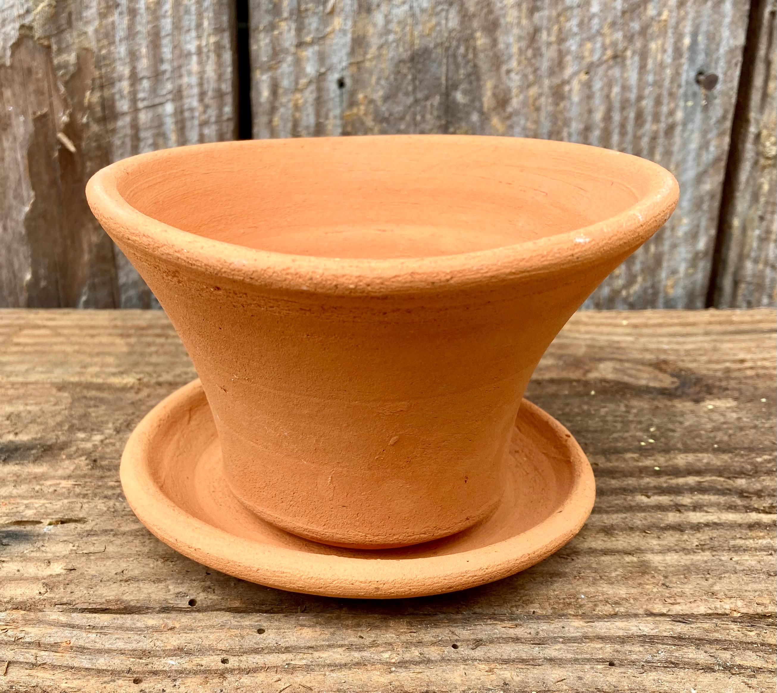 This terracotta planter was centered on the wheel then knocked off center to make it asymmetrical, to get a lip that is thick on one side and thin on the other, to get gesture and movement. The saucer was done the same way.