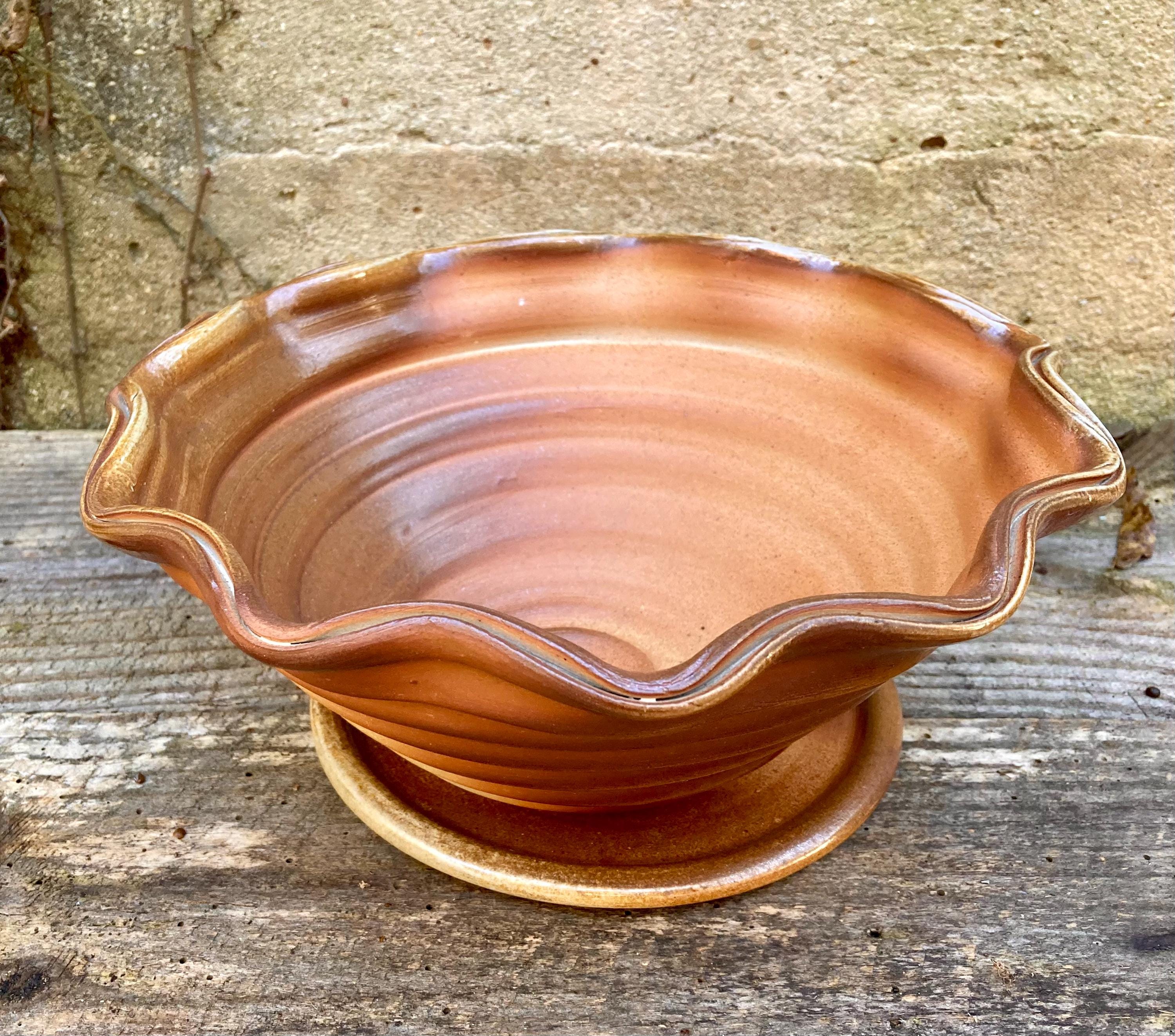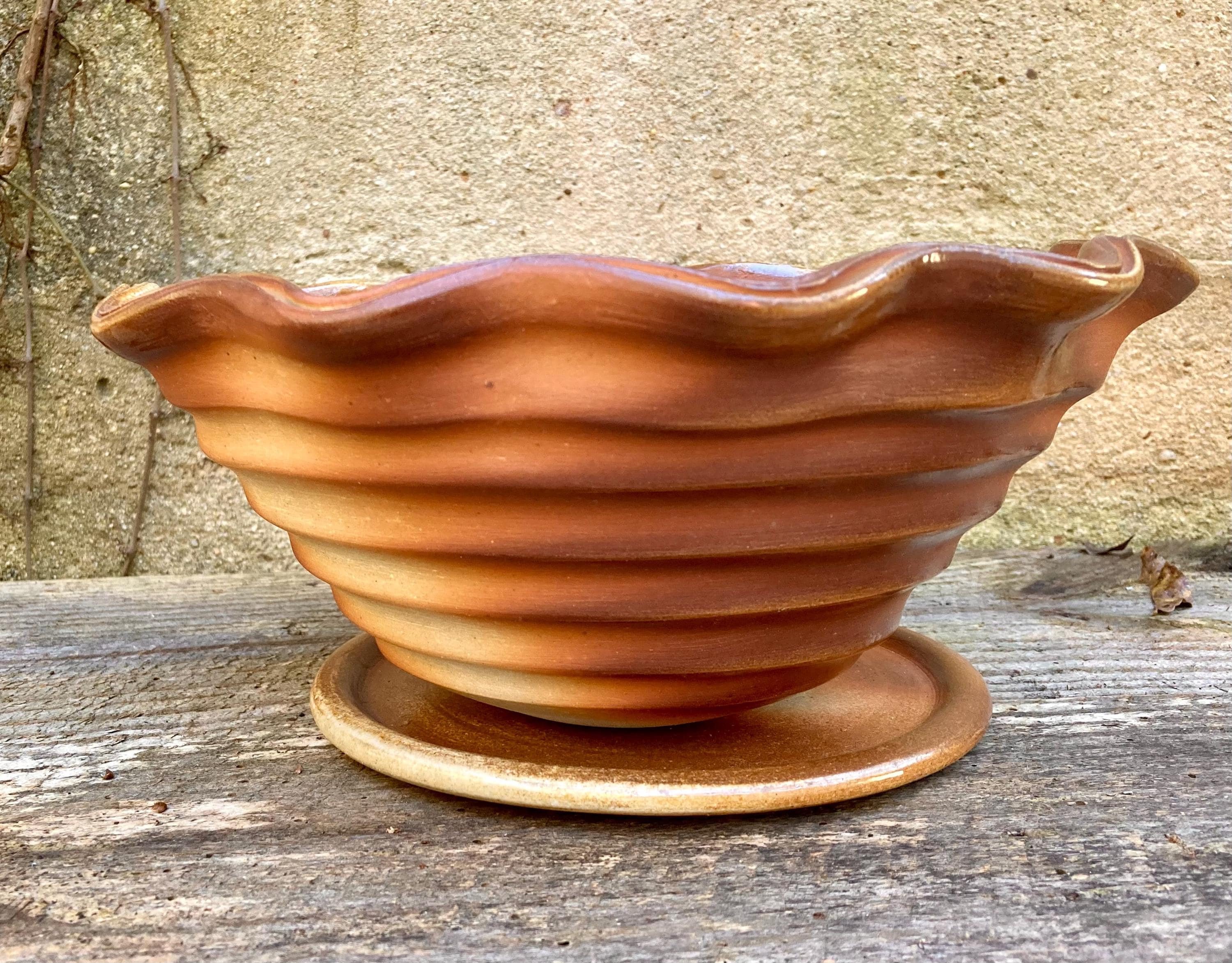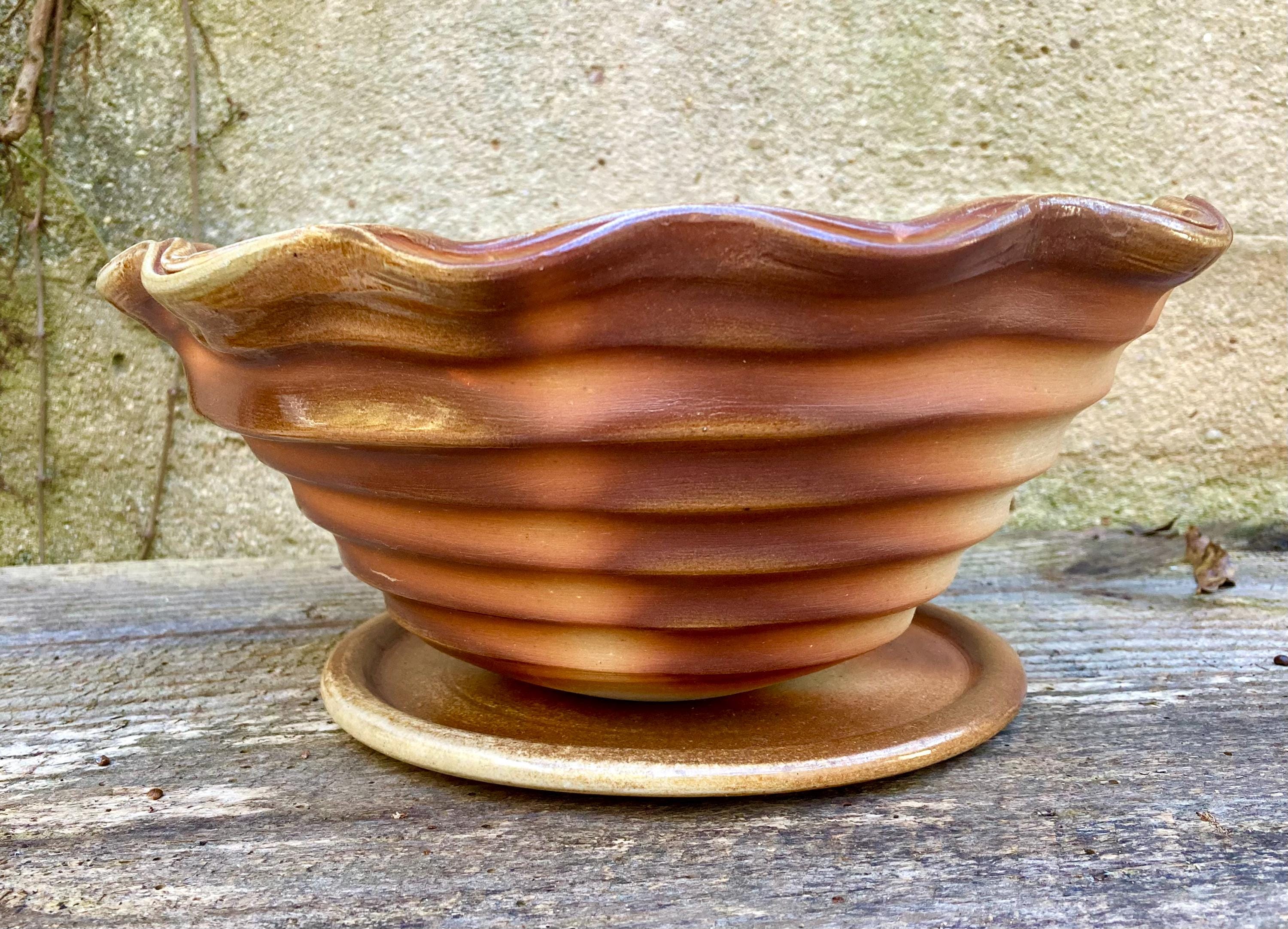 This fluted, wood fired flower pot with saucer was wheel thrown and is one of a kind. It was colored by flames and glazed by the wood ash in the fire.