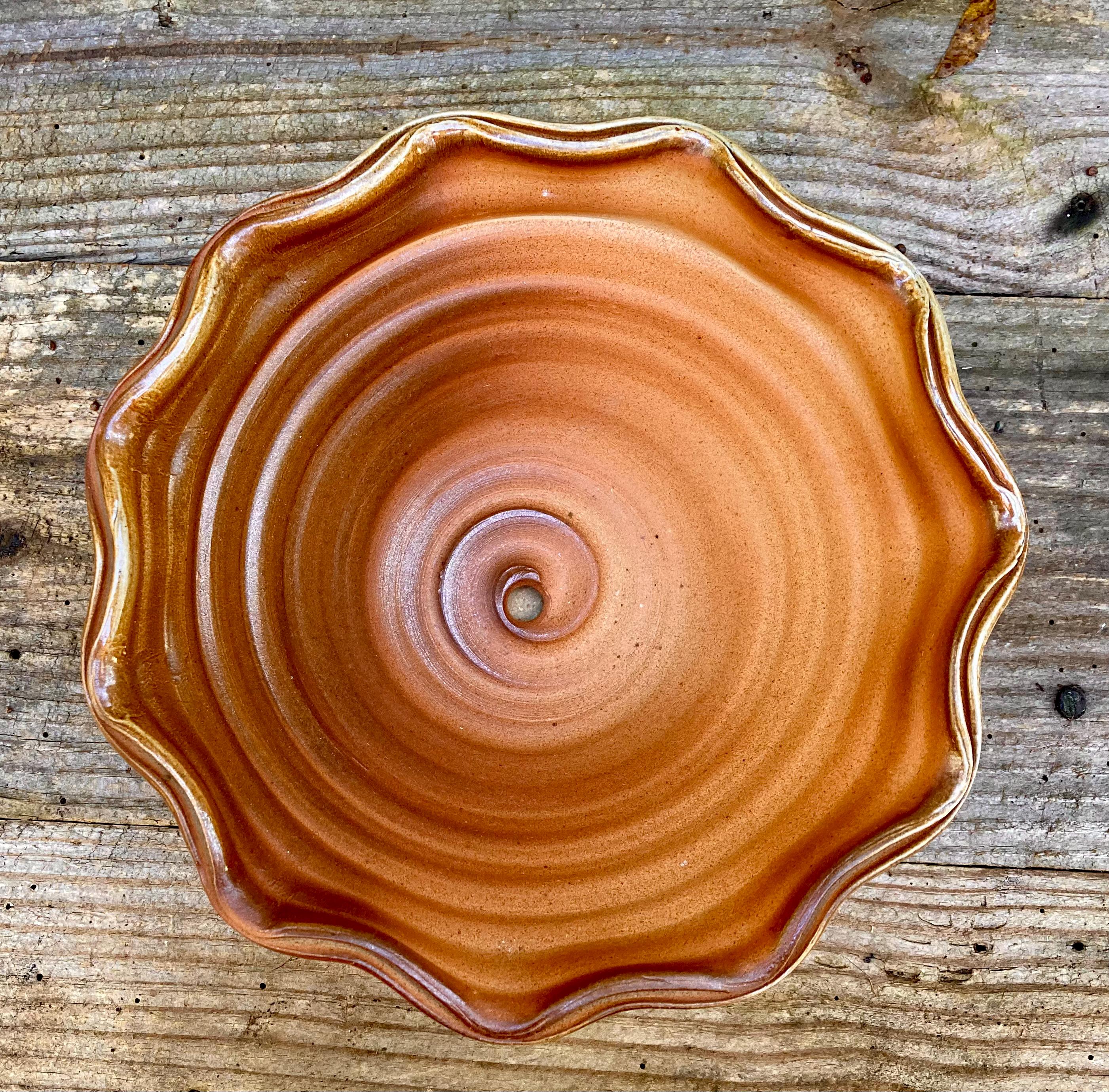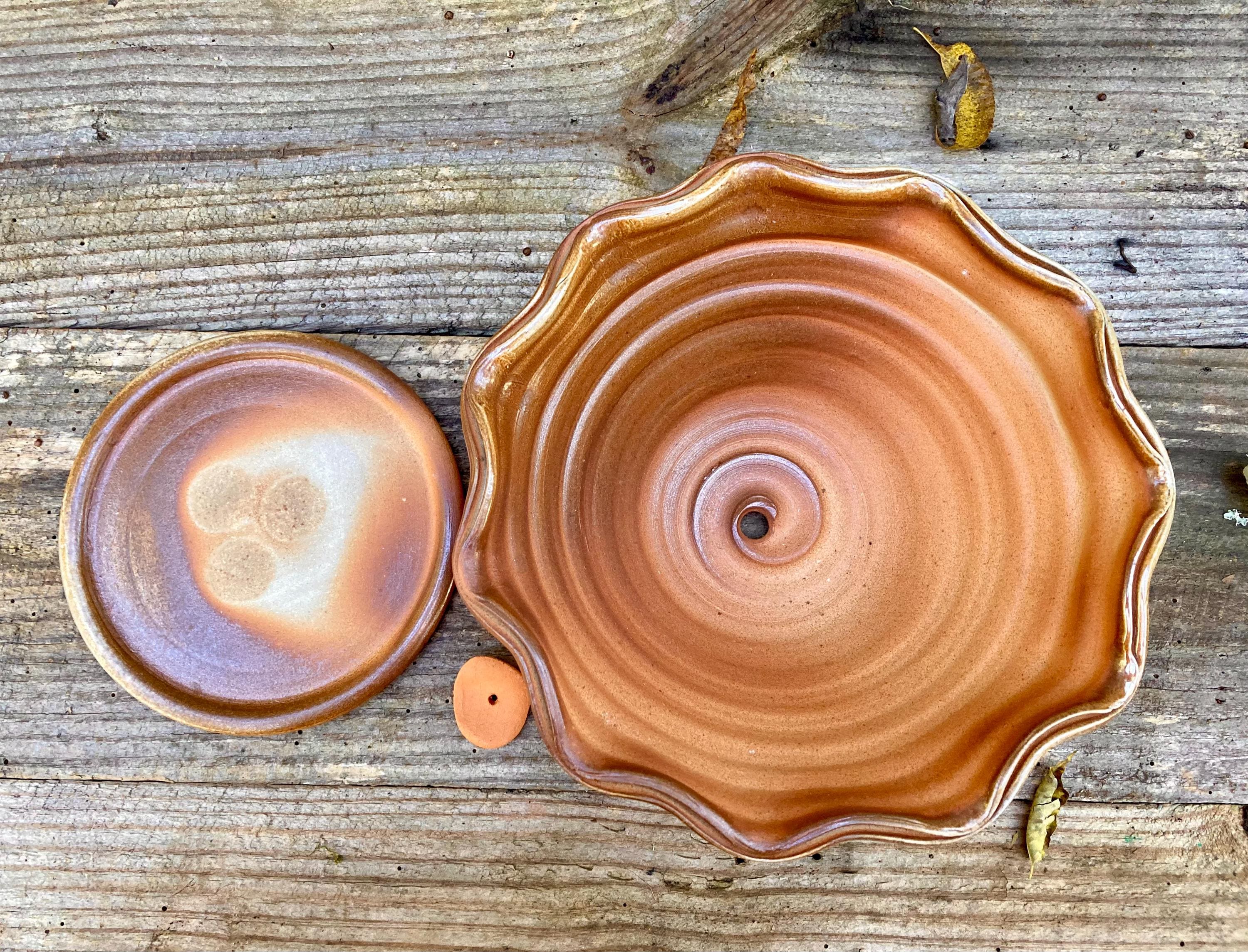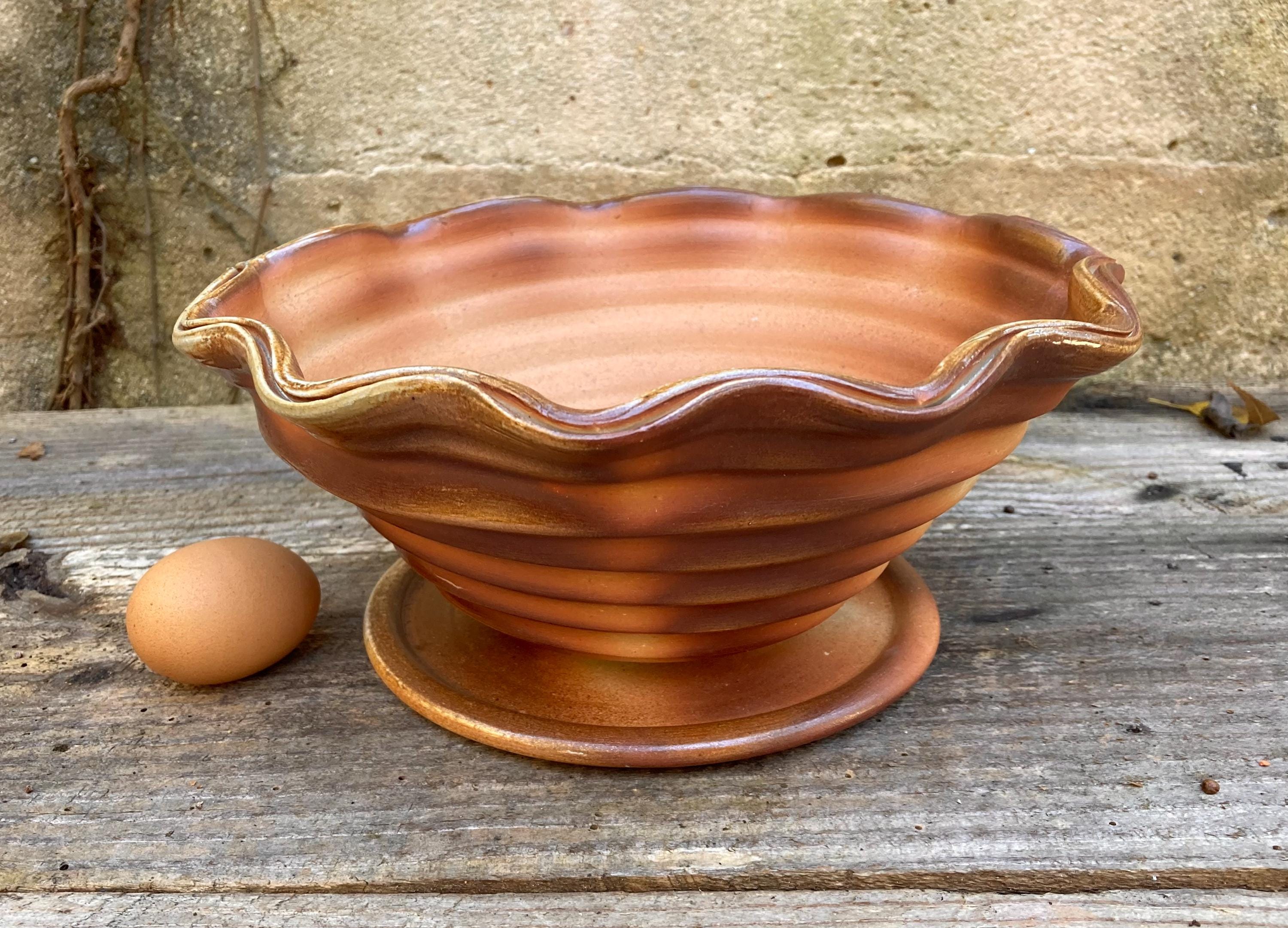This fluted, wood fired flower pot with saucer was wheel thrown and is one of a kind. It was colored by flames and glazed by the wood ash in the fire.