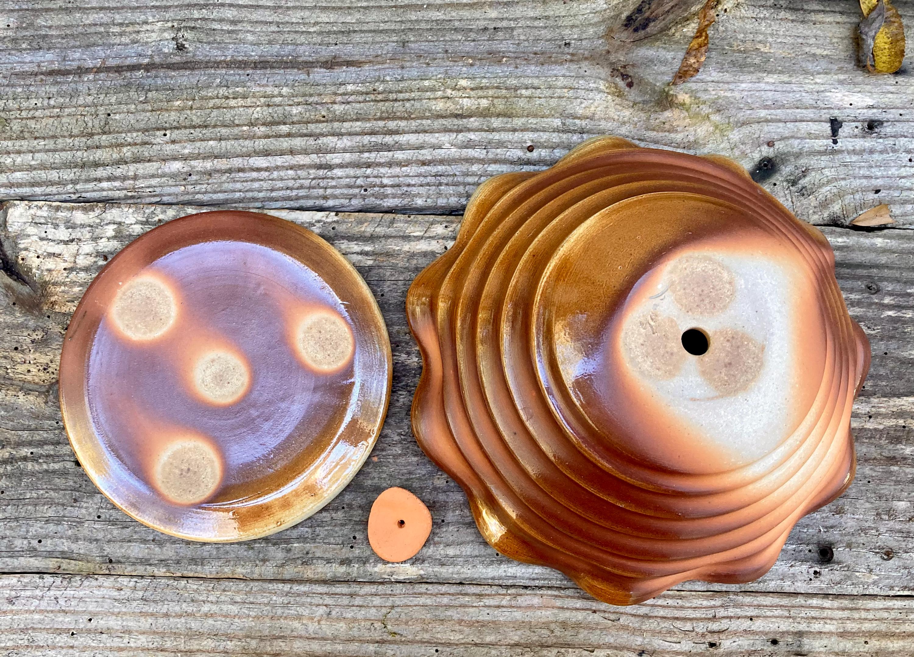 This long, labor-intensive firing gives the flames time to develop the incomparable colors and glaze of a long wood firing. The glazing and color flashing depends on how the flames and ash hit the pot so some parts will have have a shiny, slightly iridescent glaze ("juicy") and other parts will have little or no glaze ("dry") but will have more color variation and will feel satiny to slightly rough instead of glossy.