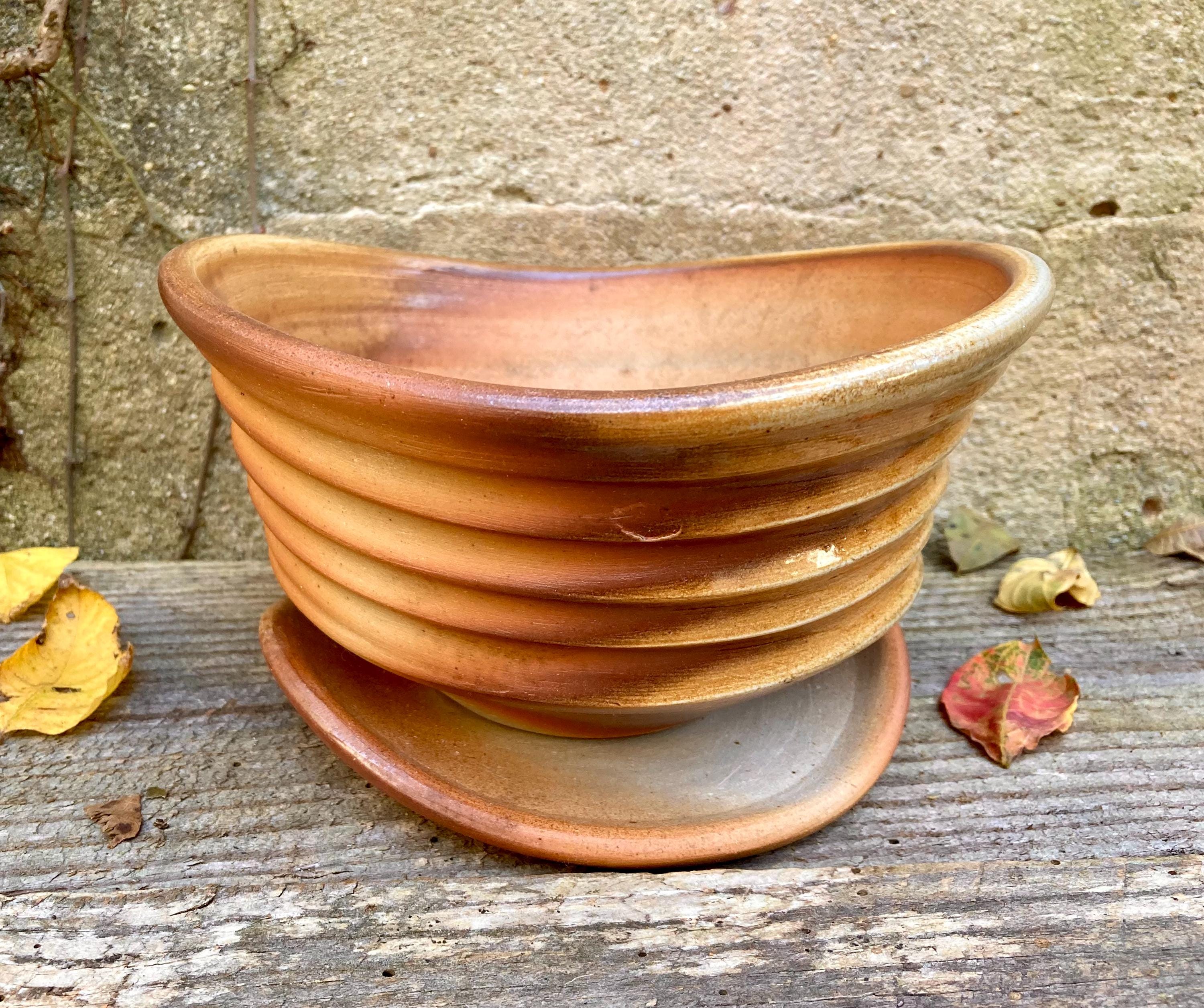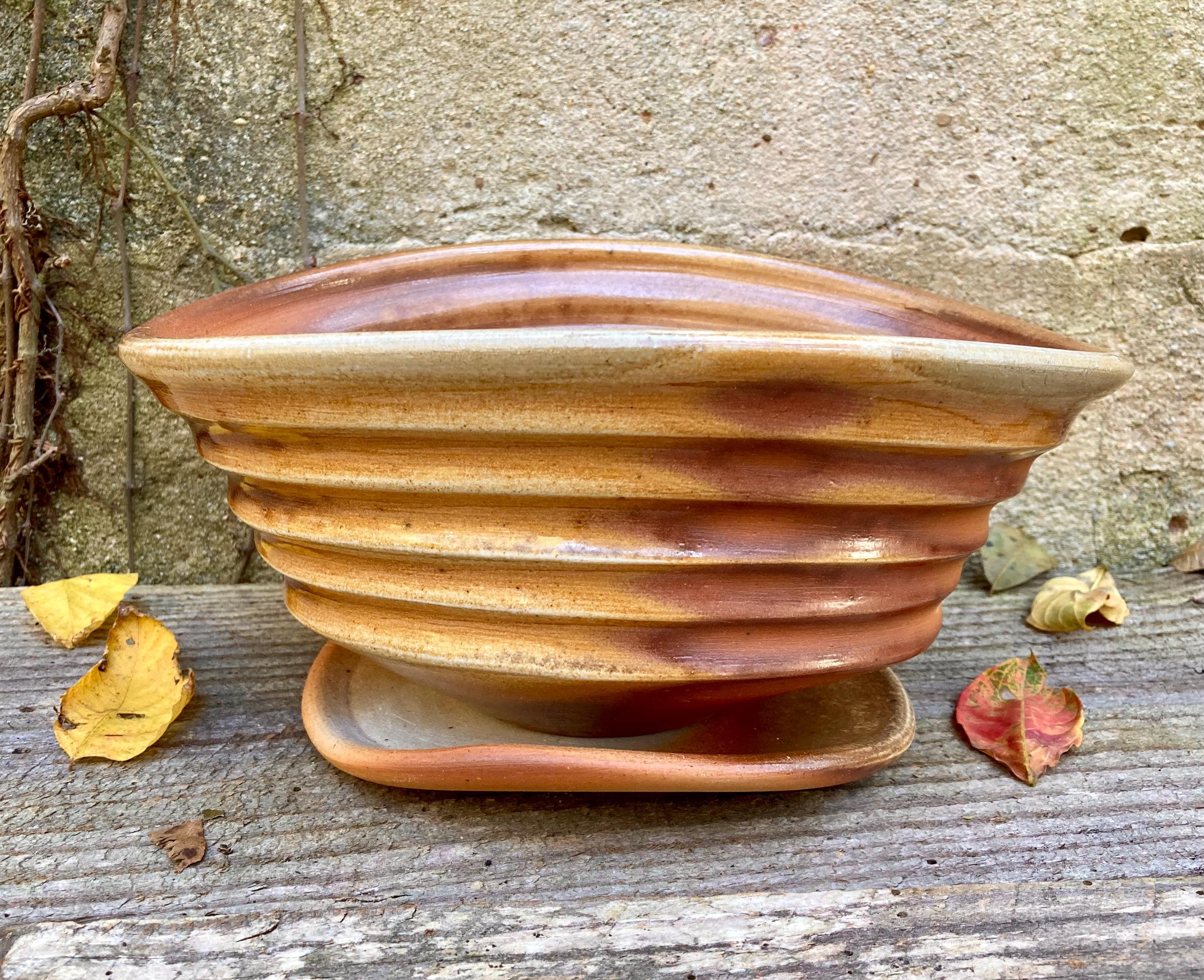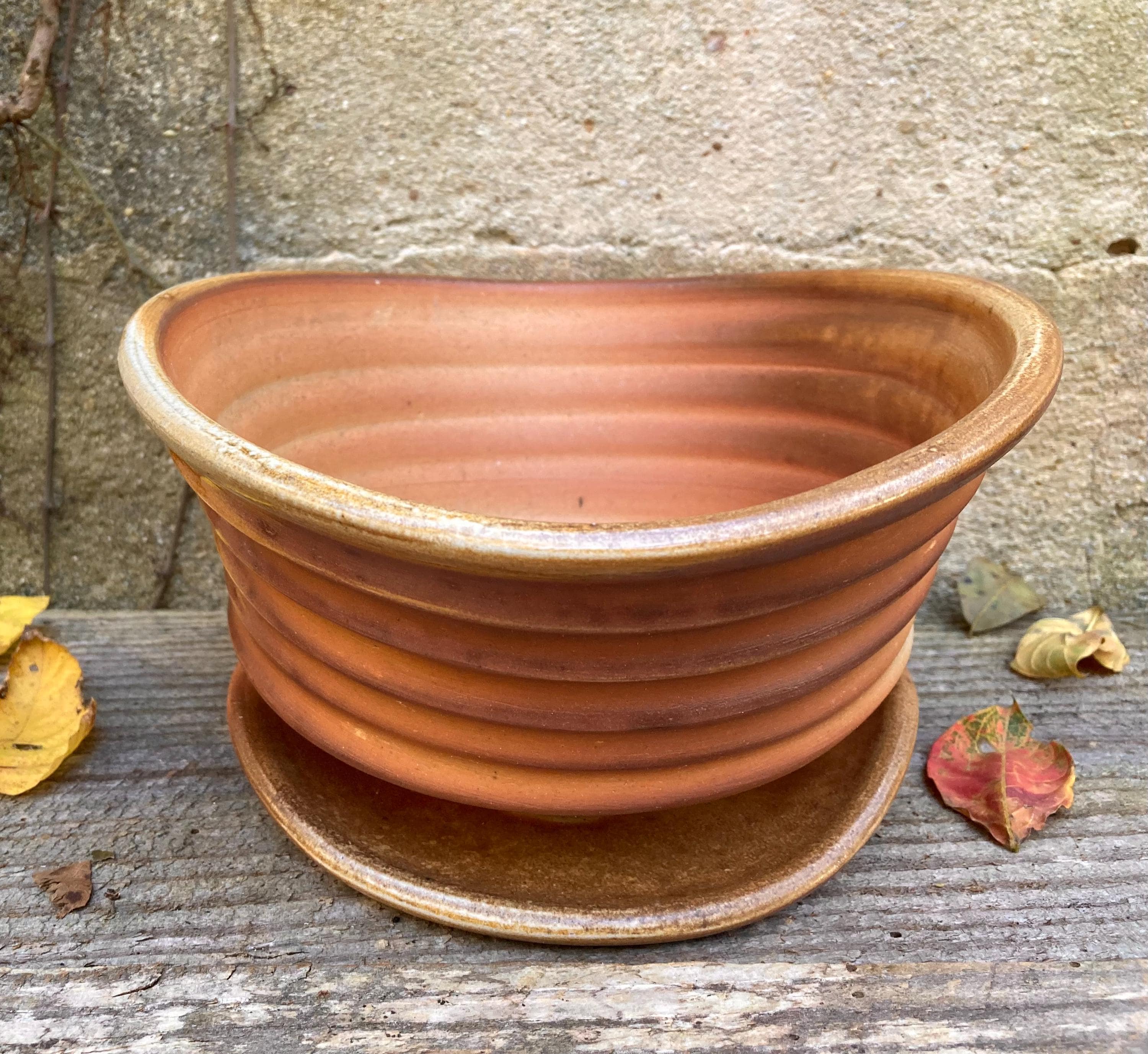 This wood fired flower pot with saucer was wheel thrown and hand altered for gesture. It was colored by flames and glazed by the wood ash in the fire.