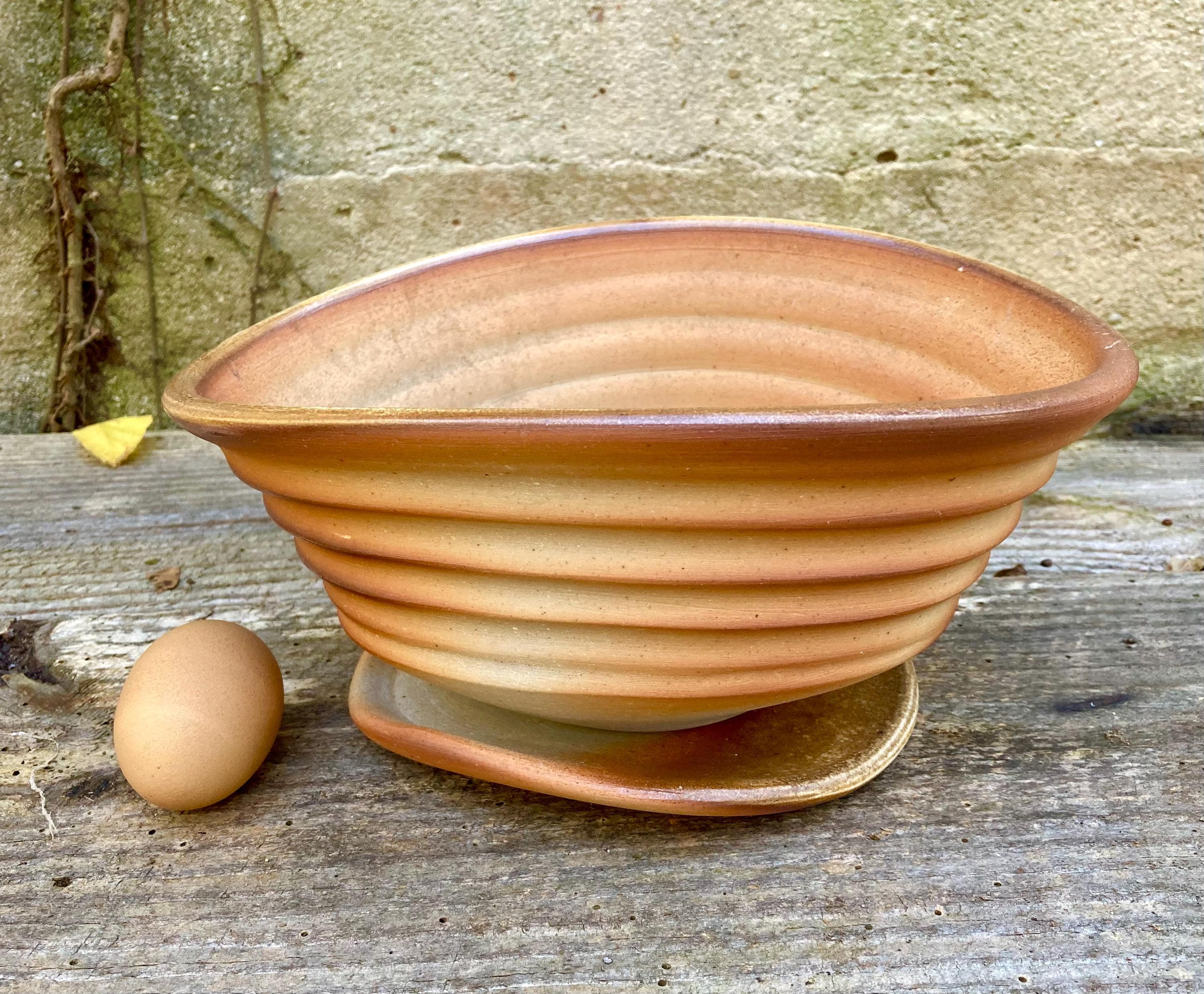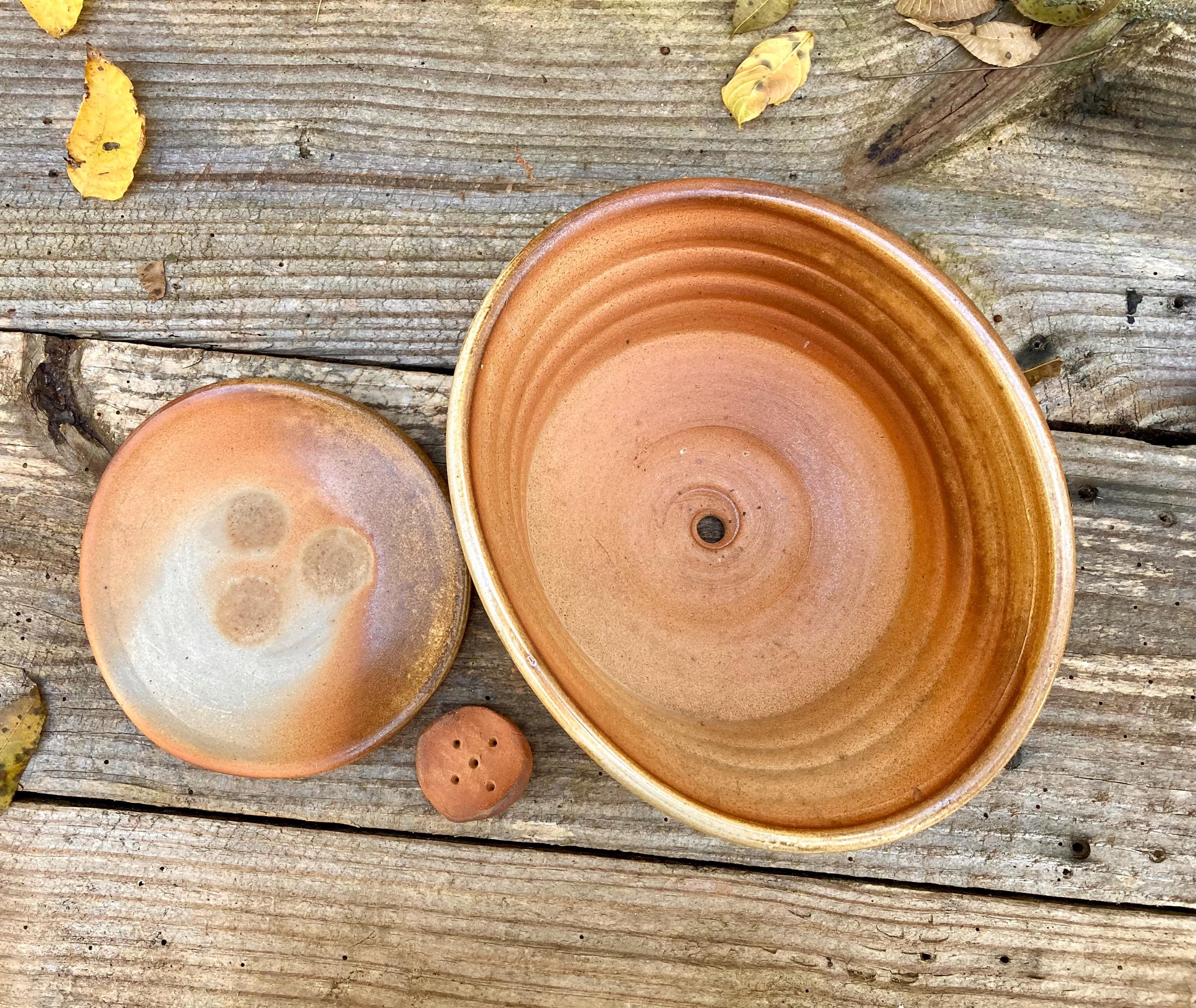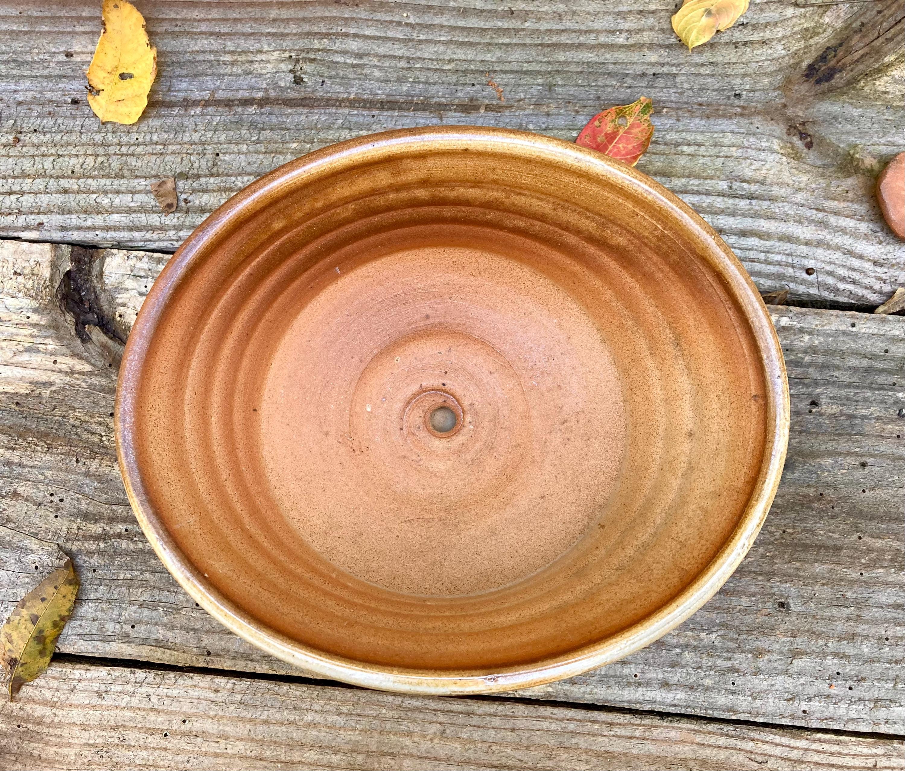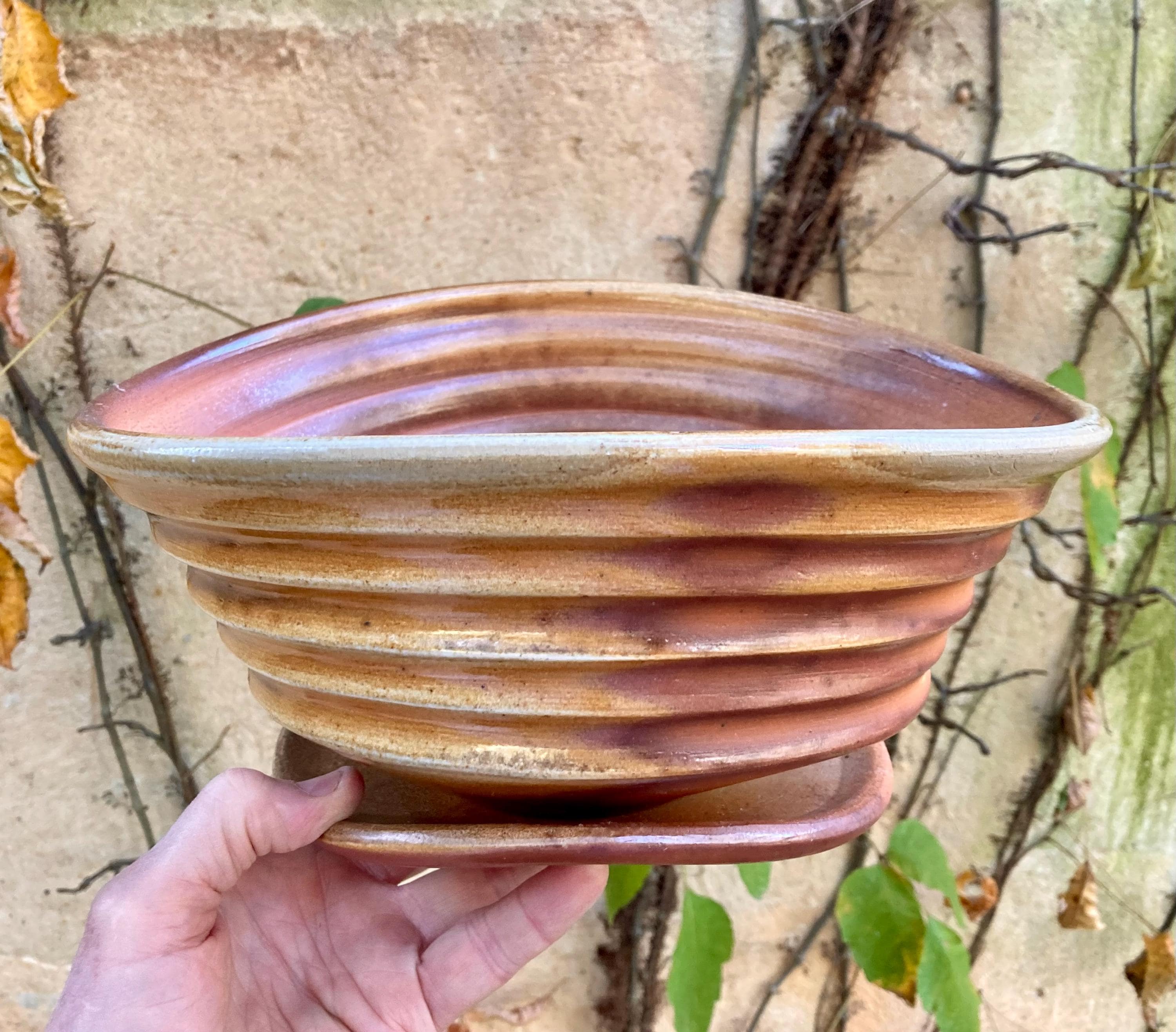 This wood fired flower pot with saucer was wheel thrown and hand altered for gesture. It was colored by flames and glazed by the wood ash in the fire.