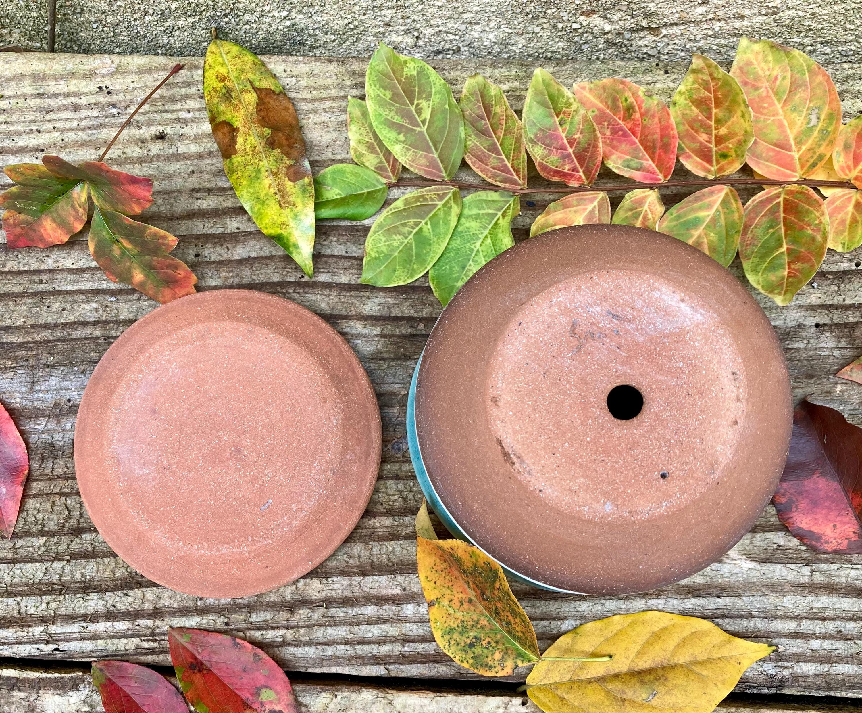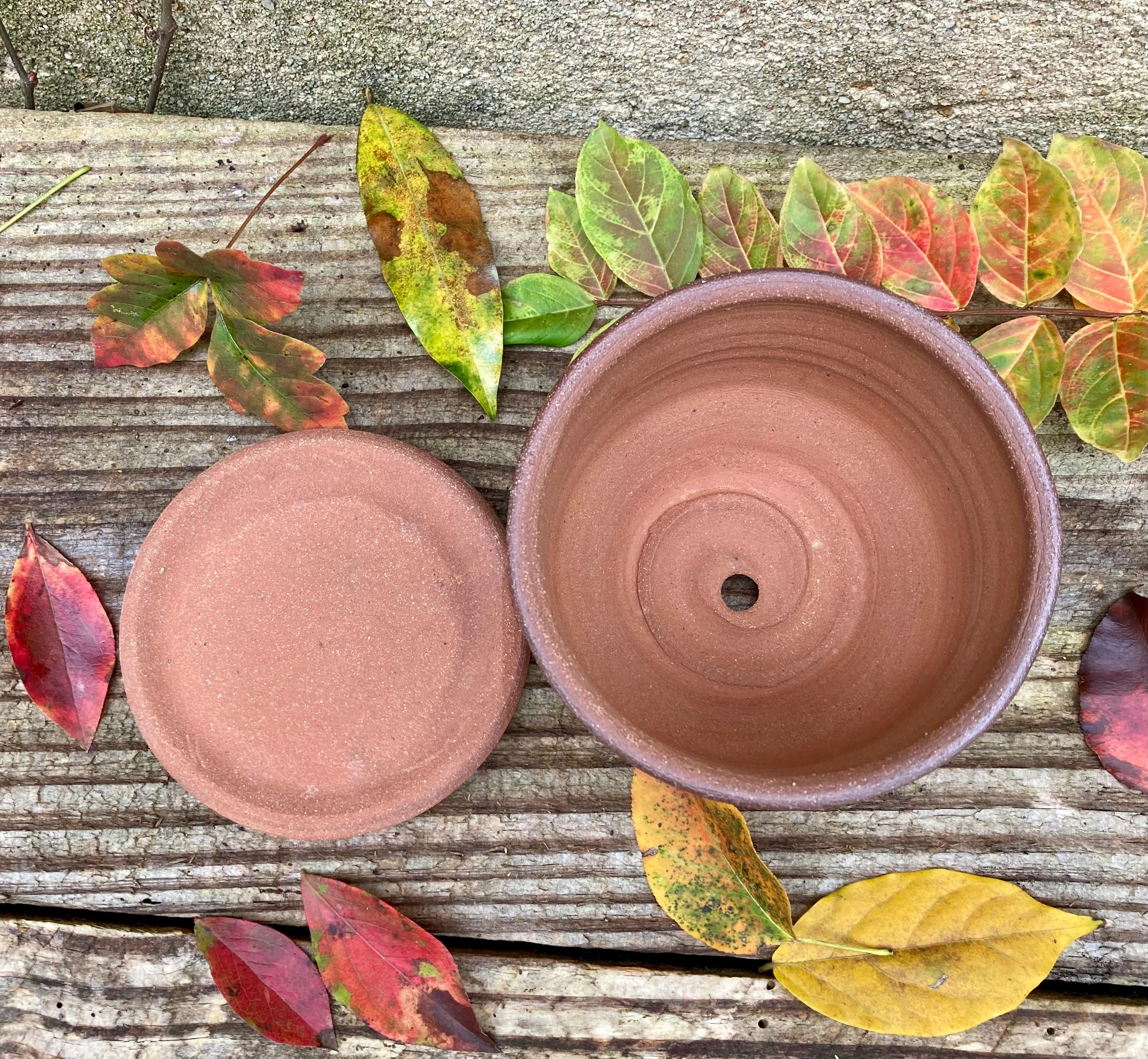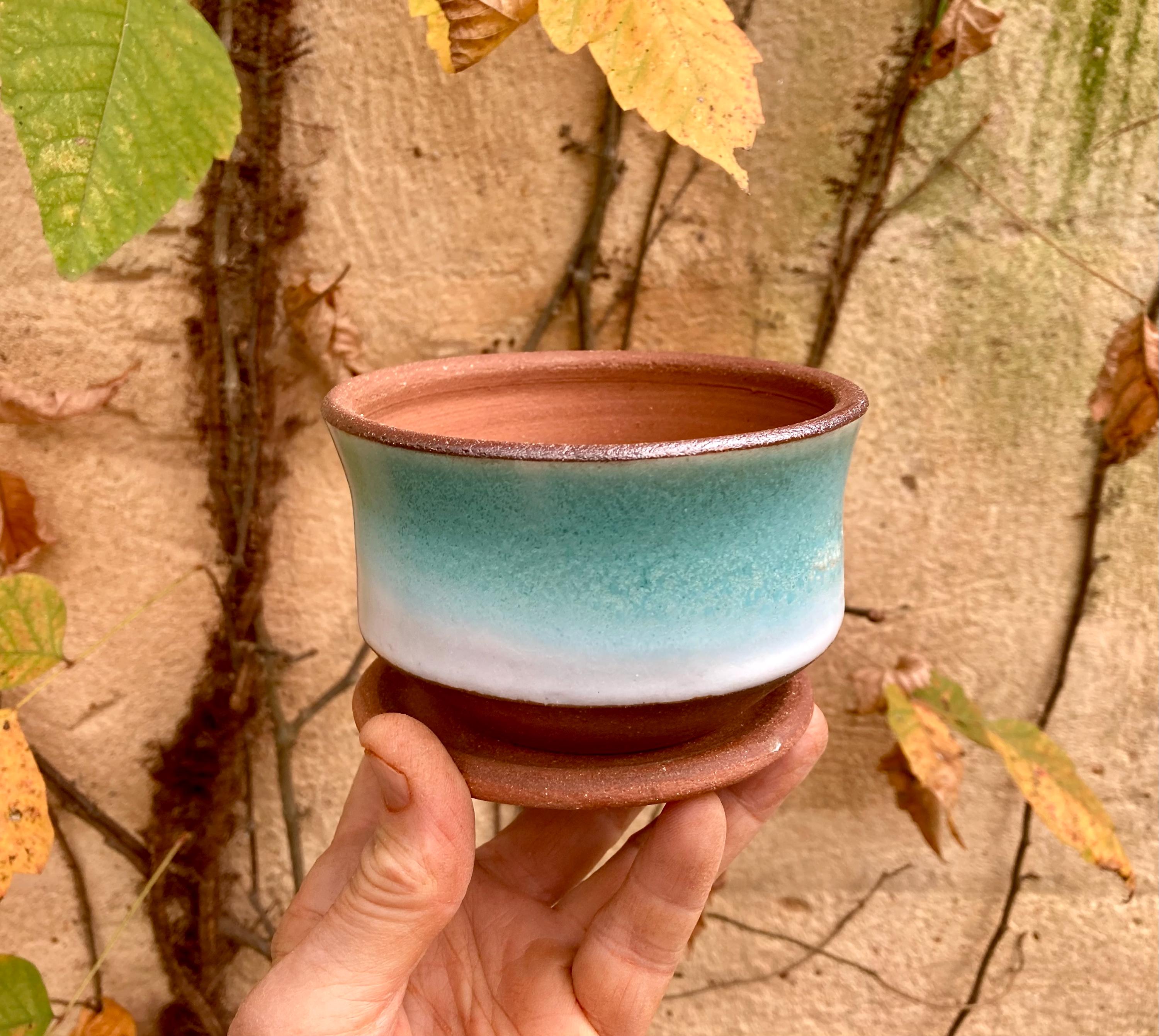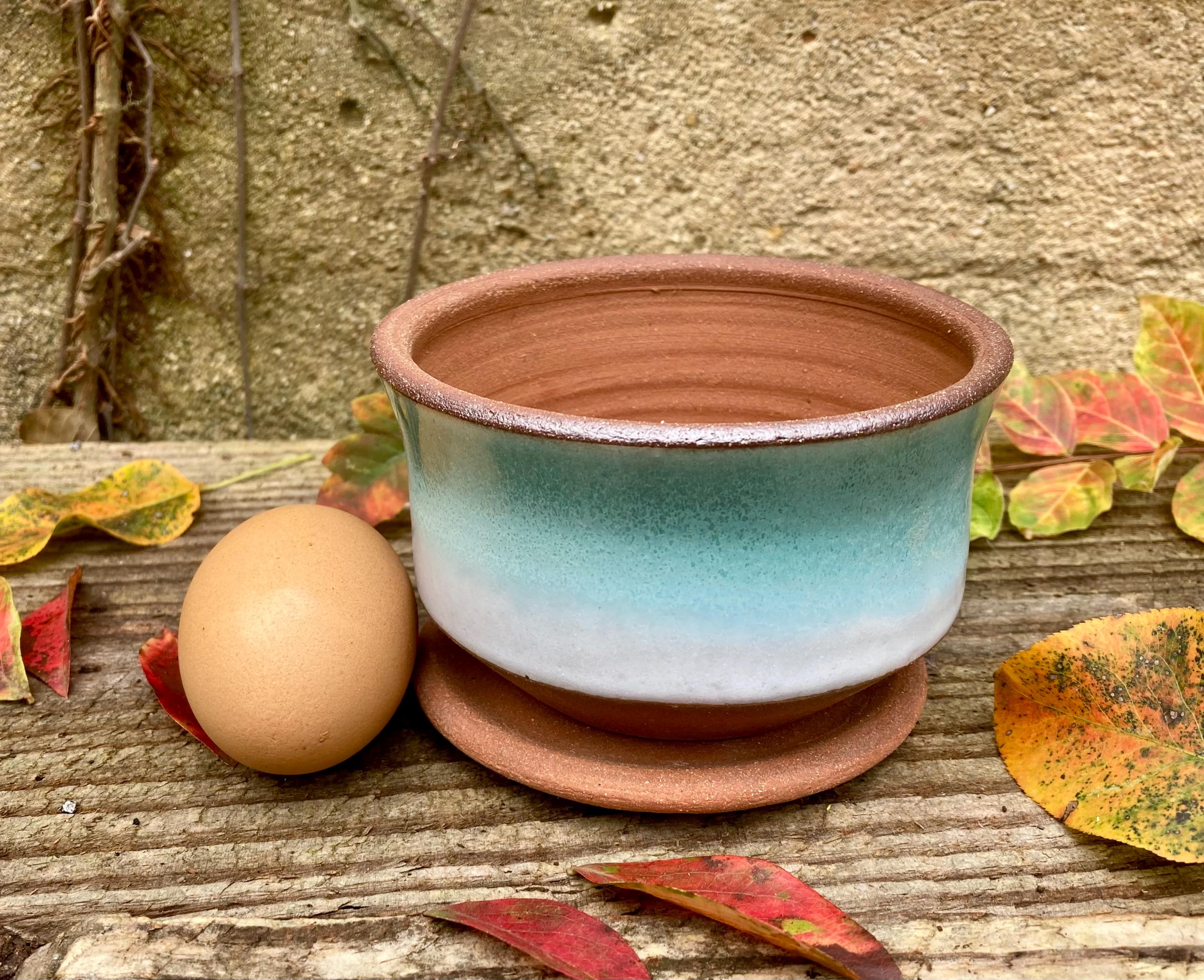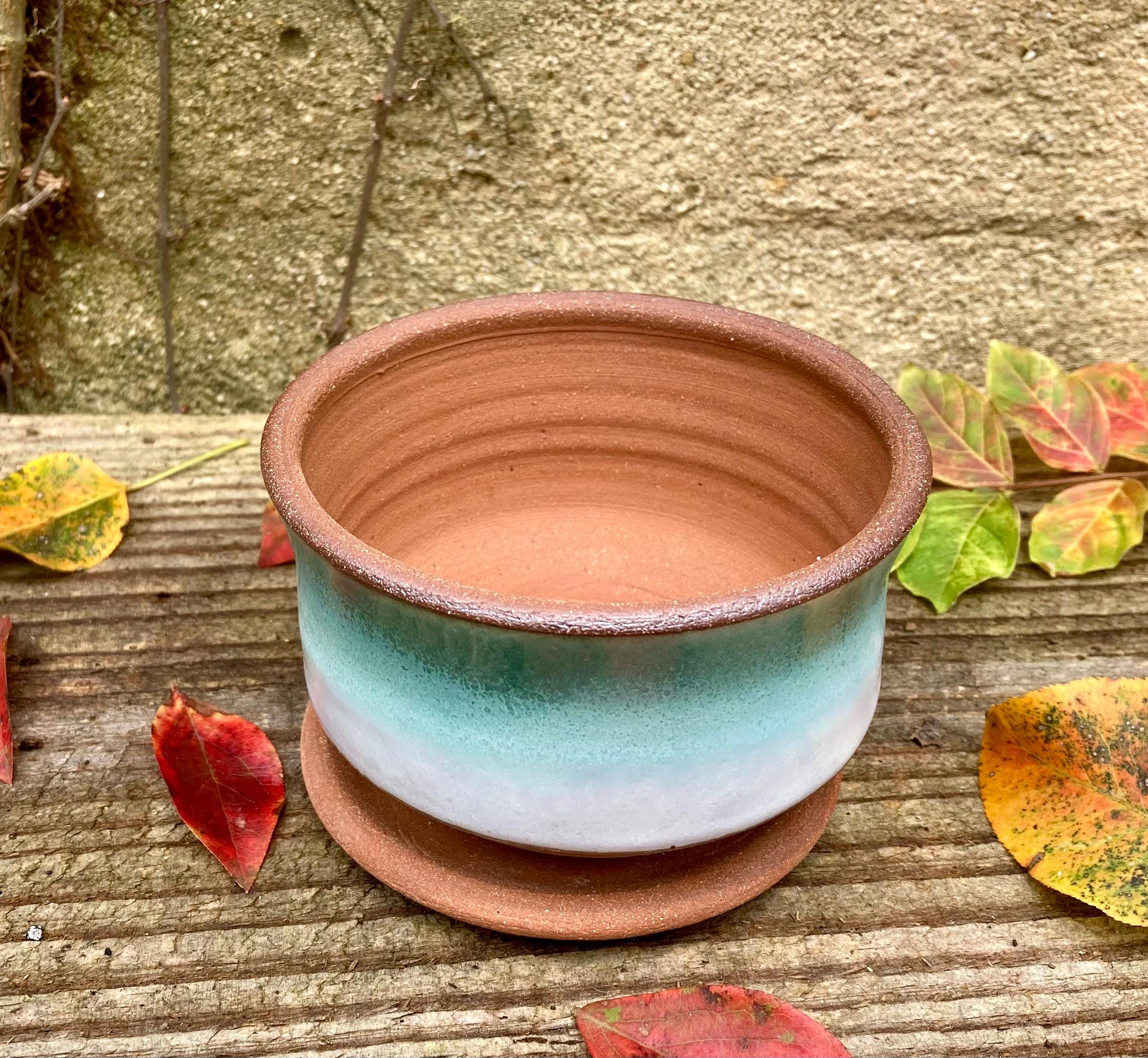 This small, stoneware planter with saucer was wheel-thrown and fired to 2300 degrees for strength and durability. It was slow cooled to give the glazes time to run blend together and produce subtle colors. The burnt red color of the clay will contrast nicely with the green of a cactus, succulent or other small houseplant.