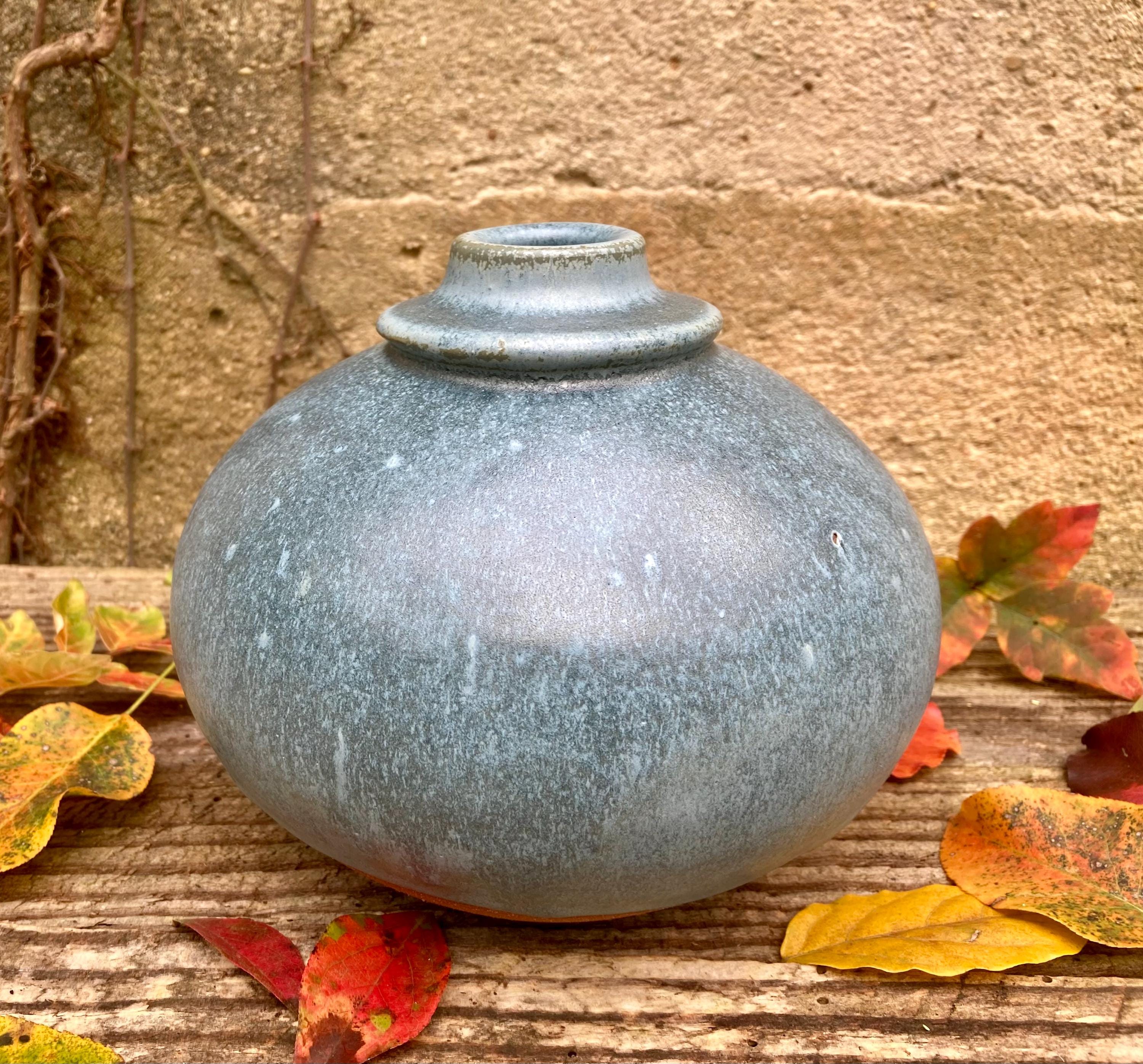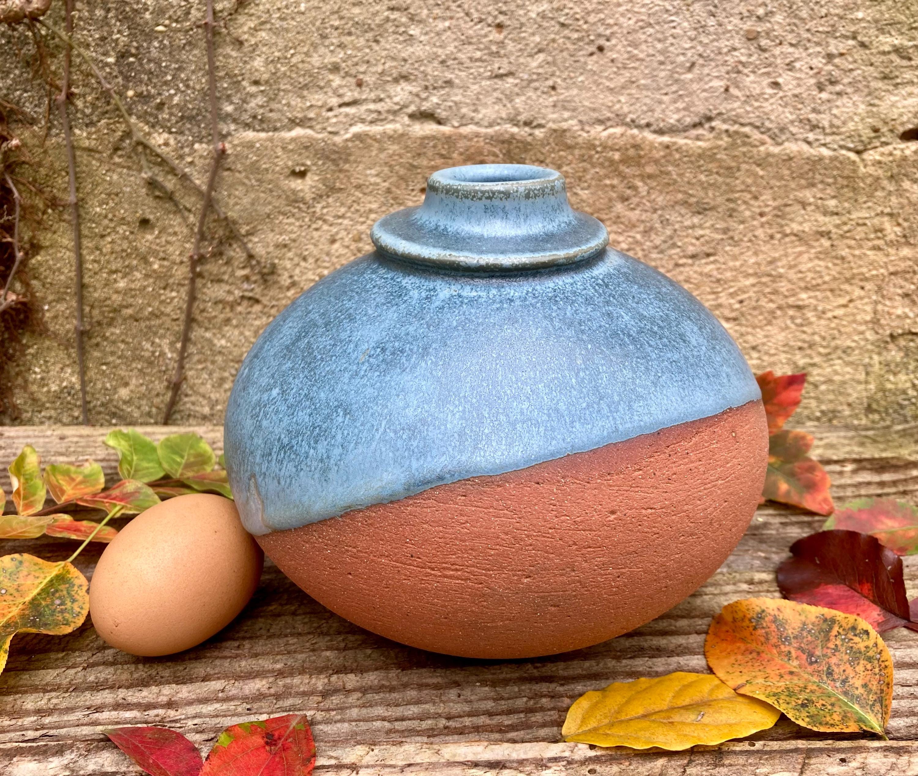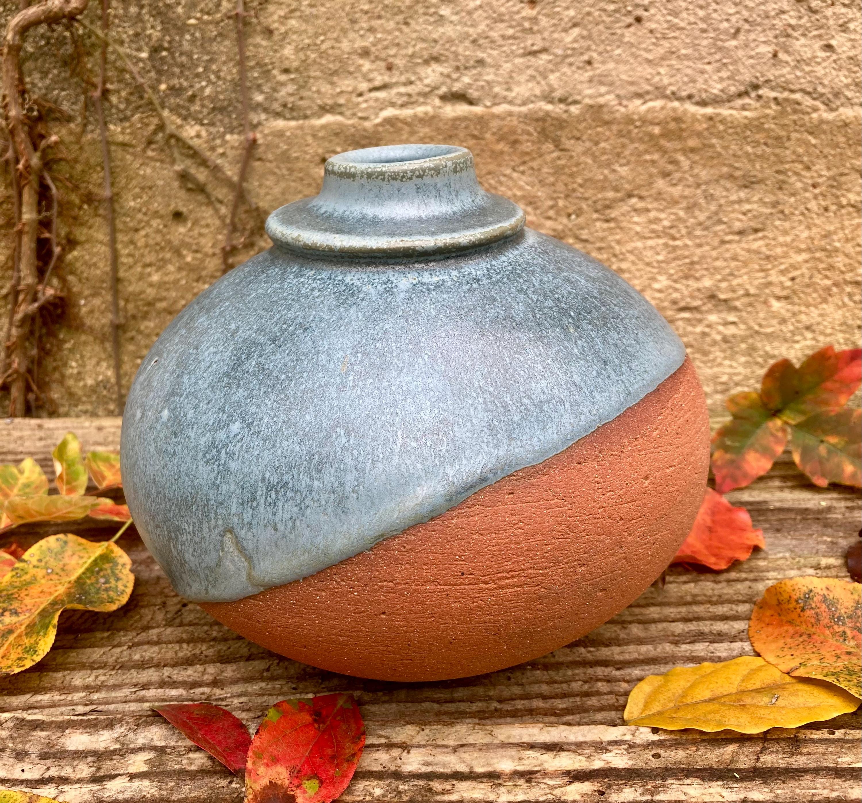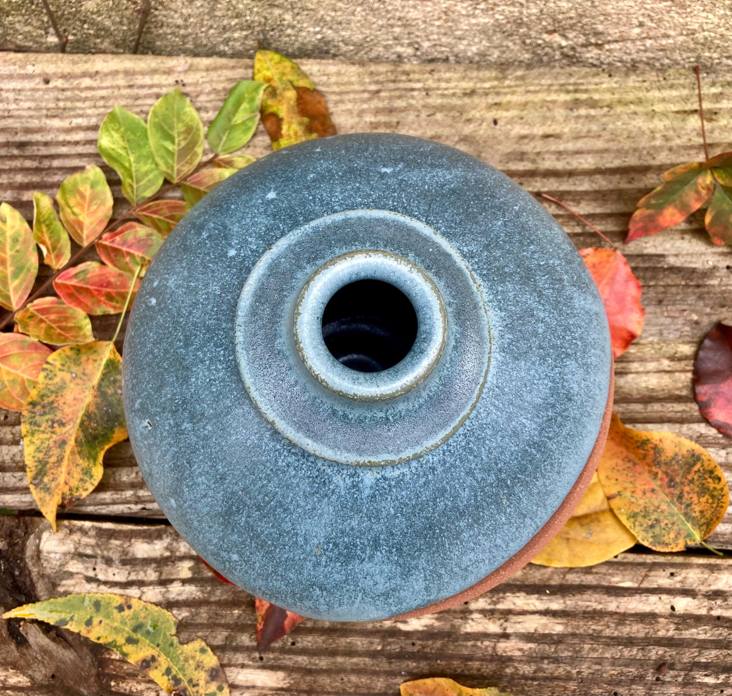 This stoneware vase was wheel-thrown and fired to 2300 degrees for strength and durability. A long heat soak at top temperature gave the glaze time to develop depth and variation. The glazed part contrast nicely with the burnt-red color of the raw clay.