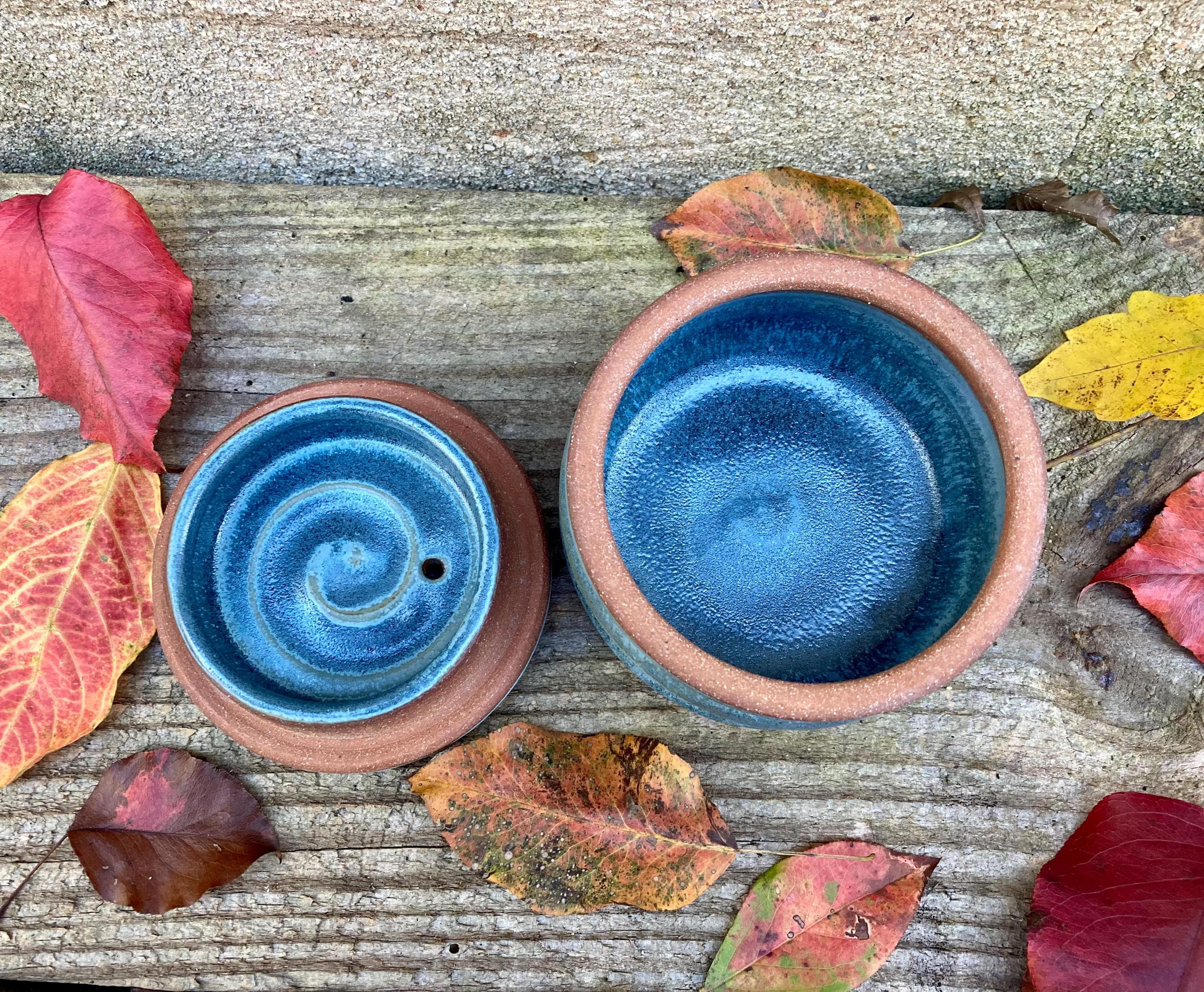 This stoneware egg poacher was wheel-thrown and fired to 2300 degrees for strength and durability. It was slow-cooled to give the glaze time to develop depth and variation.
