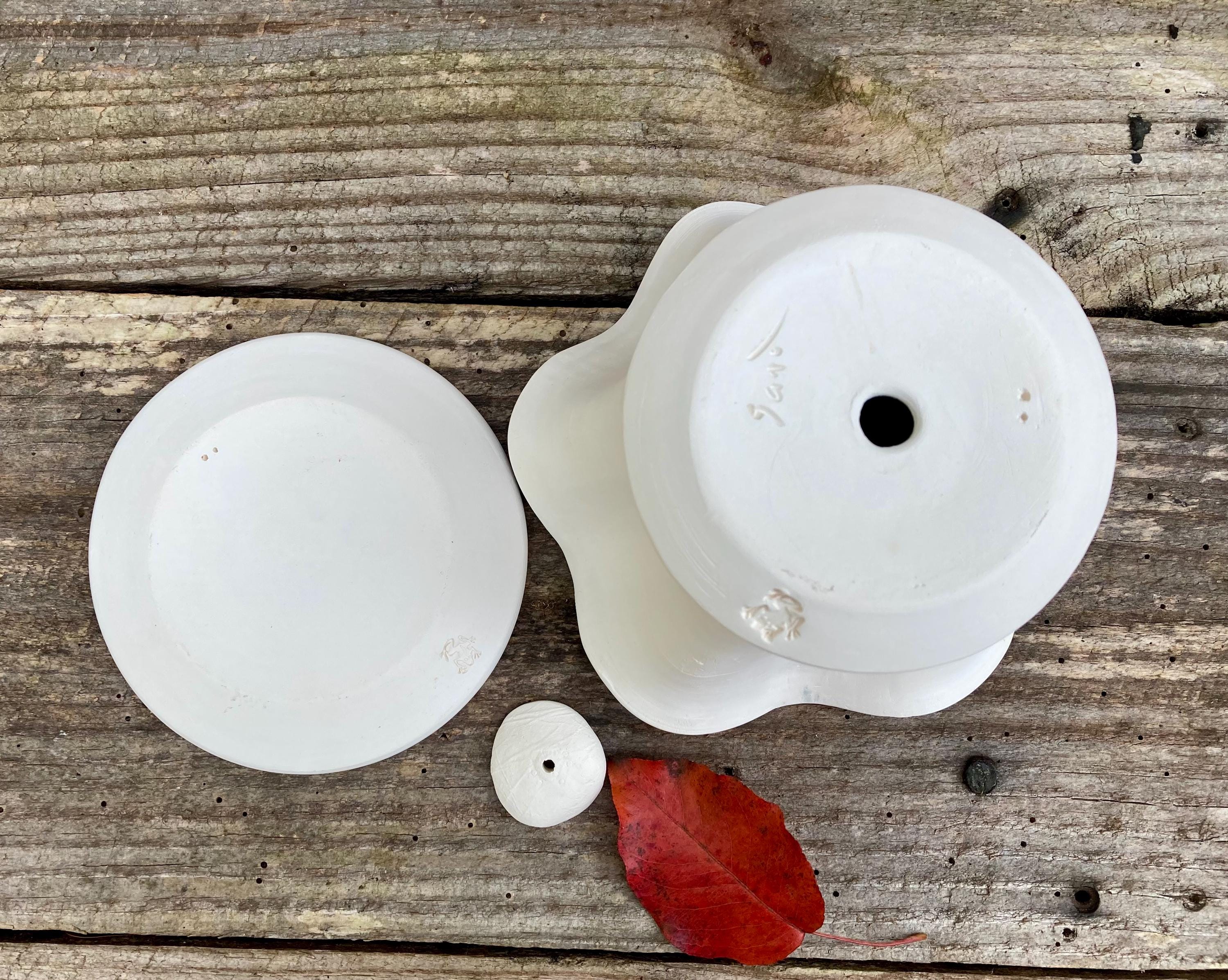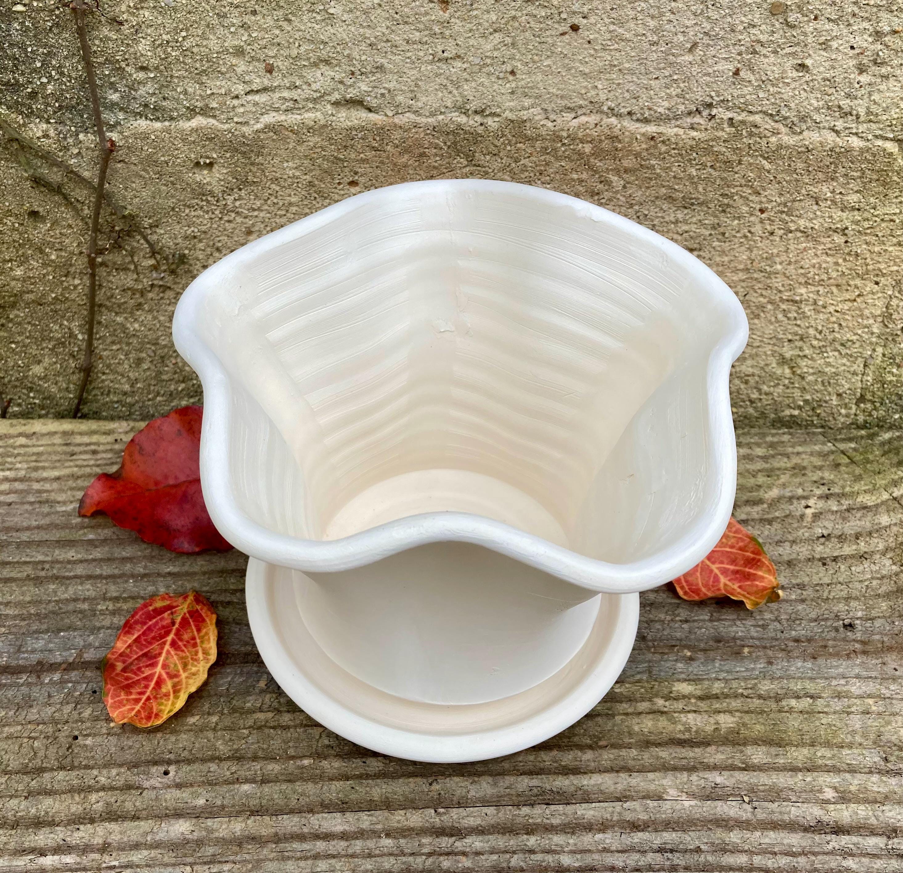 This planter with saucer was made of white earthenware clay. Like terracotta it is porous. This allows air and water to flow through the pot which prevents root rot and soil disease.