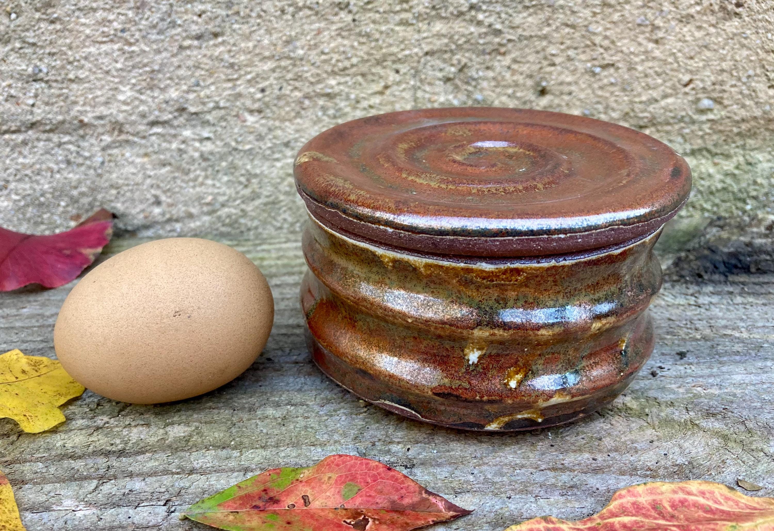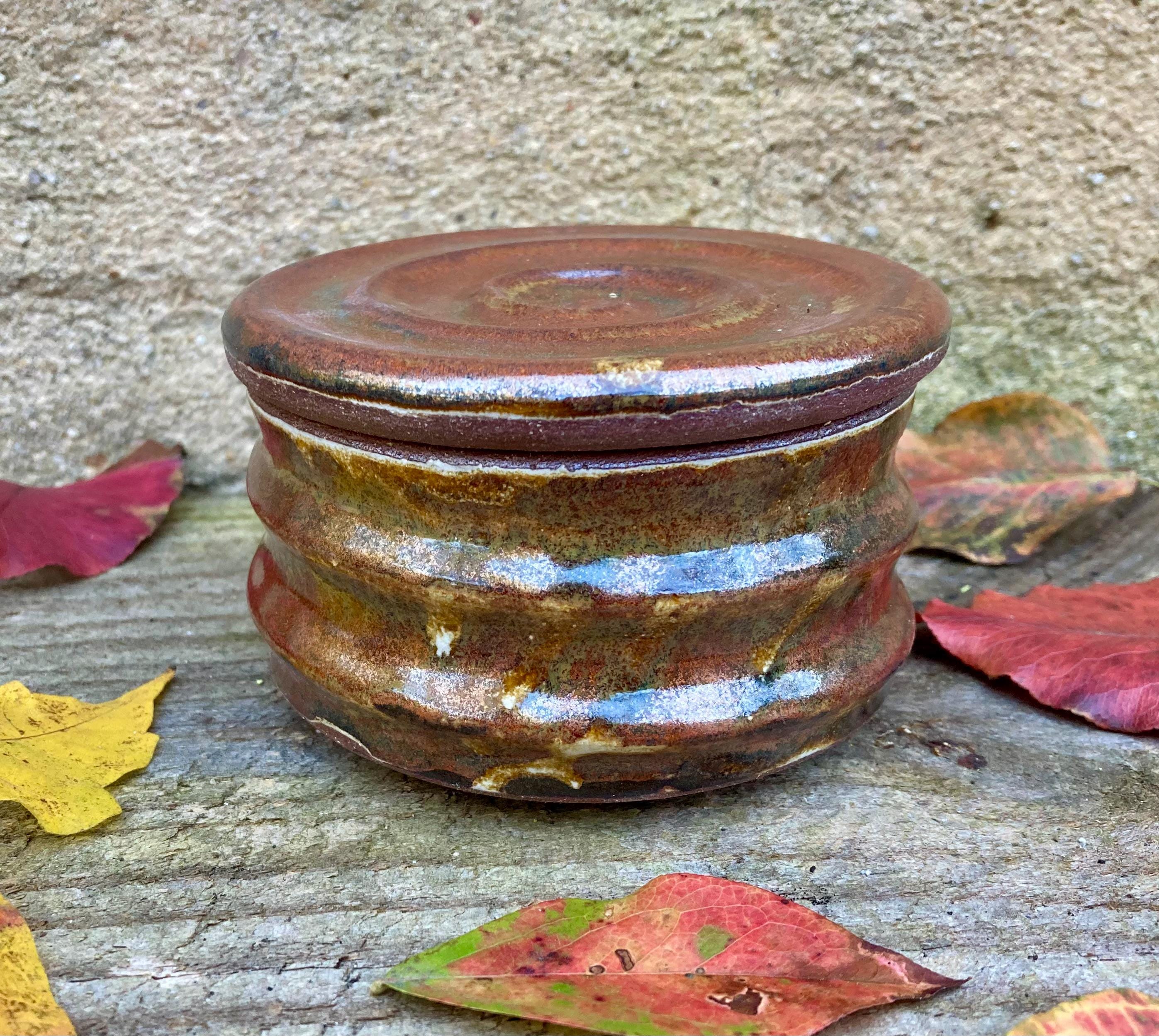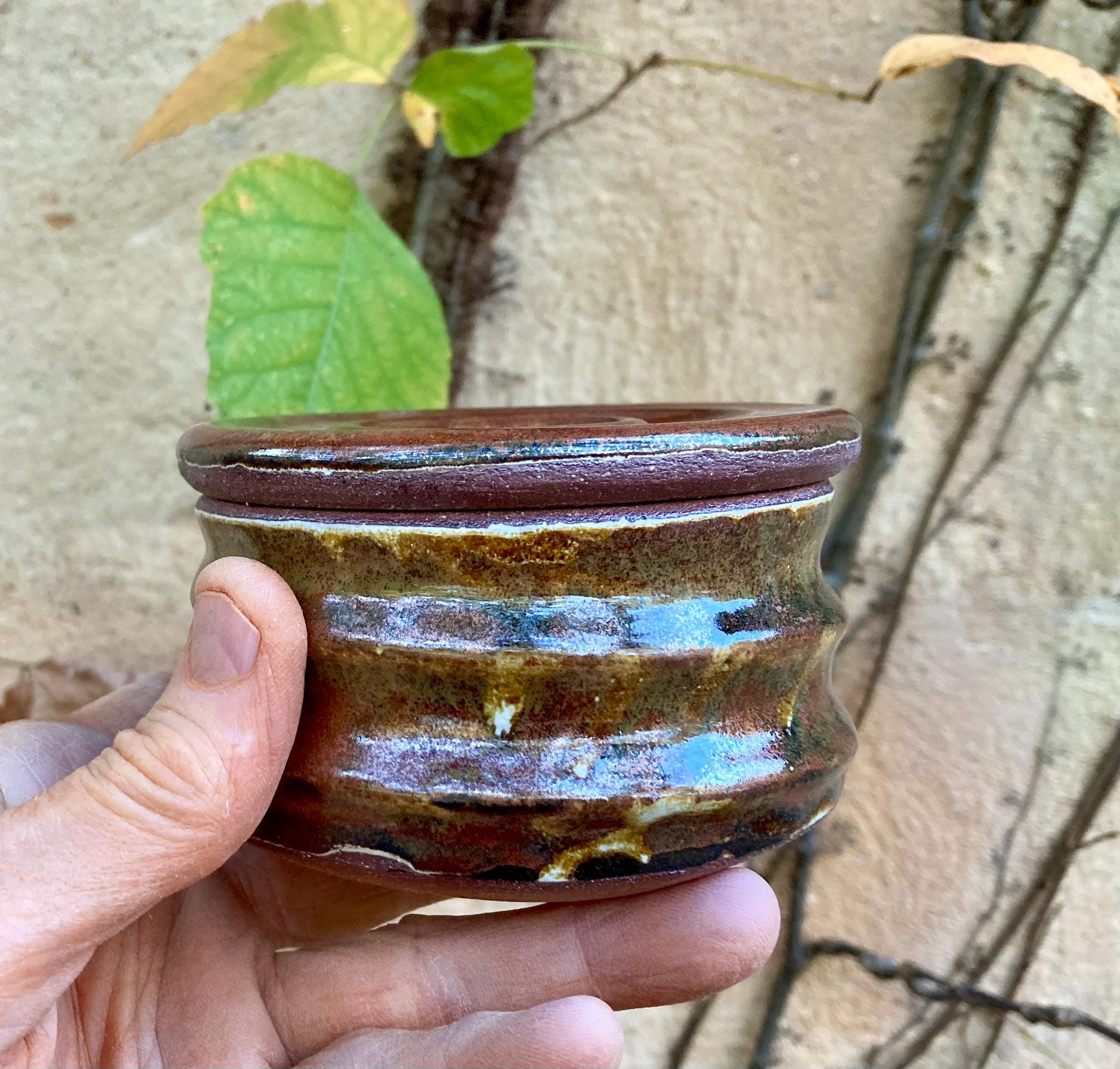 This small, stoneware canister was wheel-thrown and fired to 2300 degrees for strength and durability. It was slow-cooled to give the glaze time to develop depth and variation.