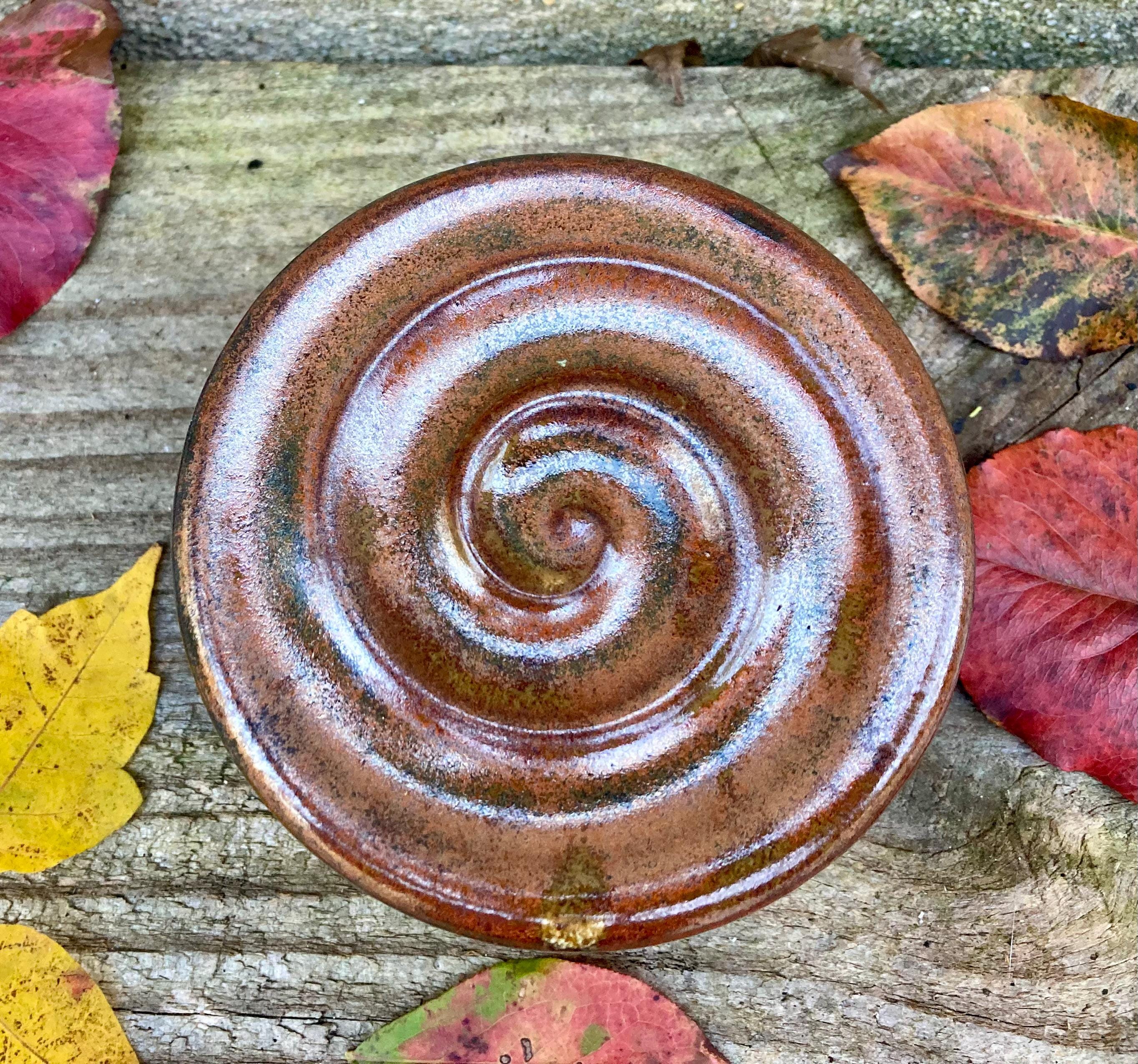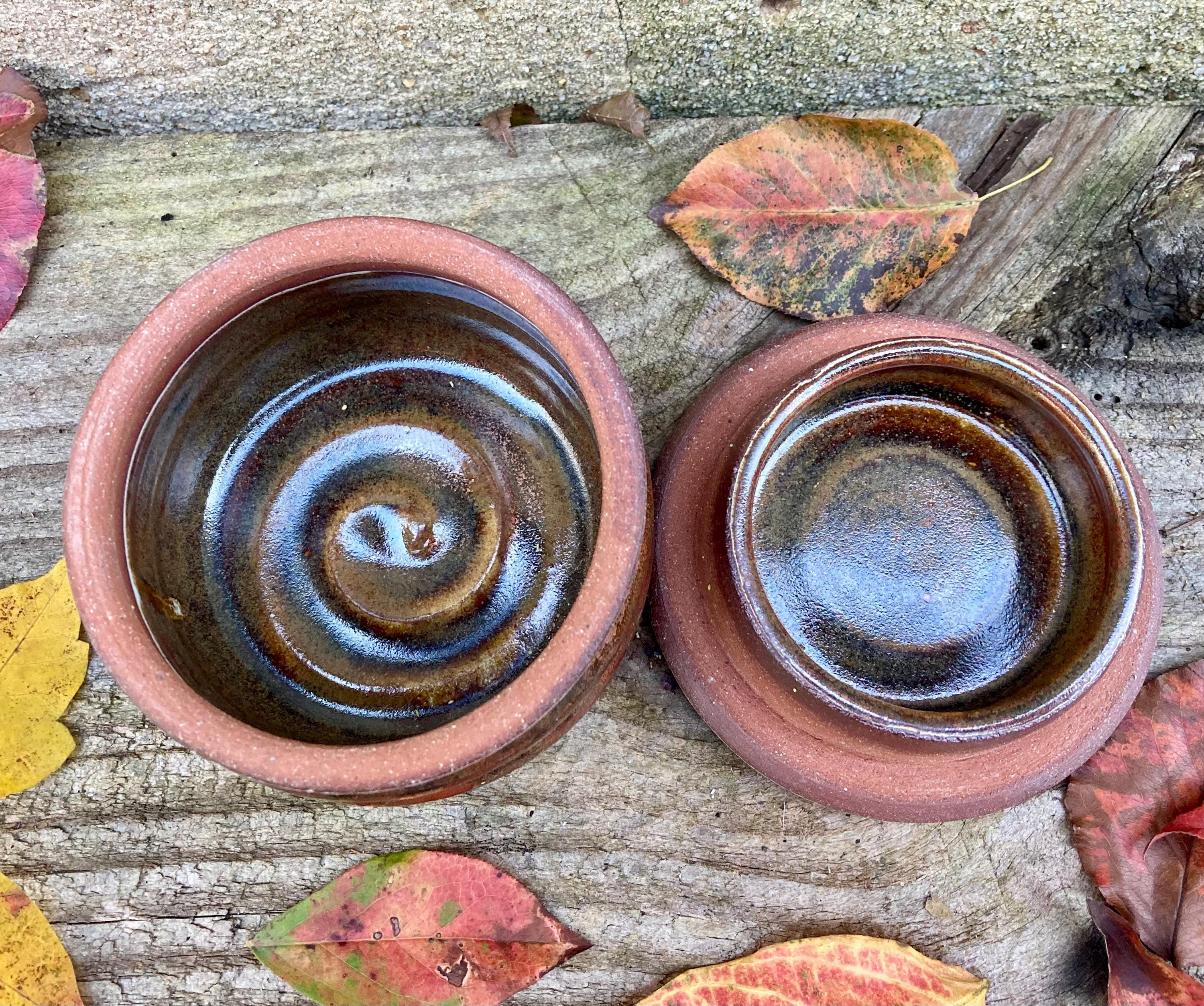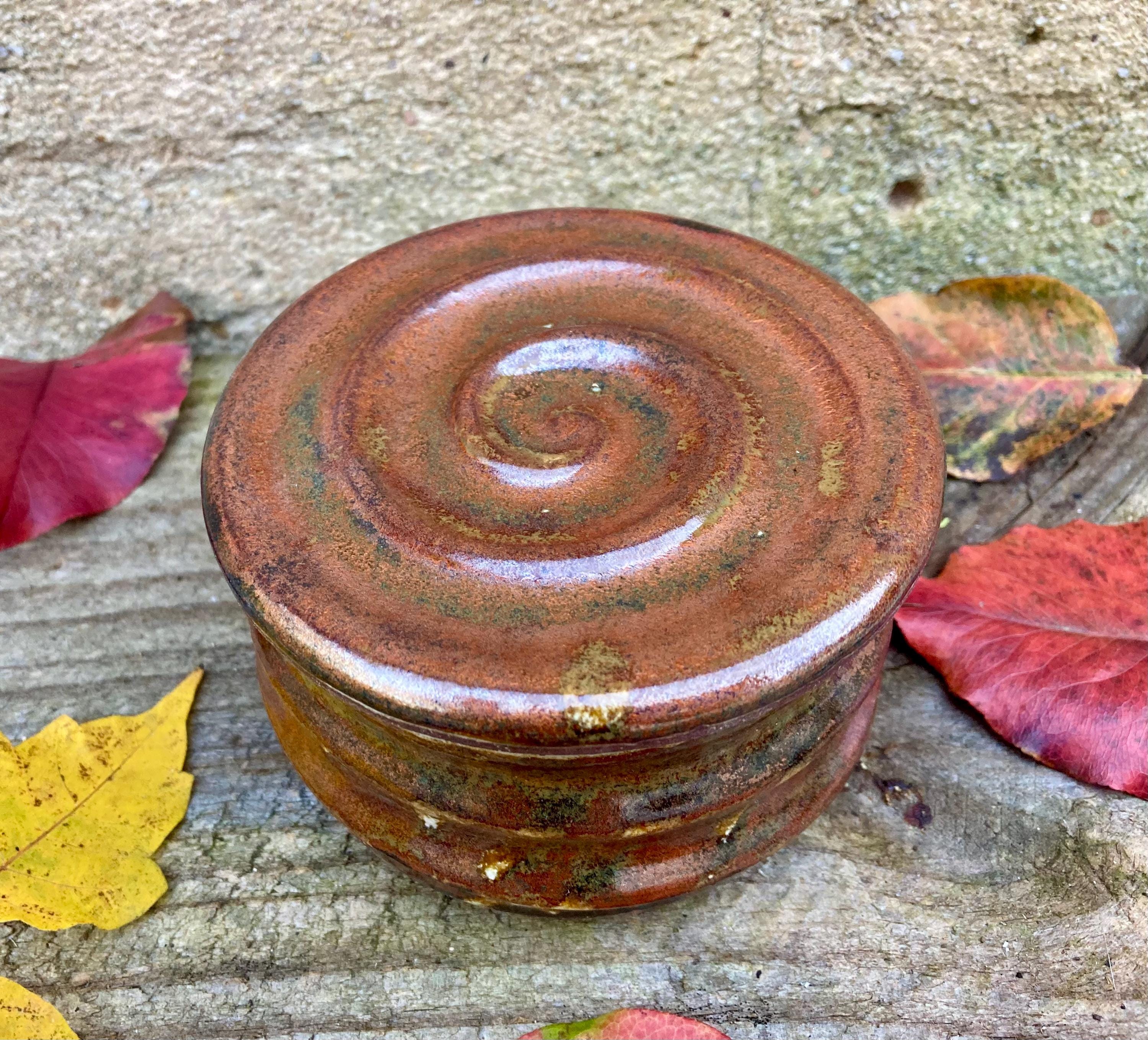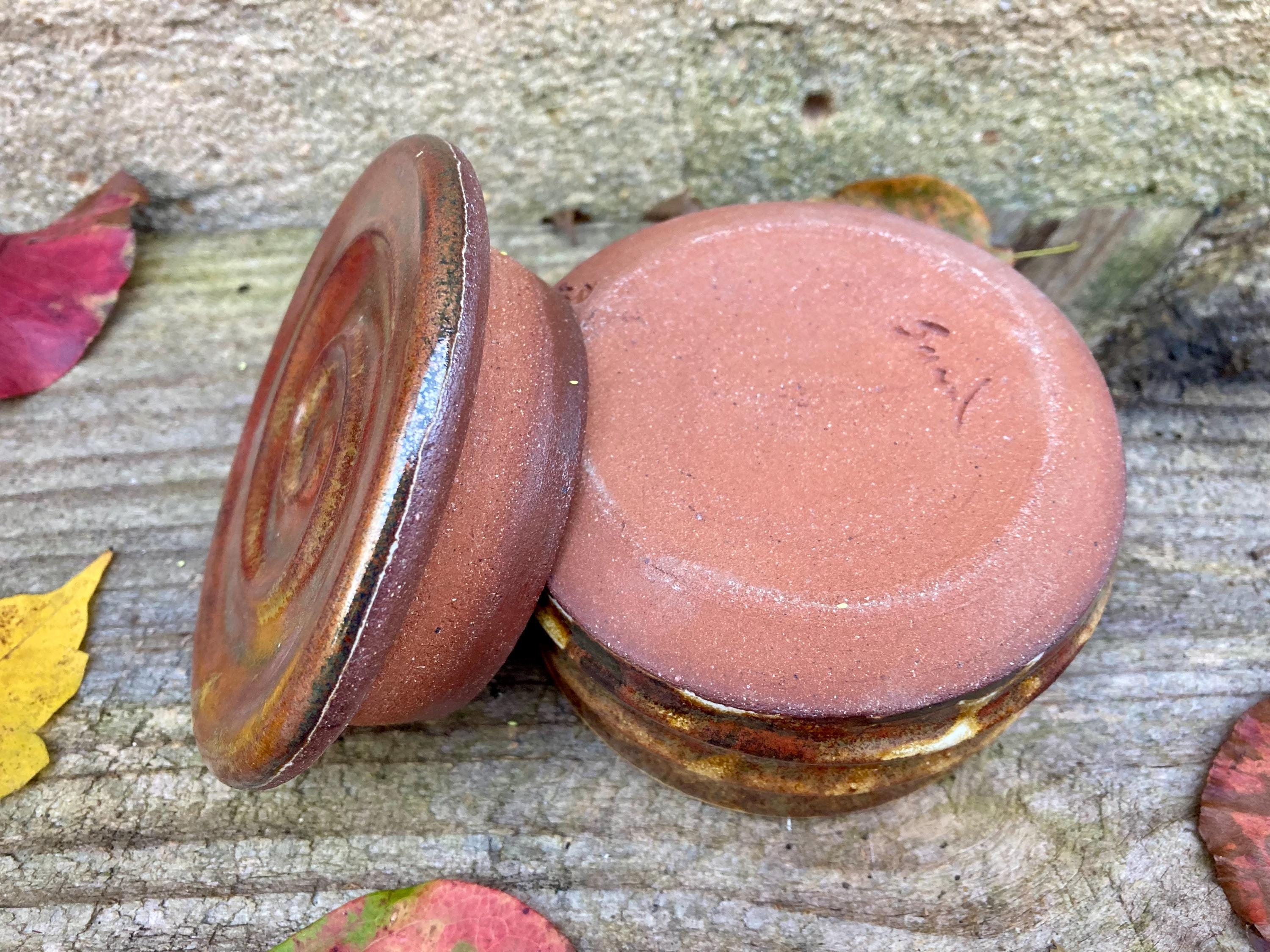 This small, stoneware canister was wheel-thrown and fired to 2300 degrees for strength and durability. It was slow-cooled to give the glaze time to develop depth and variation.