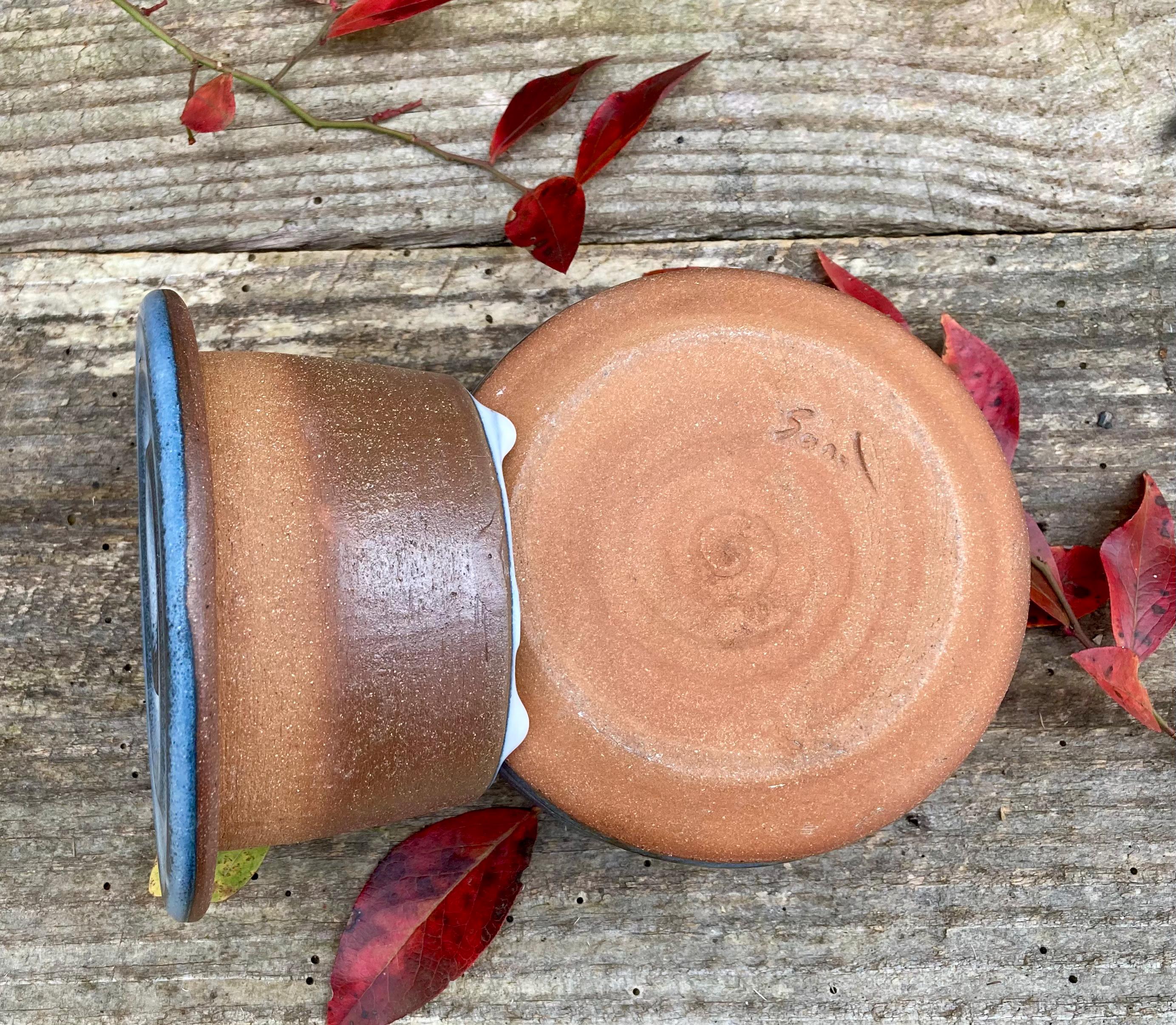 This stoneware butter keeper was wheel-thrown and fired to 2300 degrees for strength and durability. It was slow cooled to give the glazes time to run, pool, merge and form interesting patterns. Note the nice "drips" on the part that holds the butter.