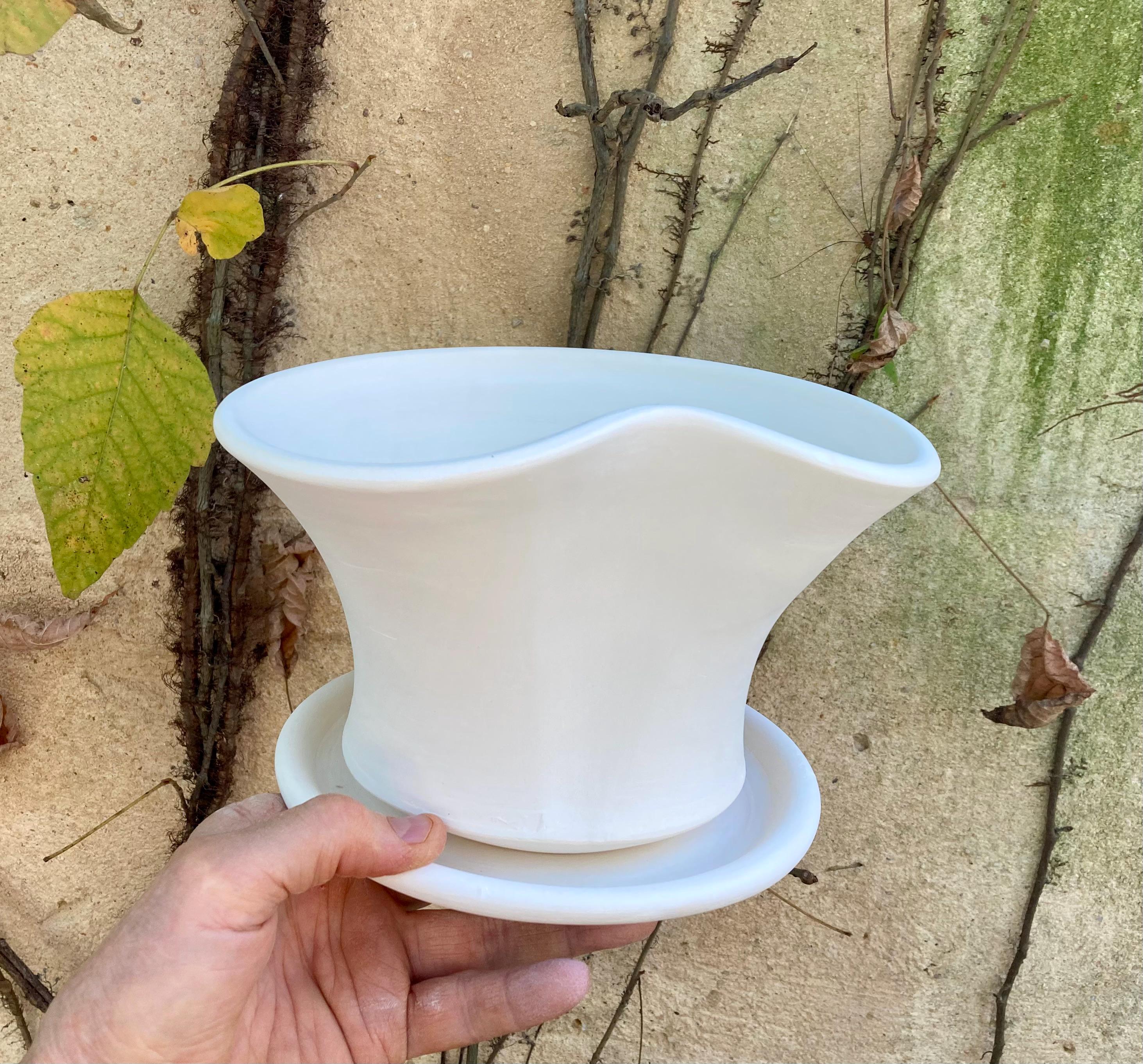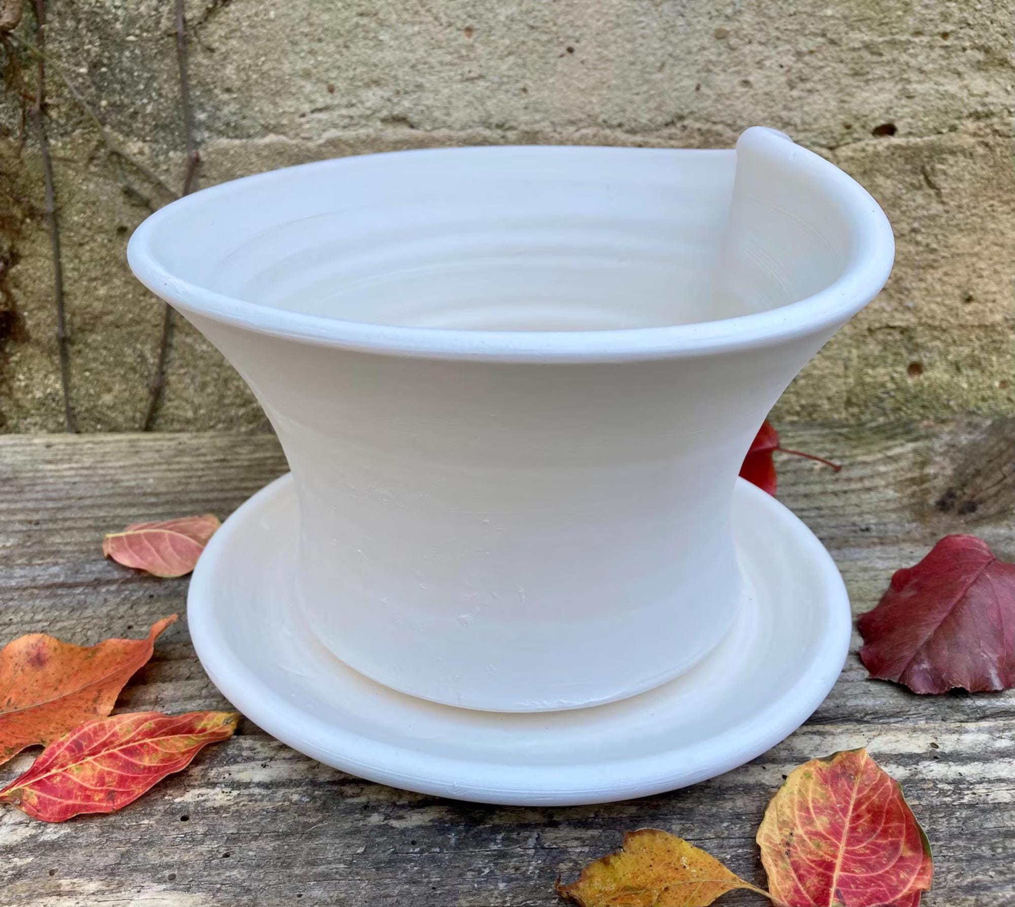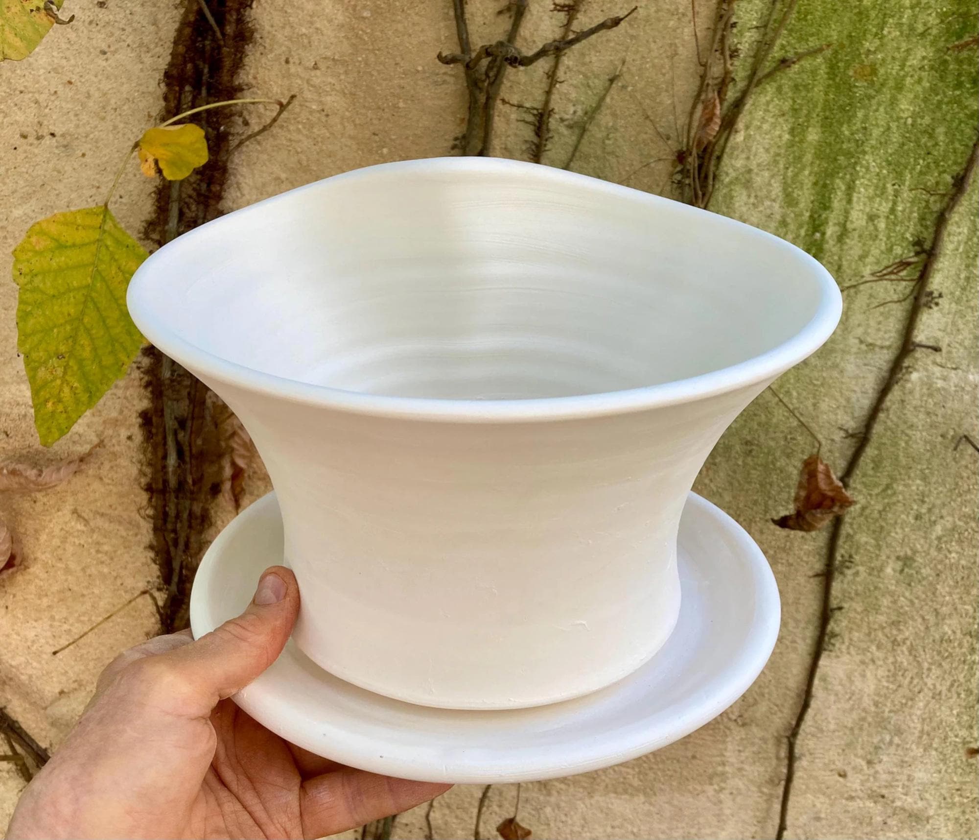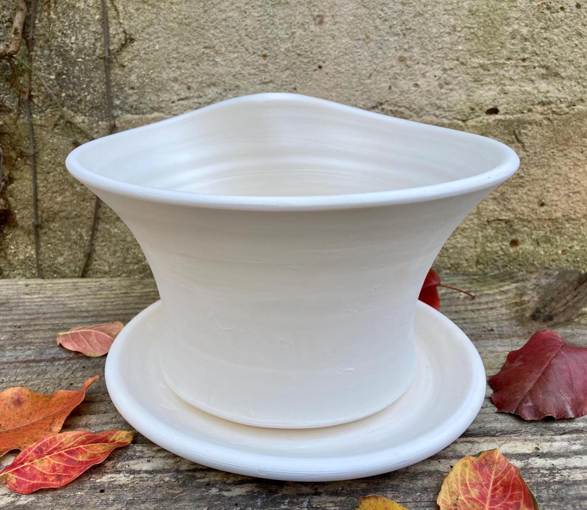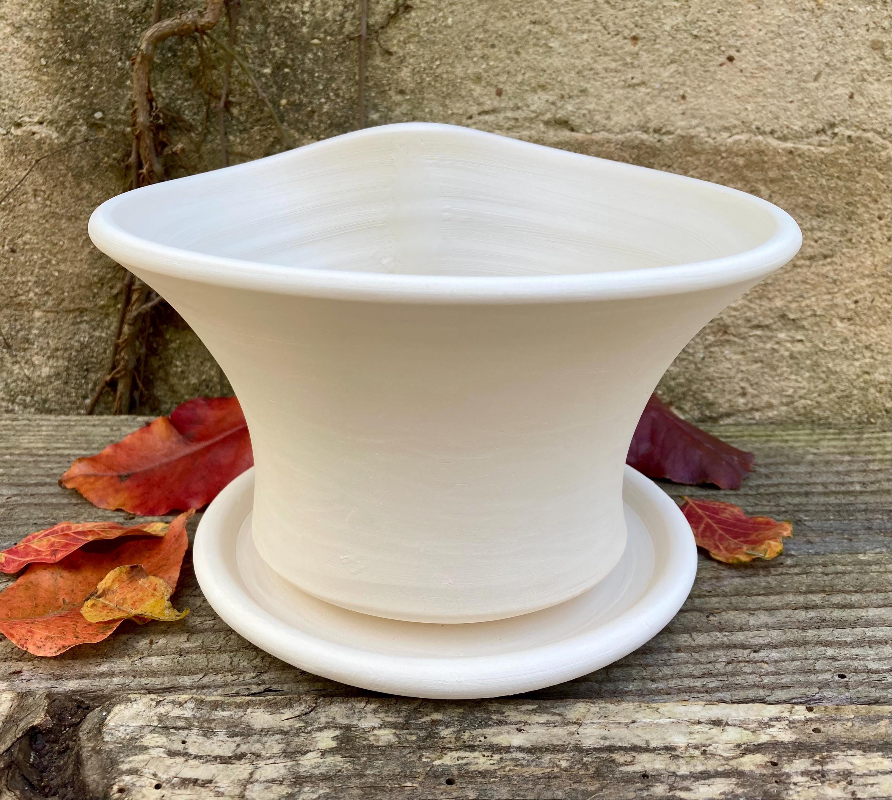 This planter with saucer was made of white earthenware clay. Like terracotta it is porous. This allows air and water to flow through the pot which prevents root rot and soil disease.