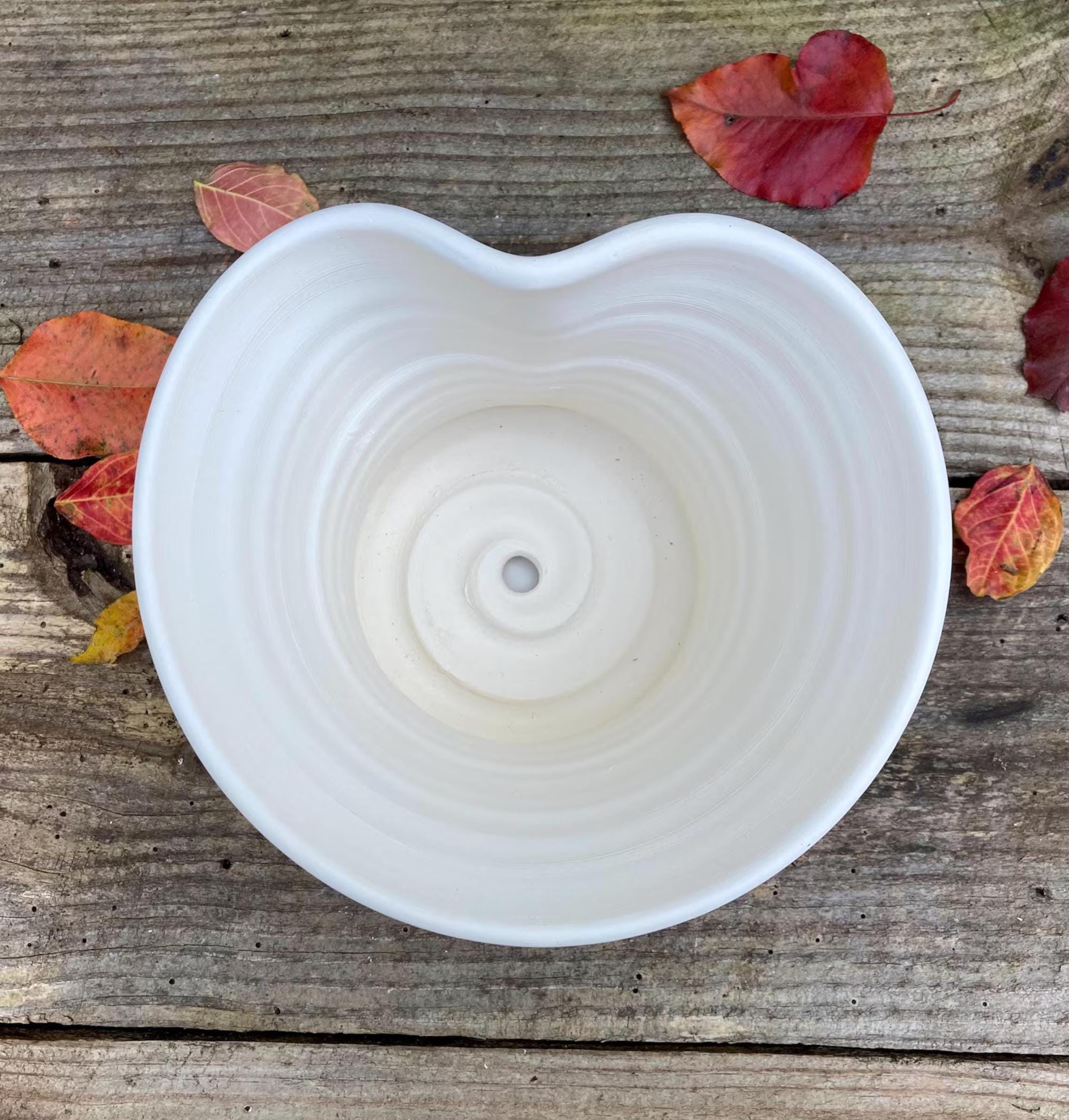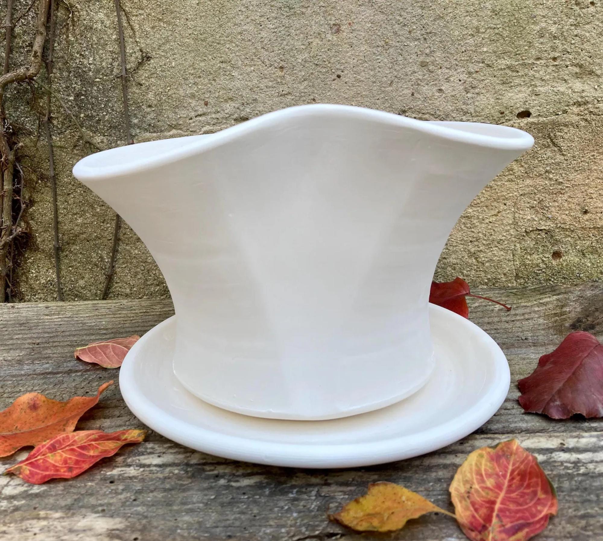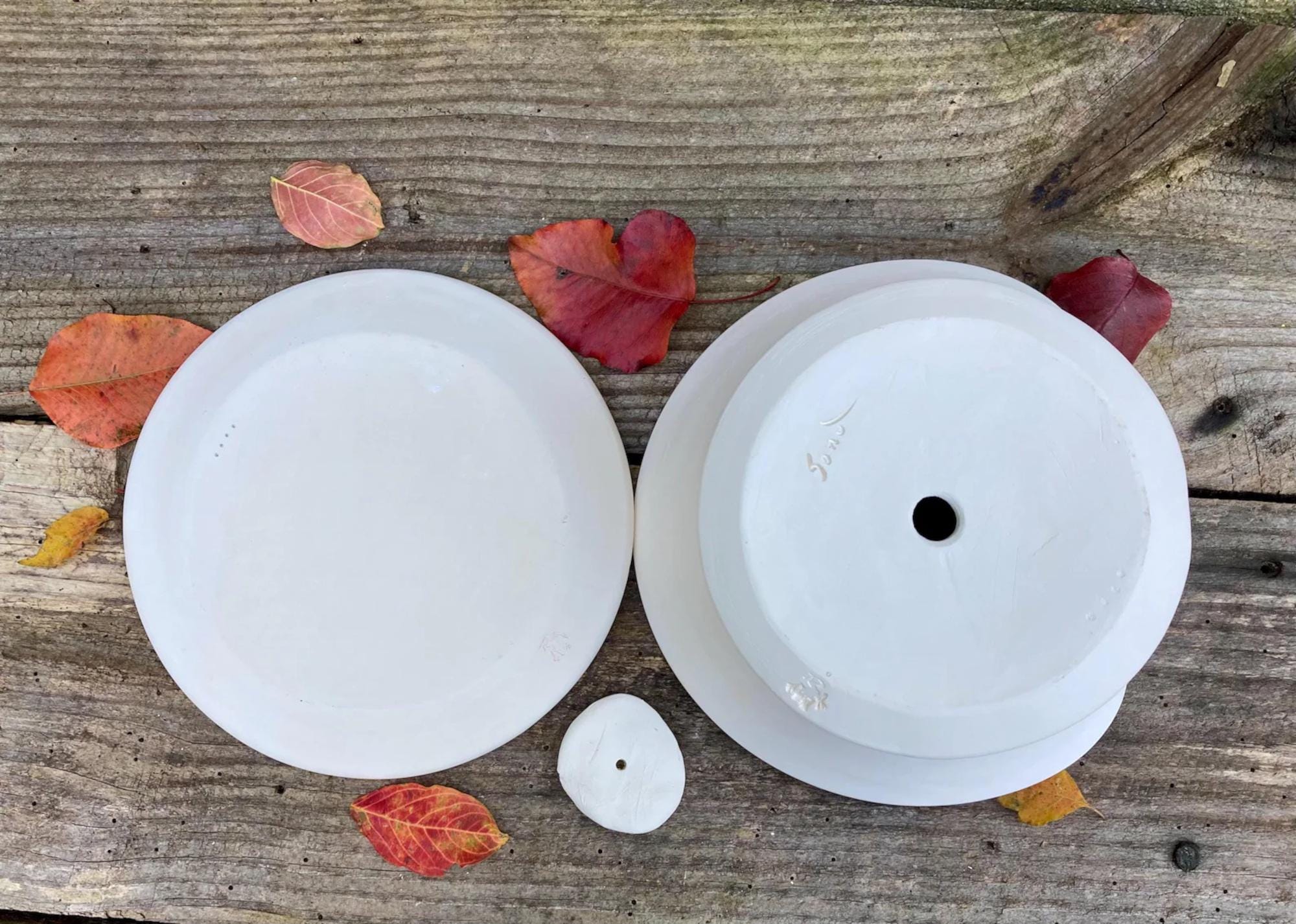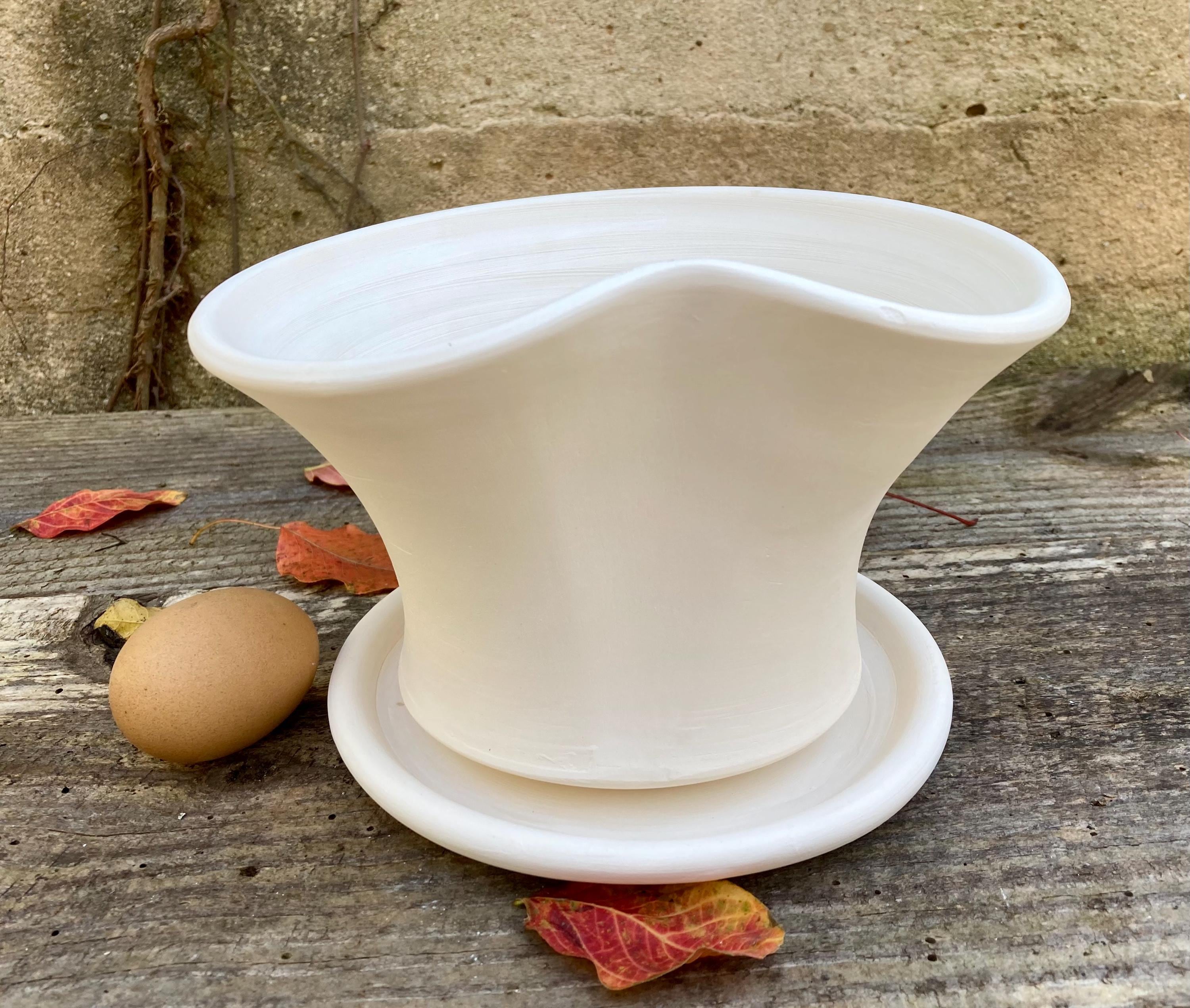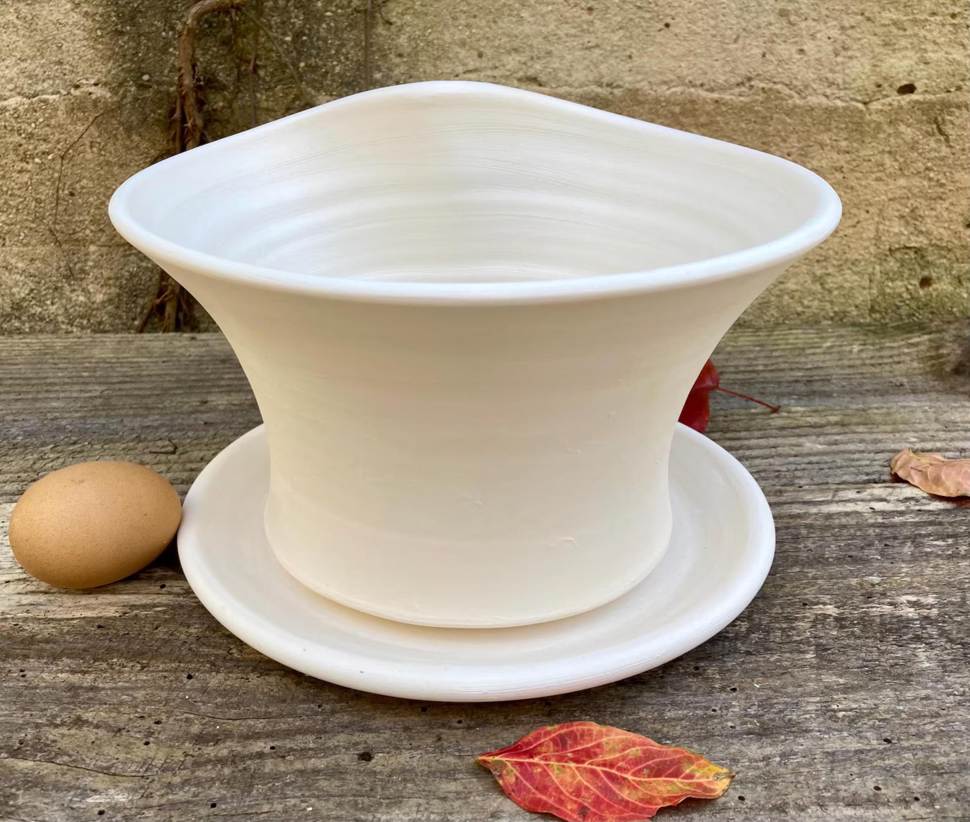 This planter with saucer was made of white earthenware clay. Like terracotta it is porous. This allows air and water to flow through the pot which prevents root rot and soil disease.