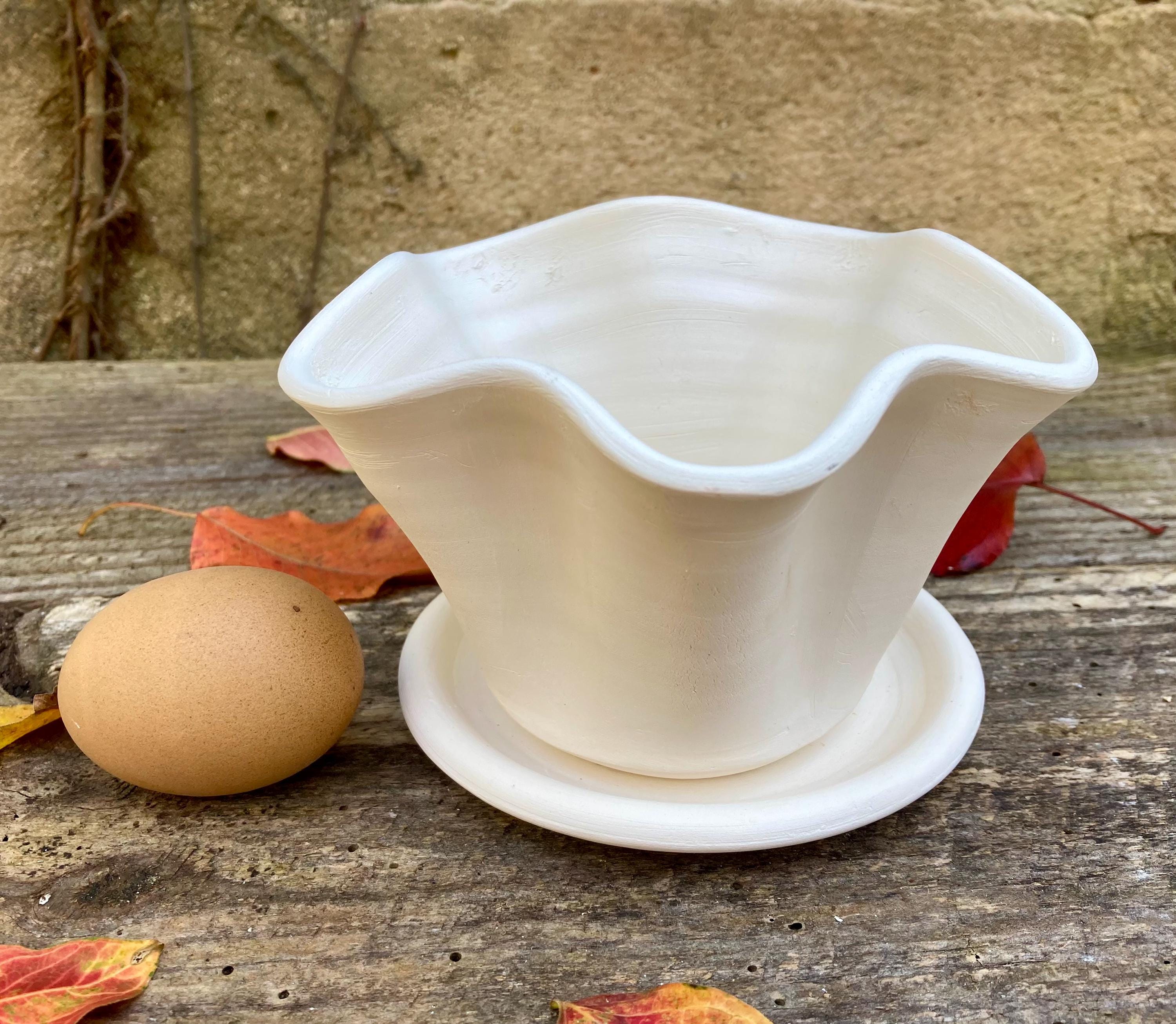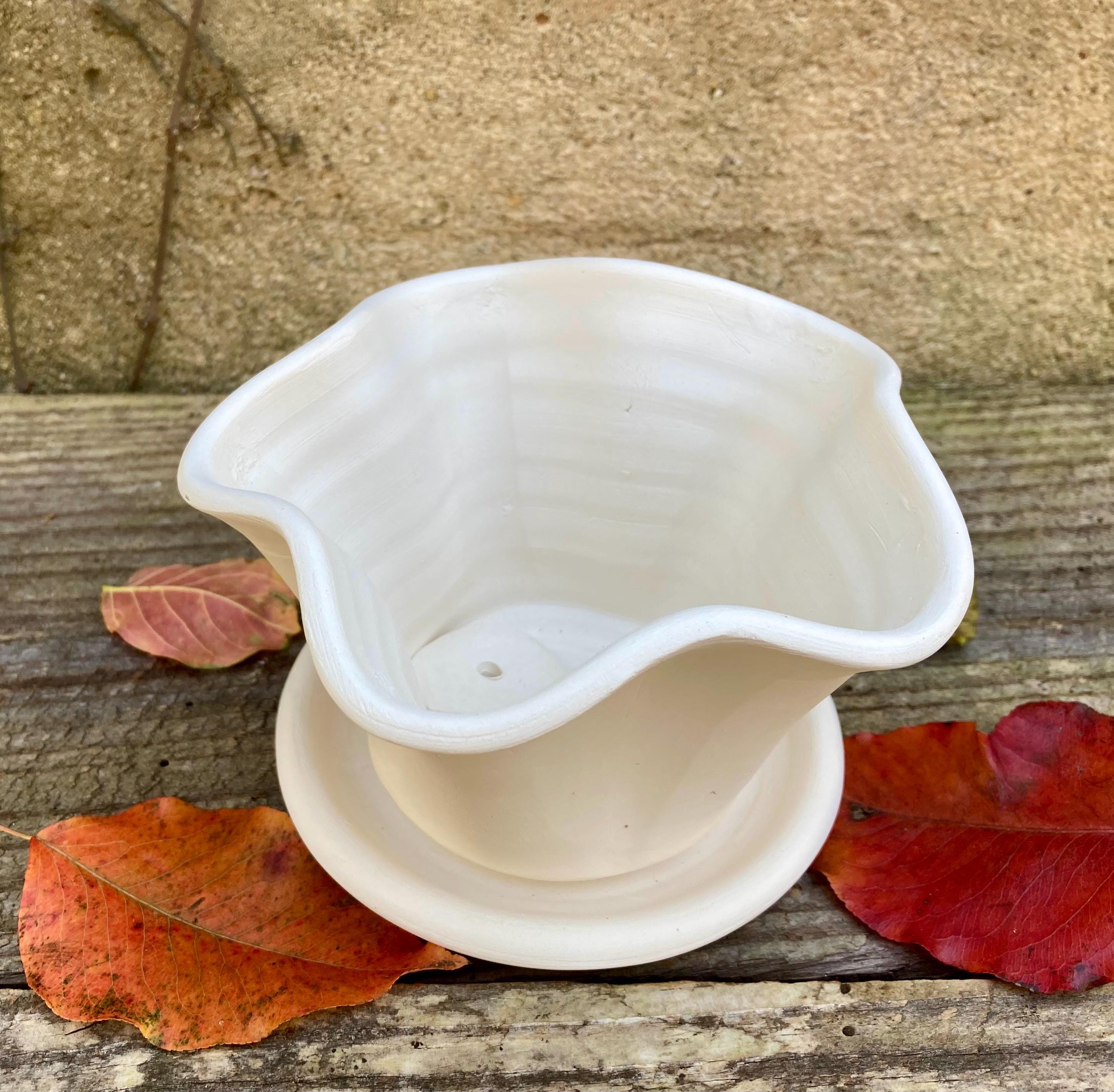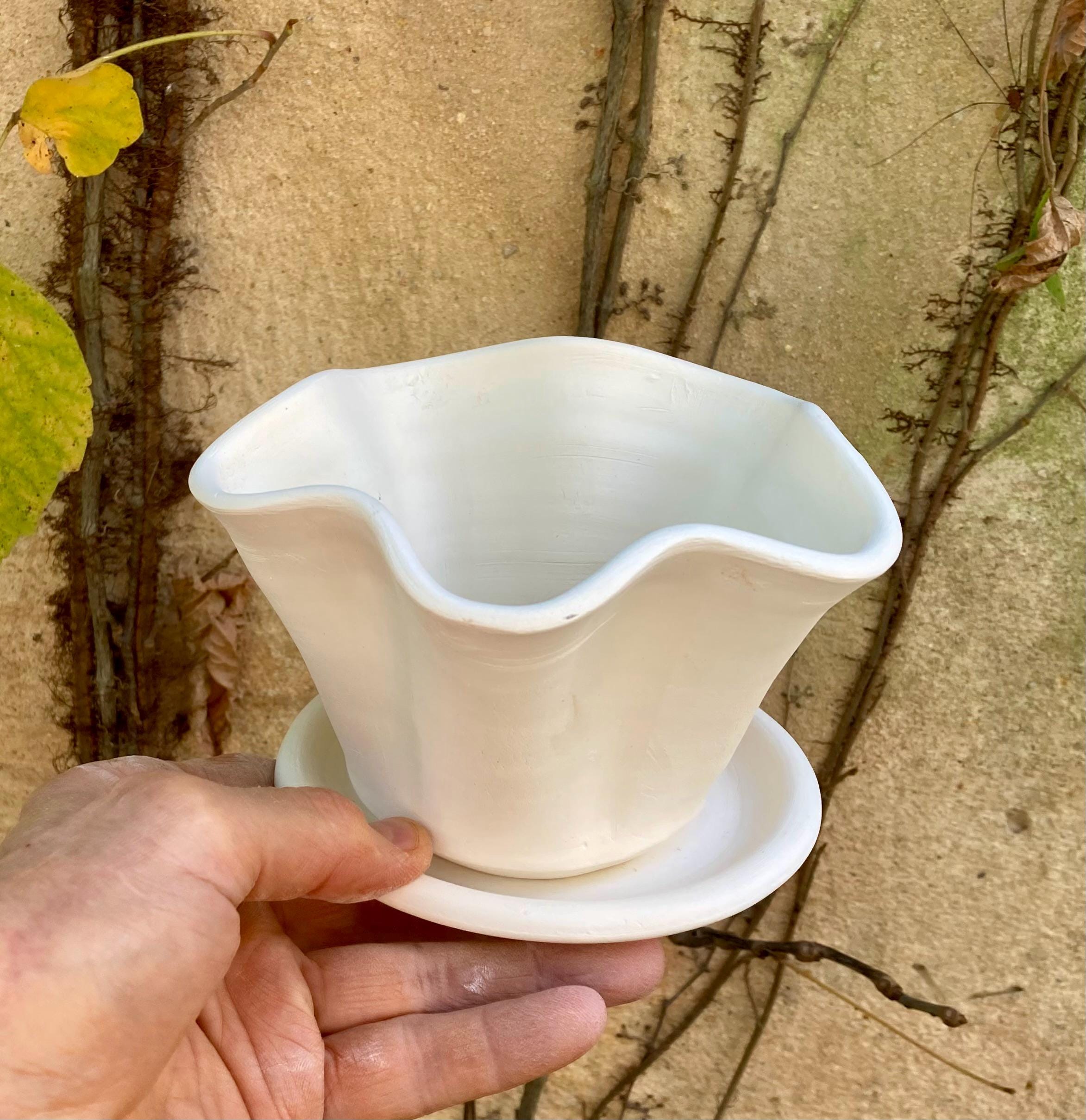 This small planter with saucer was made of white earthenware clay. Like terracotta it is porous. This allows air and water to flow through the pot which prevents root rot and soil disease.
