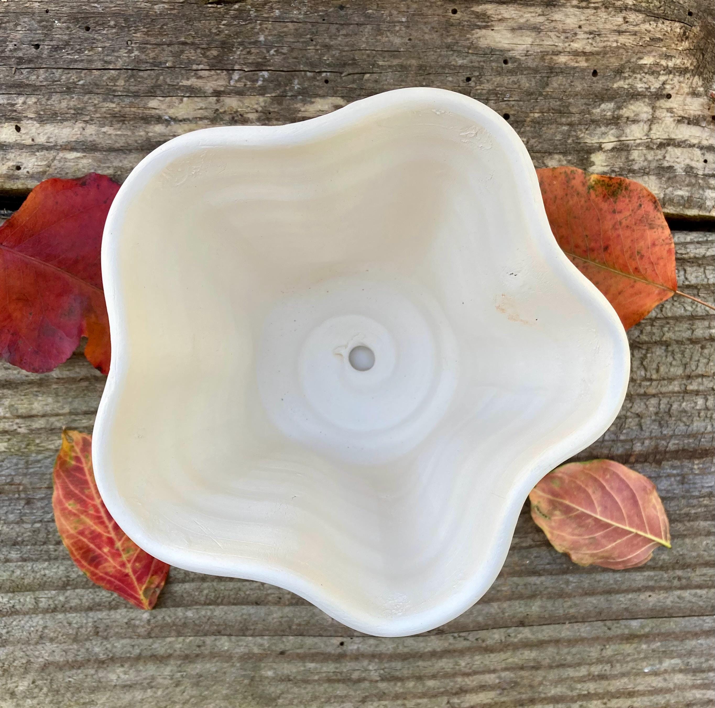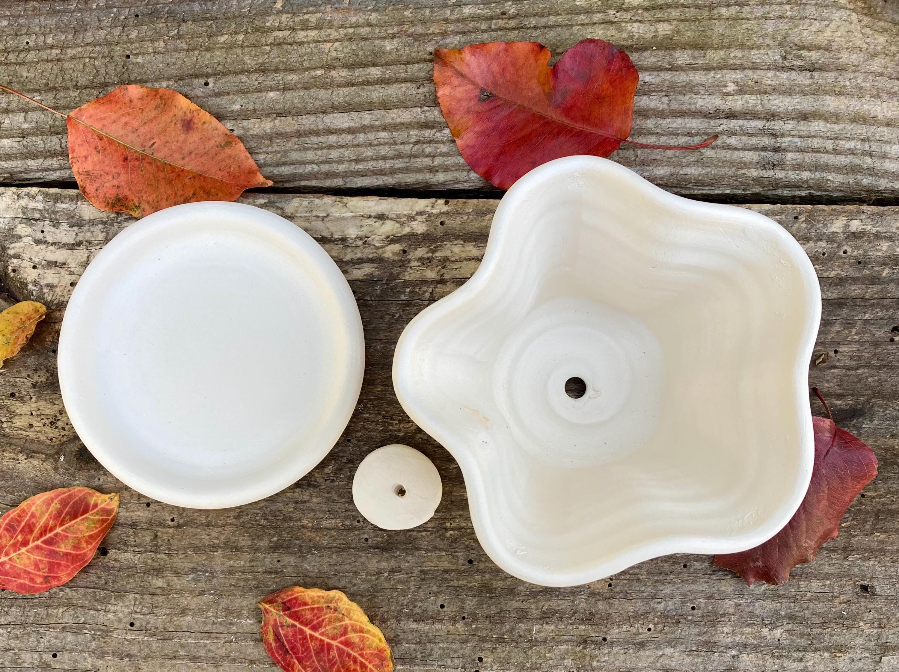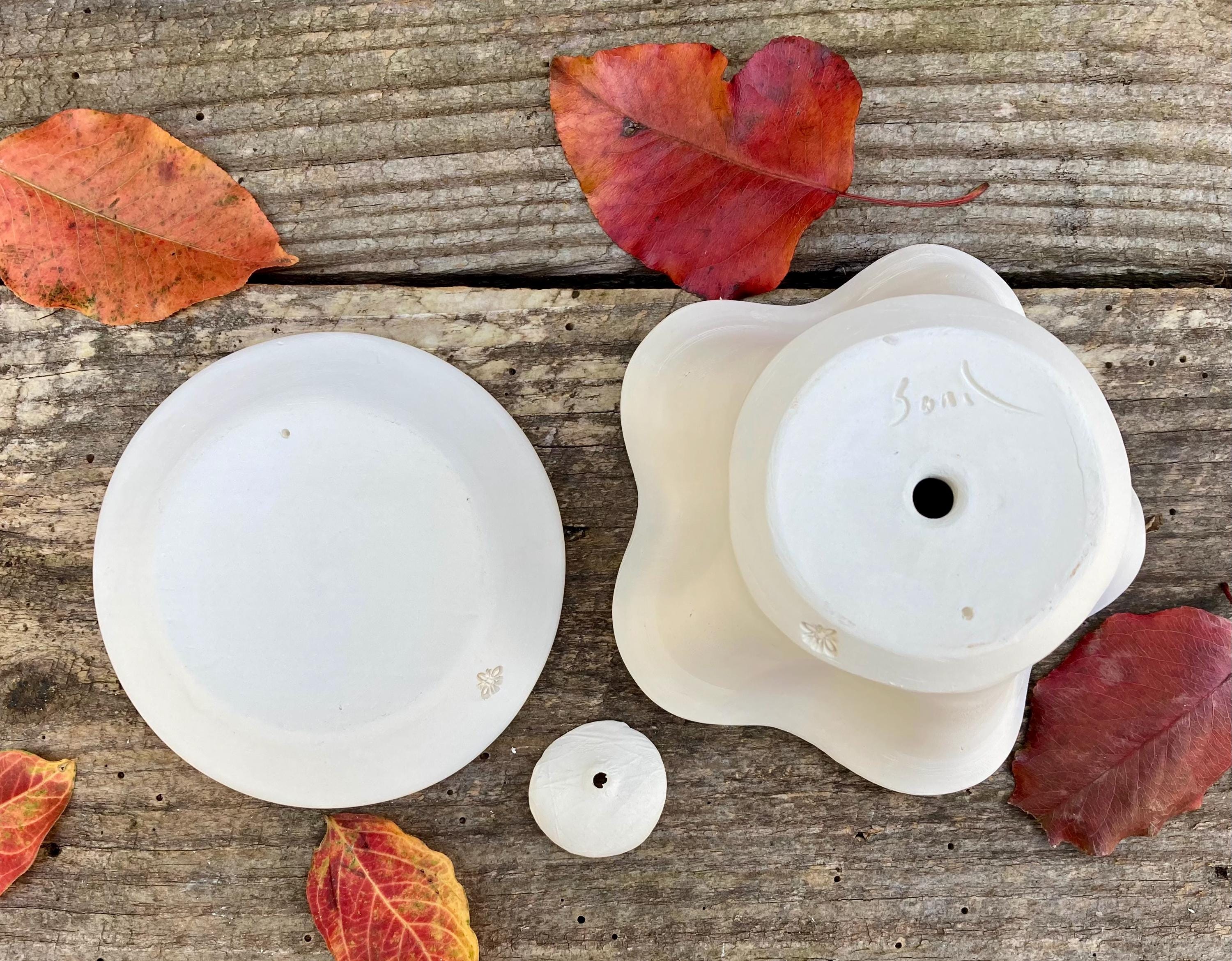 This small planter with saucer was made of white earthenware clay. Like terracotta it is porous. This allows air and water to flow through the pot which prevents root rot and soil disease.