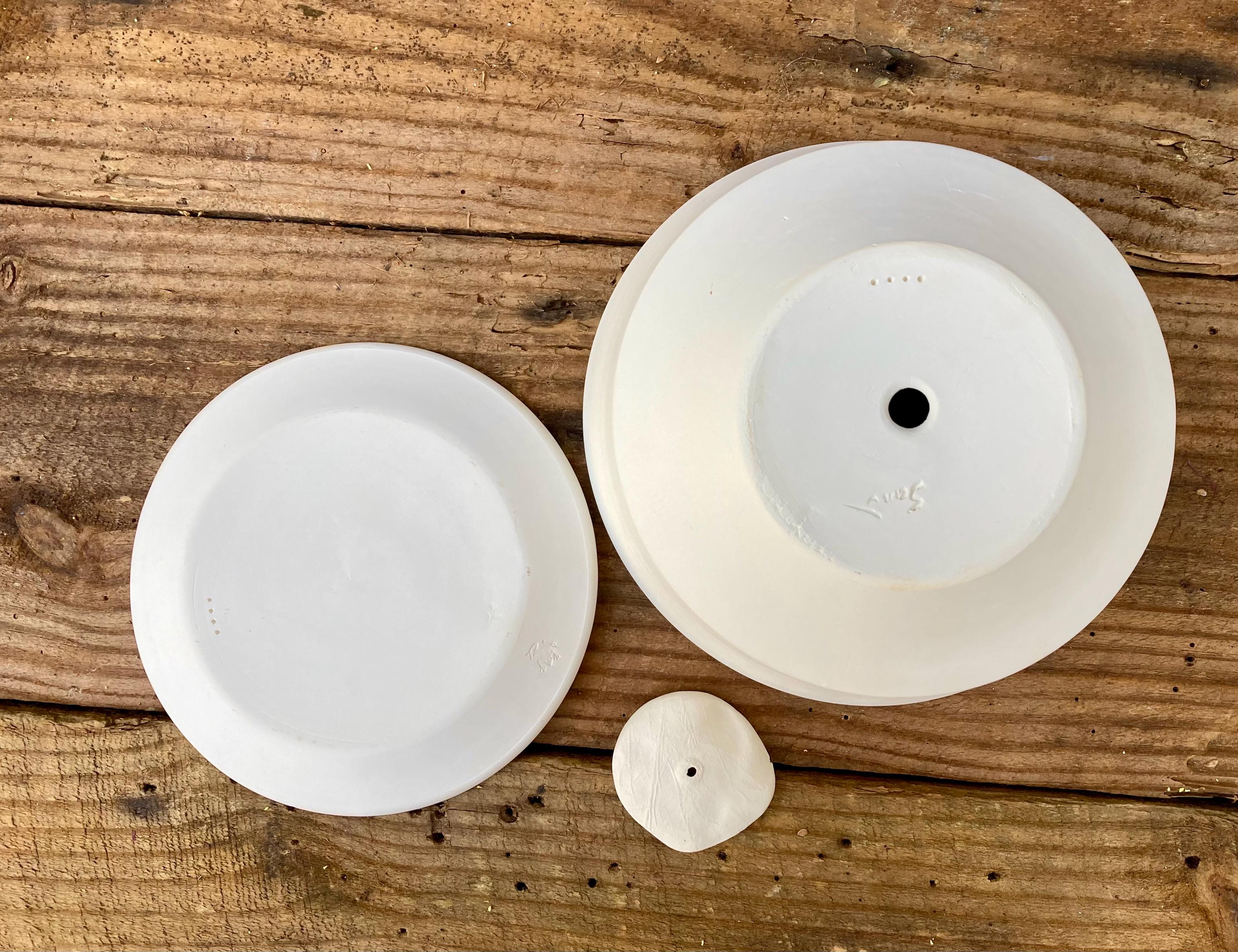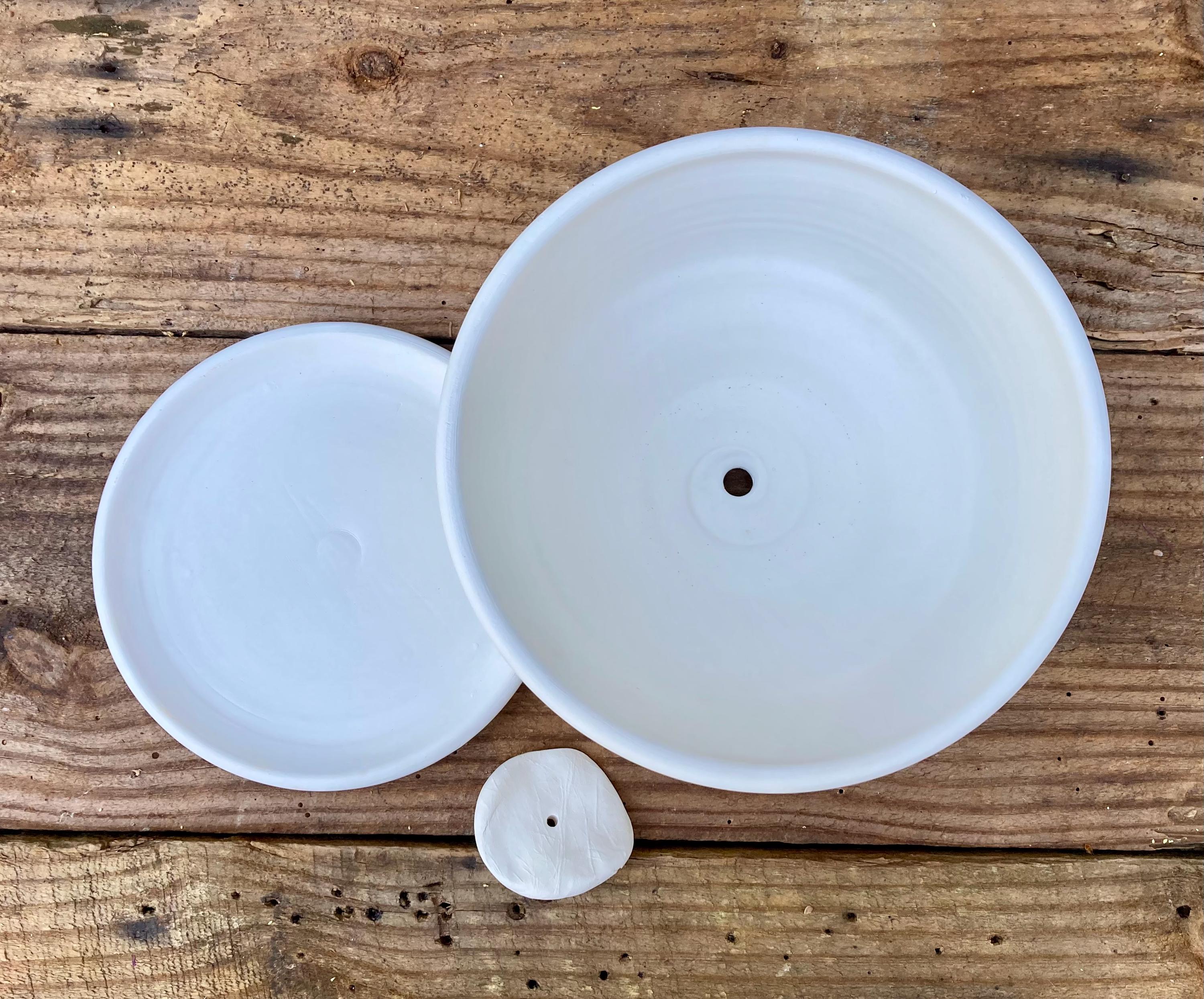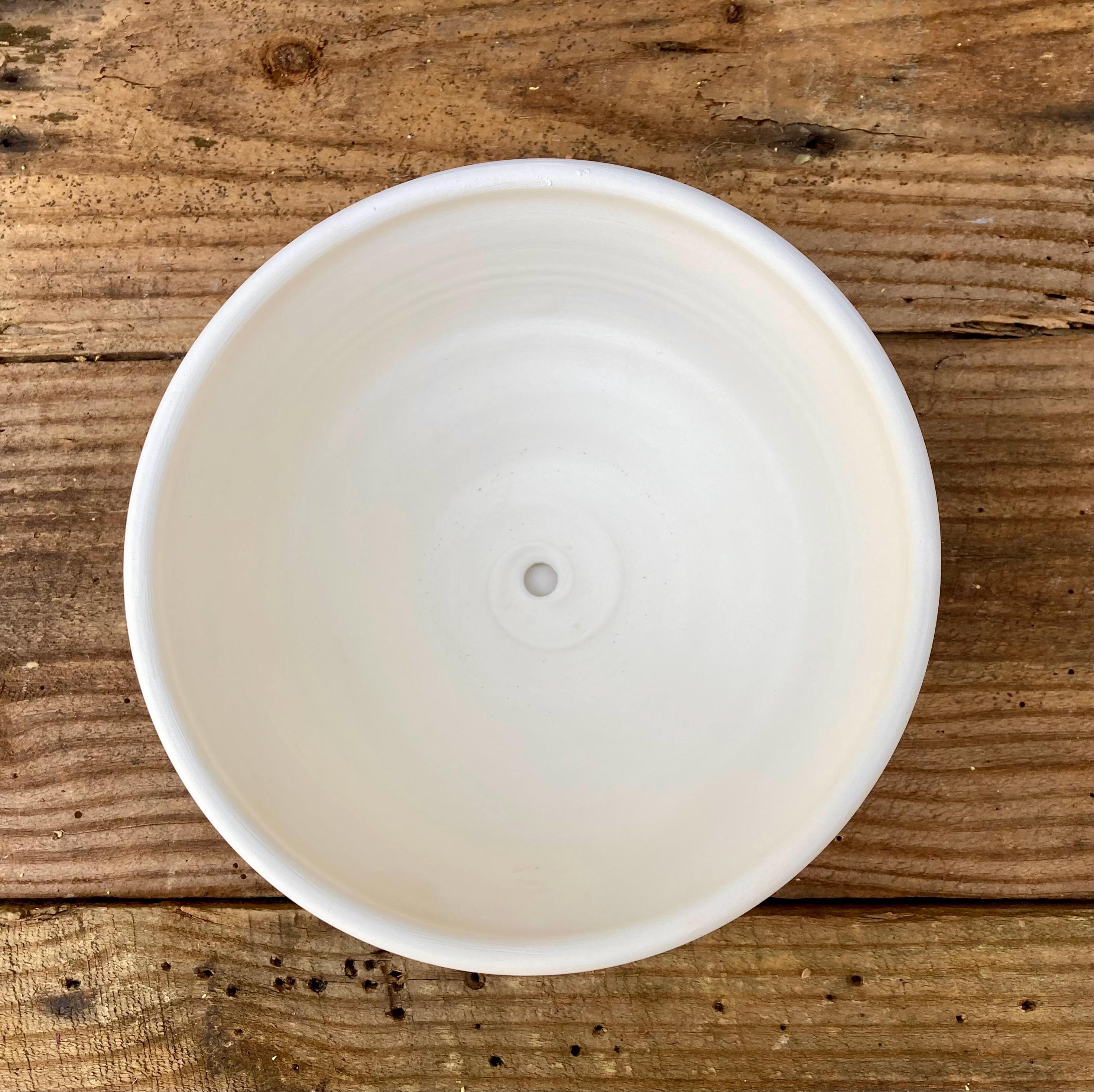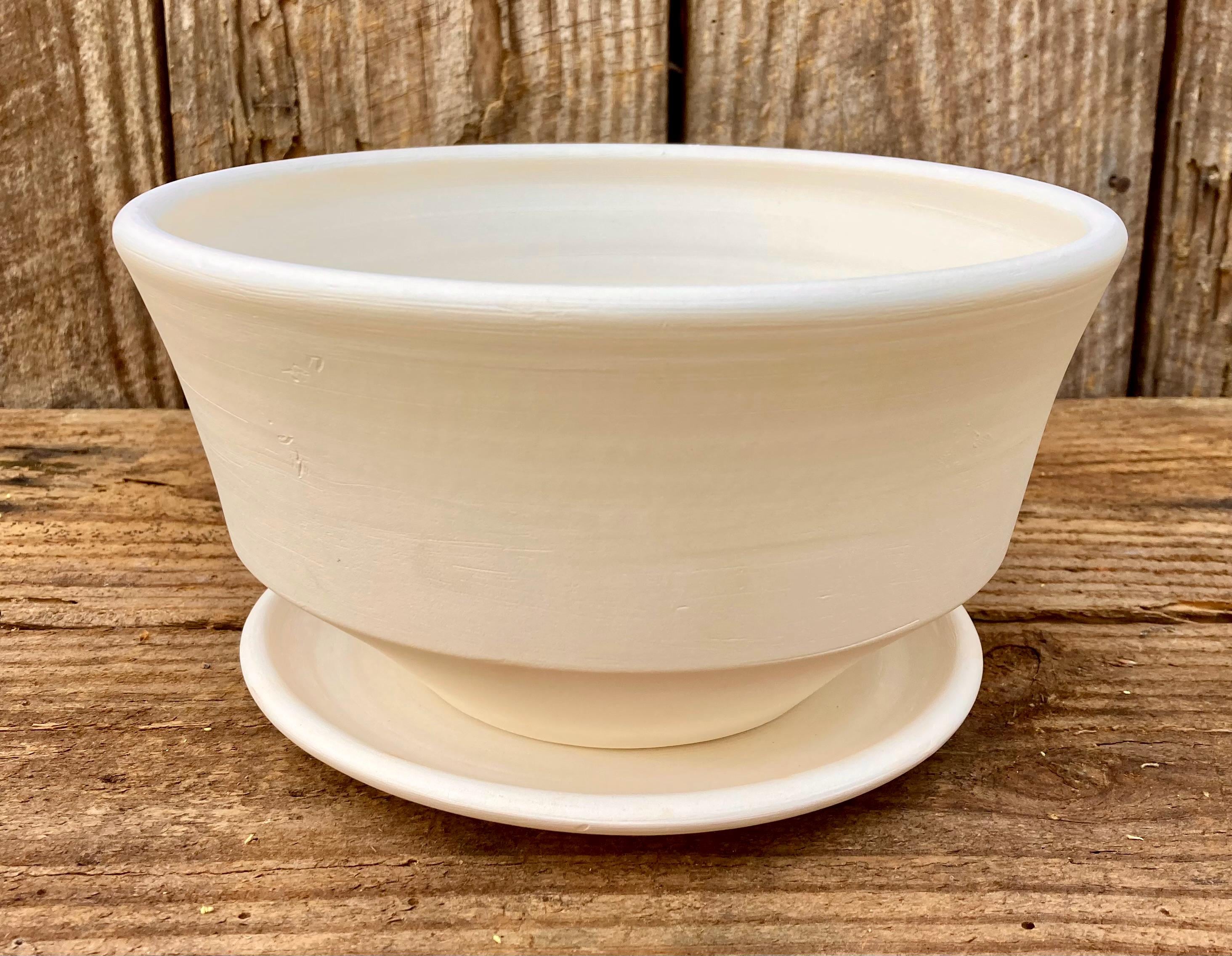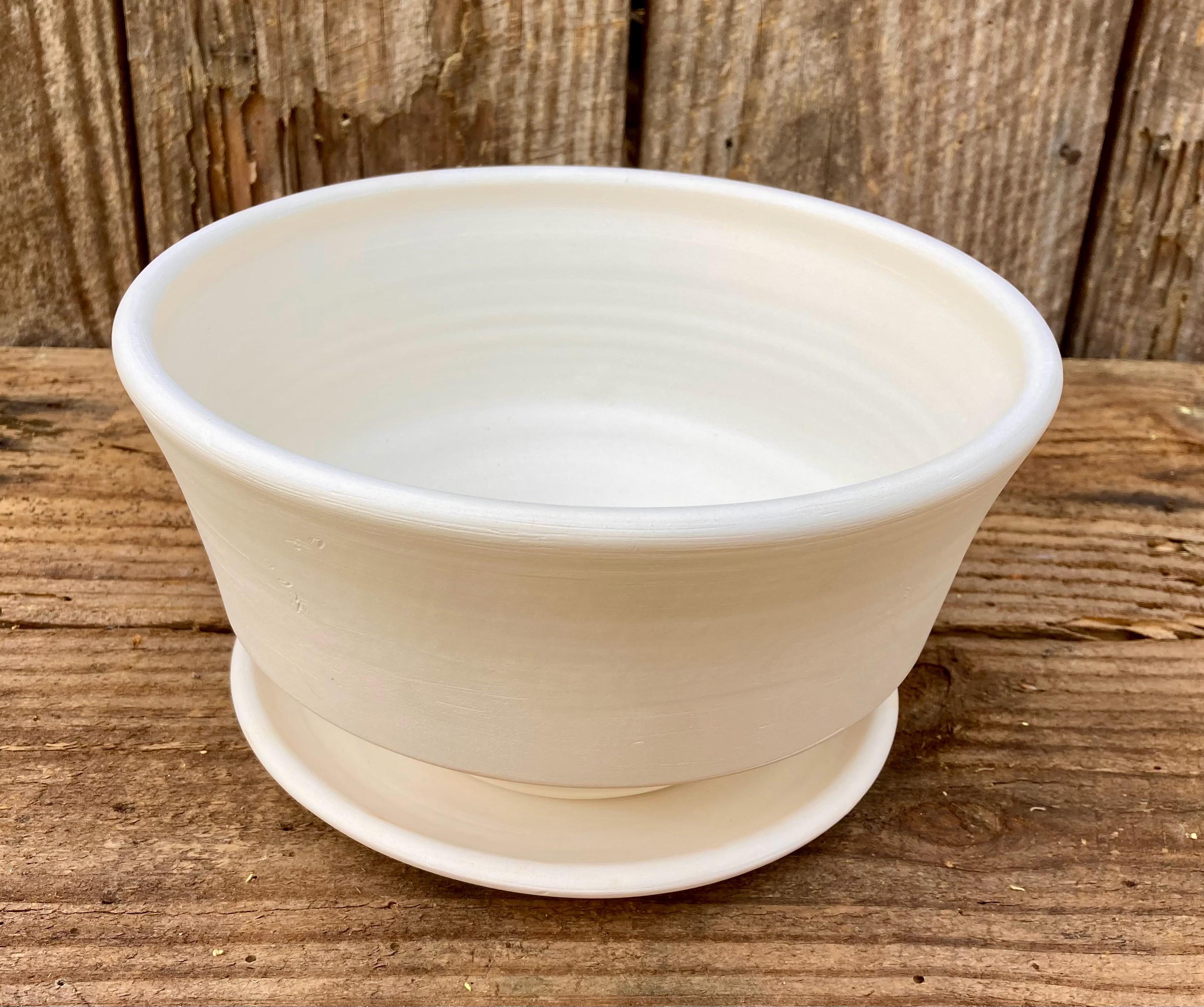 This planter with saucer was made of white earthenware clay. Like terracotta it is porous. This allows air and water to flow through the pot which prevents root rot and soil disease.