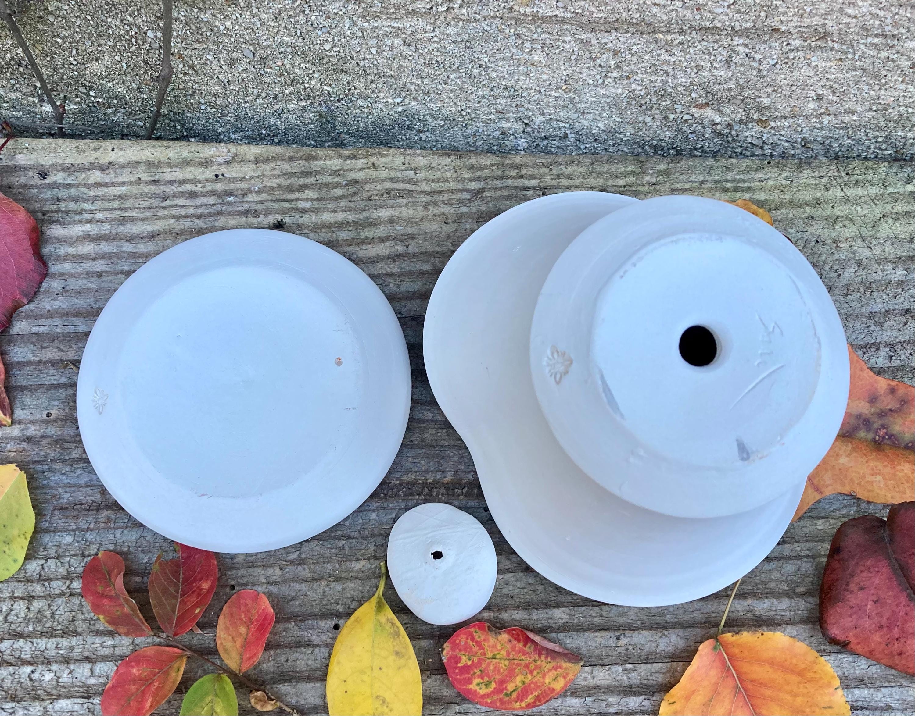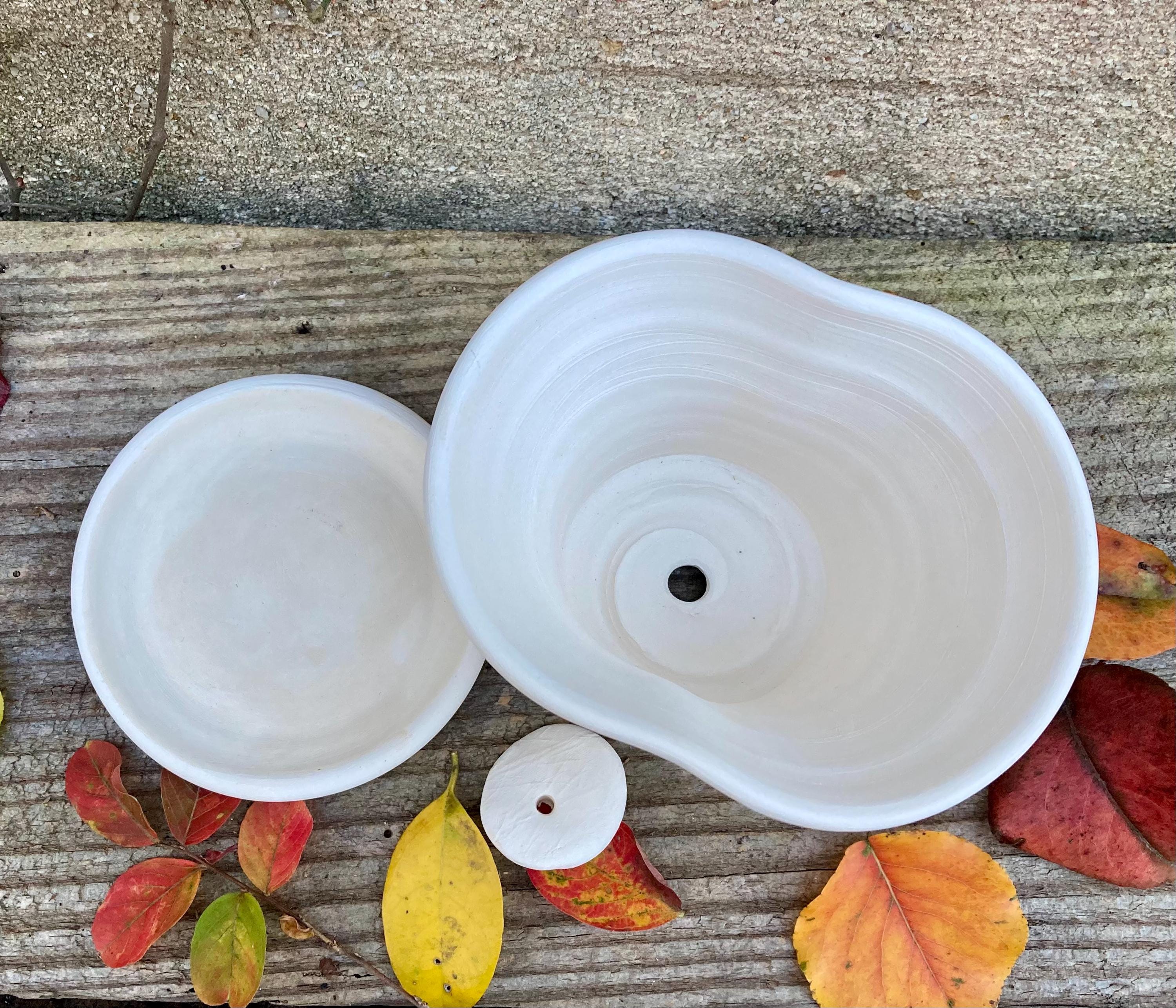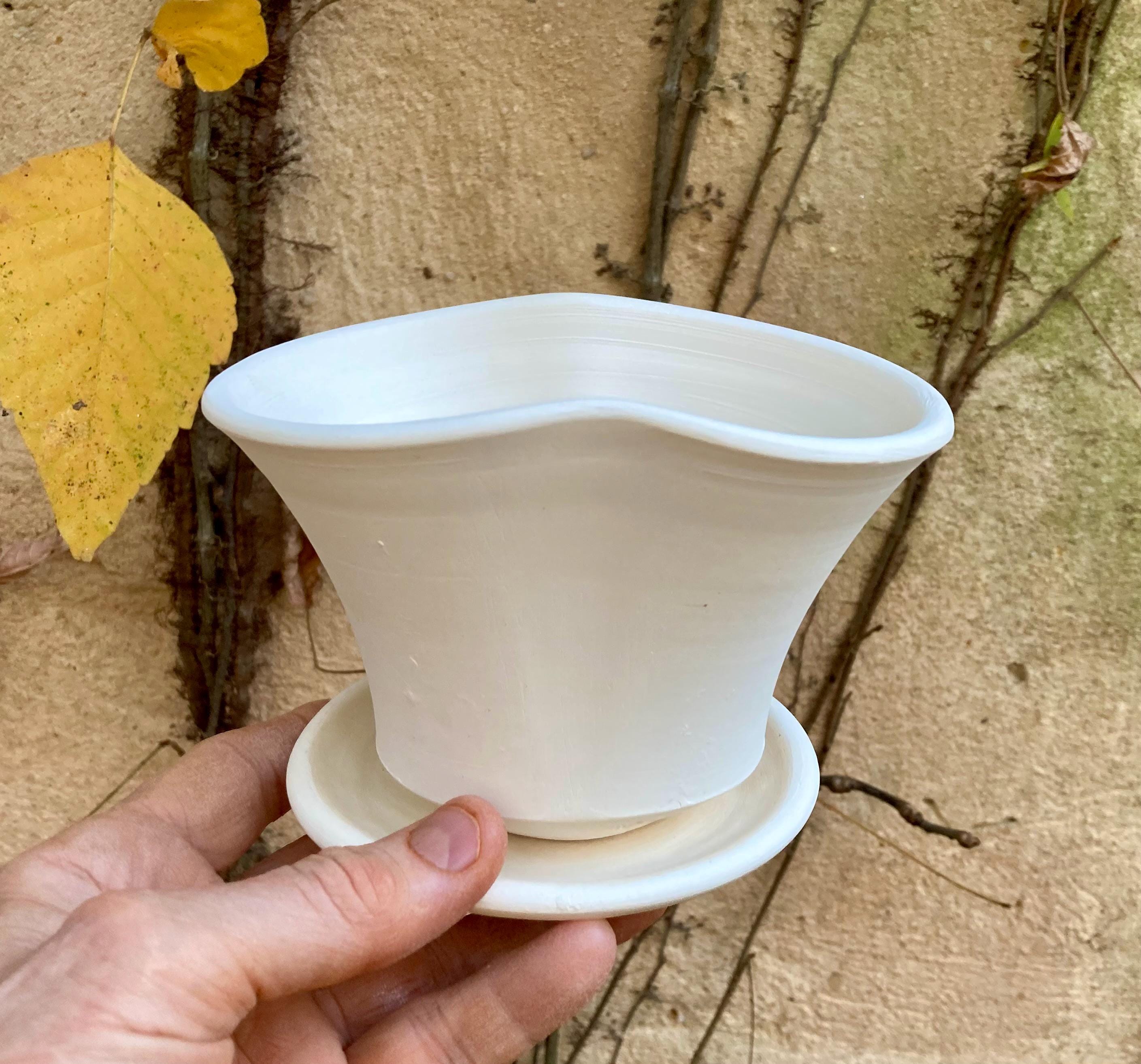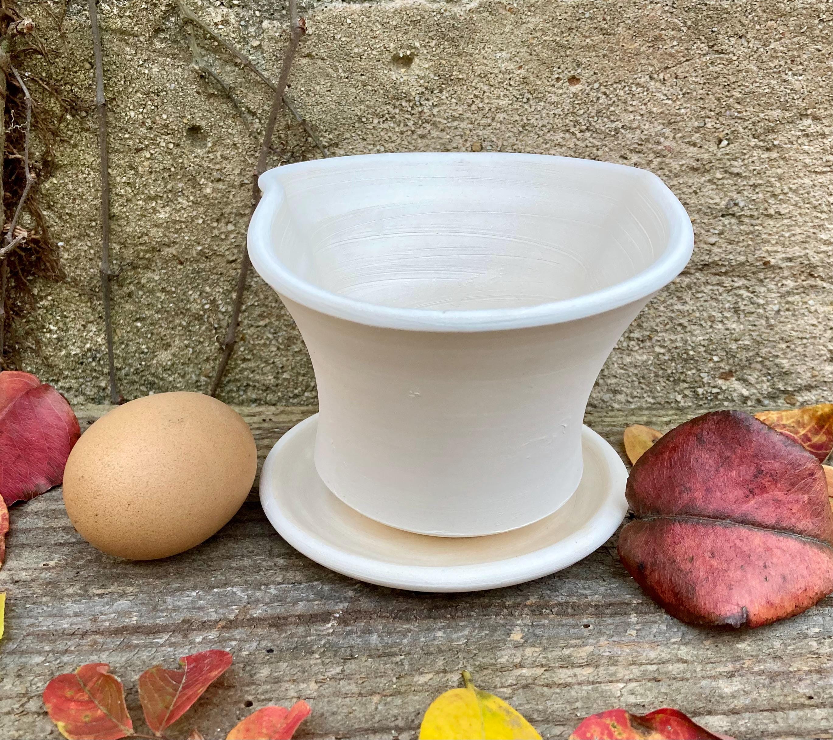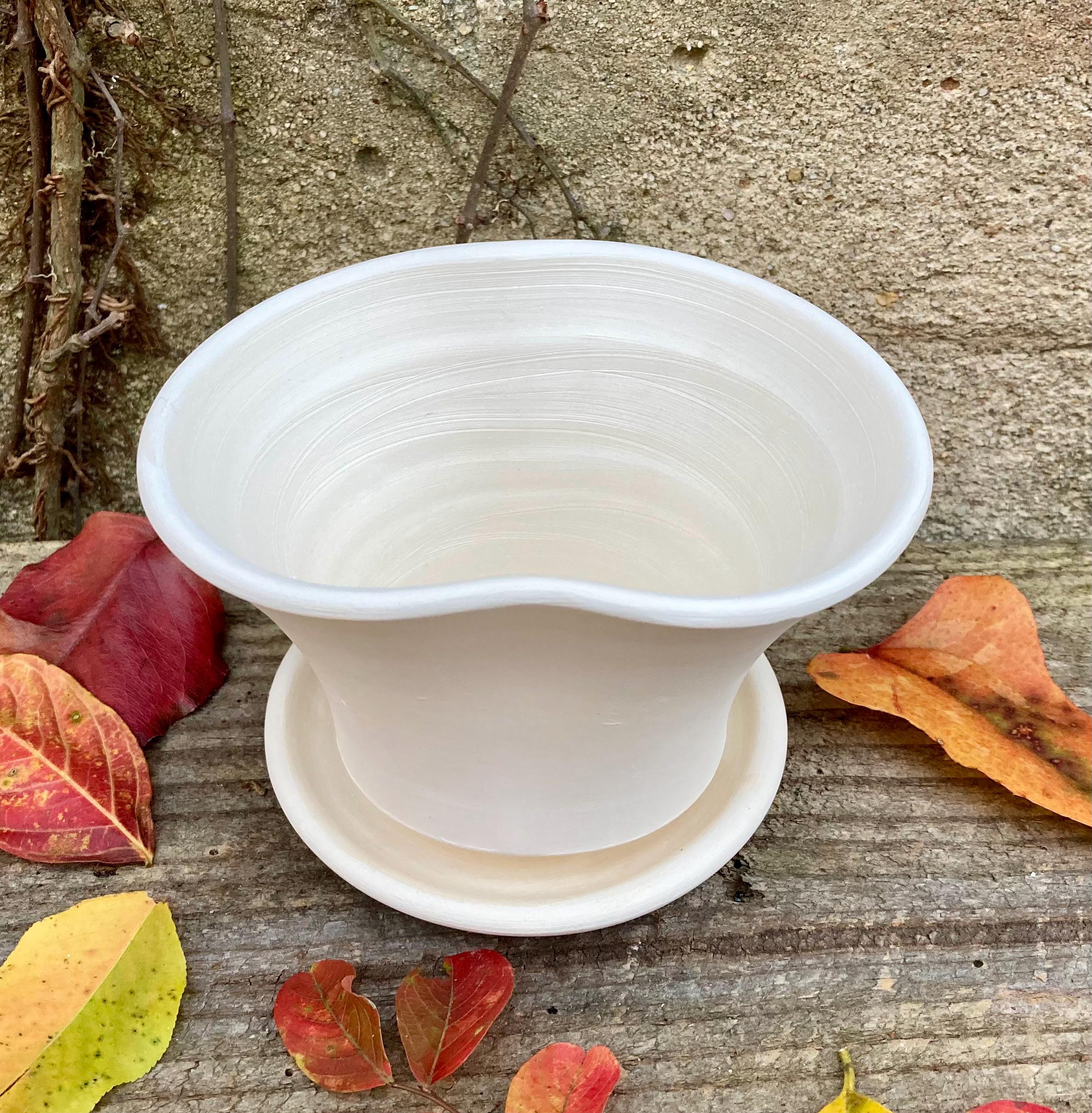 This small planter with saucer was made of white earthenware clay. Like terracotta it is porous. This allows air and water to flow through the pot which prevents root rot and soil disease.