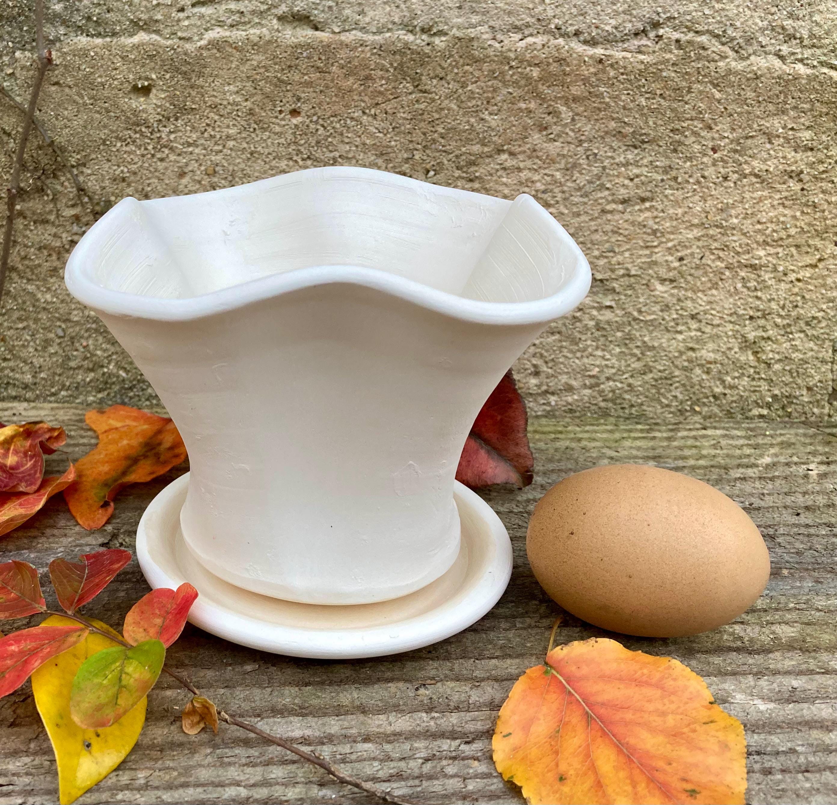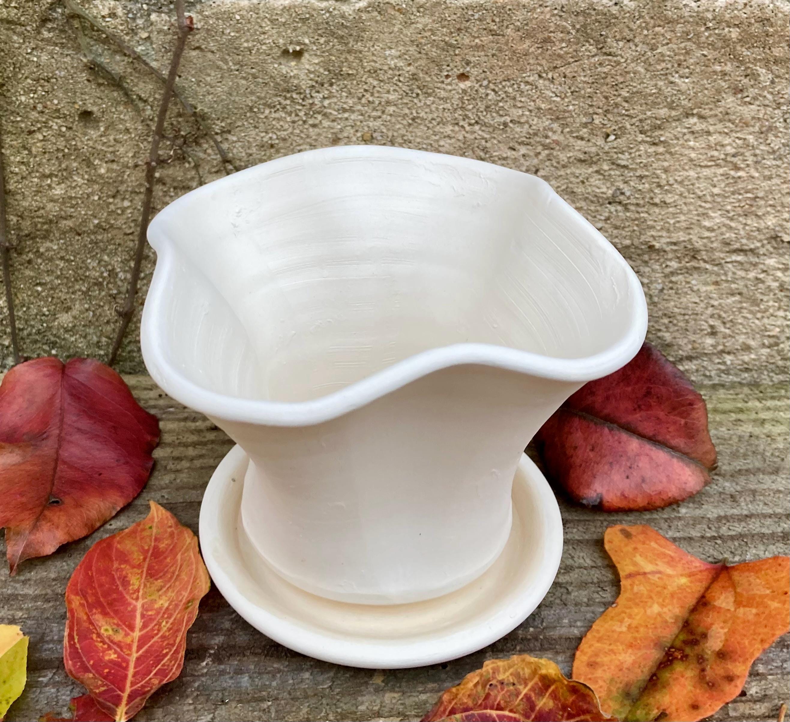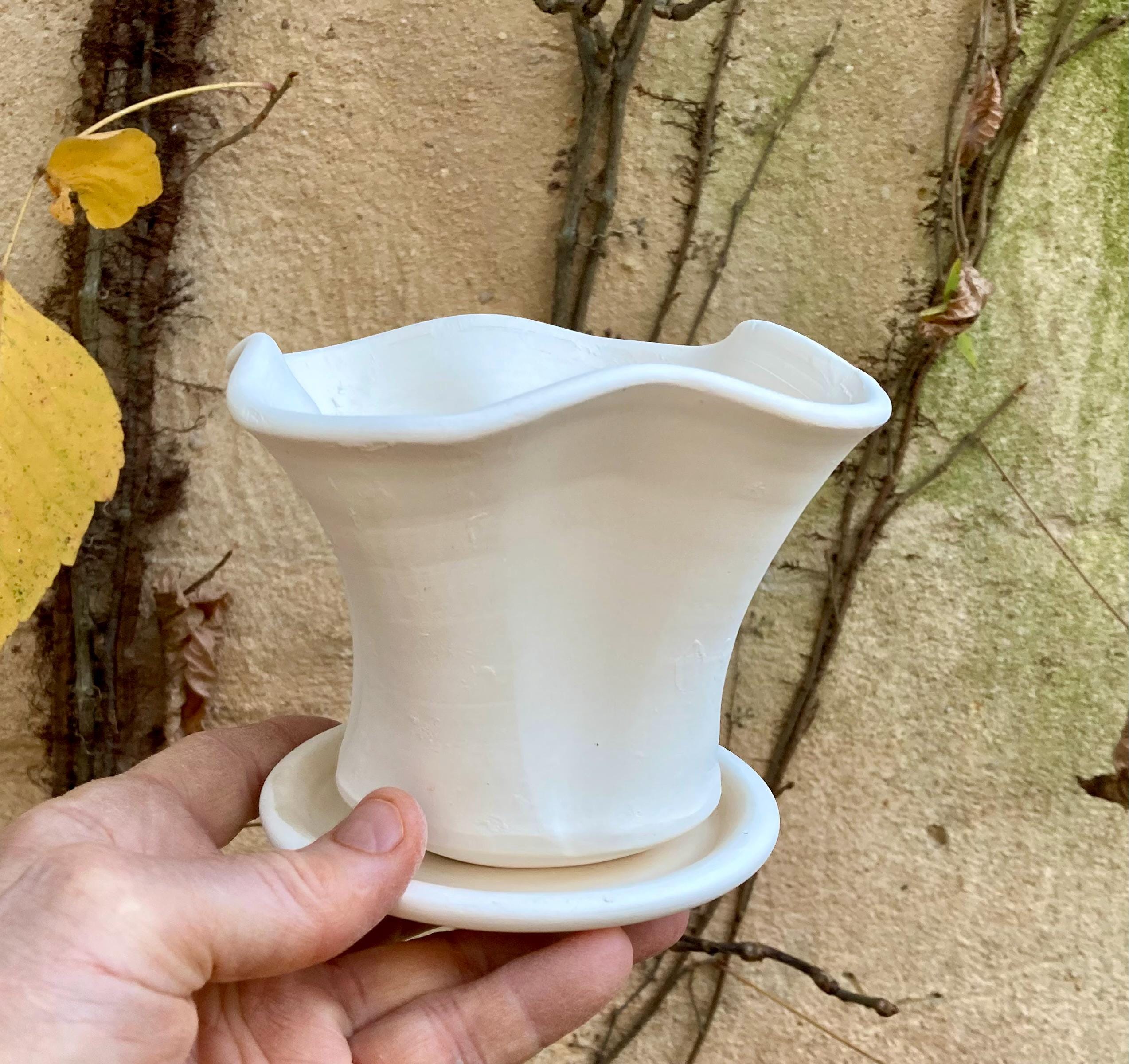 This small planter with saucer was made of white earthenware clay. Like terracotta it is porous. This allows air and water to flow through the pot which prevents root rot and soil disease.