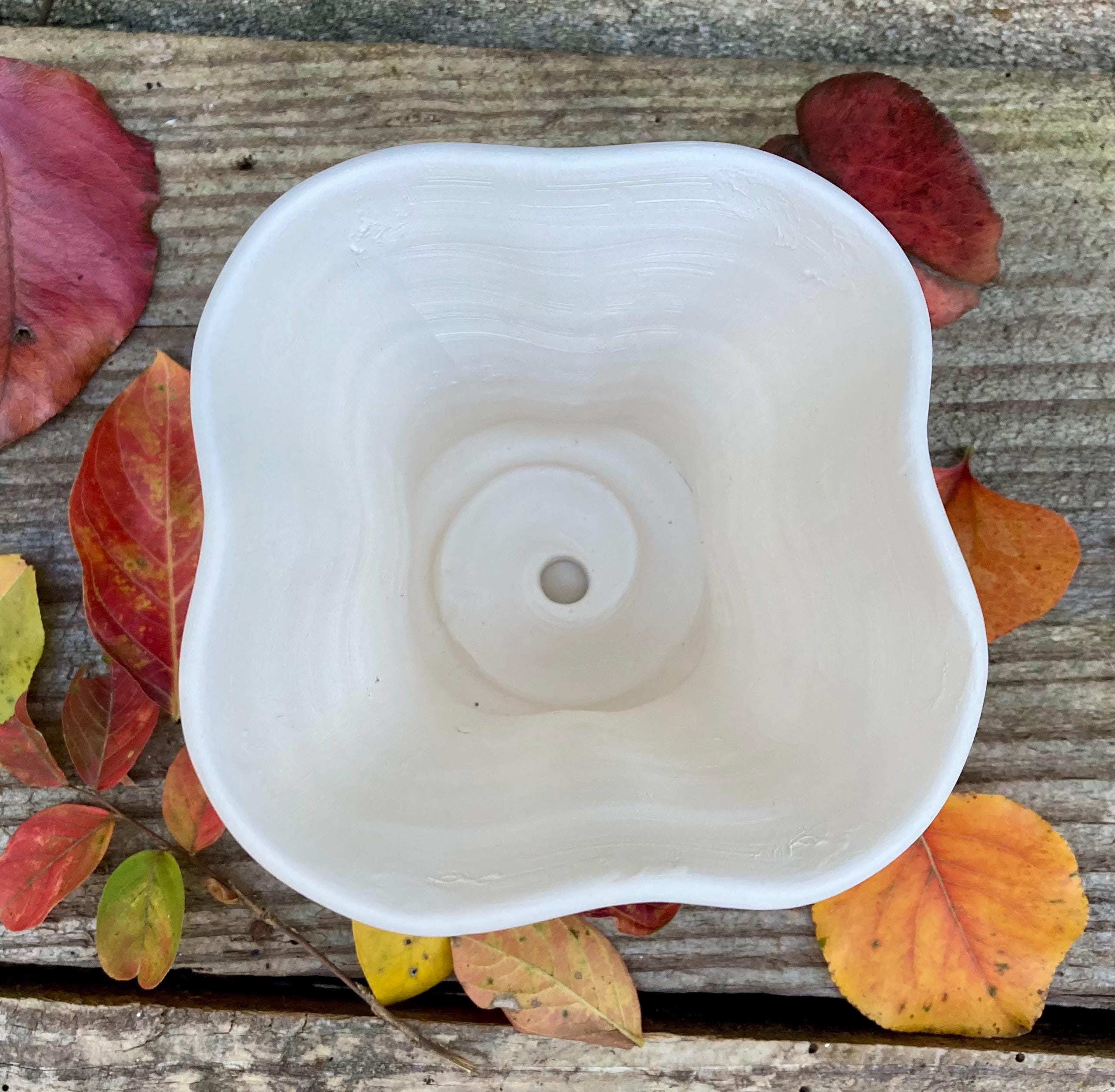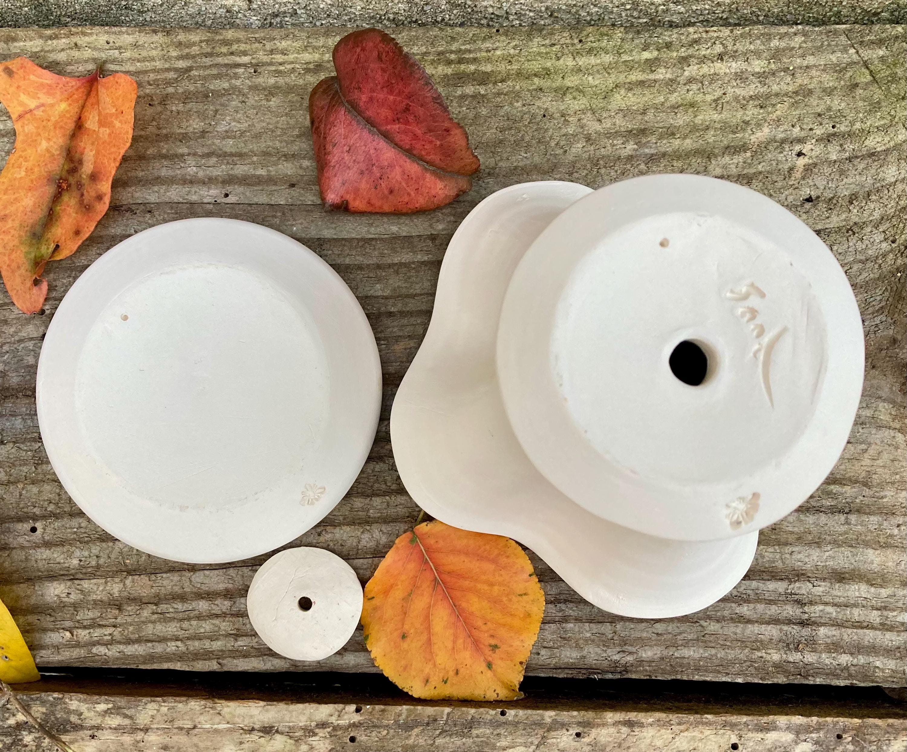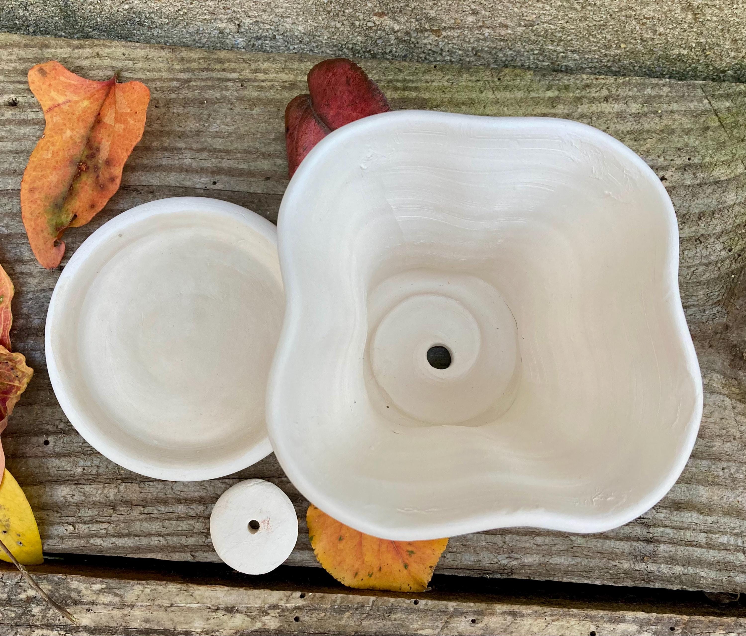 This small planter with saucer was made of white earthenware clay. Like terracotta it is porous. This allows air and water to flow through the pot which prevents root rot and soil disease.