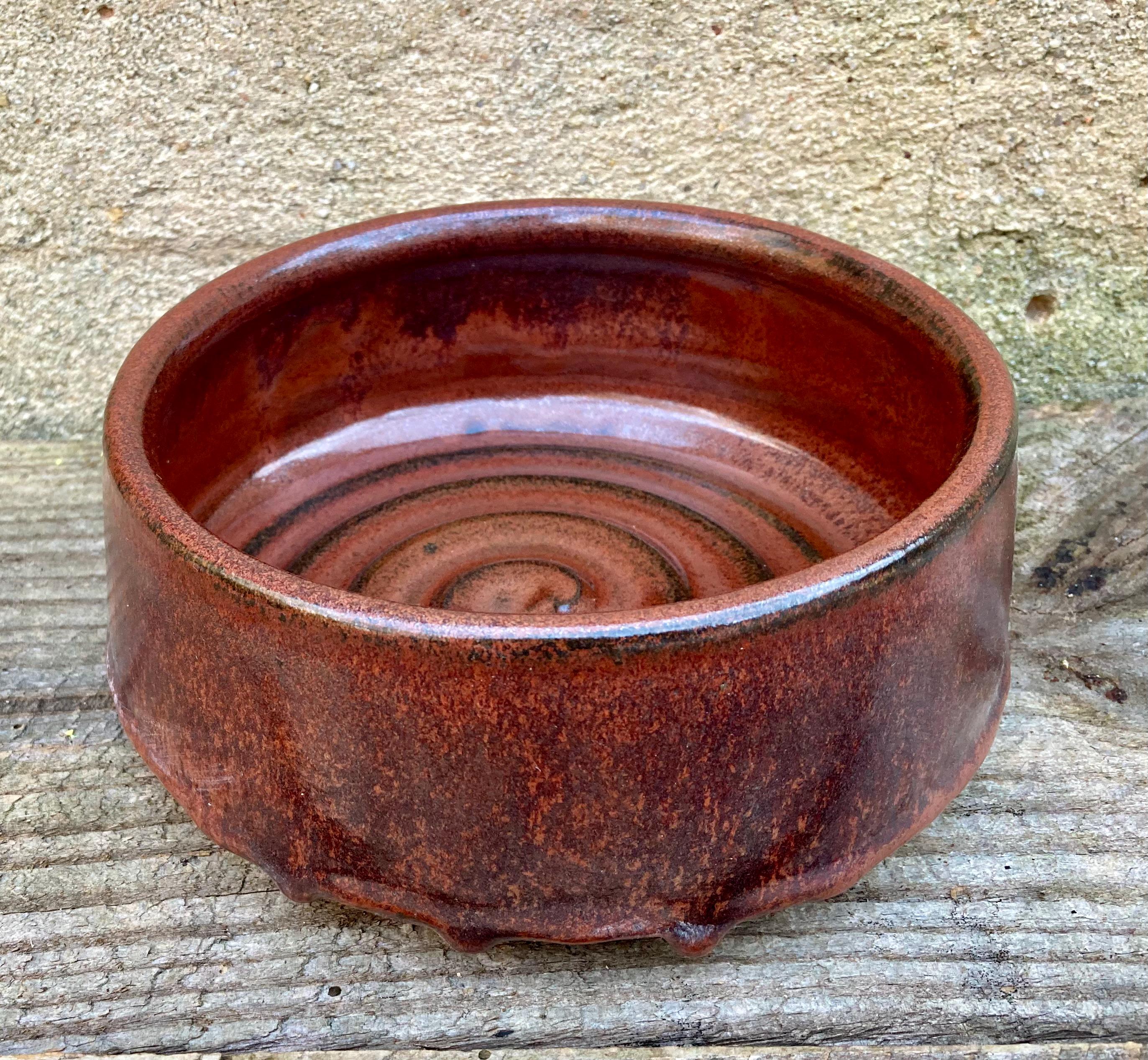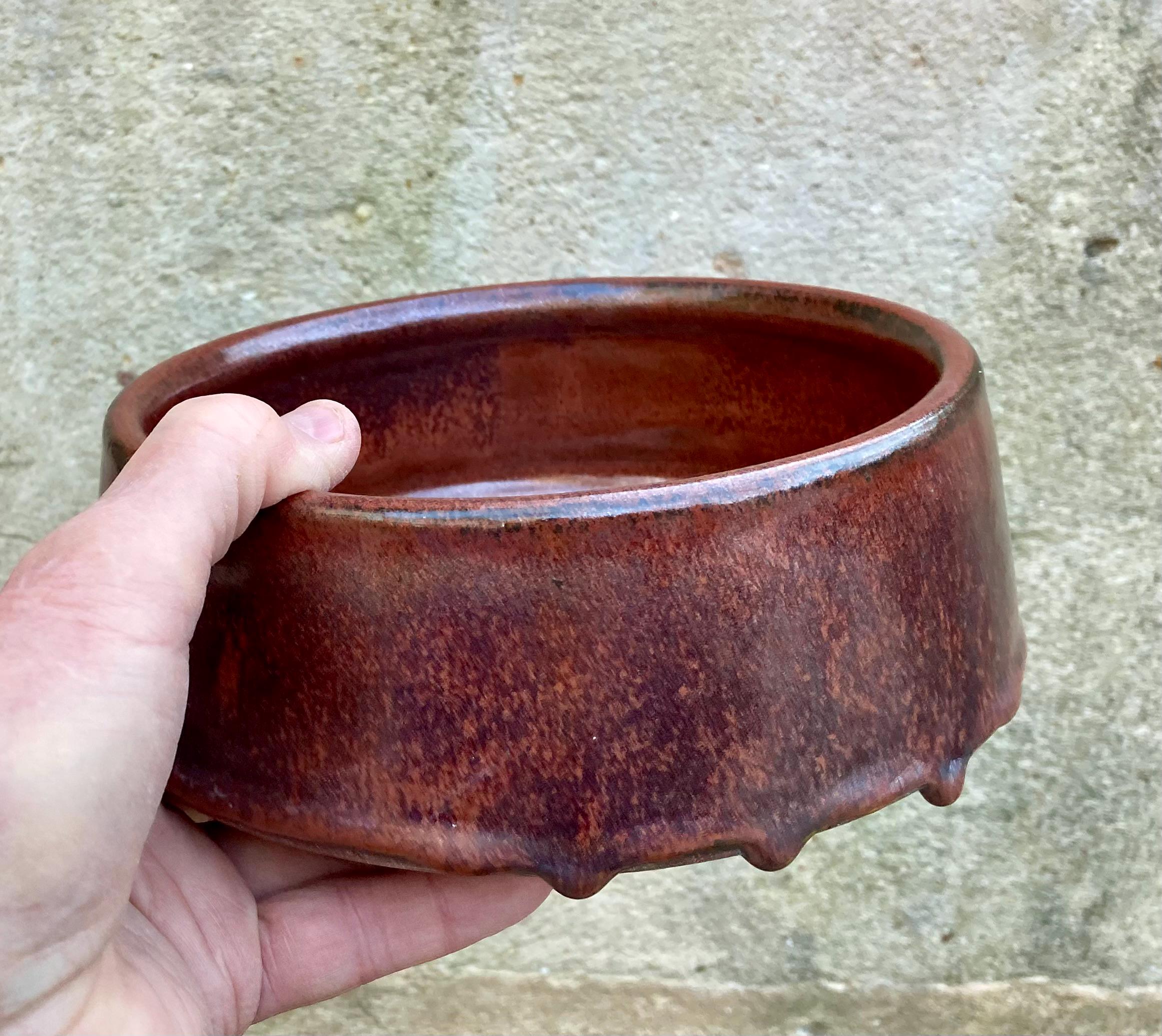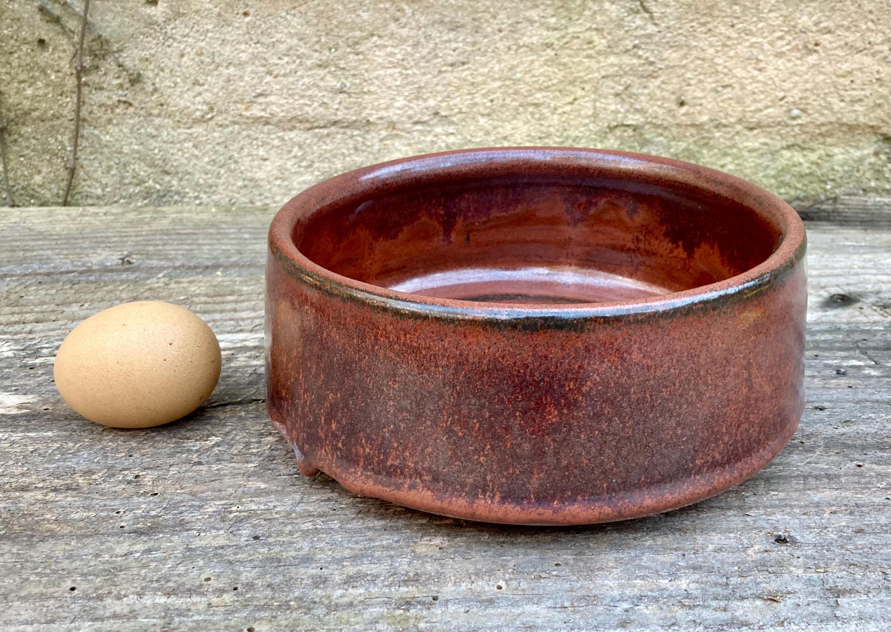 This stoneware dog bowl was wheel-thrown and fired to 2300 degrees for strength and durability. It was slow cooled to give the glaze time to develop depth and variation. The drips on one side look good, too. Heavy enough to make it a little harder to push across the floor. Wider at the bottom so it is almost impossible to turn over. It also make a good baking and serving dish.