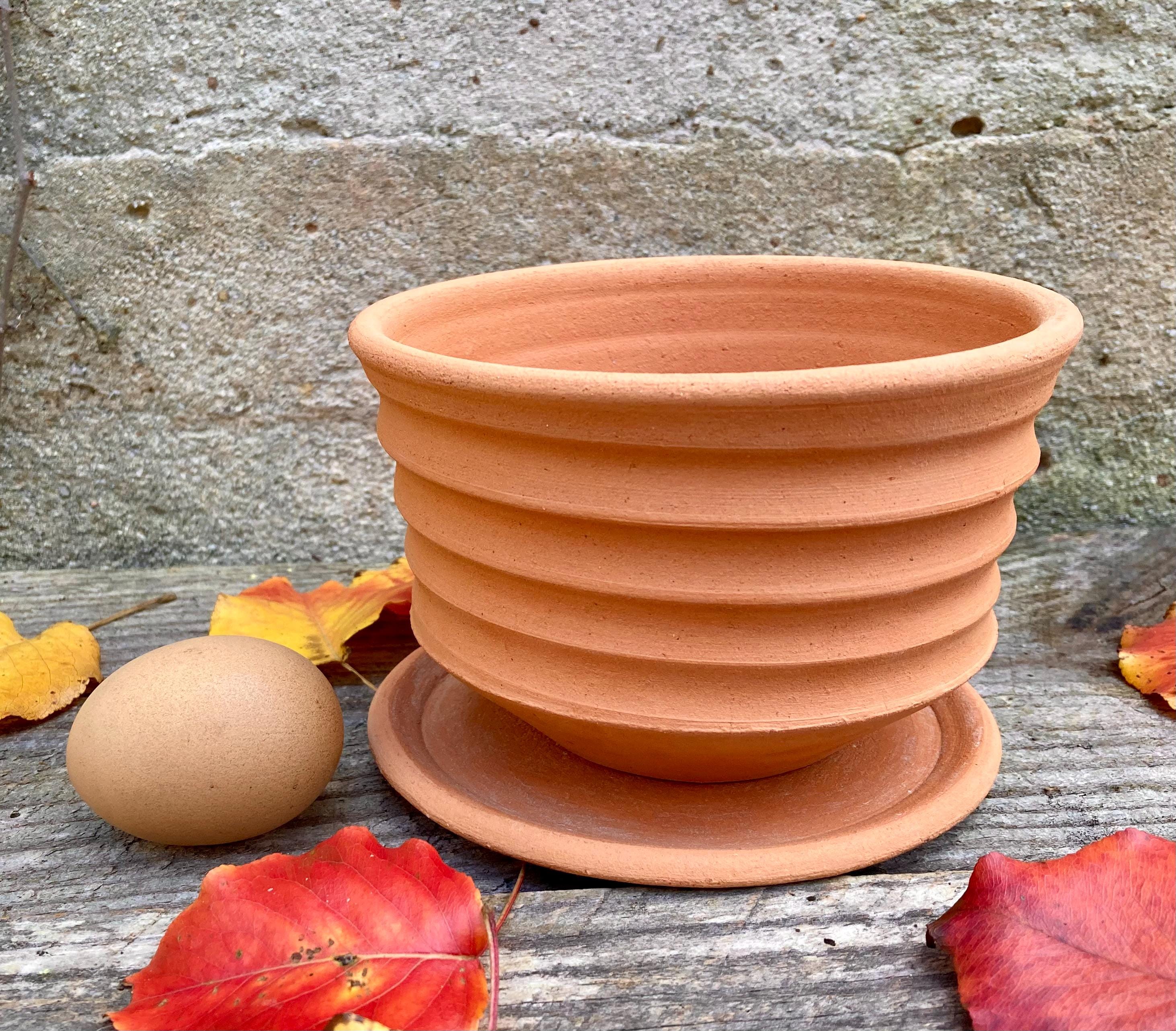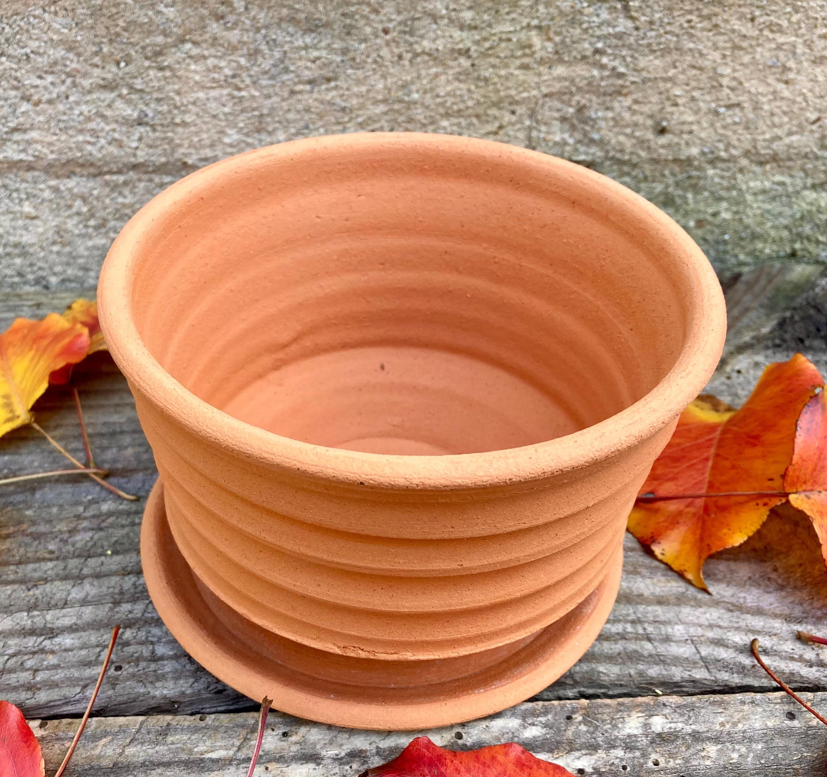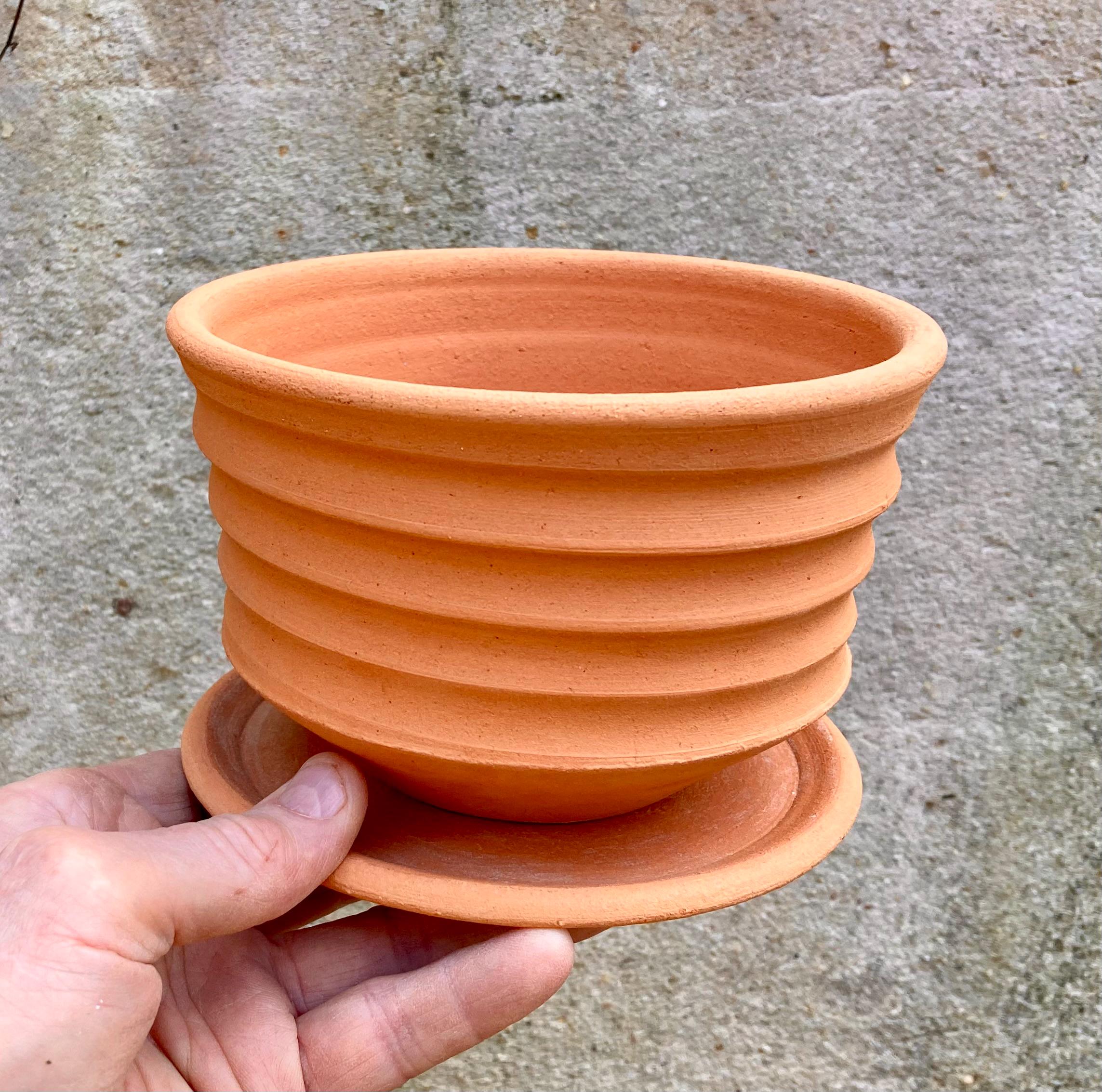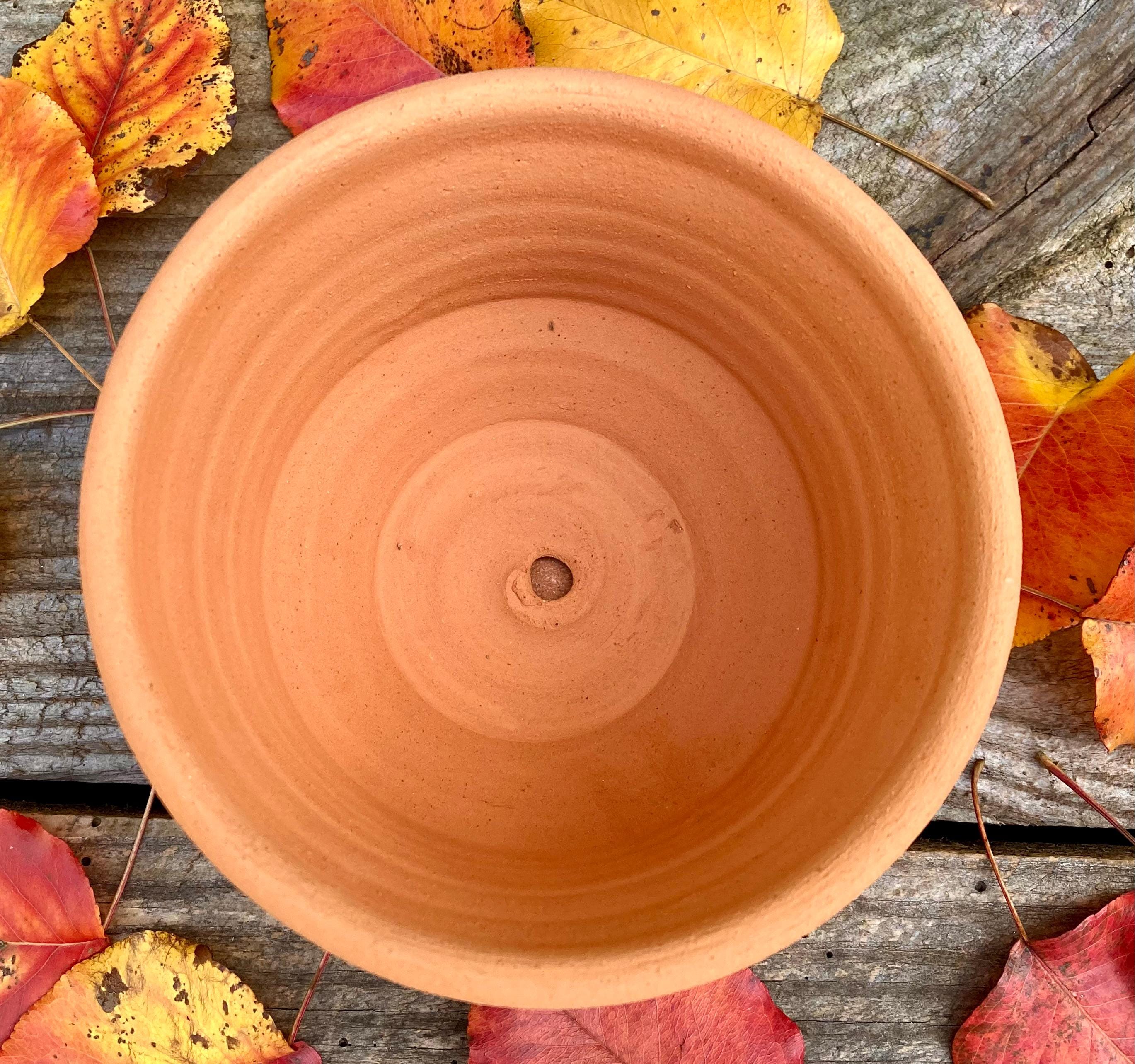 This terracotta planter was made of wheel-thrown, locally dug clay that when fired to the right temperature comes out a nice terracotta color and is porous. This allows air and water to flow through the pot which prevents root rot and soil disease.