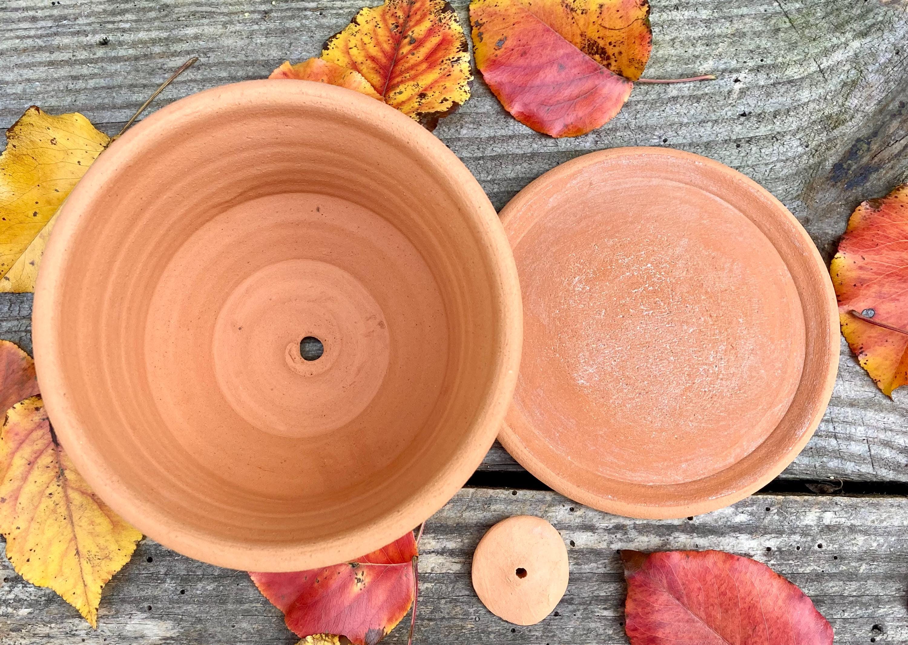 It is fired high enough to be much stronger and more durable than most terracotta pots. (Many of which aren't real terracotta.) It has a small hole for drainage and a saucer that has been treated with a sealant to prevent leakage. It also comes with a small shard to keep the soil from falling out or the hole becoming clogged.