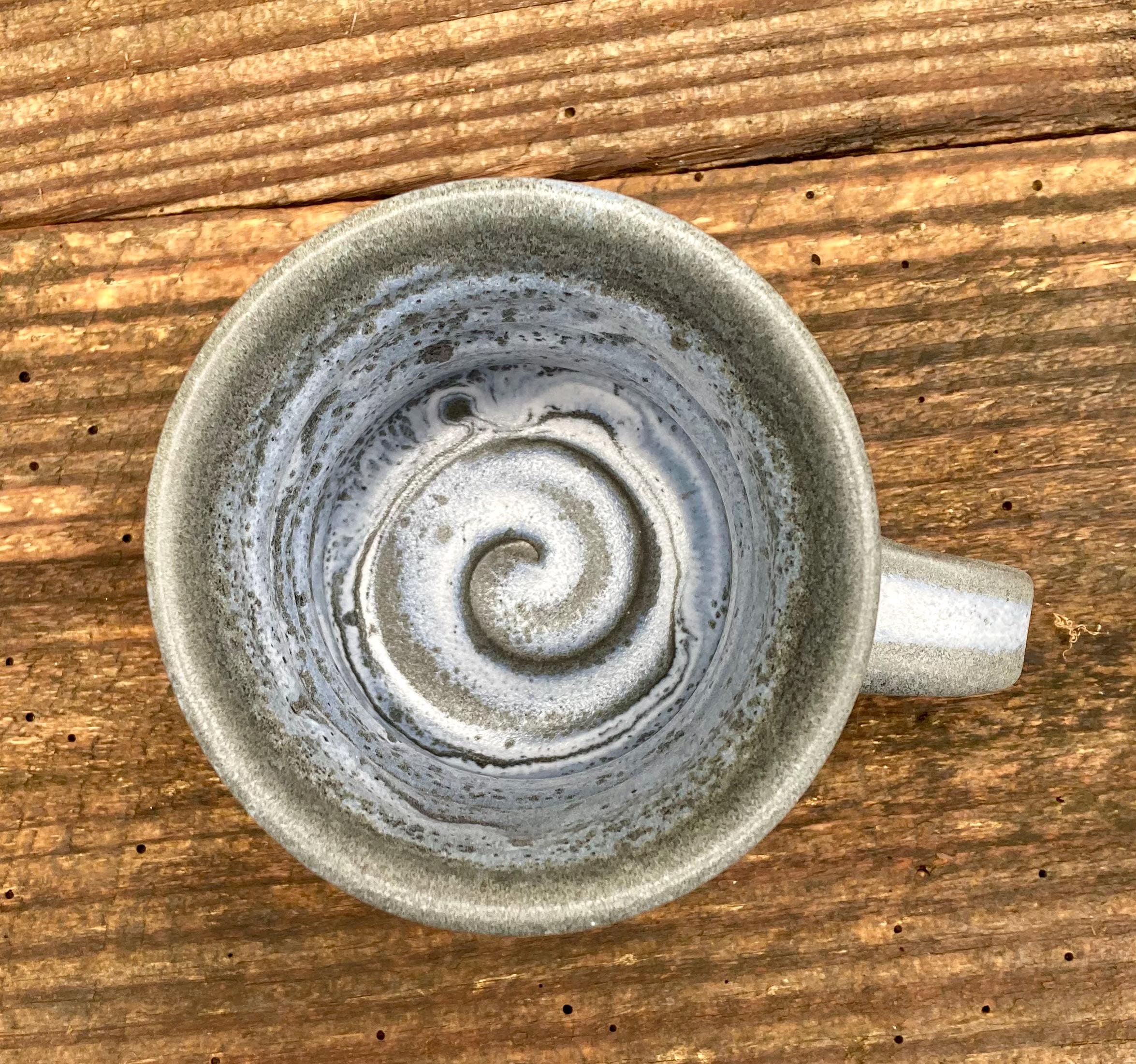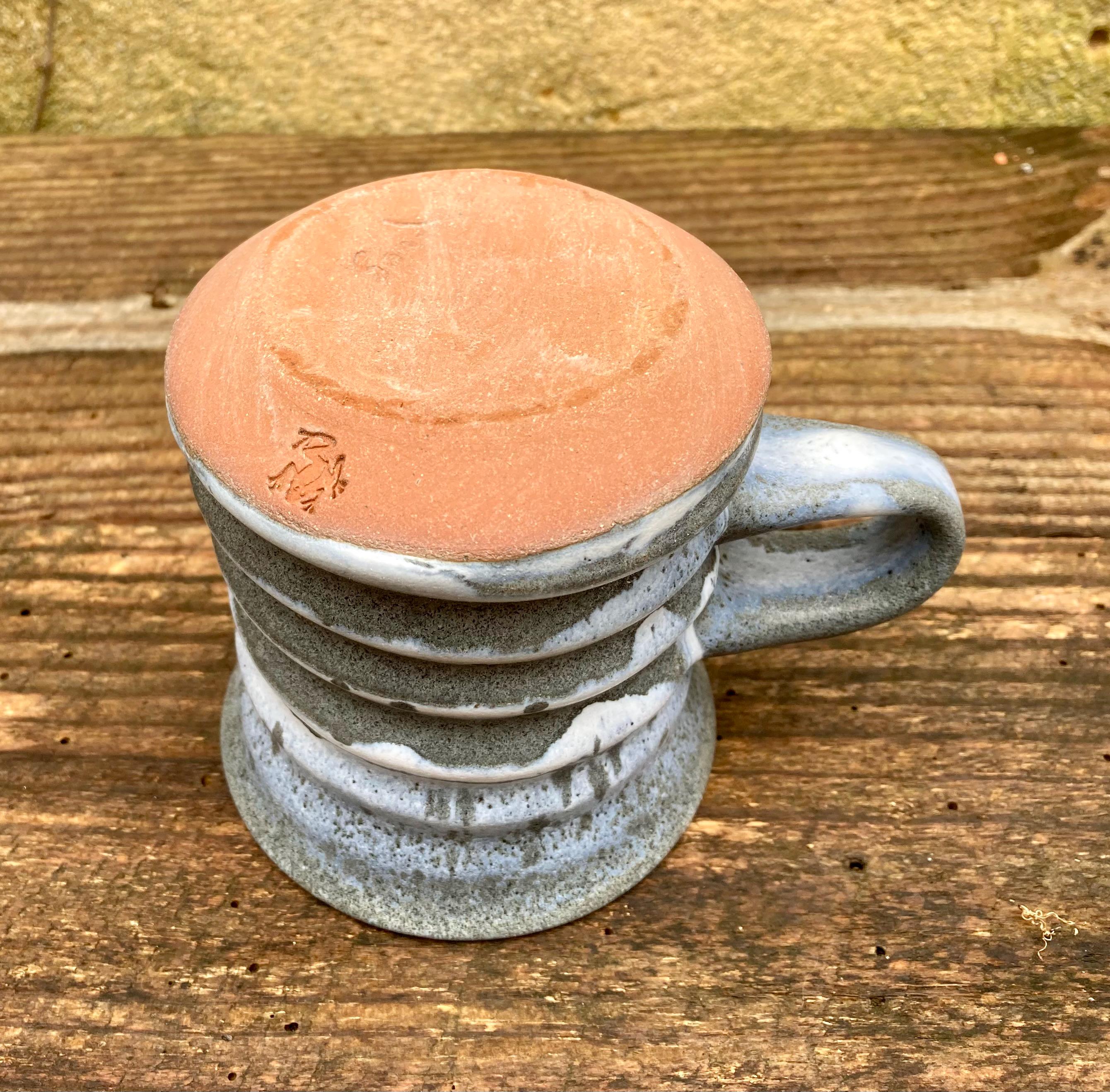 This stoneware coffee mug was wheel-thrown and fired to 2300 degrees for strength and durability. It was slow cooled to give the glaze time to develop run, merge and form interesting patterns. It has a comfortable one-finger handle.