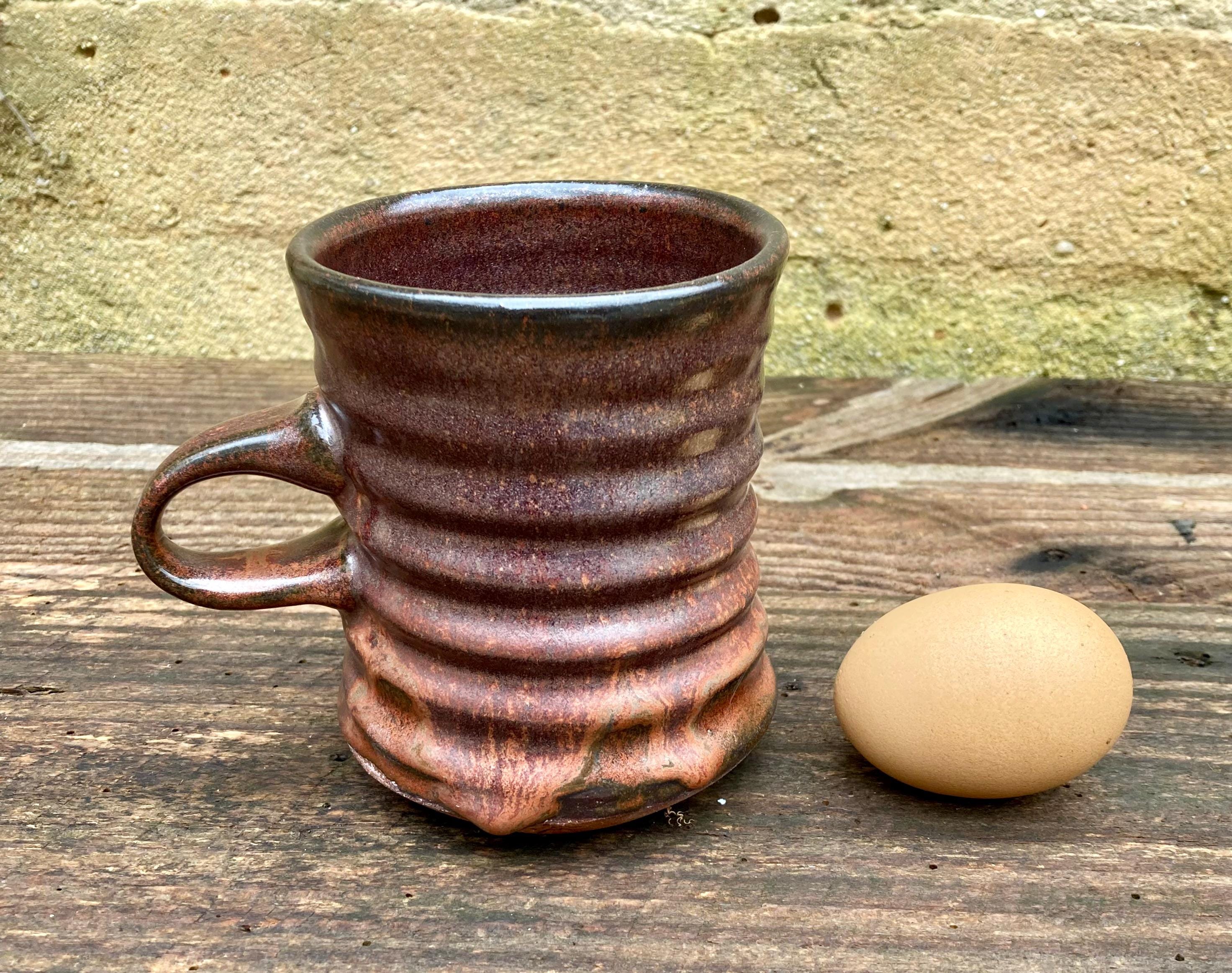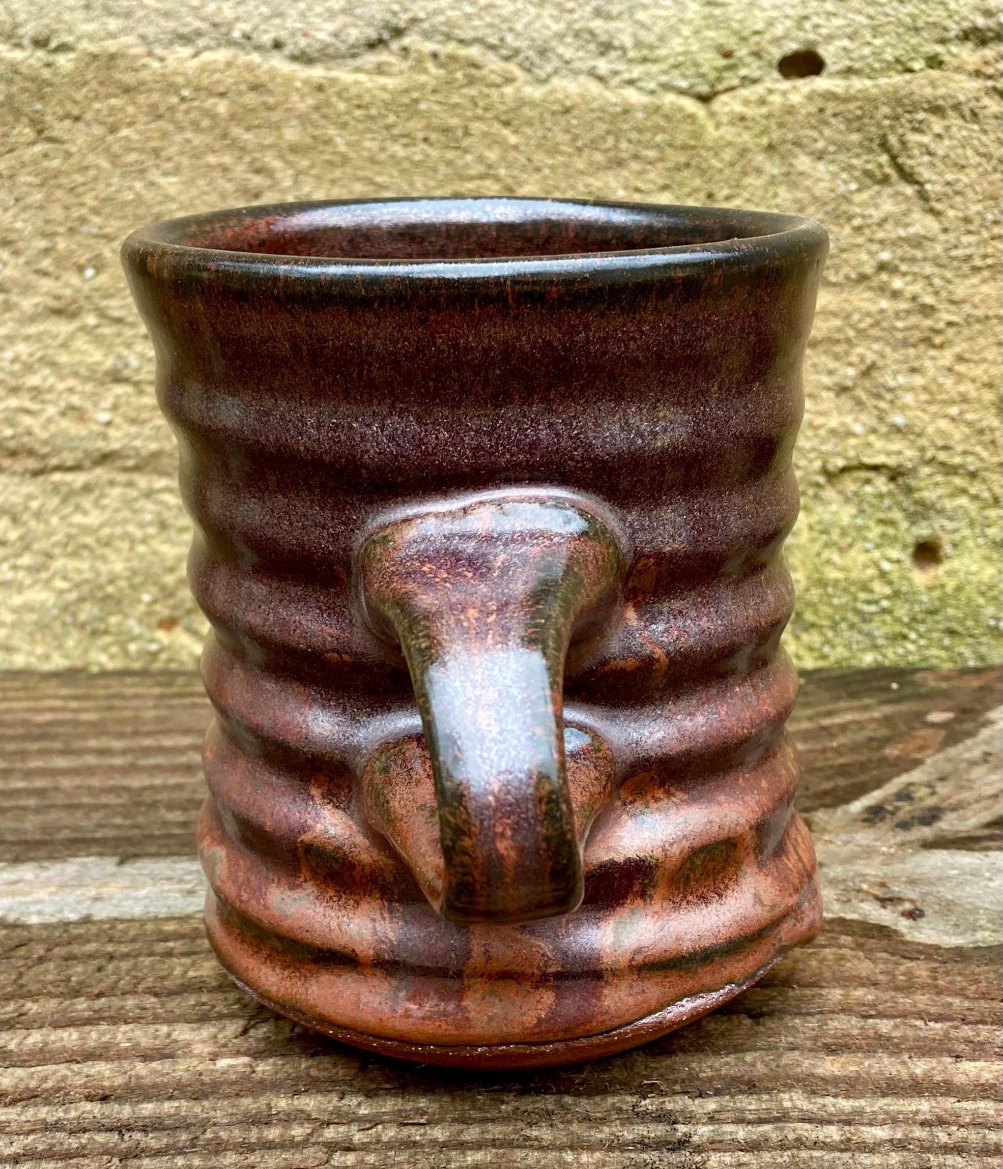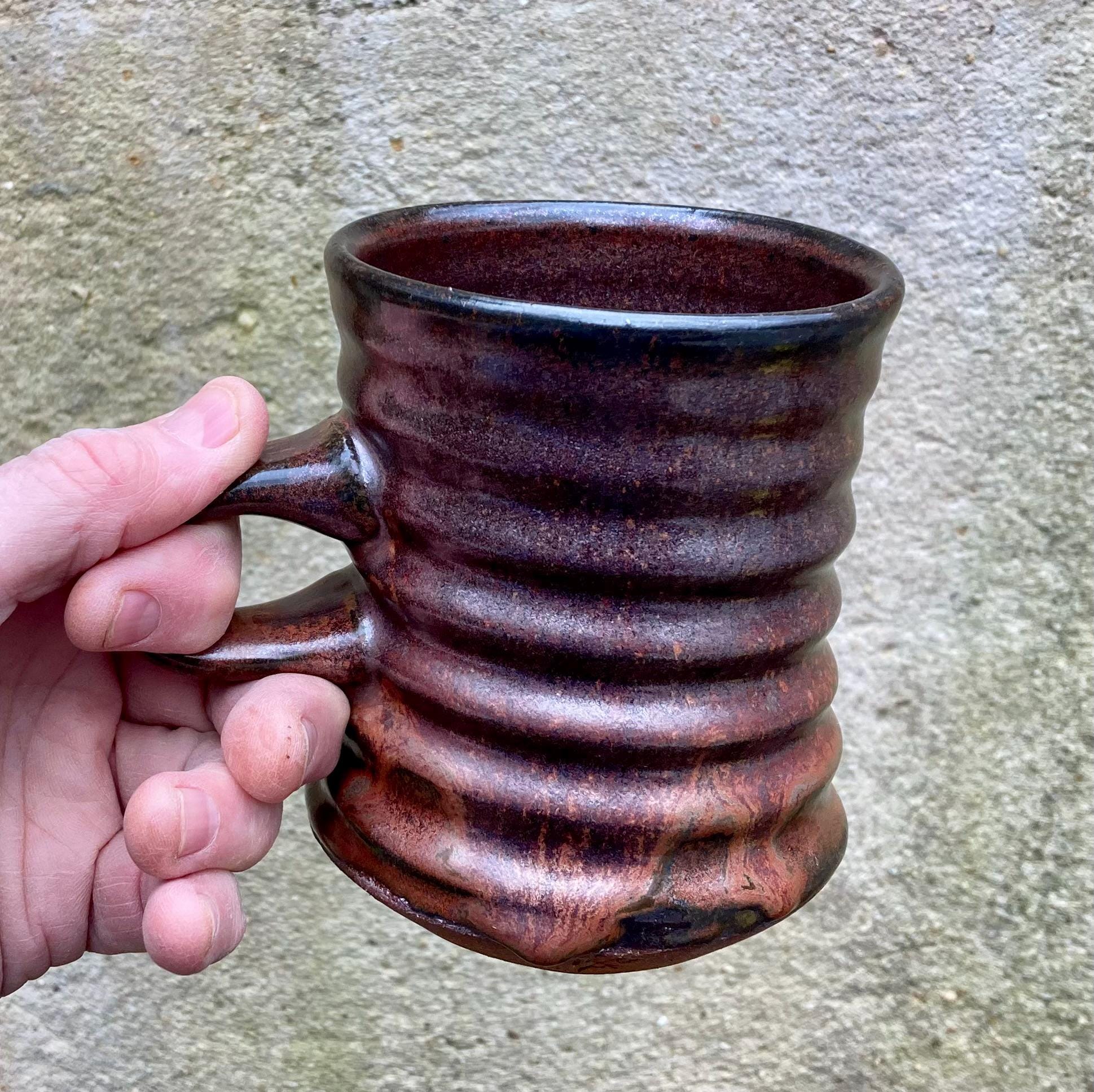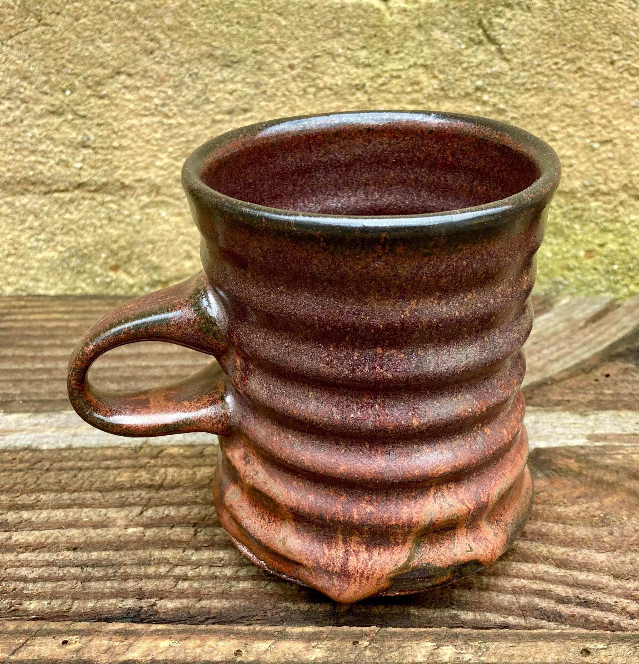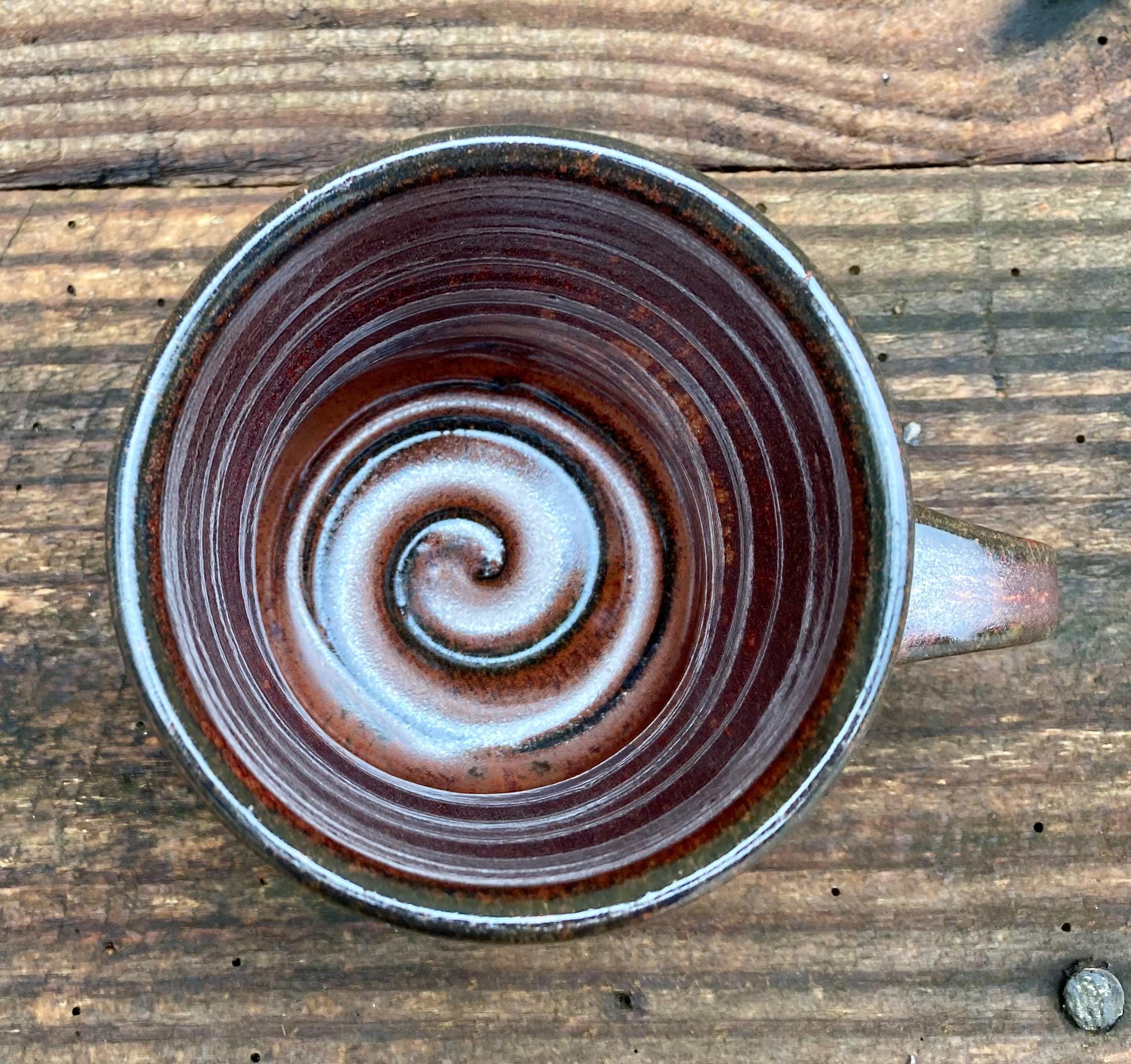 This stoneware coffee mug was wheel-thrown and fired to 2300 degrees for strength and durability. It was slow cooled to give the glaze time to develop depth and variation. It has a comfortable one-finger handle.
